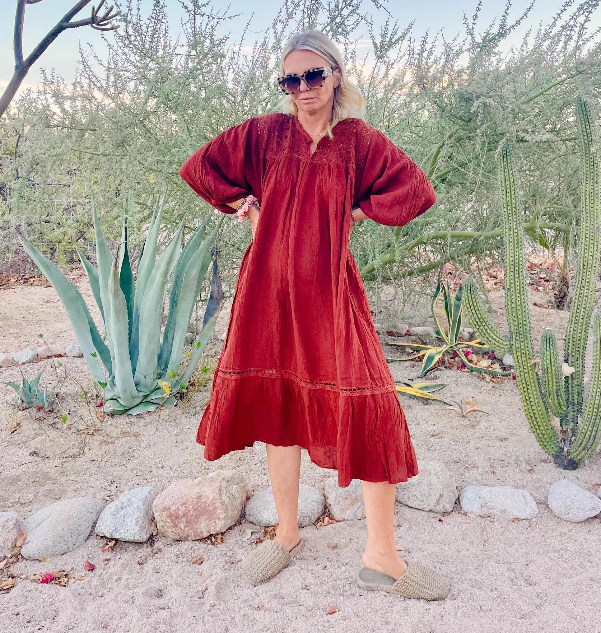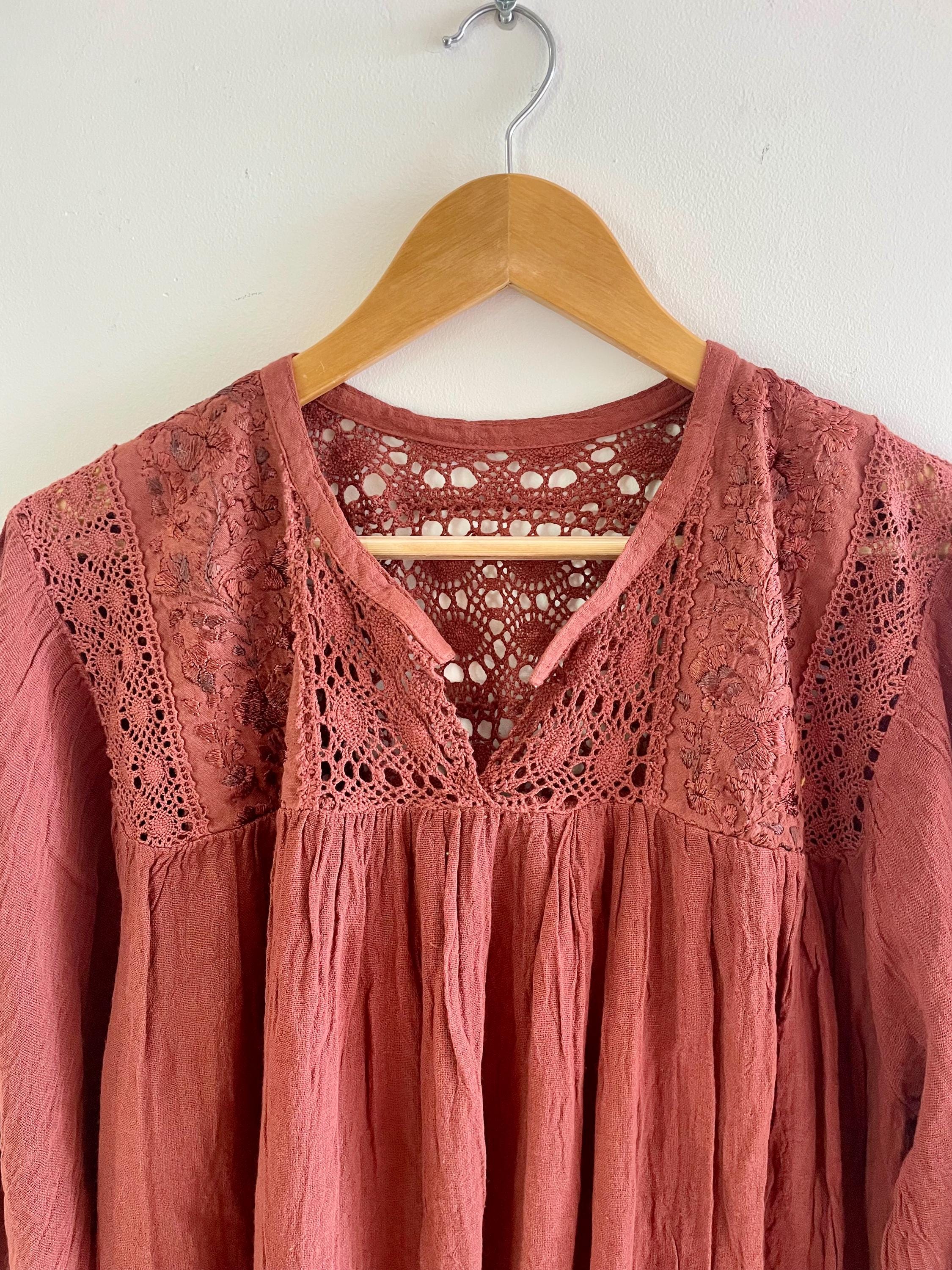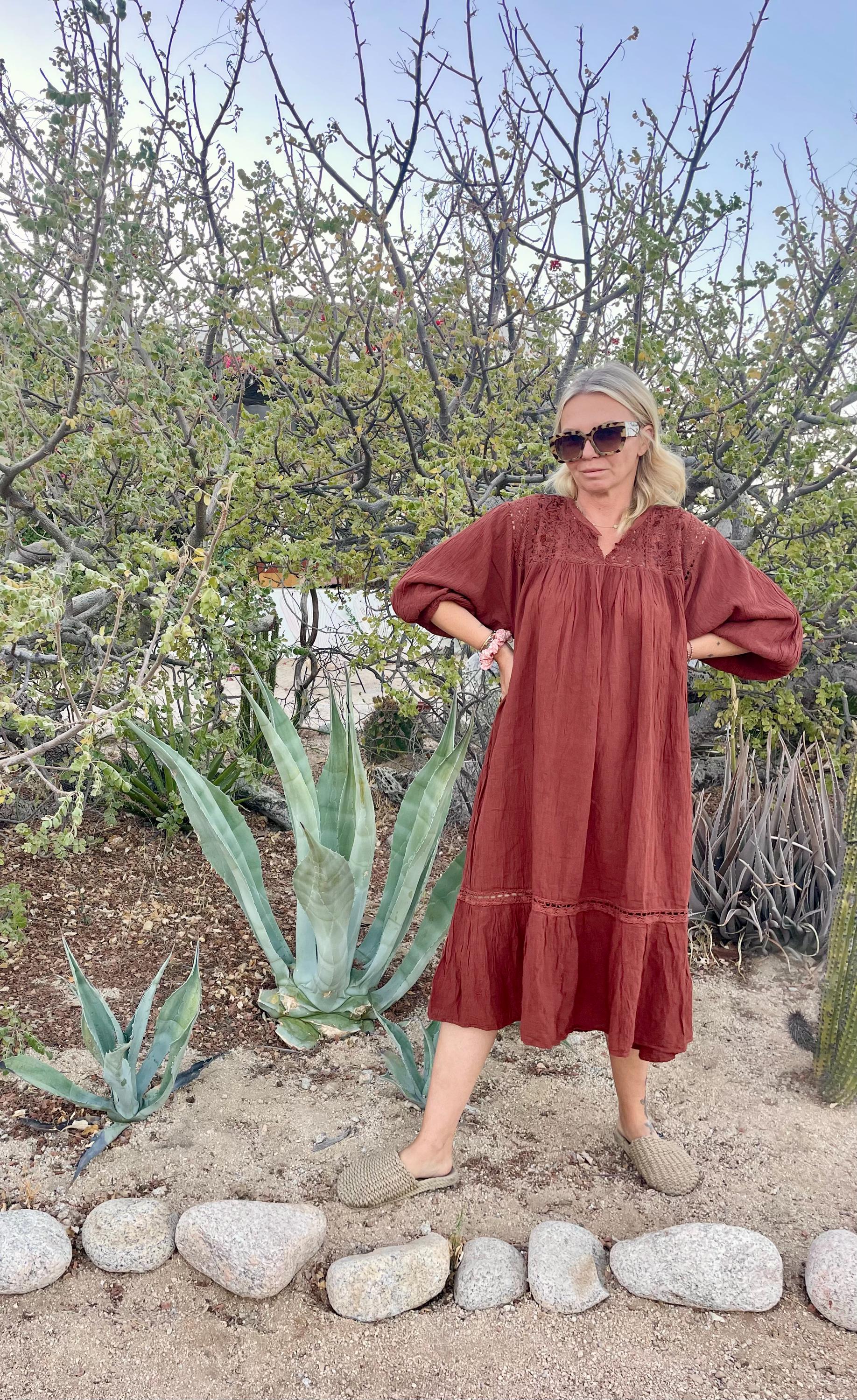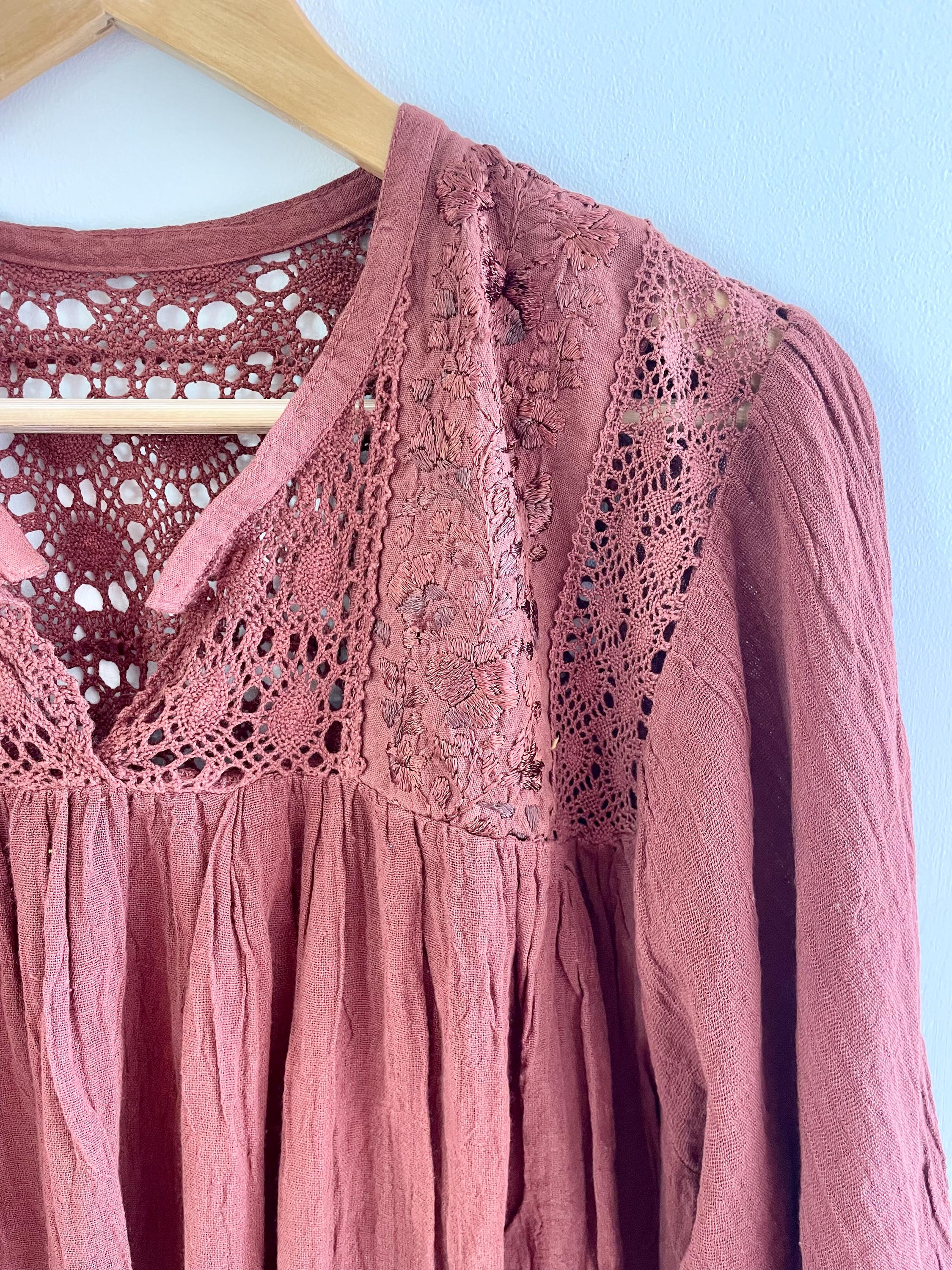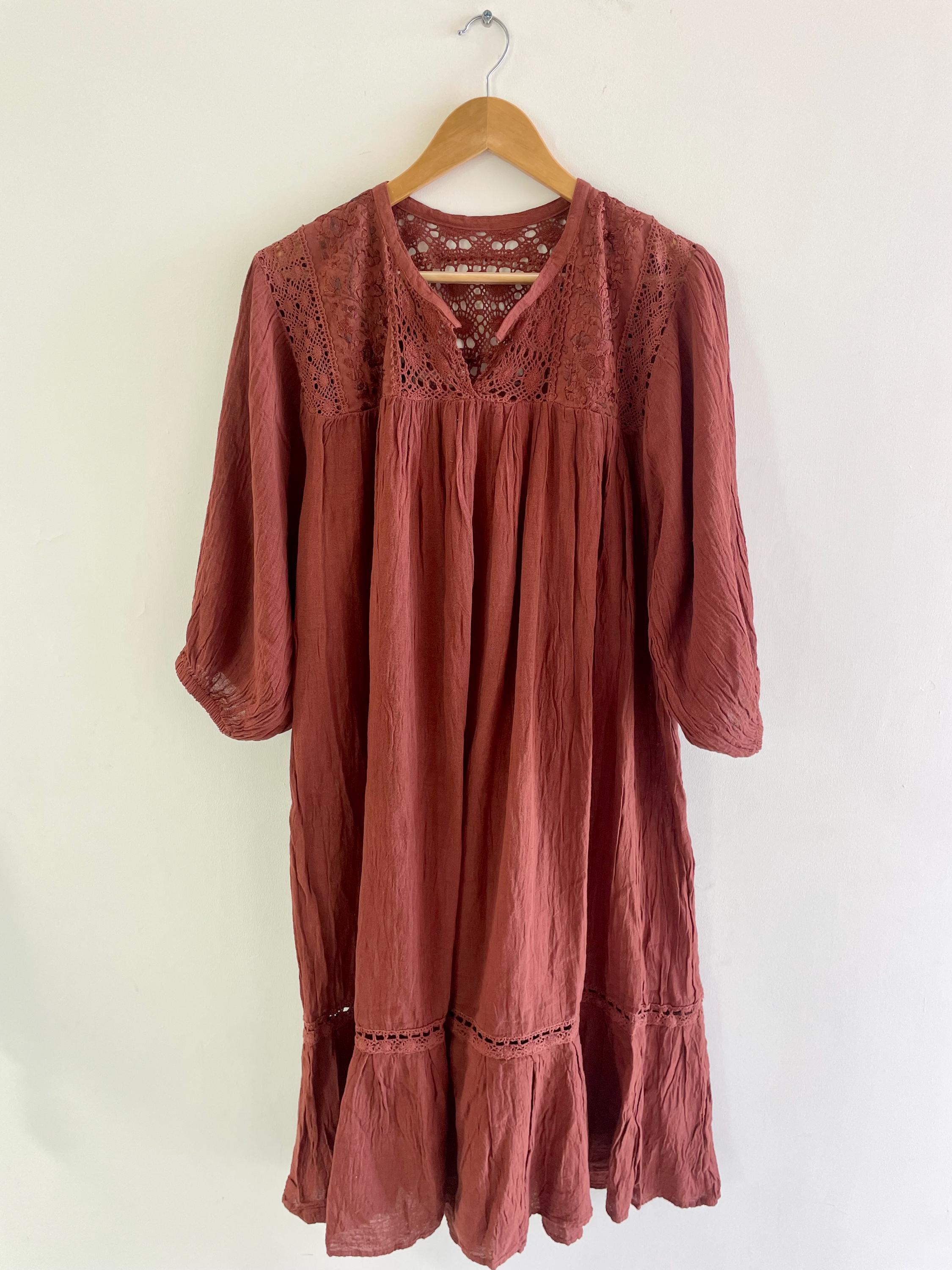 Beautiful relish brown soft cotton gauze dress with embroidered top and balloon sleeve