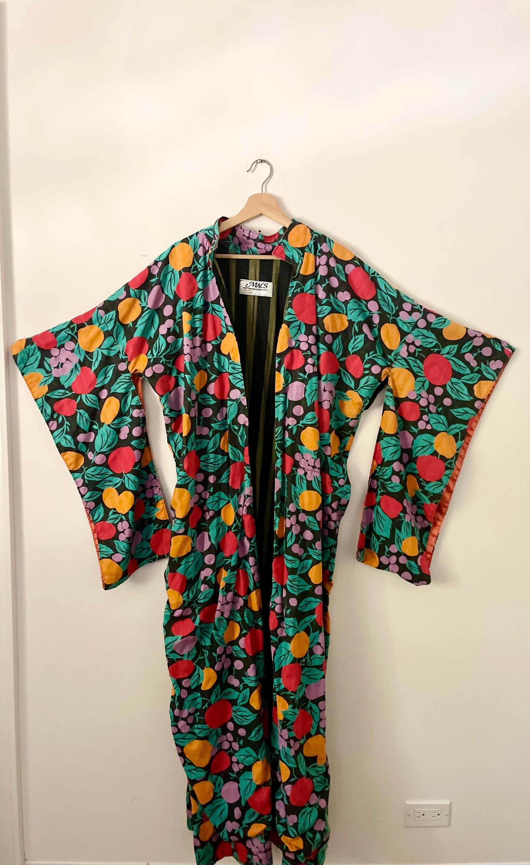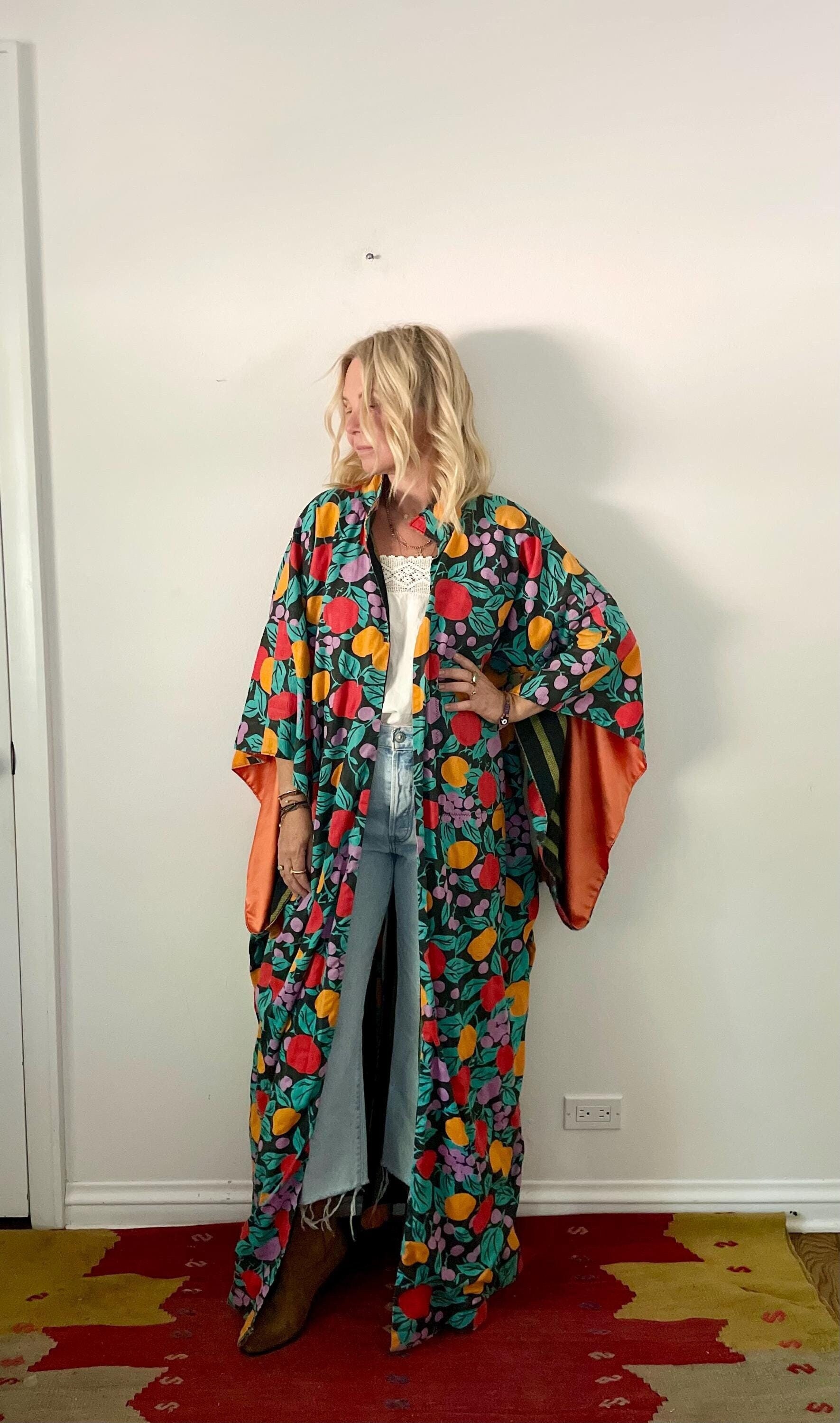 Vintage Japanese kimono in citrus print w/ statement sleeves. Stunning!