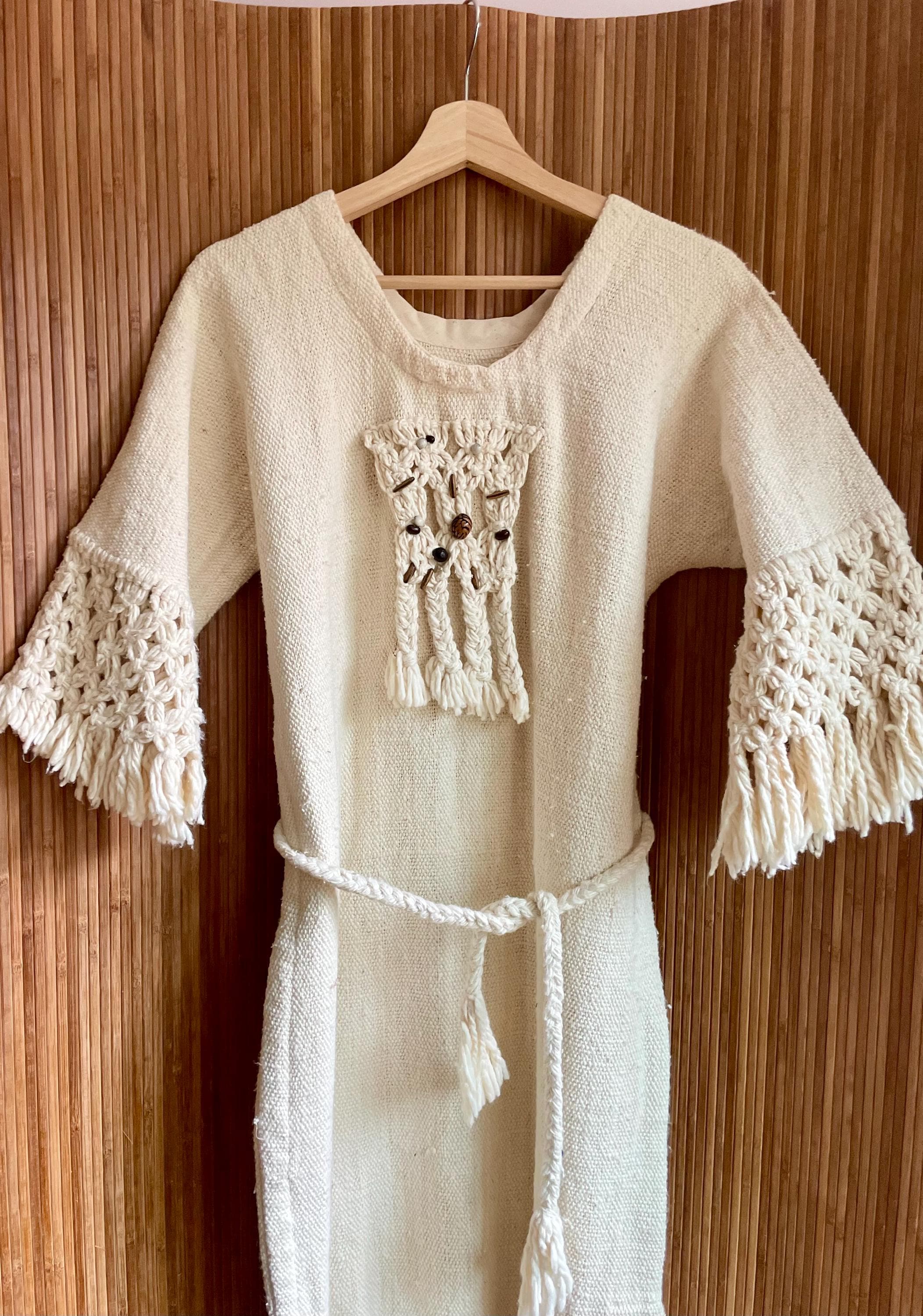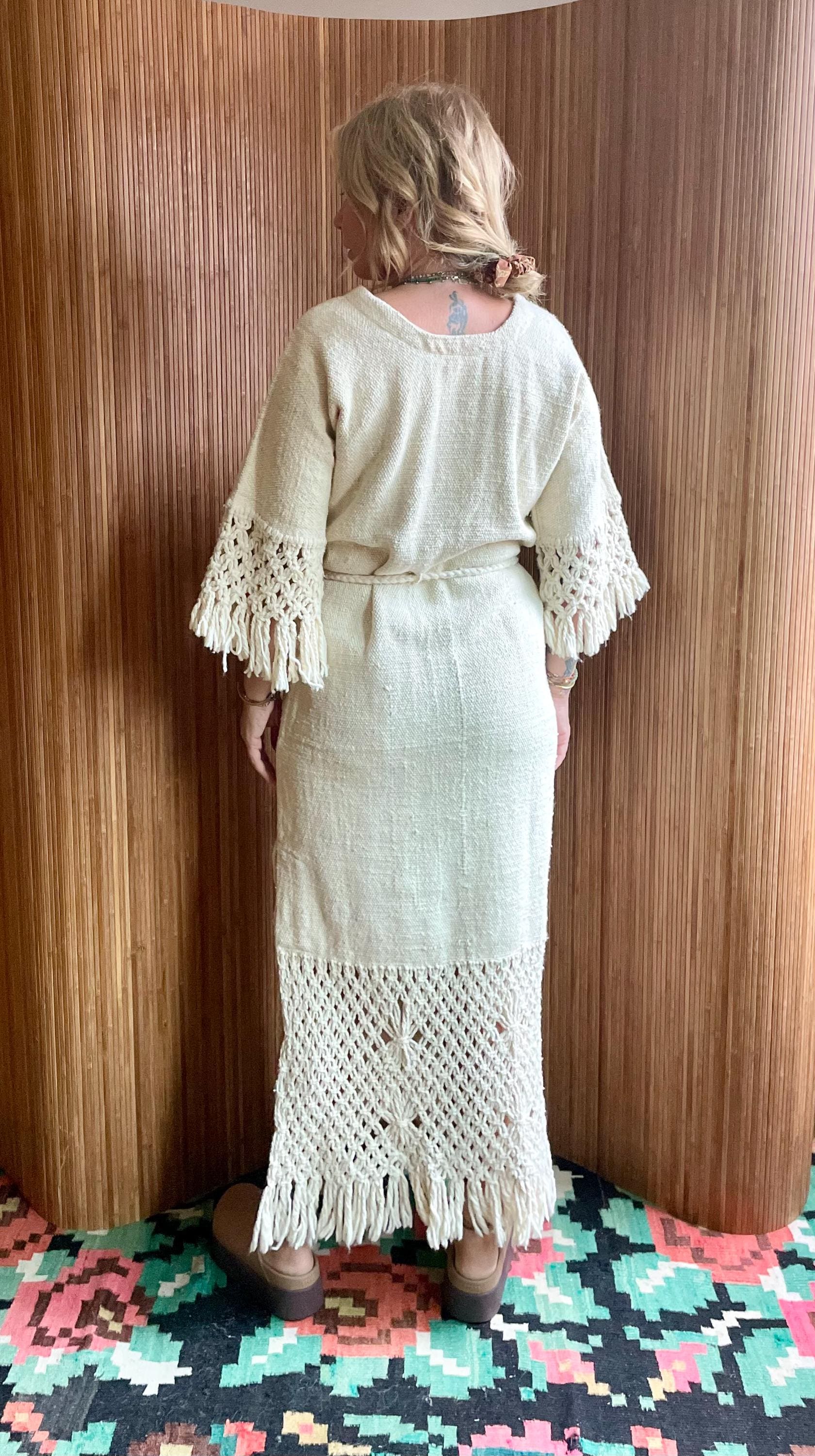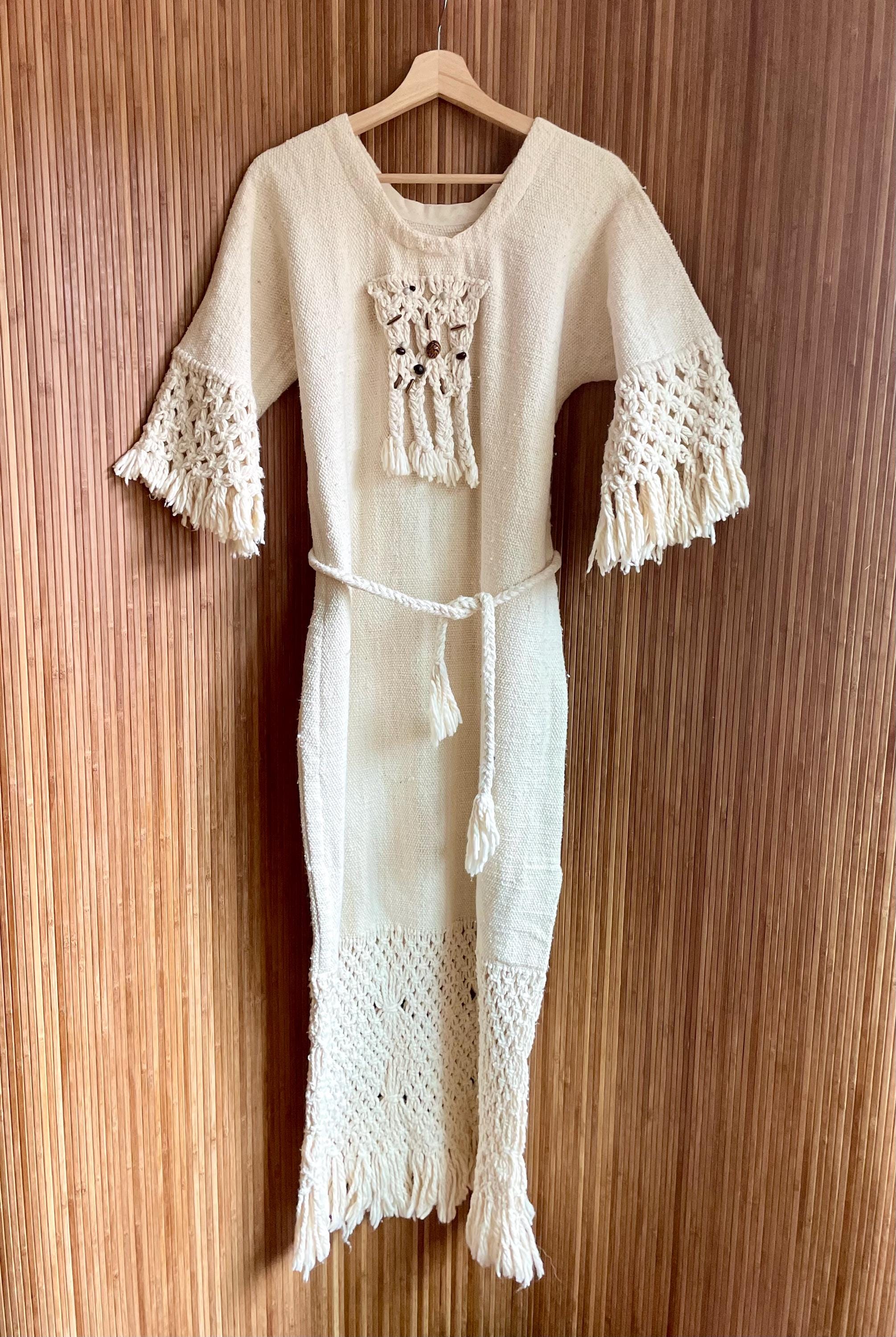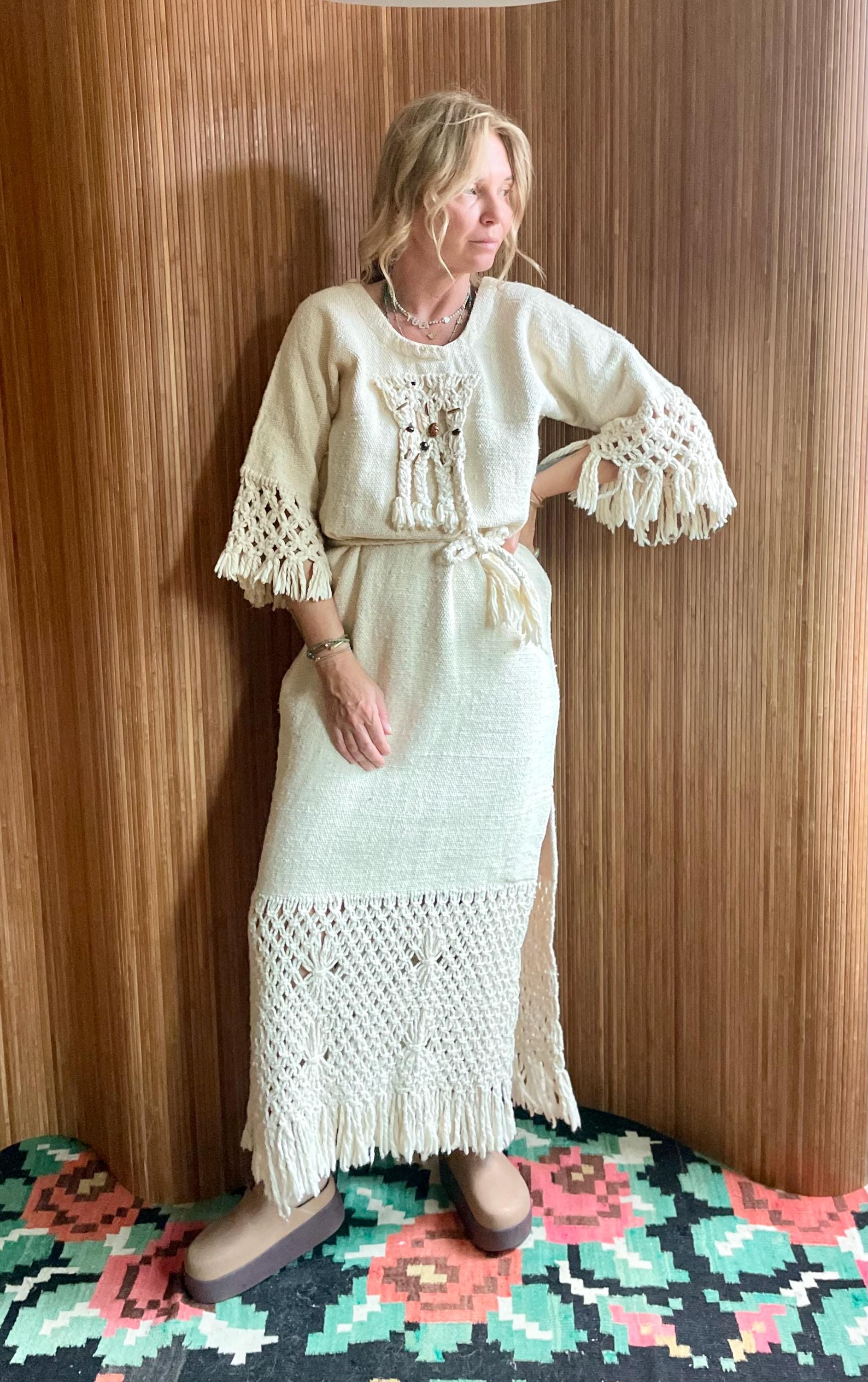 Step into effortless 1960s bohemian style with this vintage woven kaftan dress with macrame details and beading . Crafted in beautifully textured woven fabric, it drapes gracefully with a boat neckline and a relaxed floor-length silhouette. Perfect for summer festivals, vacation lounging, or as an elegant beach cover-up.