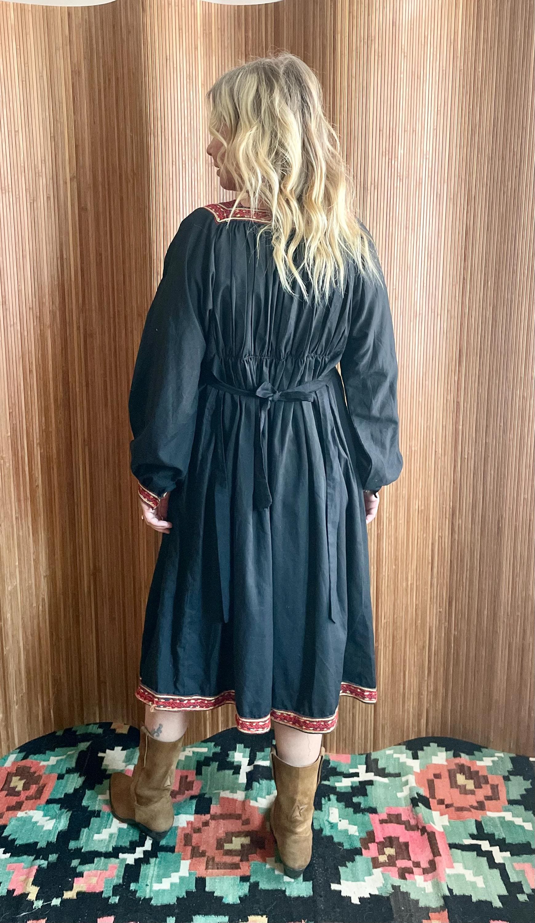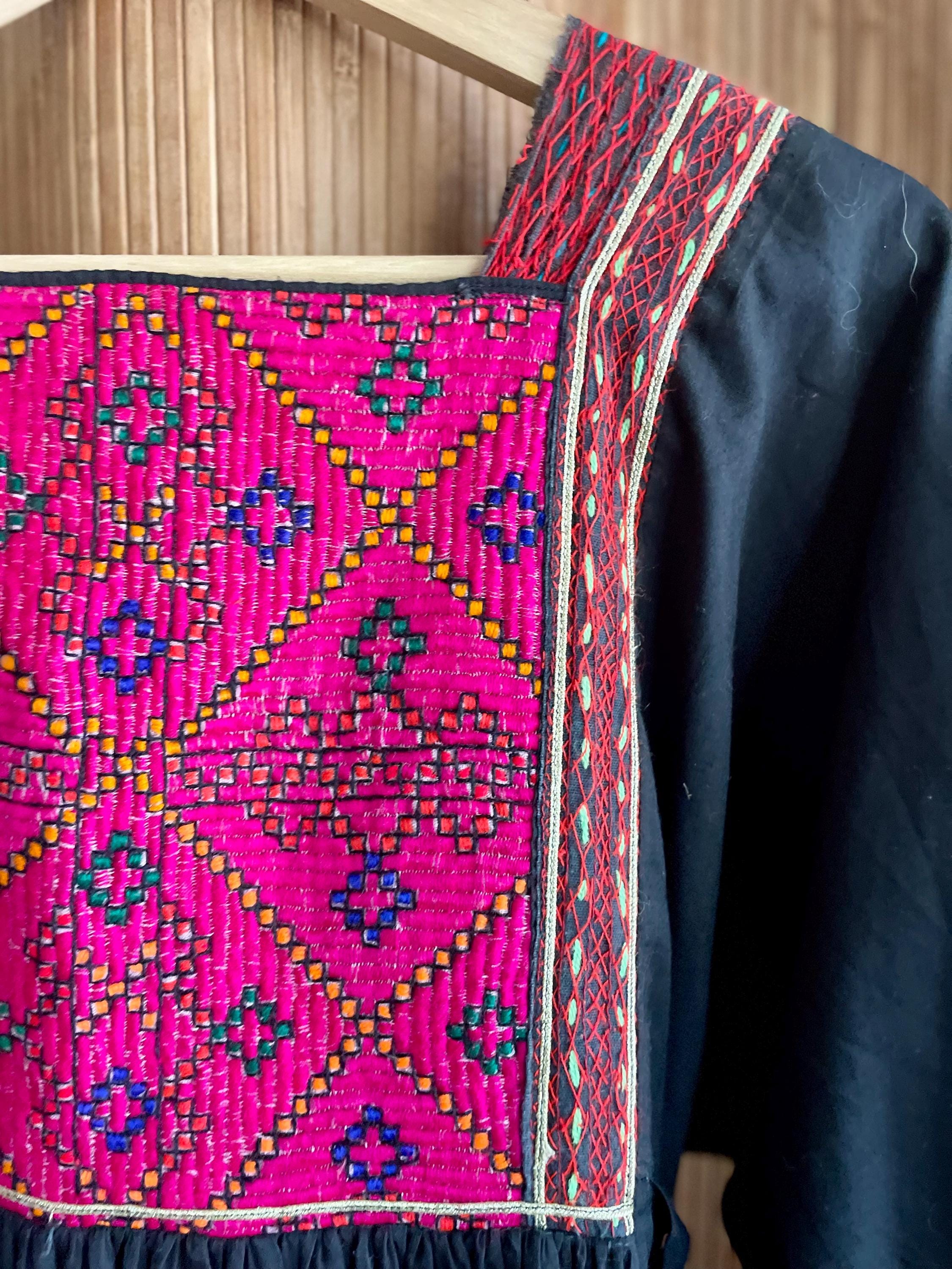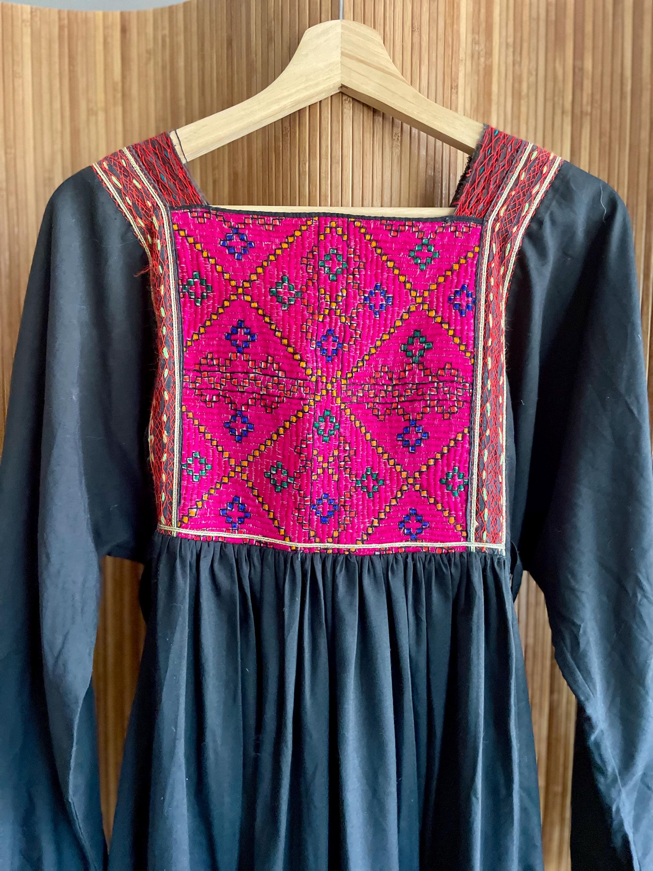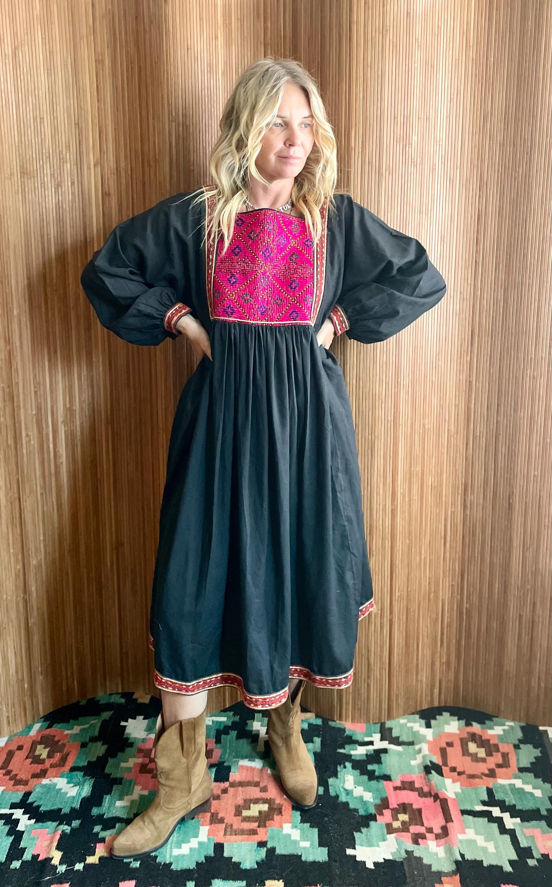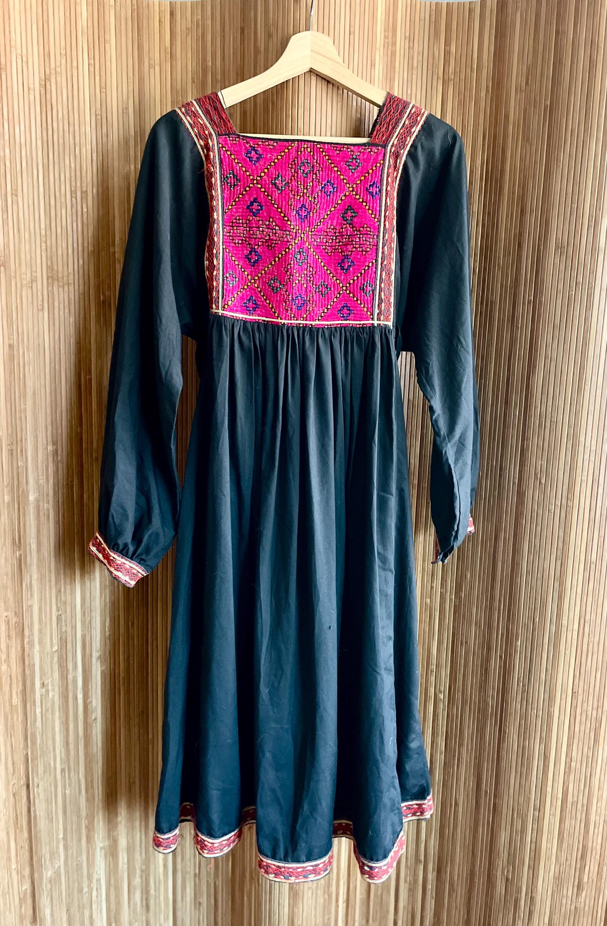 Make a striking statement with this vintage Afghan embroidered dress, a true bohemian treasure from the 1970s. Handcrafted with richly detailed embroidery and folk-inspired motifs, this dress features a comfortable loose fit and dramatic cultural artistry — perfect for festivals, collectors, and lovers of global style.