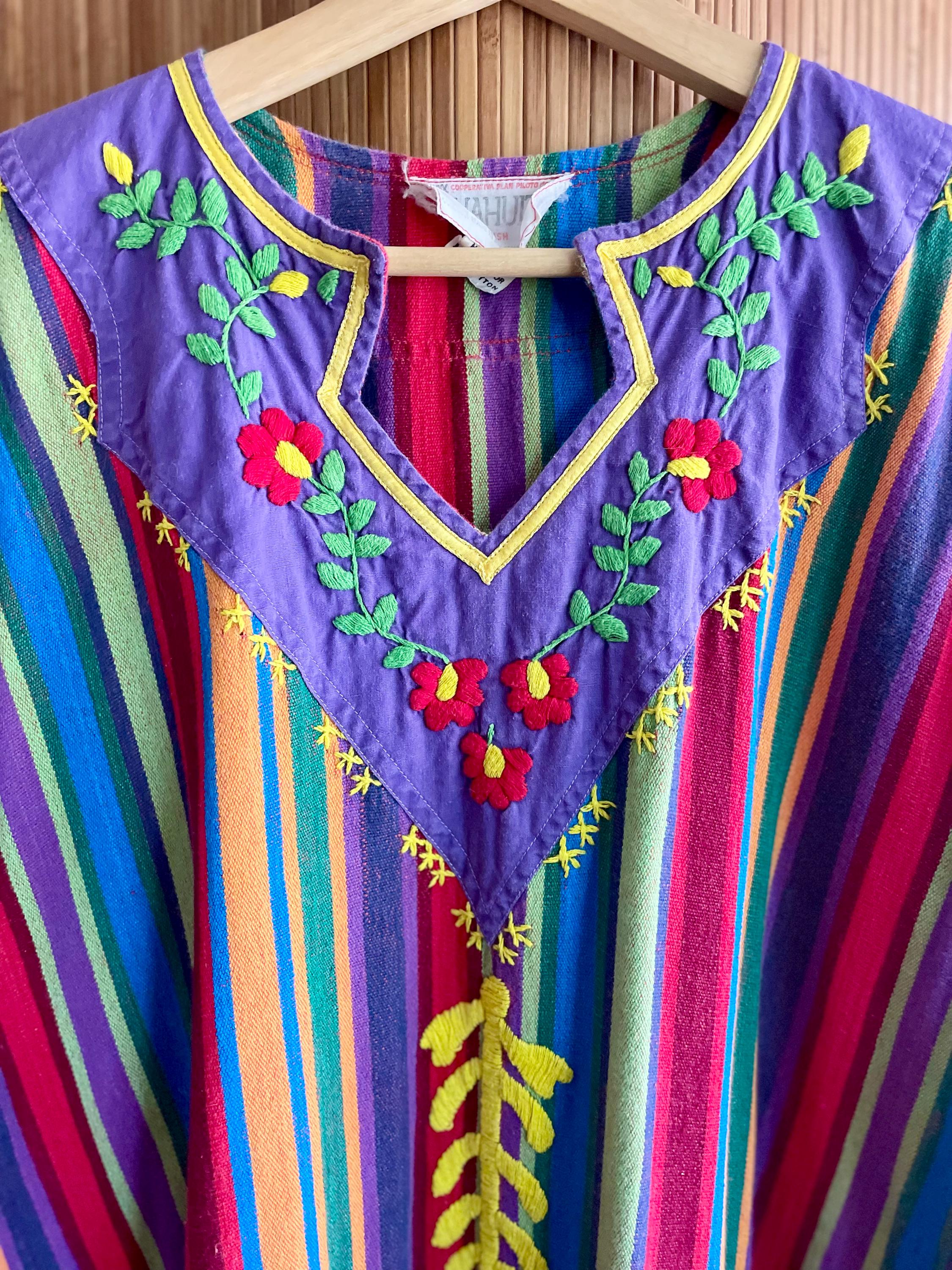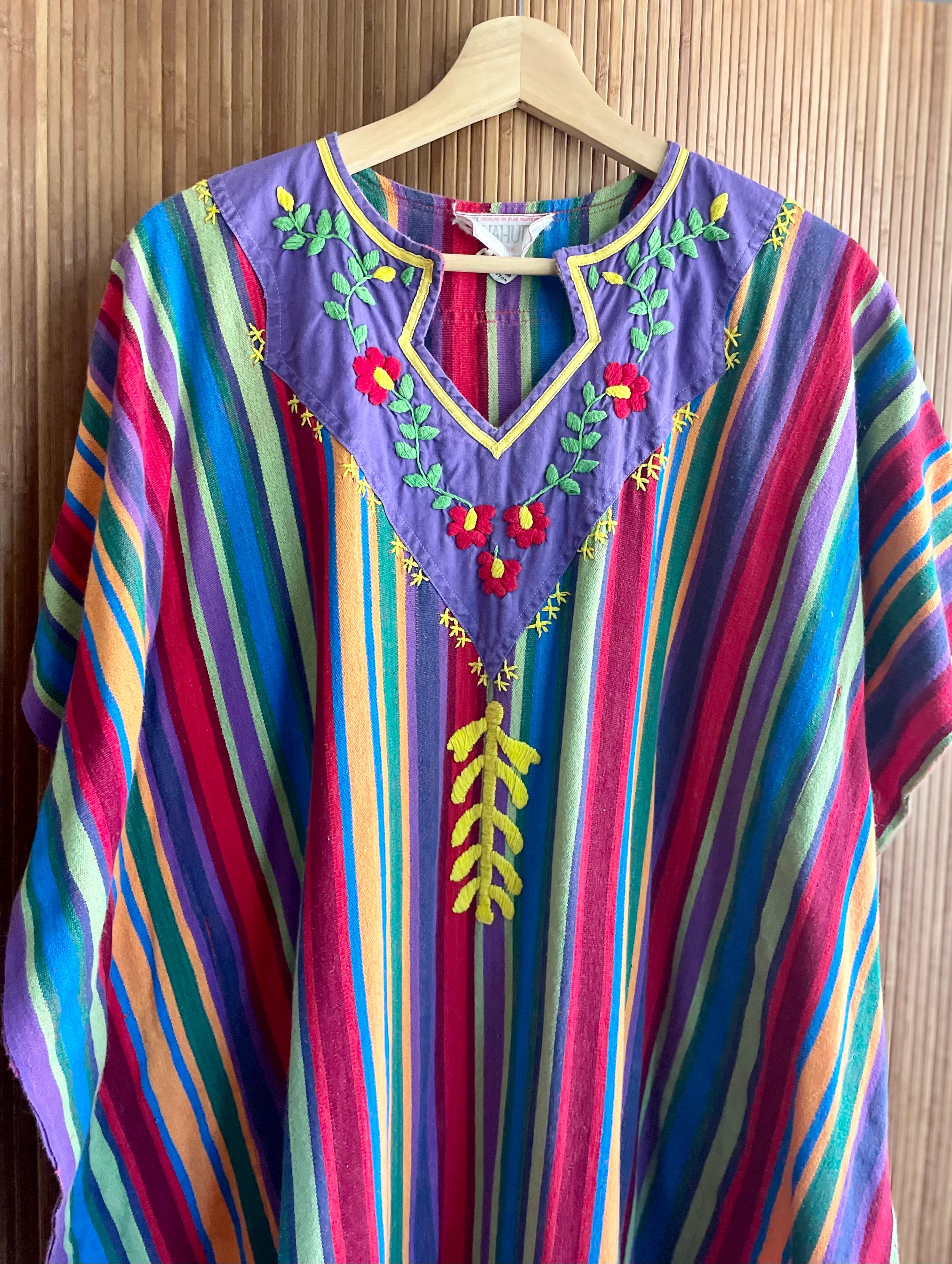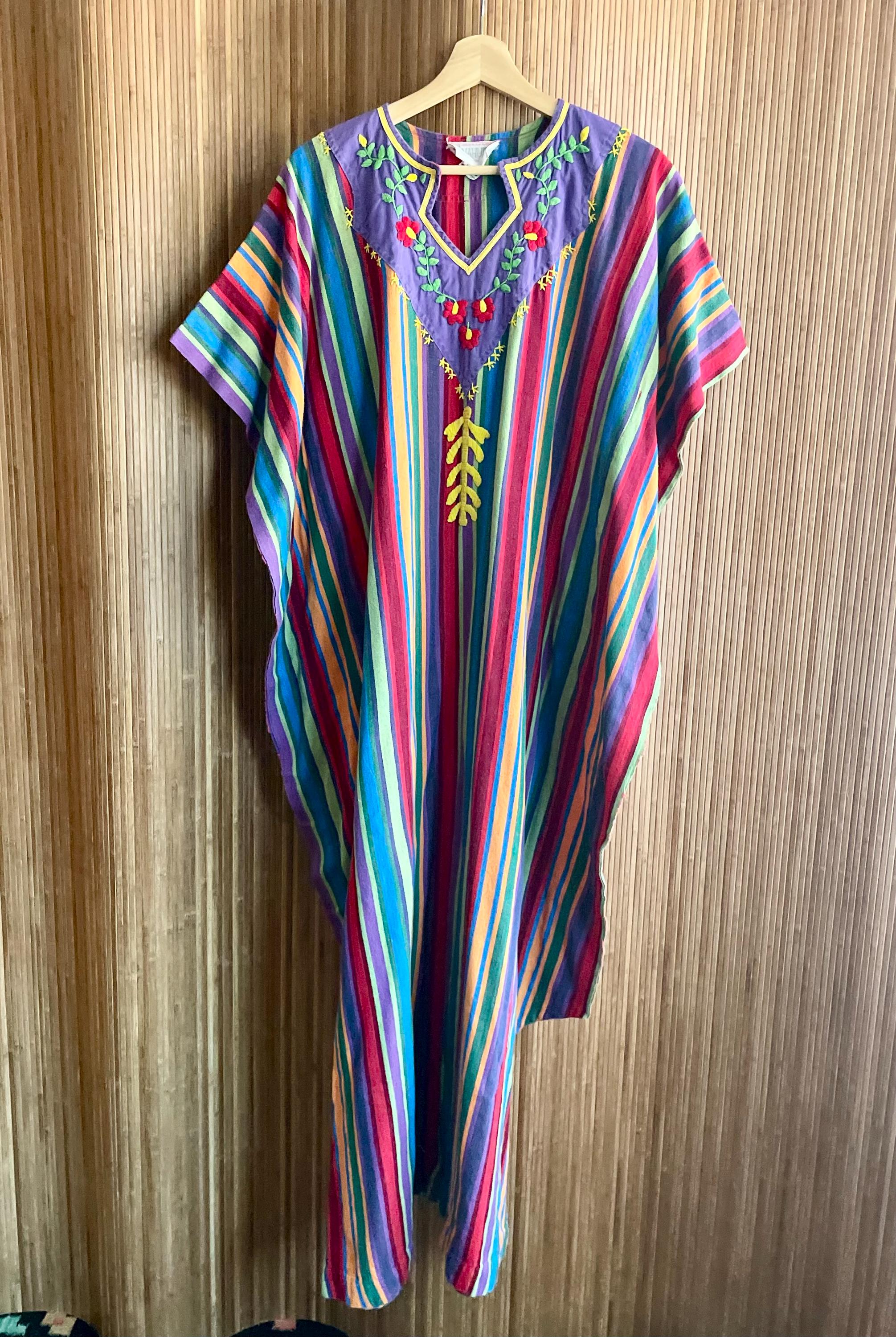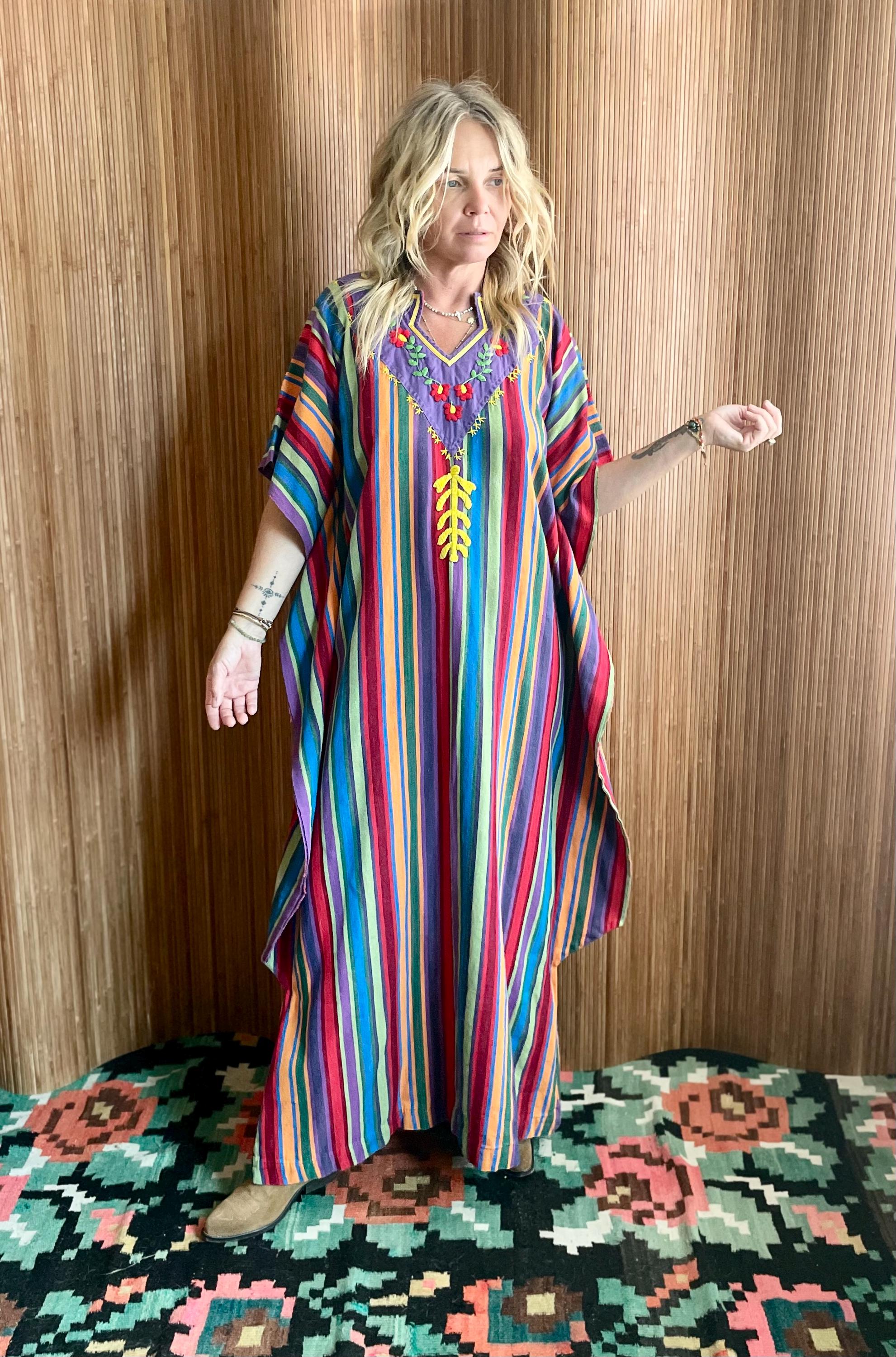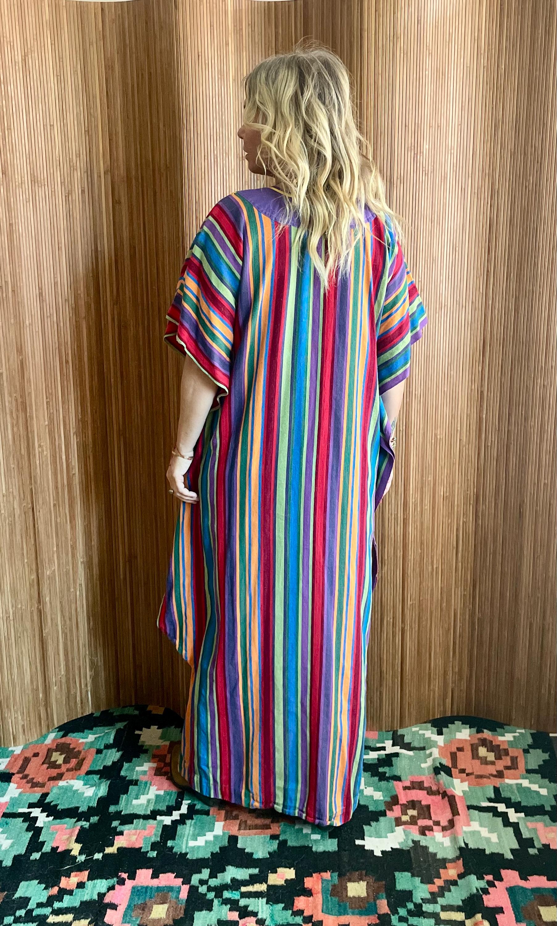 Bring effortless 1970s bohemian charm to your wardrobe with this vintage striped woven ethnic kaftan. Crafted from lightweight handwoven cotton with vibrant vertical stripes, it features a relaxed maxi silhouette, airy fit, and breezy movement — perfect for festivals, resort getaways, or summer lounging.