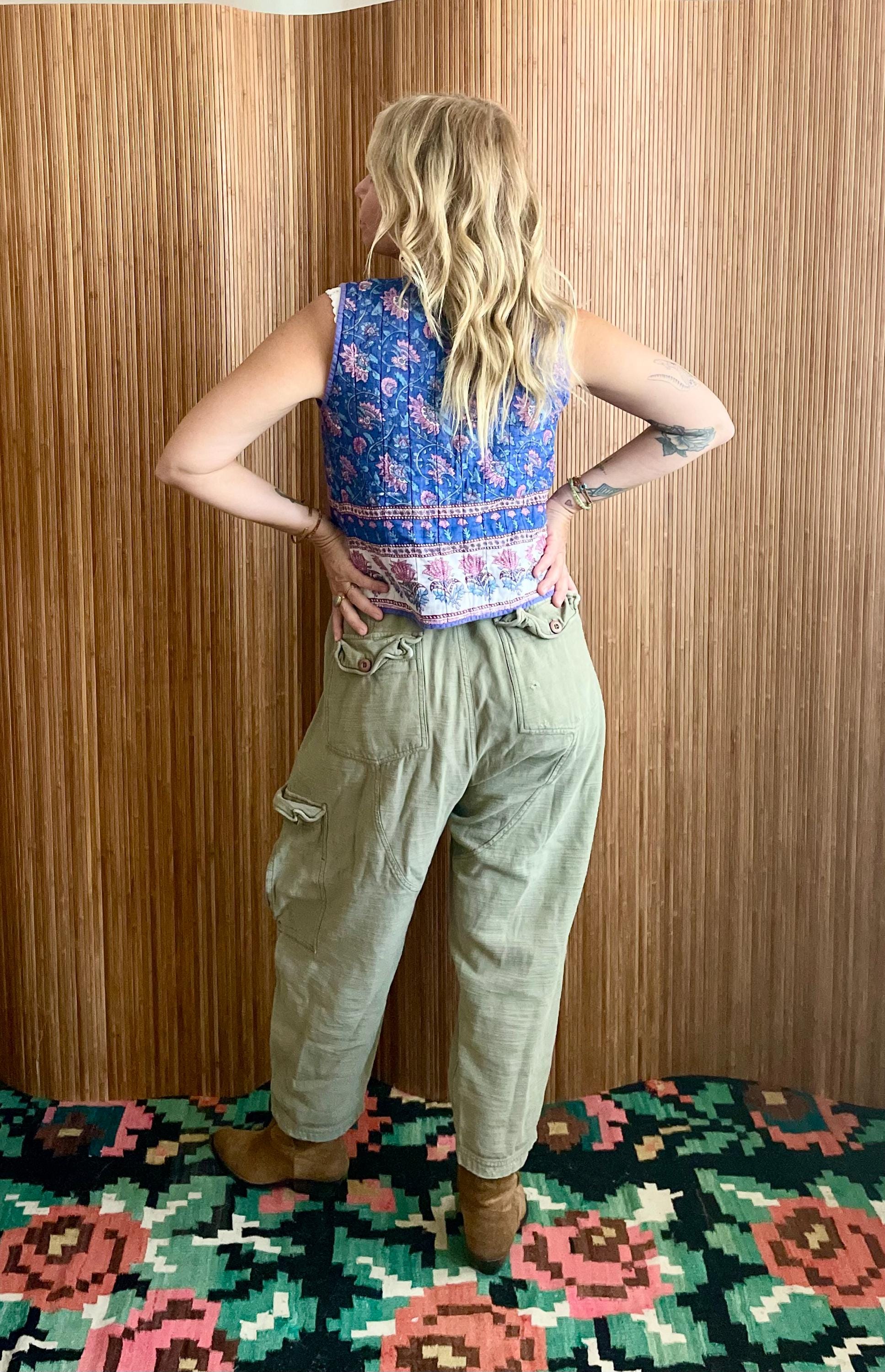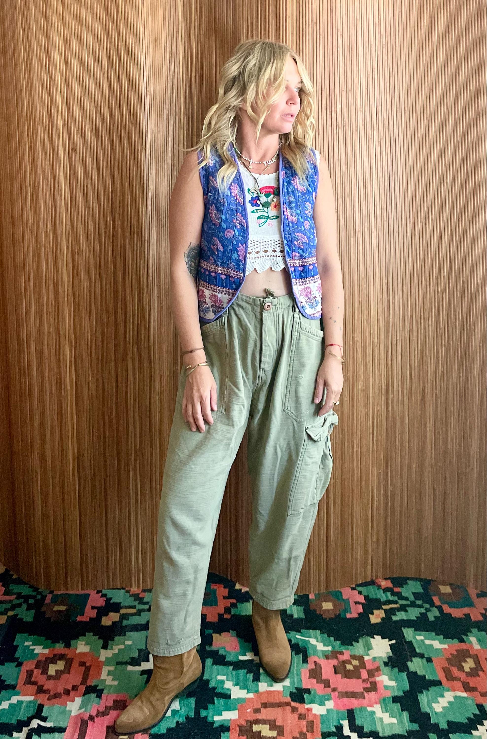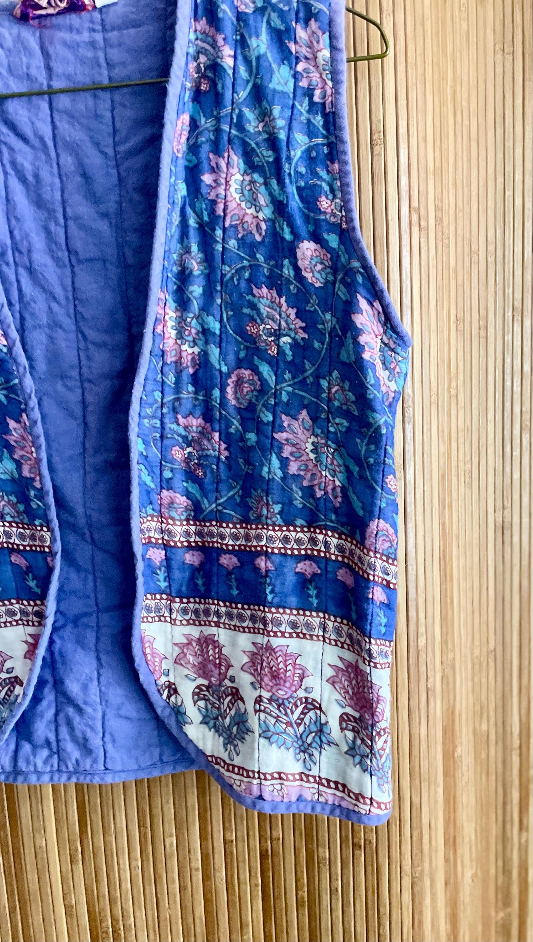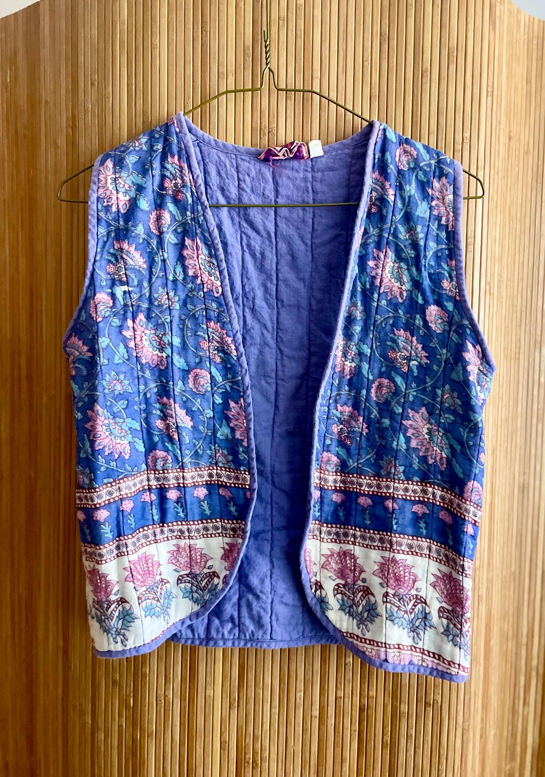 A bohemian layering essential made from lightweight, hand-printed cotton and traditionally quilted for comfort and texture. This 70s-style gilet features vibrant floral block prints and a versatile open-front cut — perfect for festival styling, travel, or everyday folk fashion.