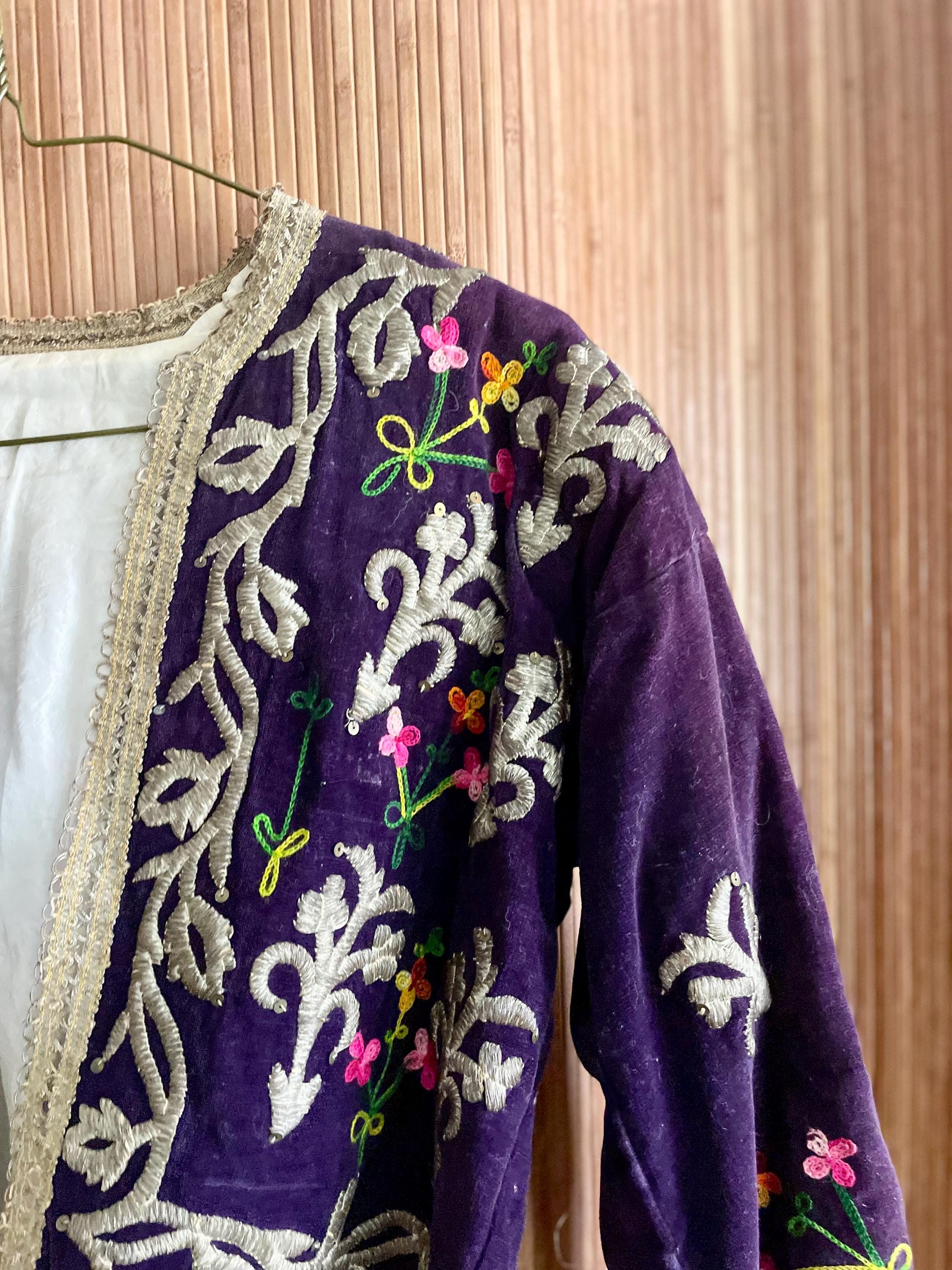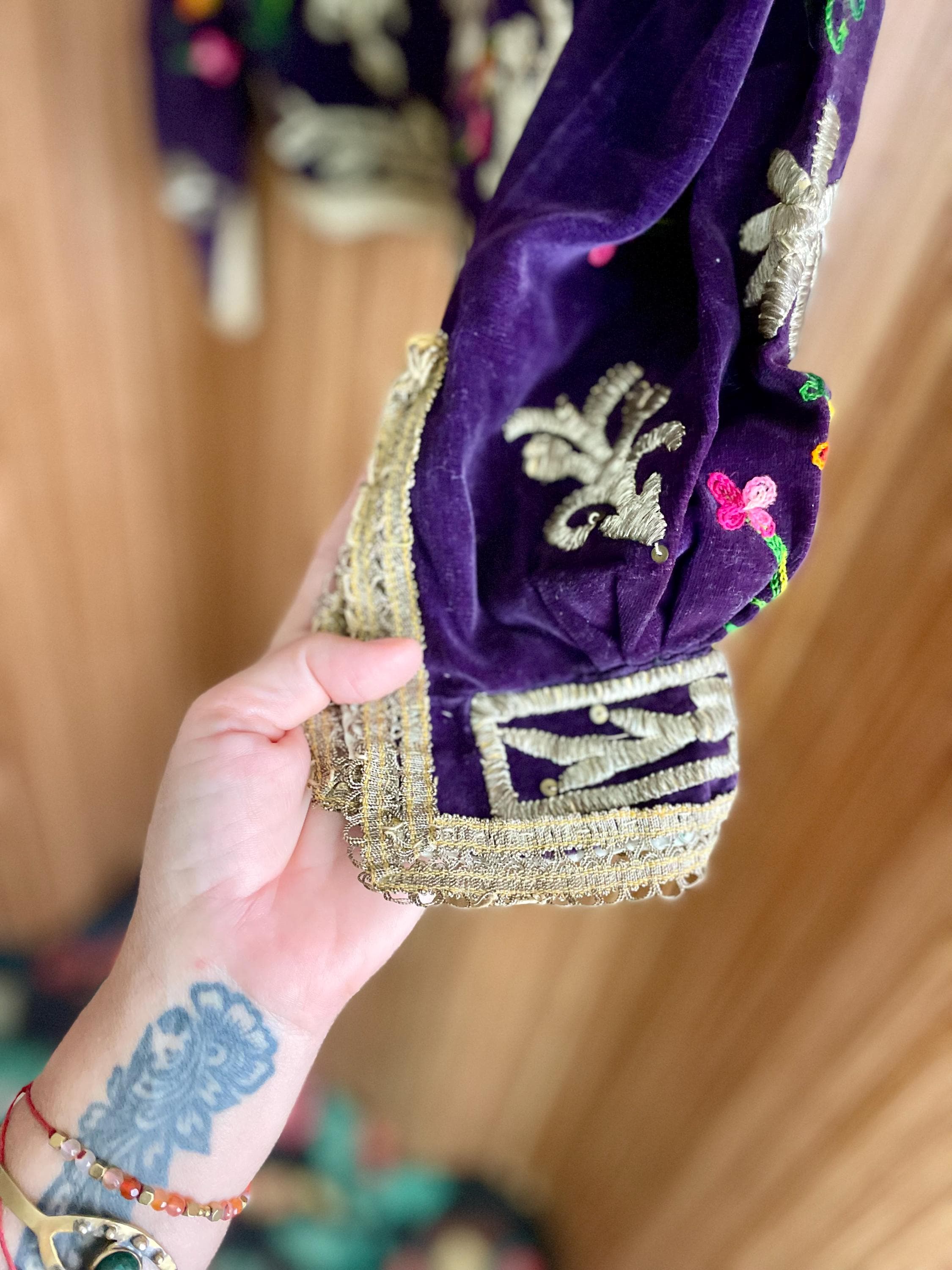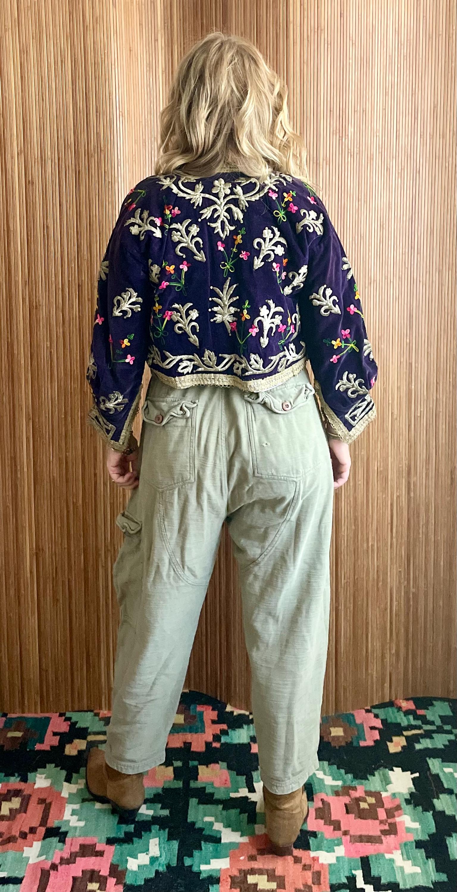 One-of-a-kind heirloom jacket with intricate hand-stitched floral embroidery on deep plush velvet. This antique Ottoman / Balkan / Central Asian folk costume, this piece radiates craftsmanship and heritage. Cropped open front, lightly structured shoulders, and bold trim make it a perfect statement layer.