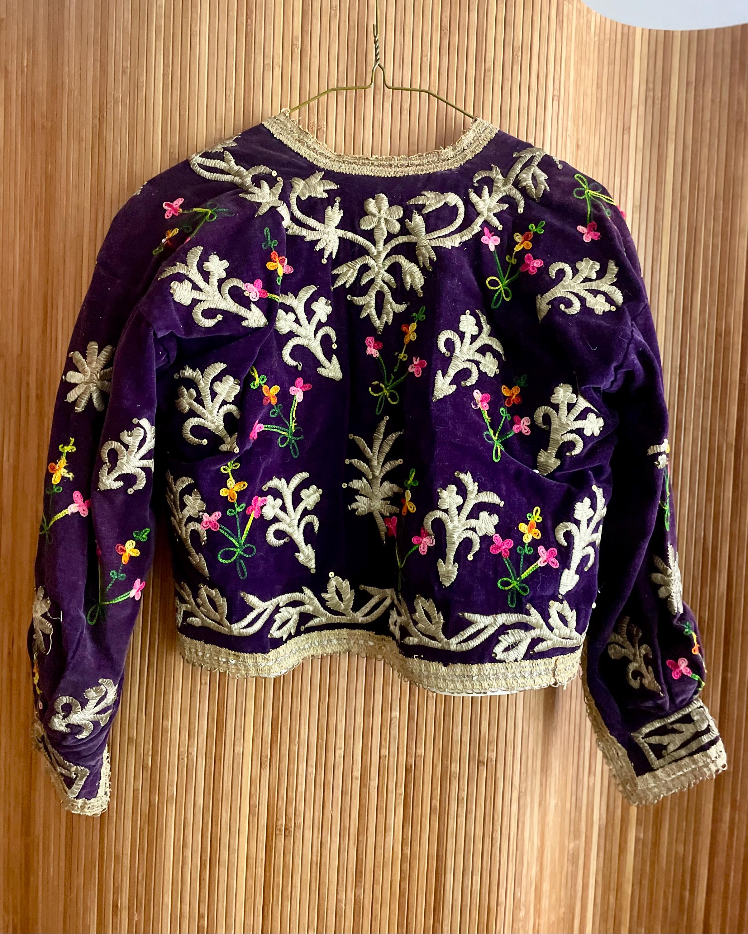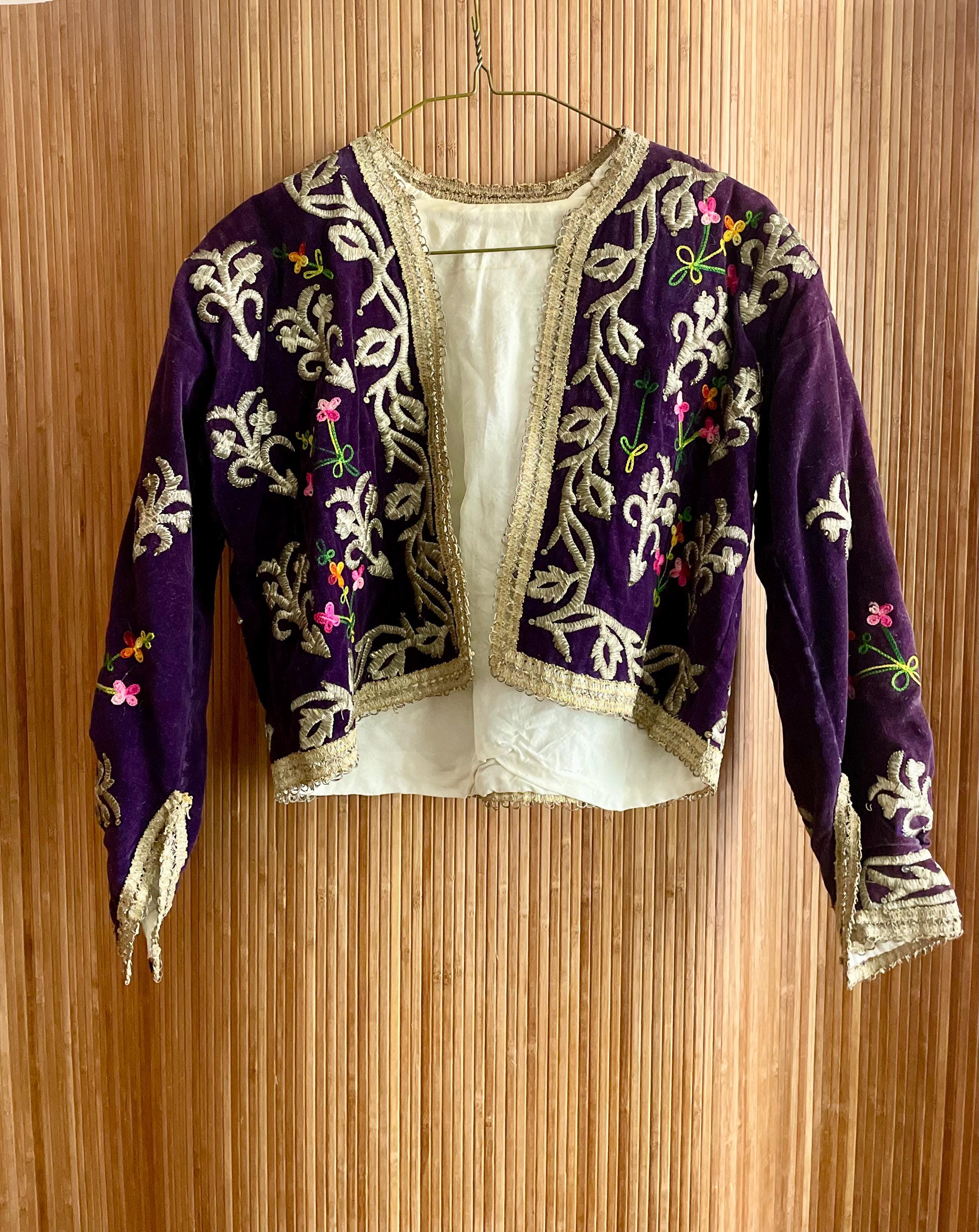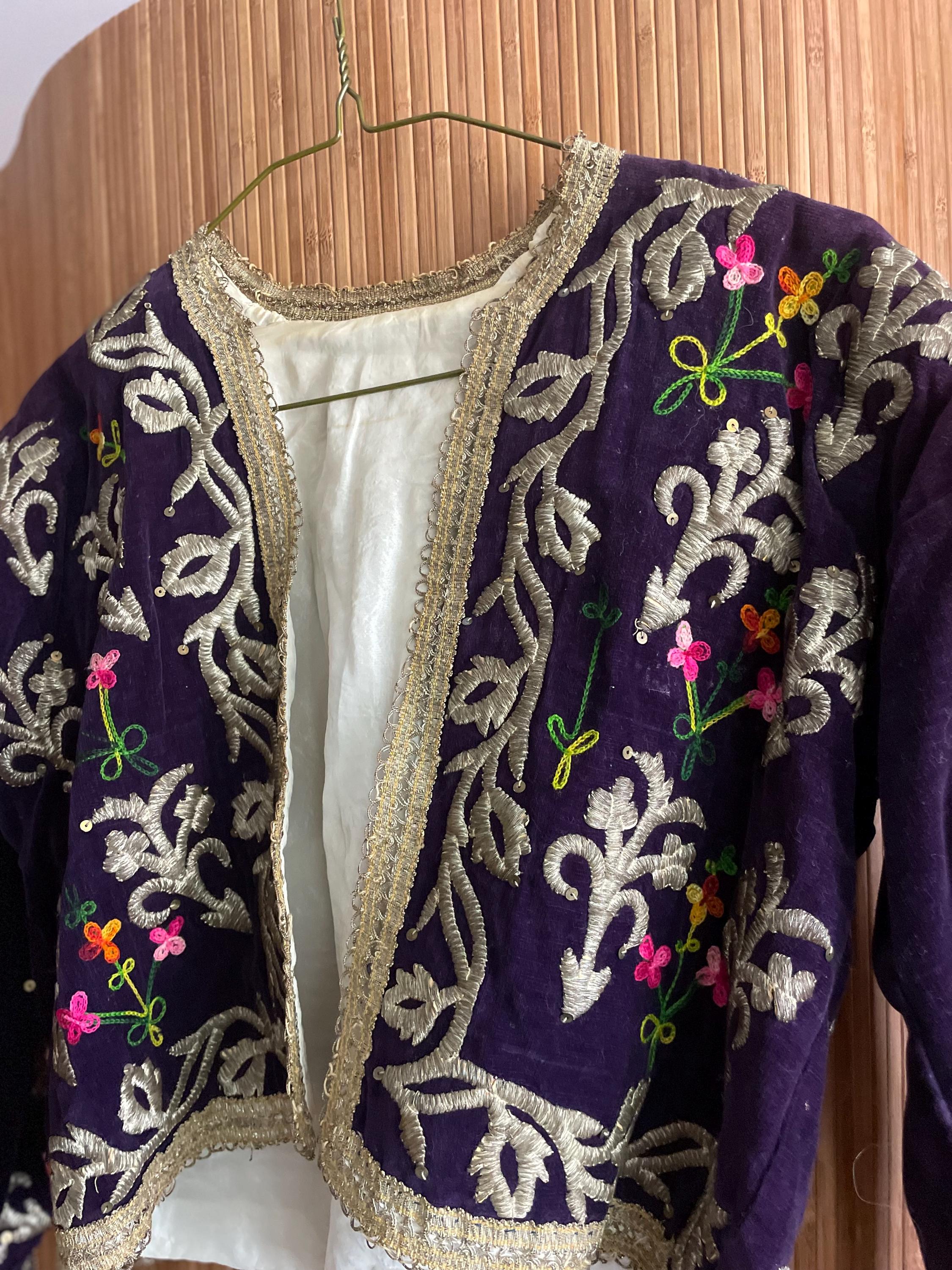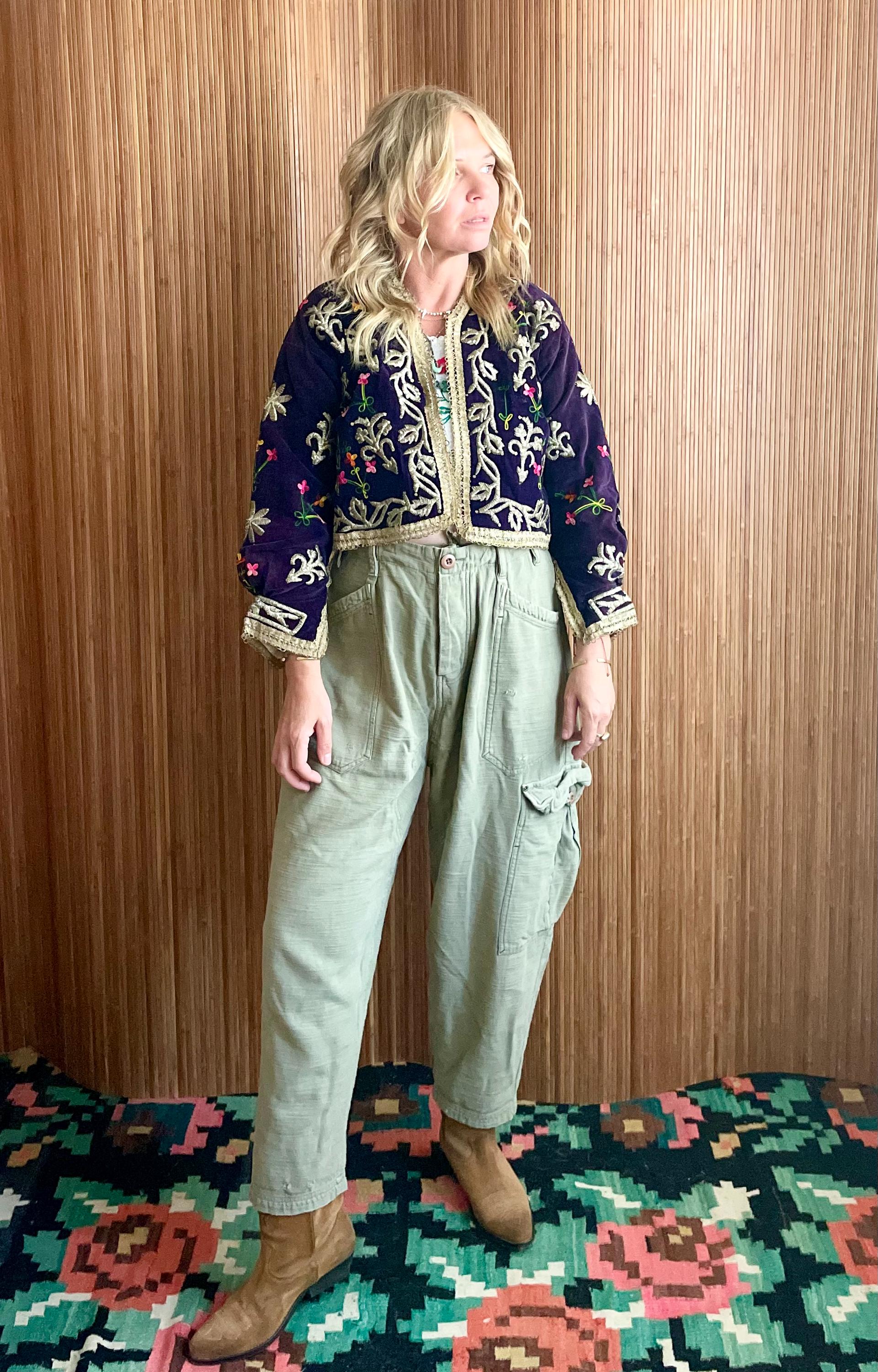 One-of-a-kind heirloom jacket with intricate hand-stitched floral embroidery on deep plush velvet. This antique Ottoman / Balkan / Central Asian folk costume, this piece radiates craftsmanship and heritage. Cropped open front, lightly structured shoulders, and bold trim make it a perfect statement layer.
