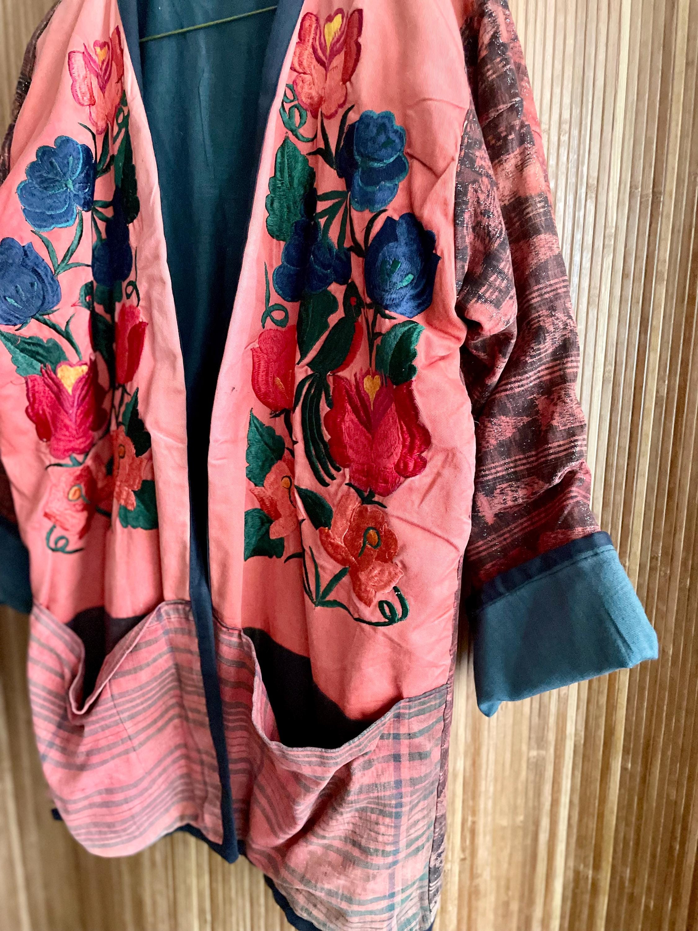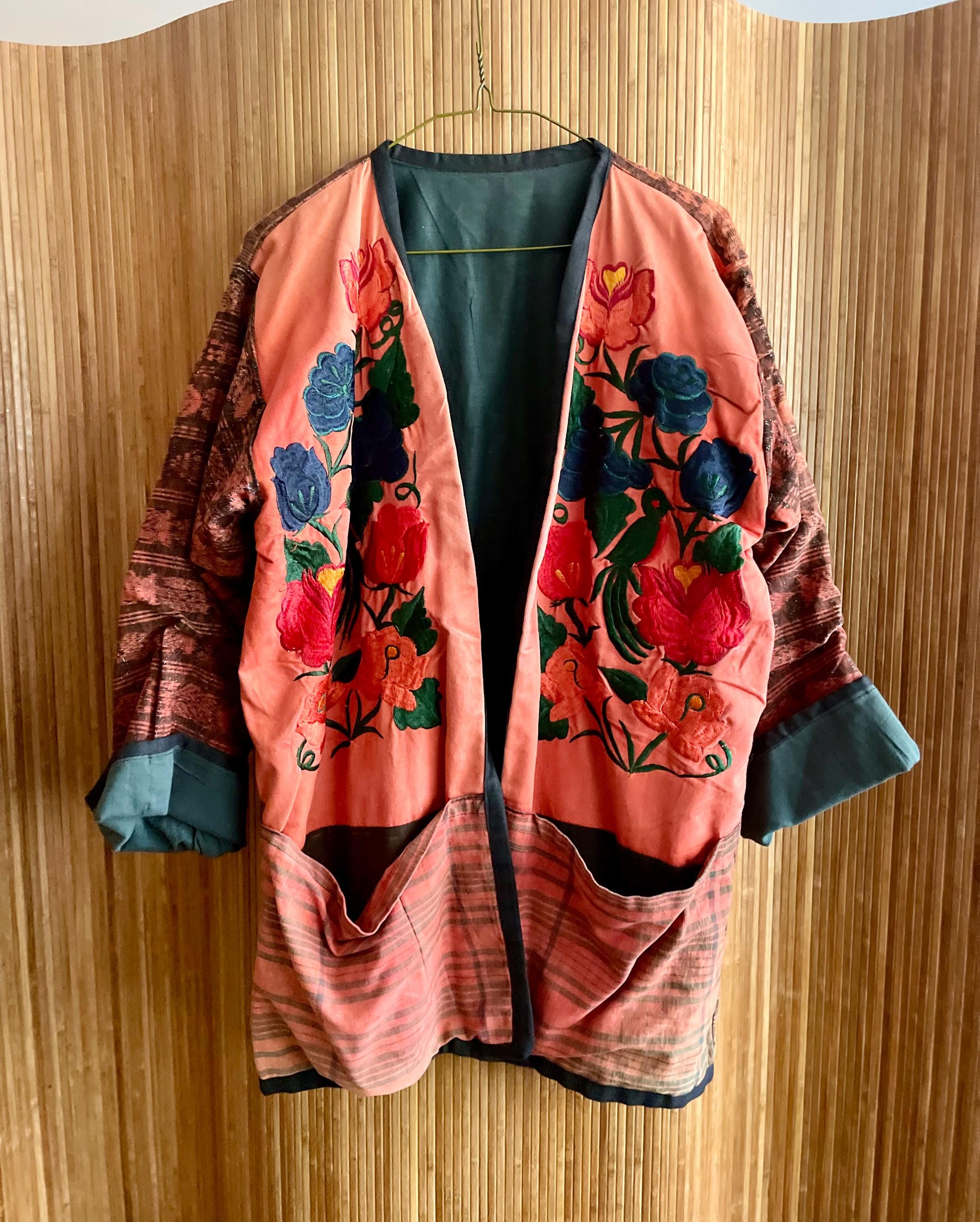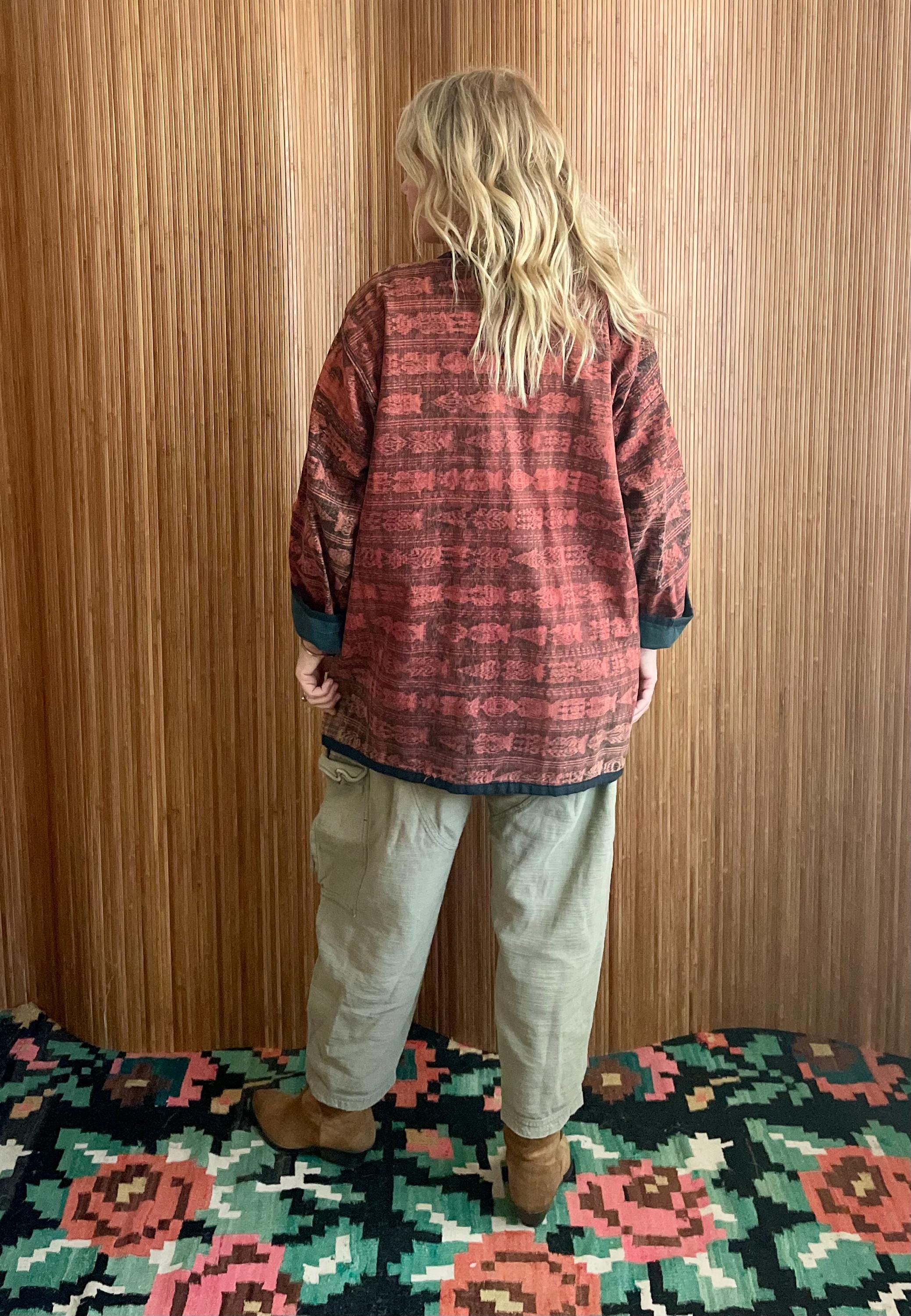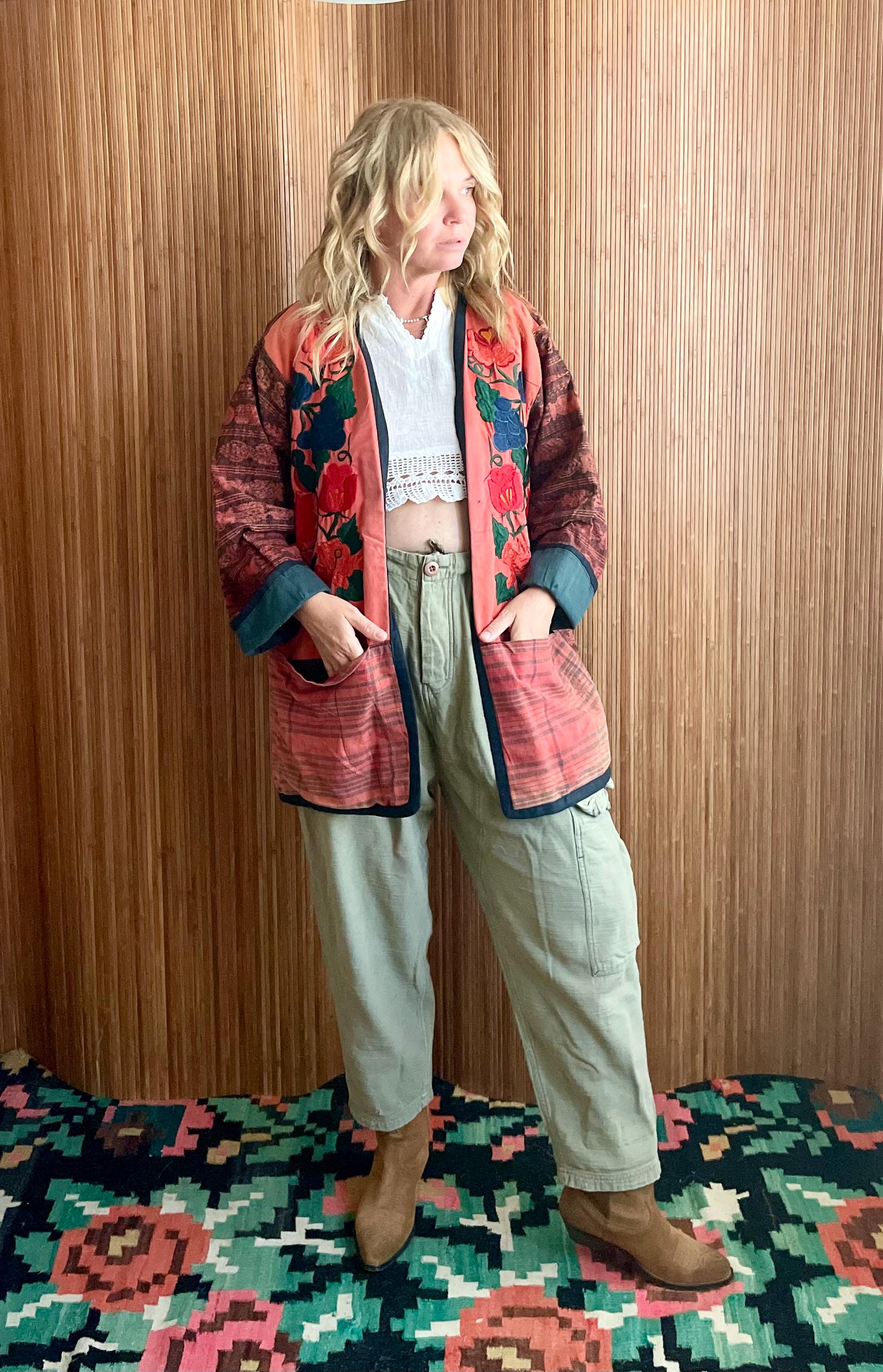 A rare handcrafted jacket made from traditional Guatemalan ikat weave and repurposed embroidered huipil panels. Soft yet structured with beautiful hand-stitched florals on a rich woven base — a striking mix of history and bohemian ease. Open front and relaxed fit make it versatile for layering.