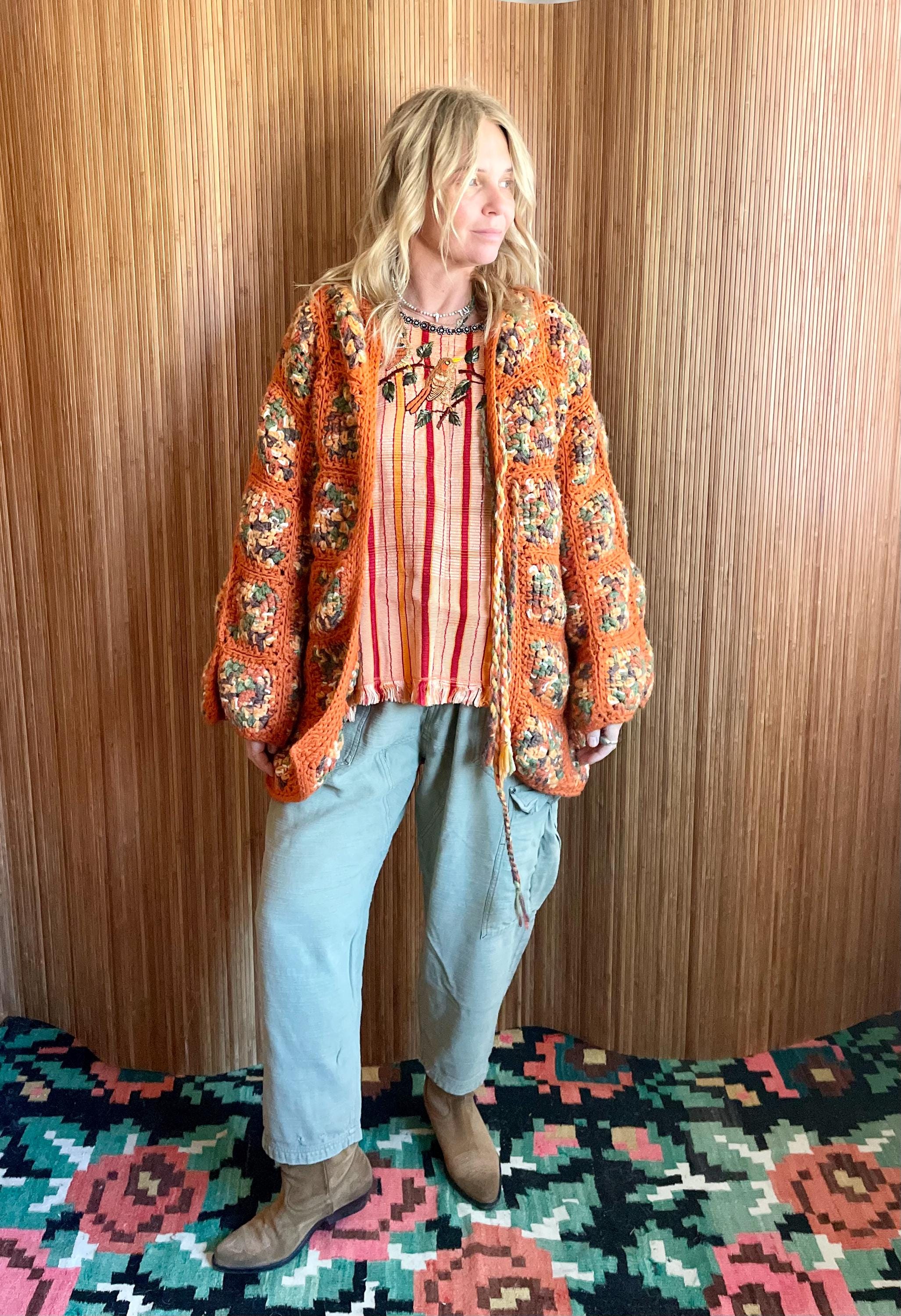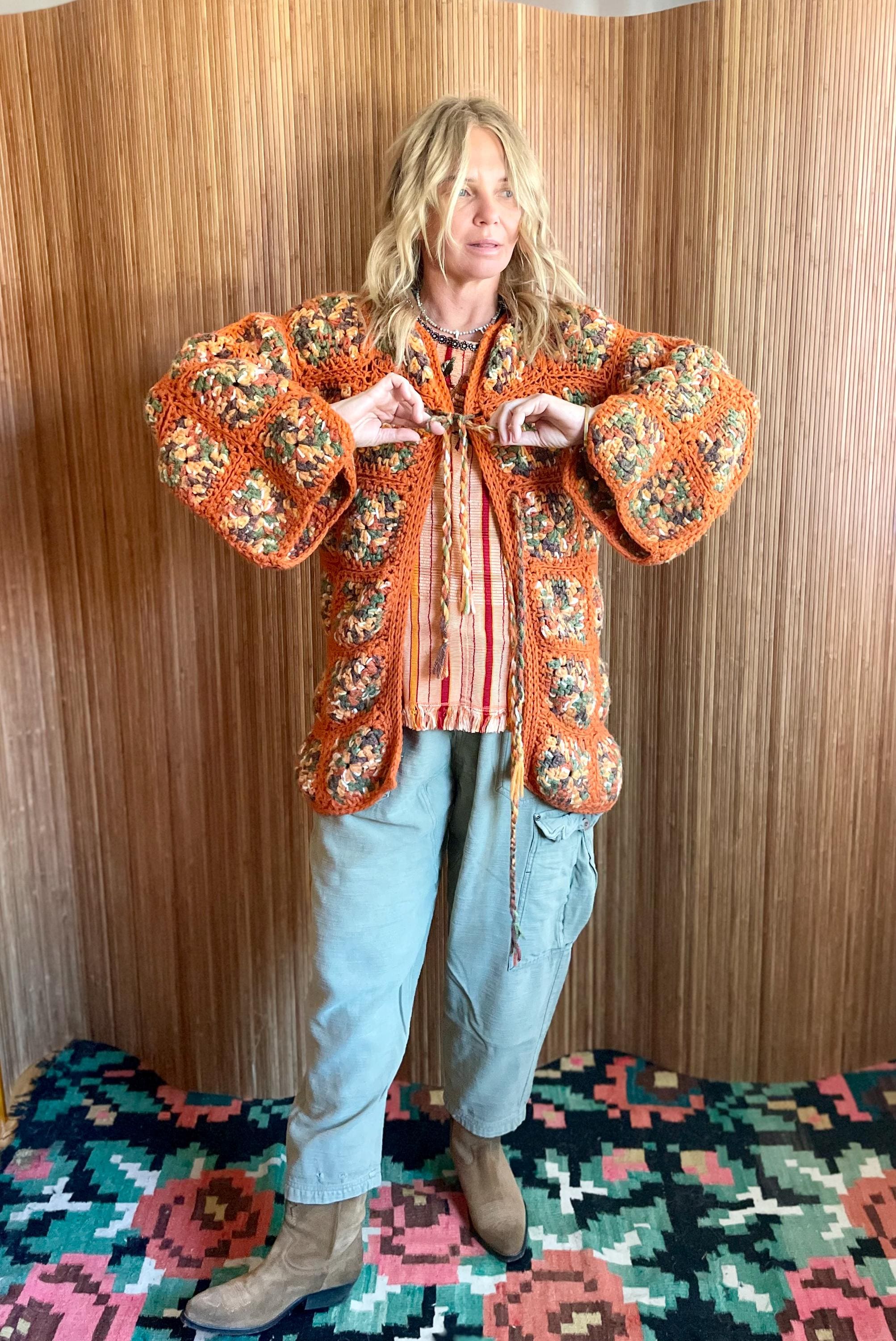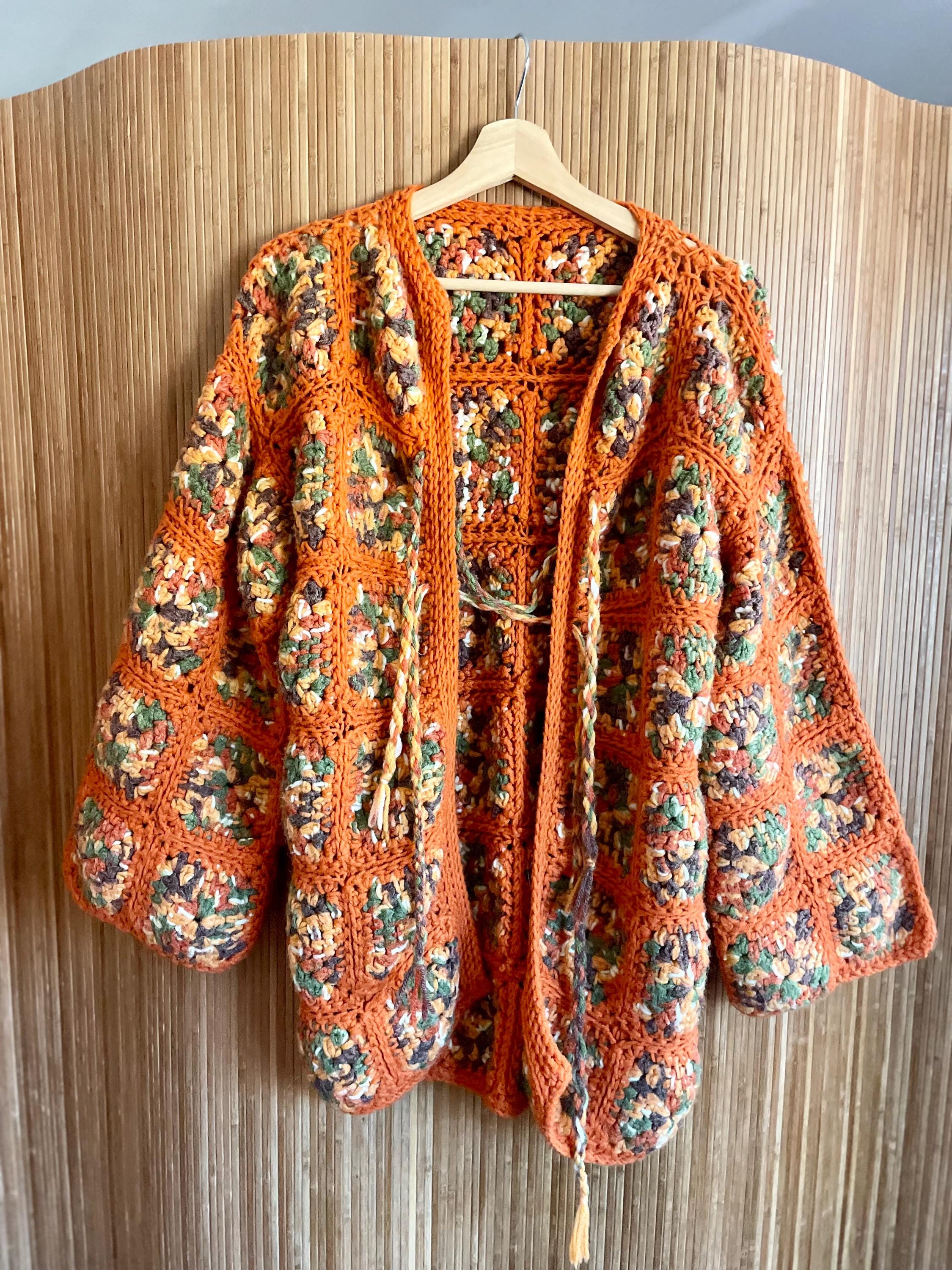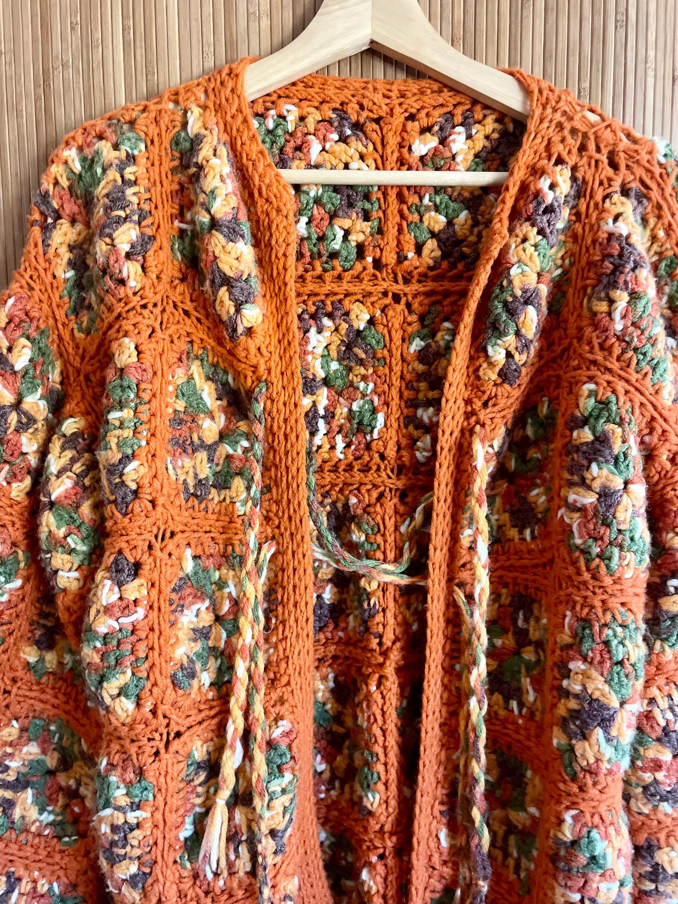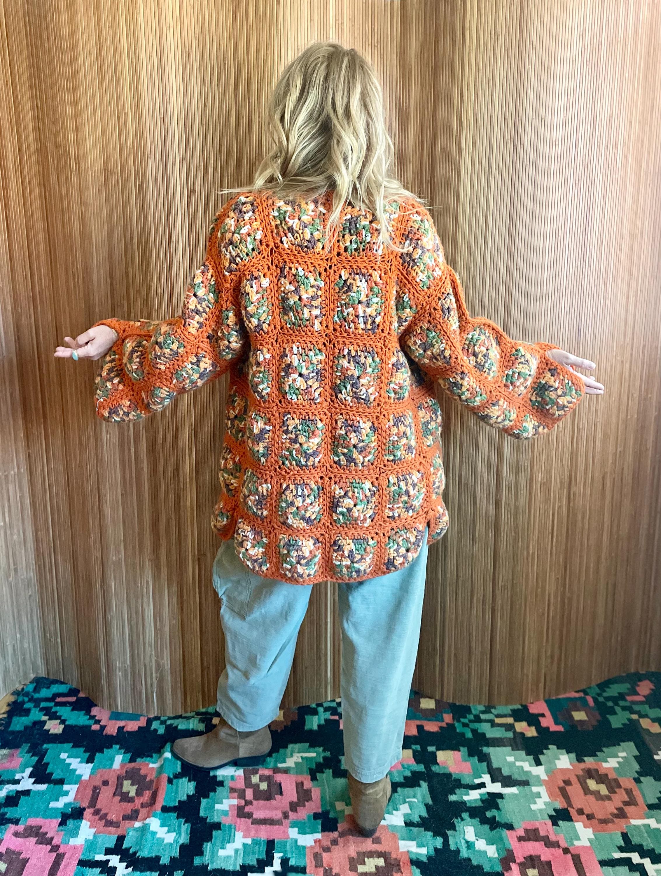 Embrace the retro vibes of this vintage 70s hand-knit Afghan crochet cardigan. Crafted with a classic granny square design in a vibrant orange colorway, this boho-chic jacket is a perfect statement piece. Ideal for layering, festivals, or adding a touch of vintage charm to your wardrobe. Fits up to size M, offering a cozy and unique addition to your closet.