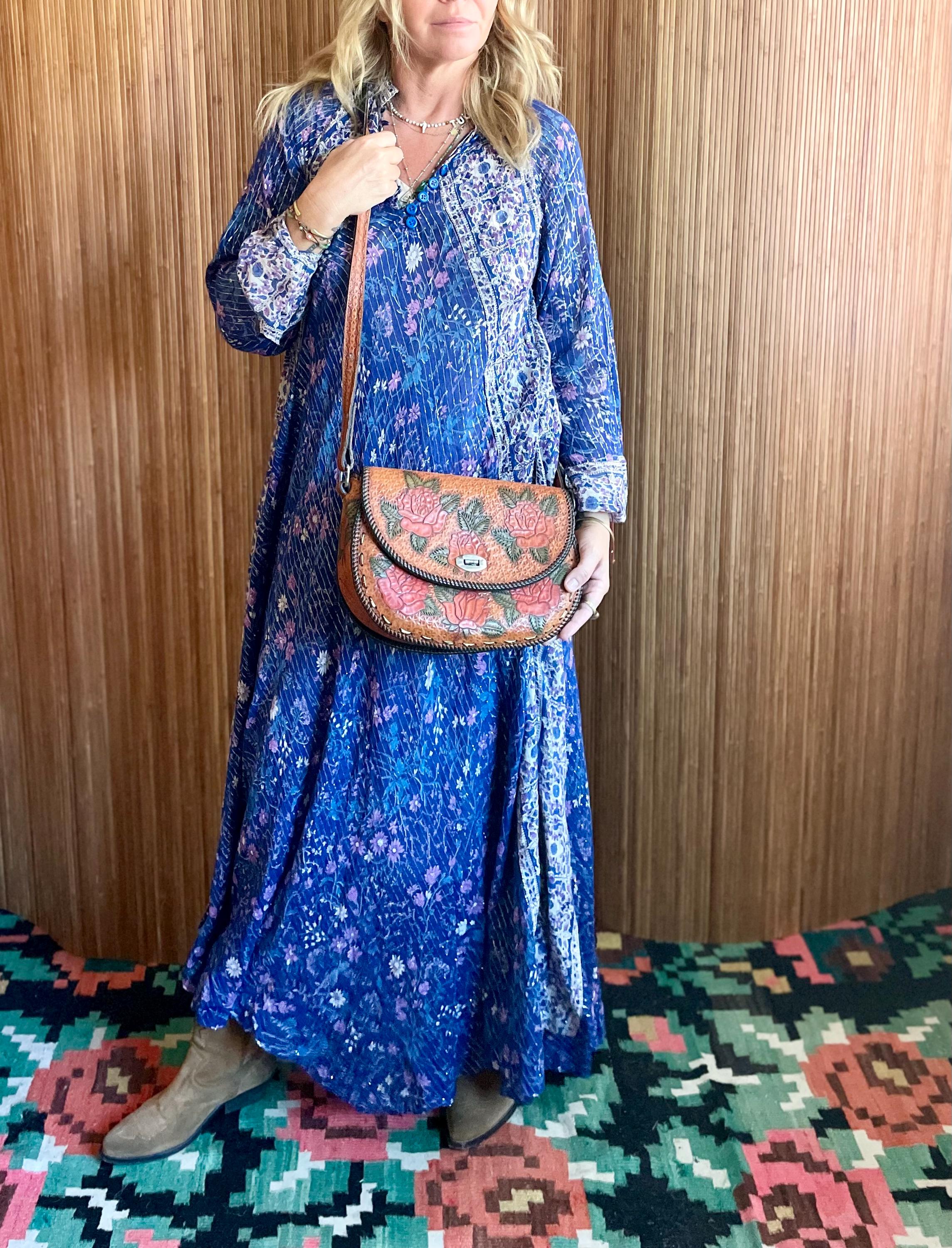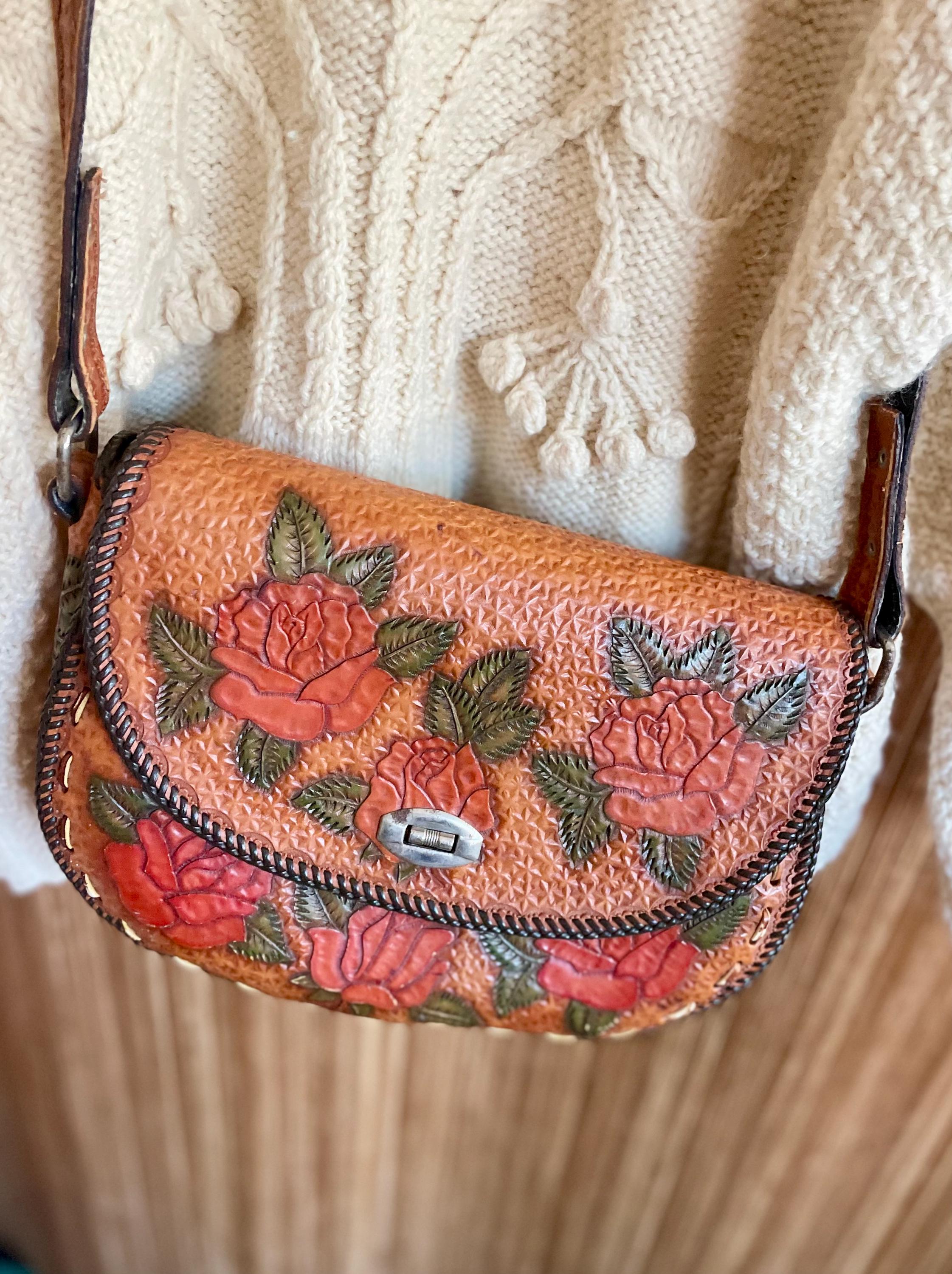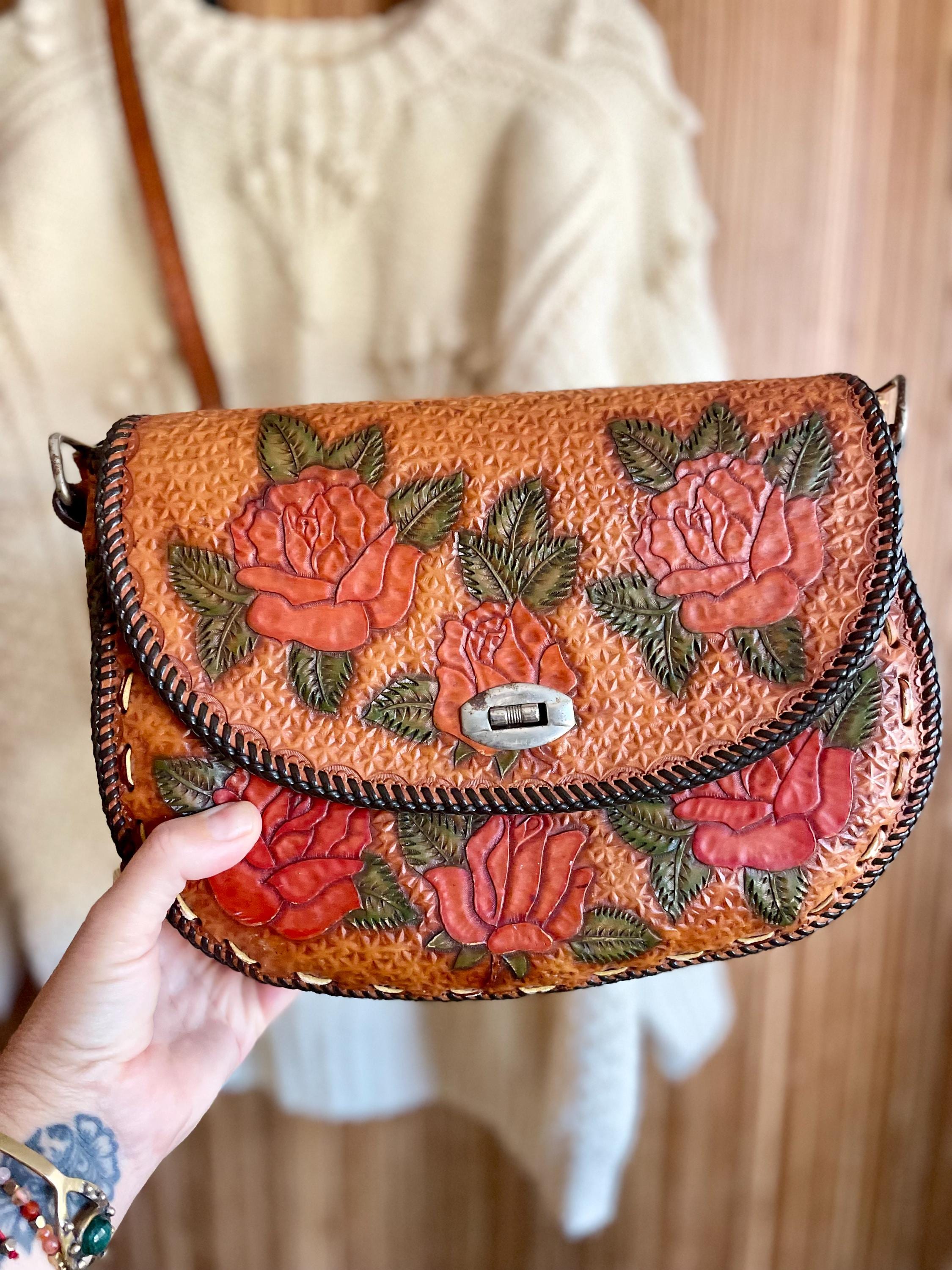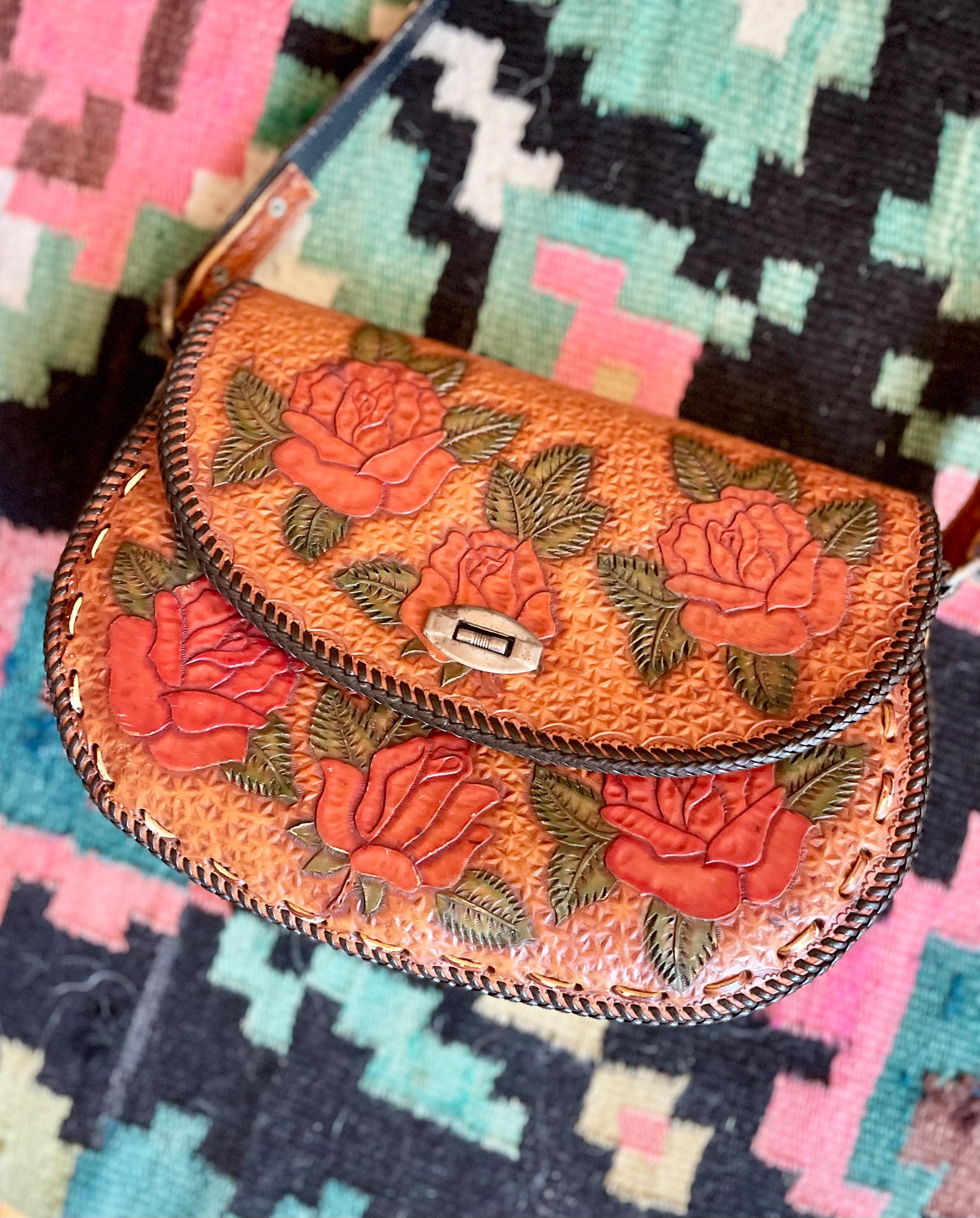 Discover the artisanal charm of this vintage Mexican tooled leather bag. Featuring a rare and beautifully embossed rose design, this classic piece showcases traditional craftsmanship and unique style. Perfect for adding a touch of vintage flair to any outfit. Ideal as a statement shoulder bag, this piece is a vintage find and a work of art.