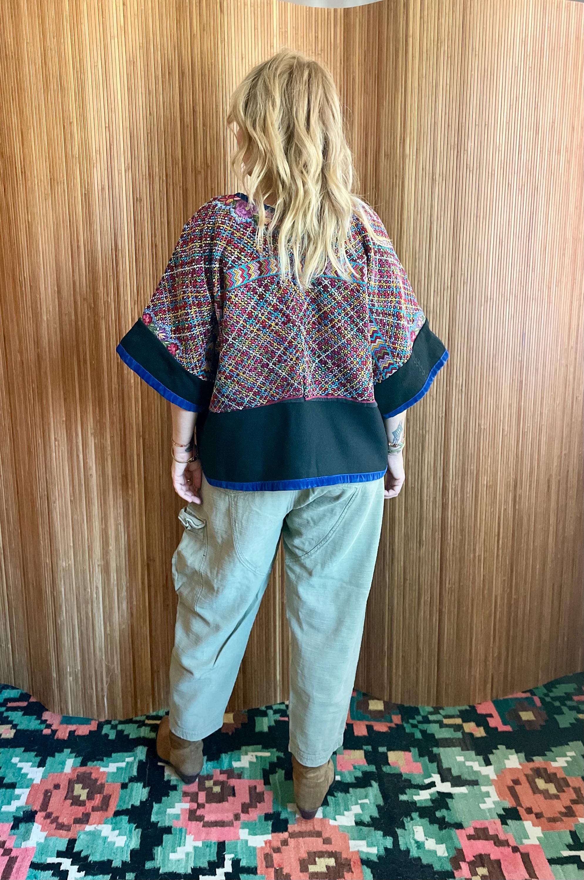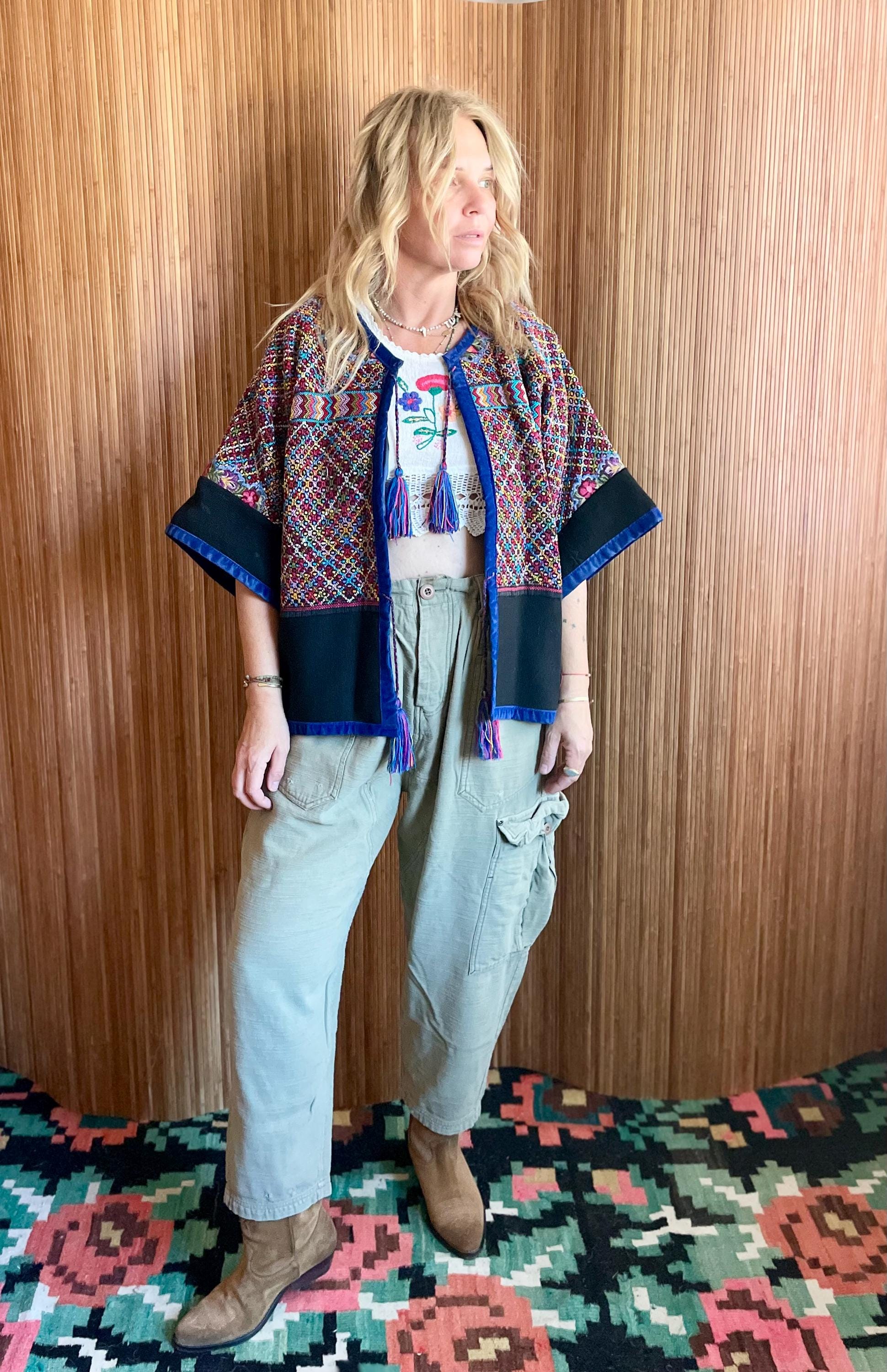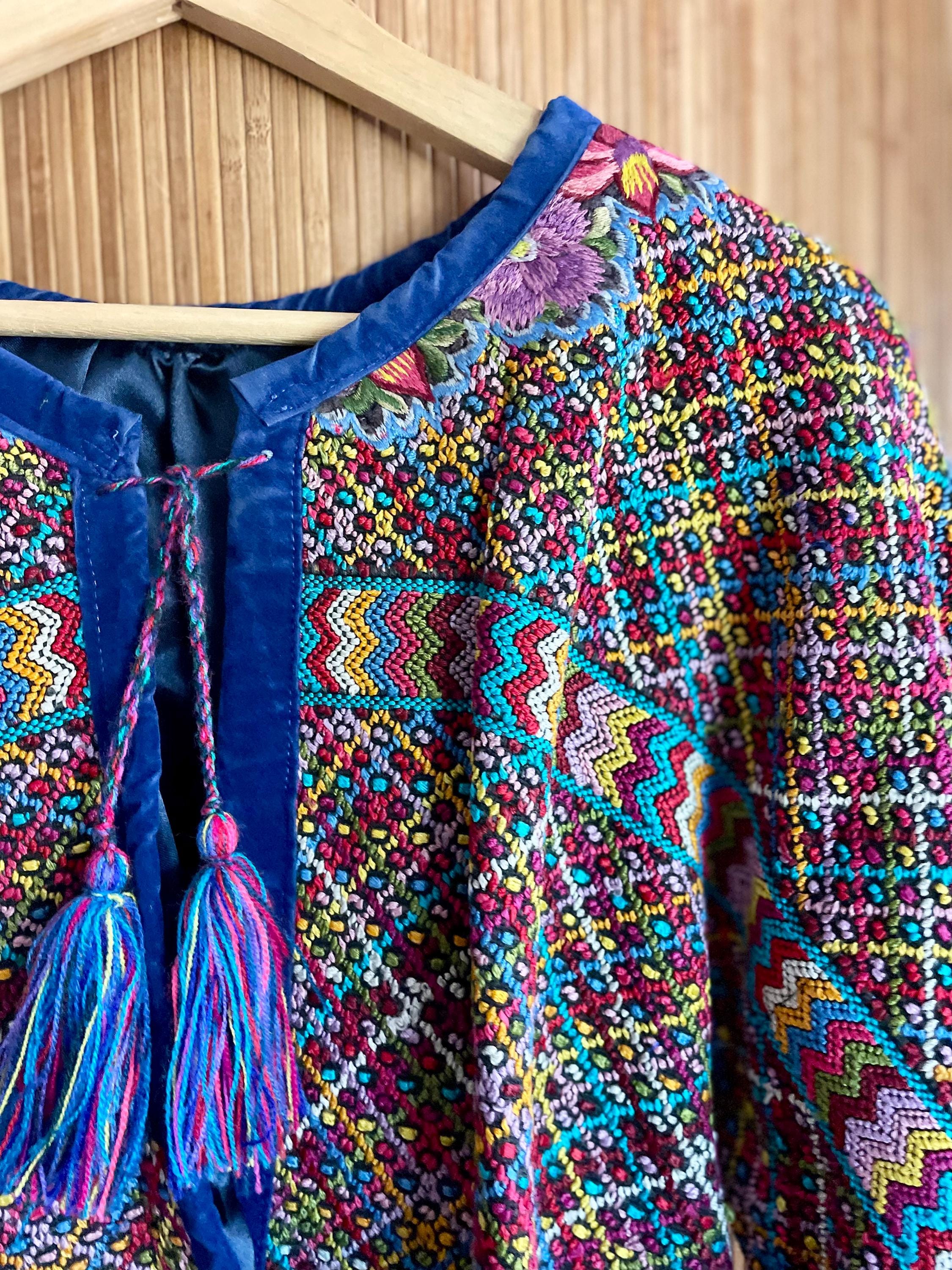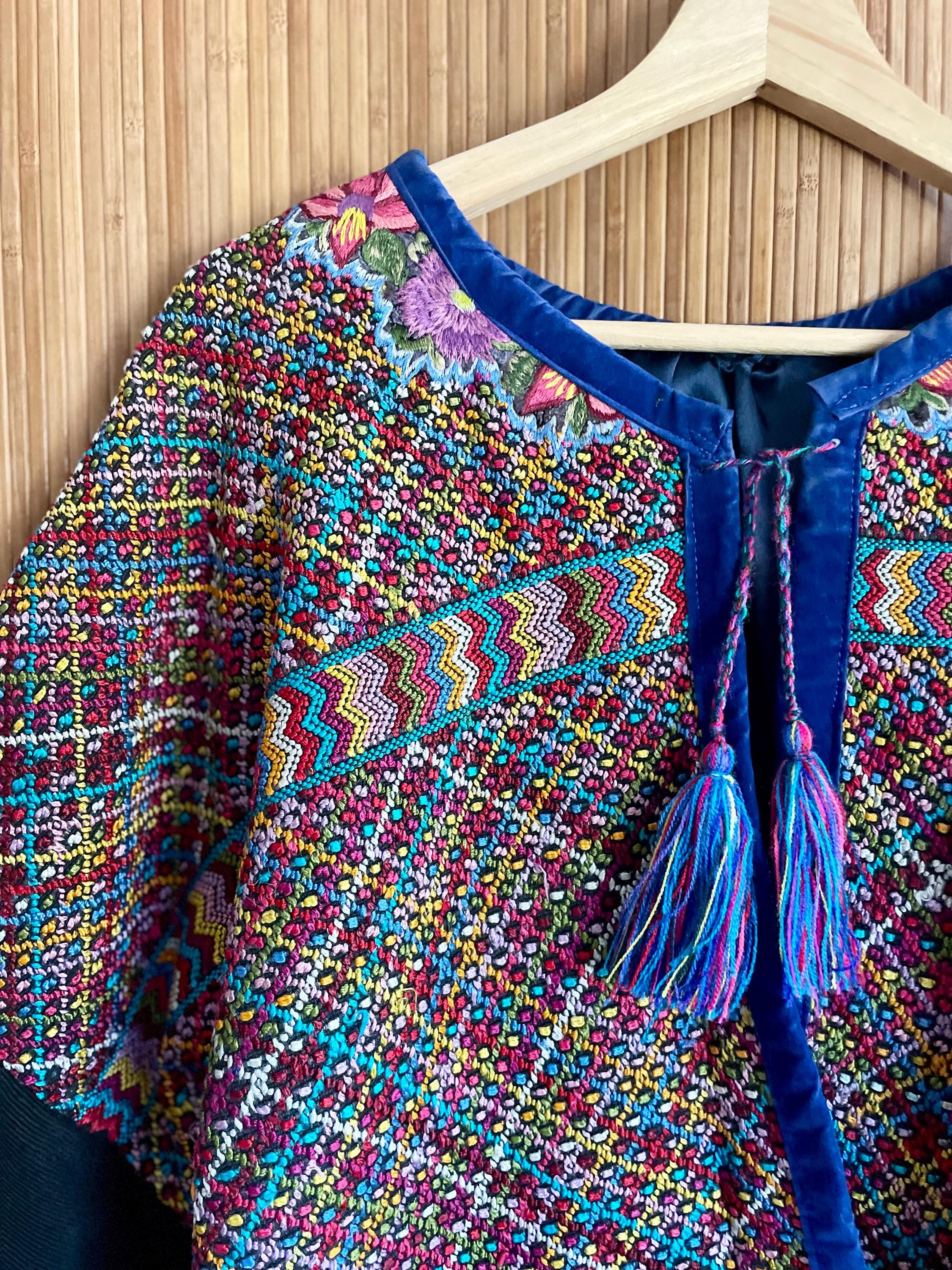 Discover a rare vintage Guatemalan hand-loomed and hand-embroidered jacket, uniquely designed with playful pom poms. This colorful bohemian ethnic coat showcases vibrant textile artistry and intricate patterns, making it a standout piece. Perfect for adding cultural flair, festival outfits, or unique vintage style to your wardrobe. Designed to fit up to a size L, it combines comfort with an artistic expression.
