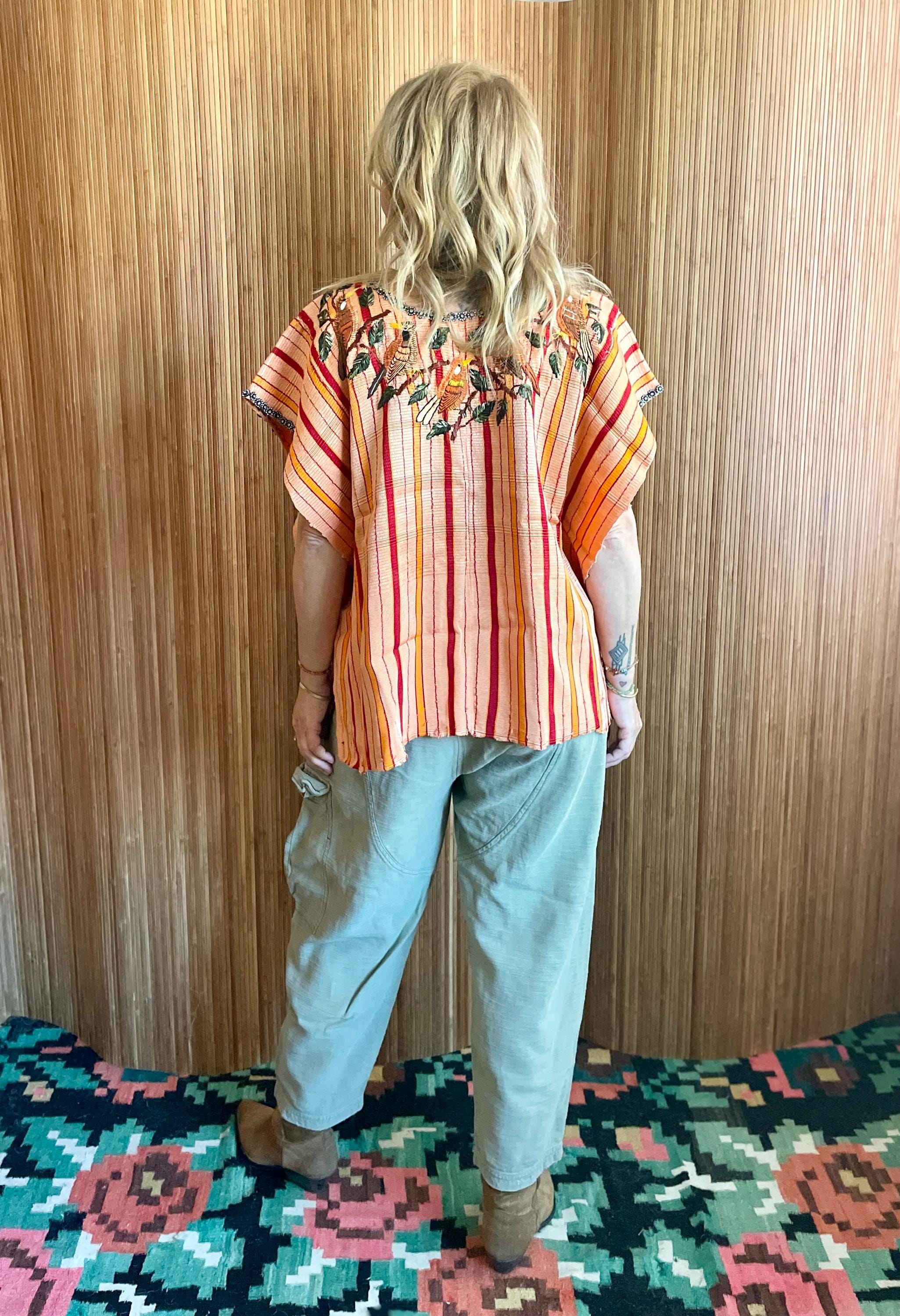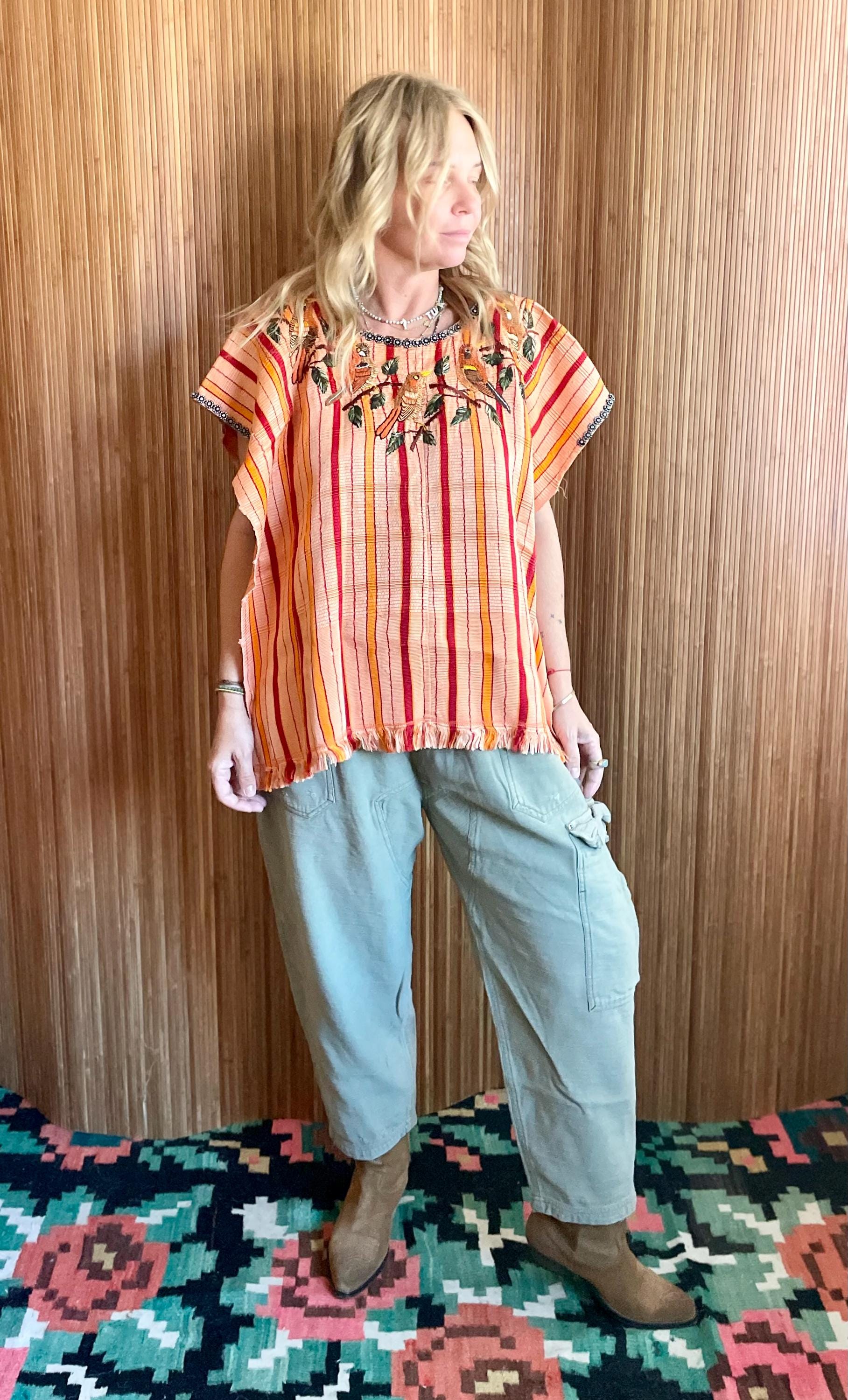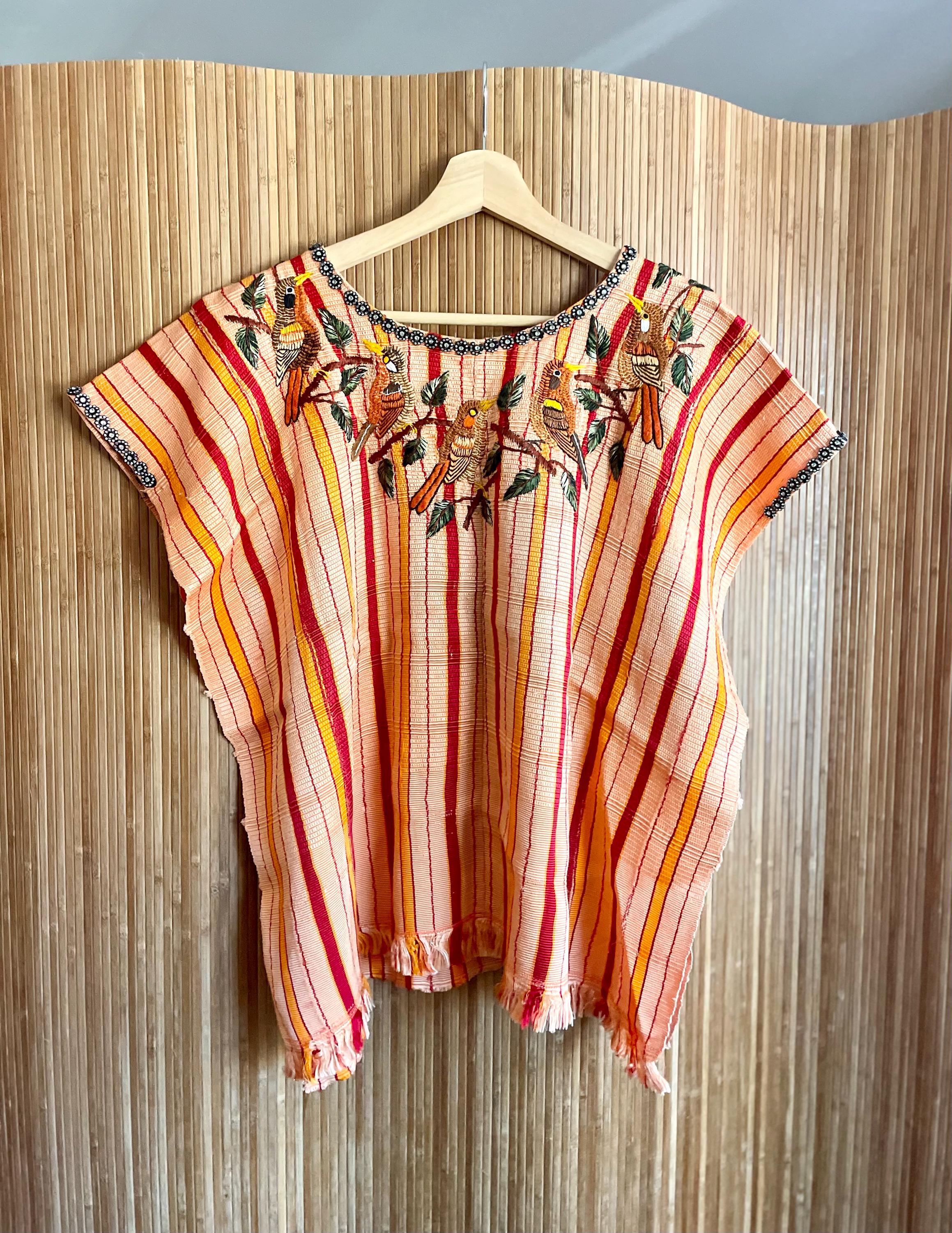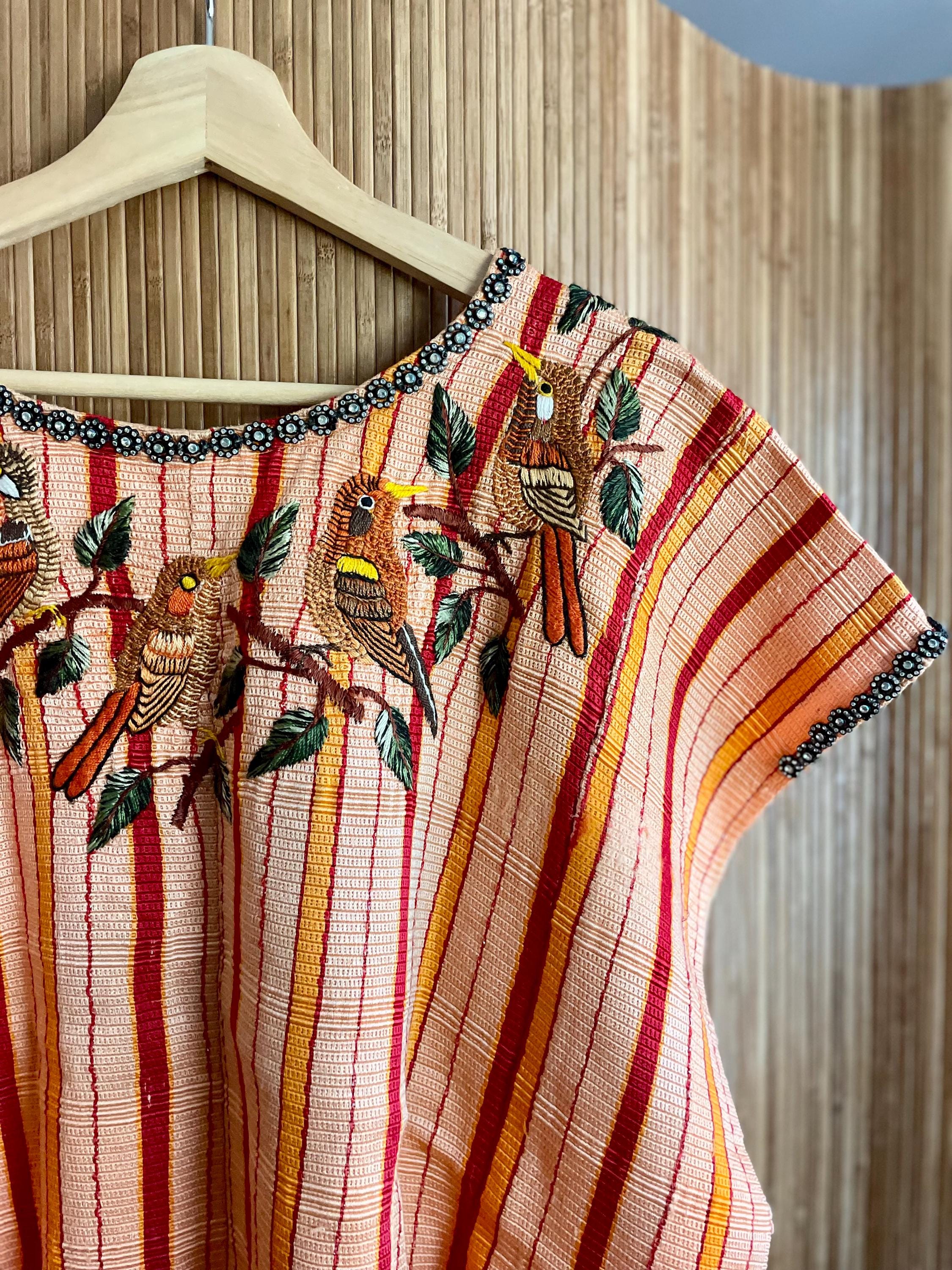 Discover this exquisite vintage, hand-loomed, and hand-embroidered Guatemalan Huipil top, featuring rare and captivating colors. Adorned with delicate bird motifs, this unique piece showcases the rich cultural heritage of Guatemalan textile artistry. Perfect for adding a boho flair, festival style, or a statement ethnic piece to your wardrobe. Free-sized and designed to fit comfortably, it is a true artisan-crafted treasure.