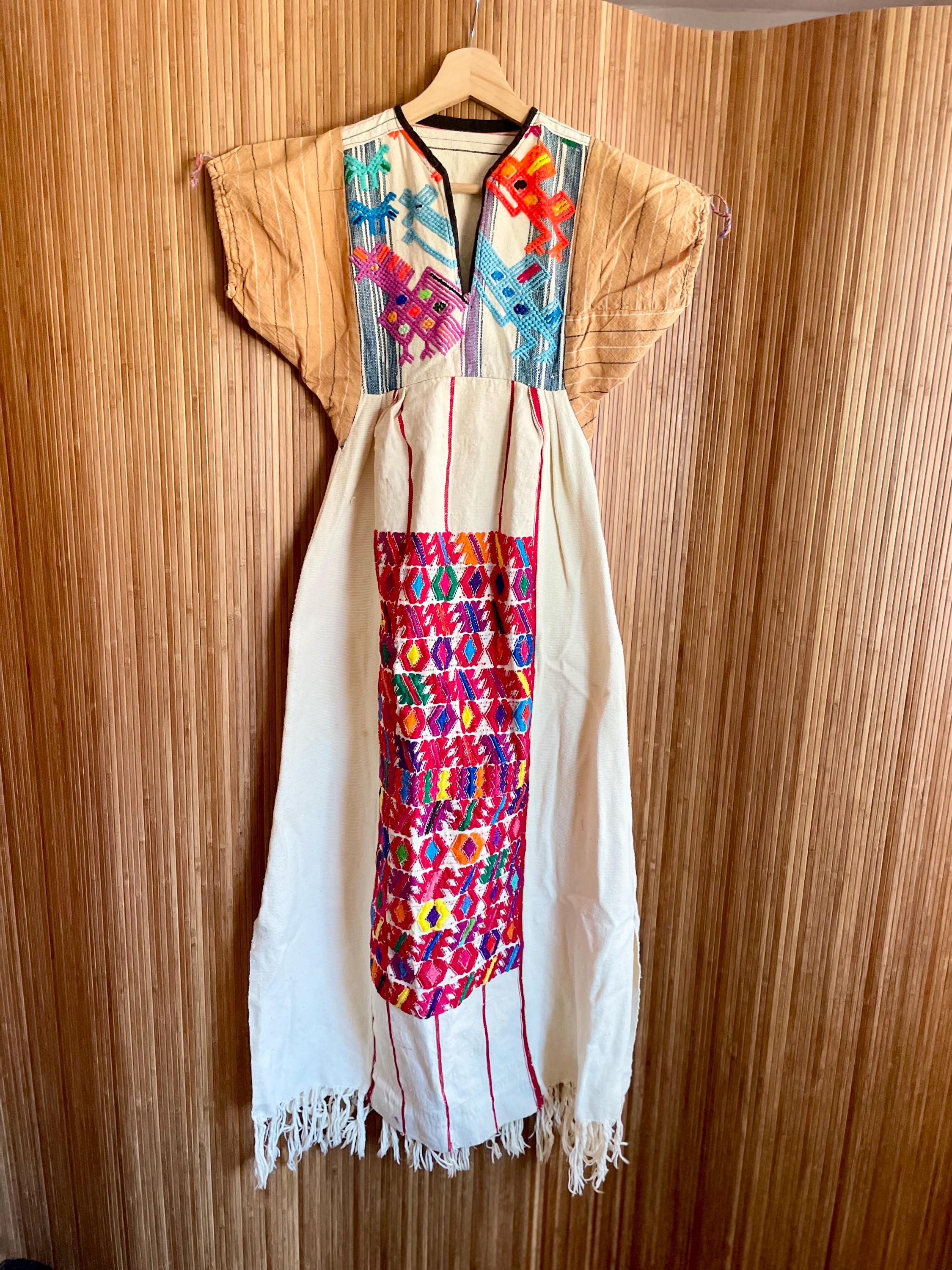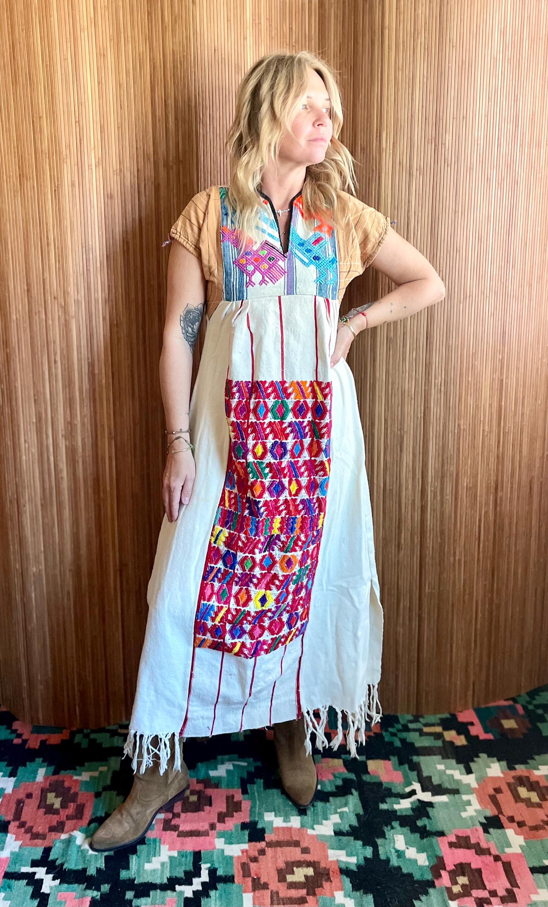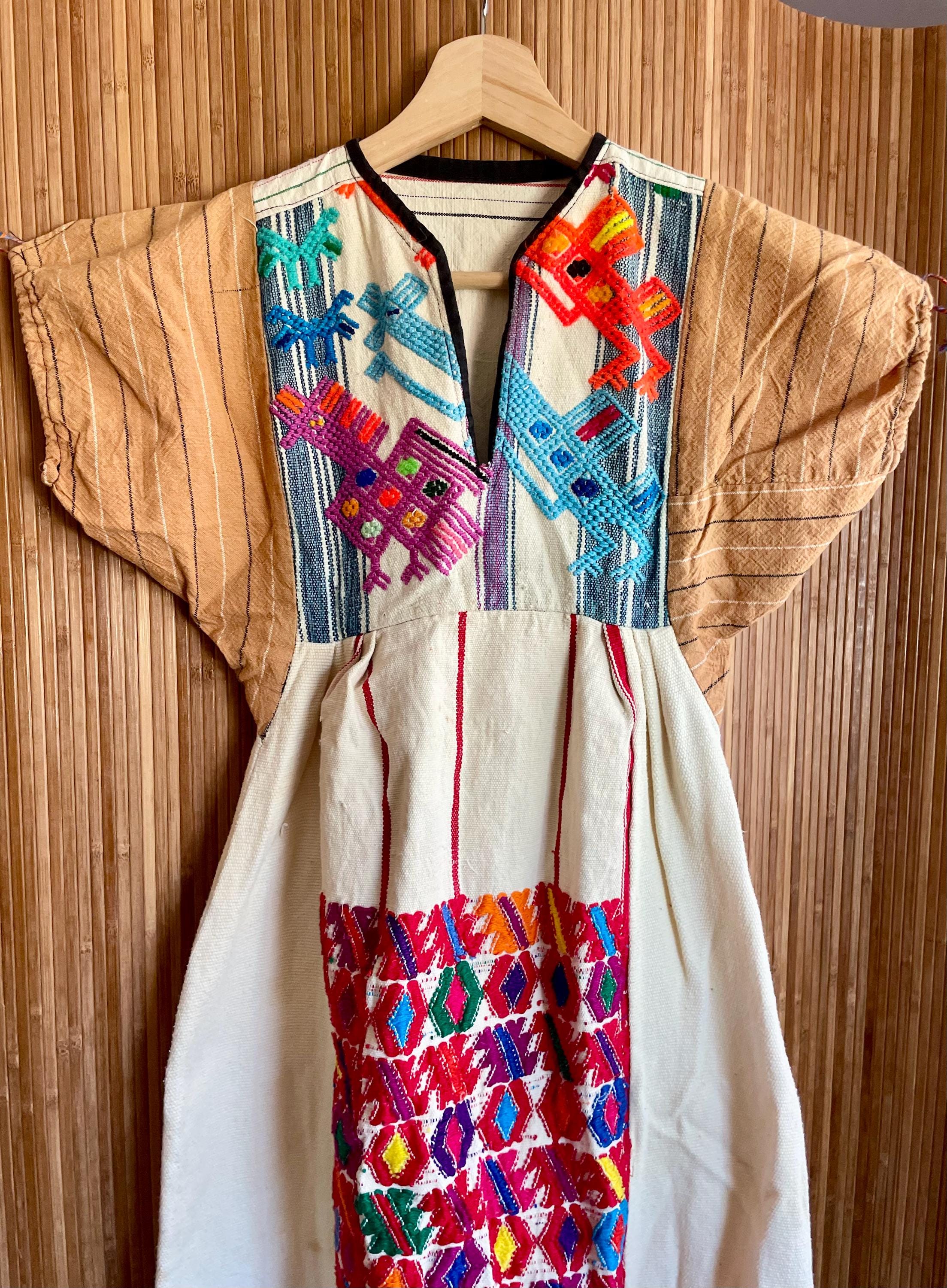 Authentic handwoven Guatemalan huipil dress, created from repurposed traditional textiles by Mayan artisans. Each panel is crafted on a backstrap loom from 100% cotton, featuring intricate brocade patterns and vivid embroidery symbolizing nature and protection.