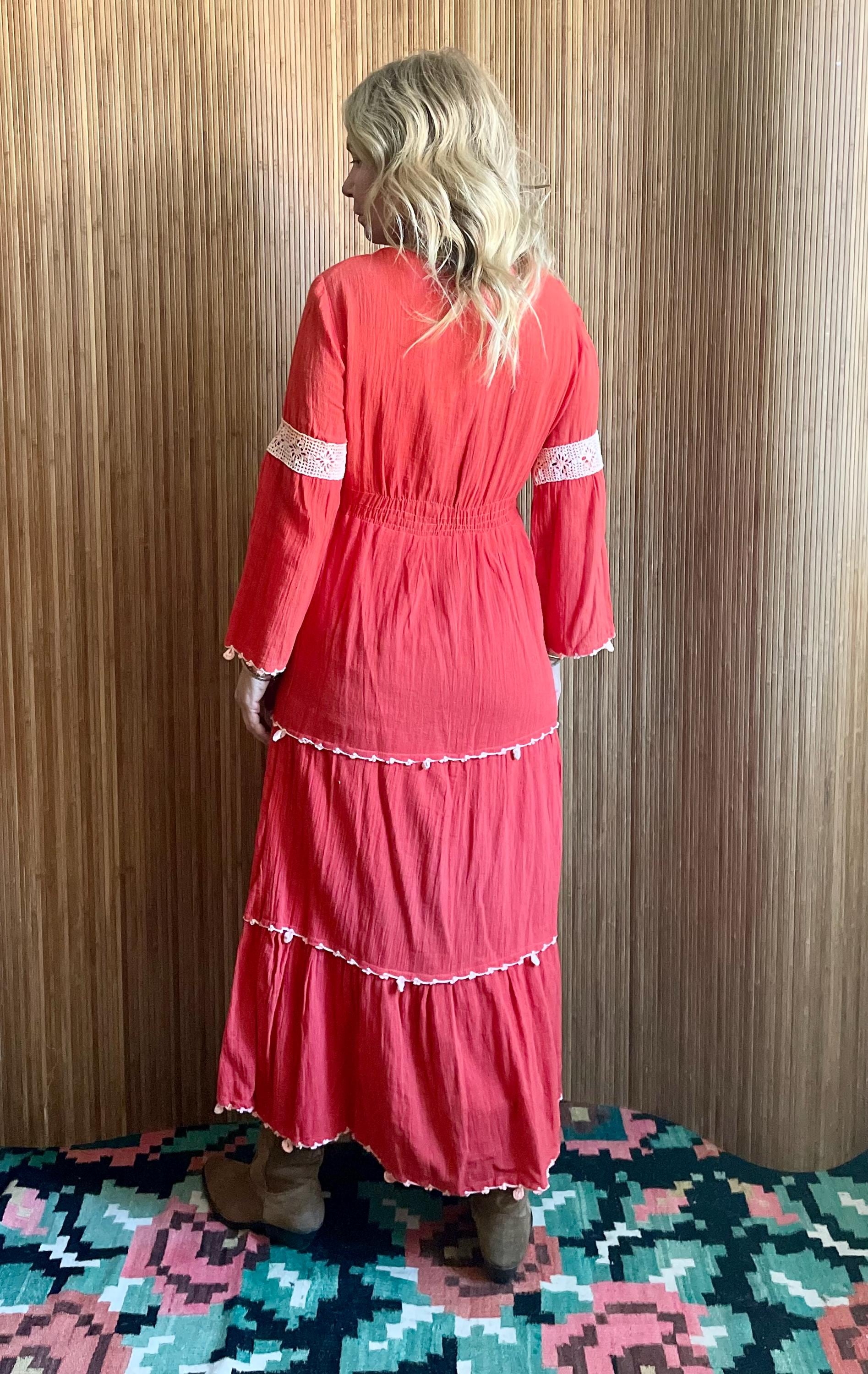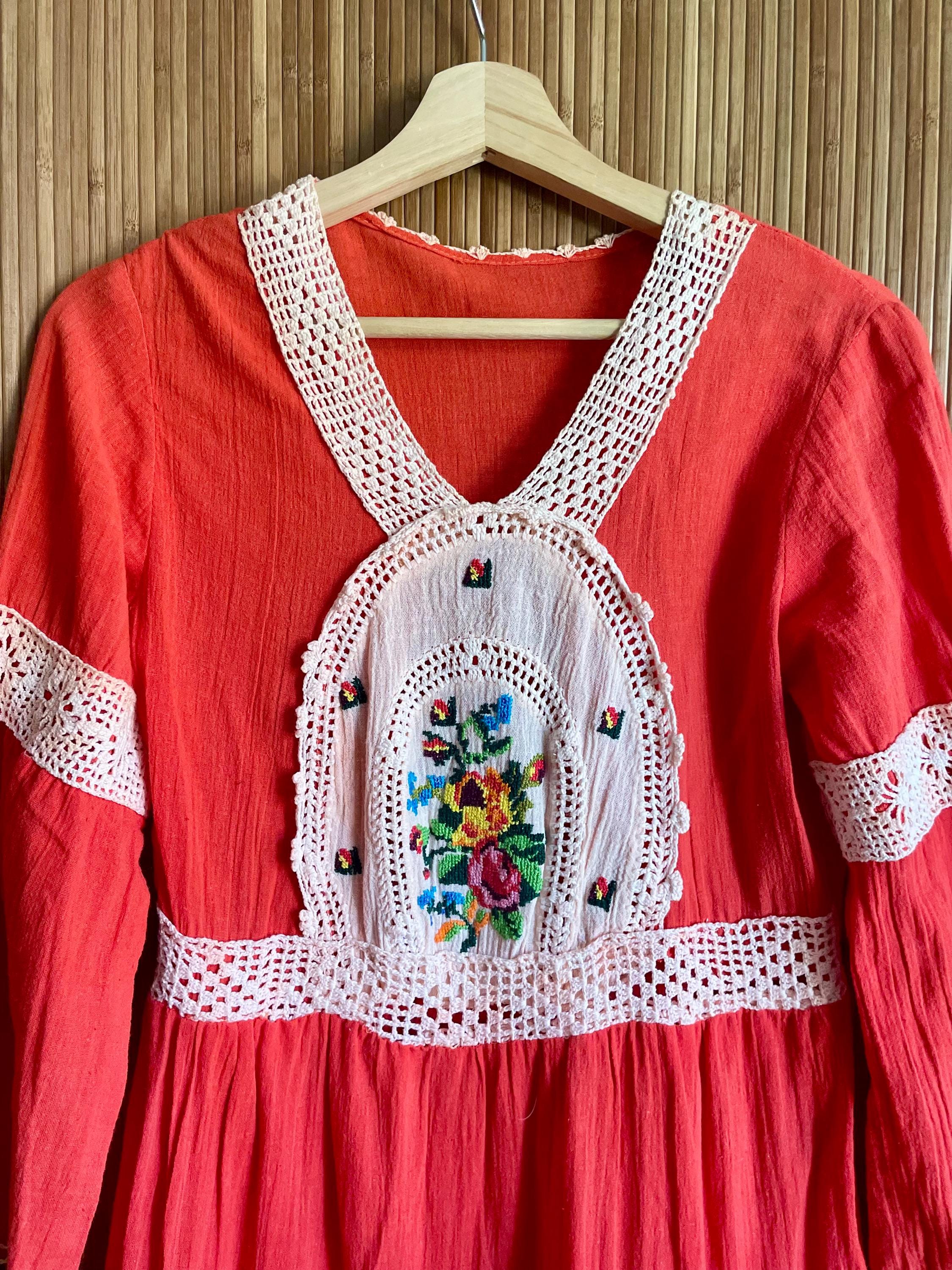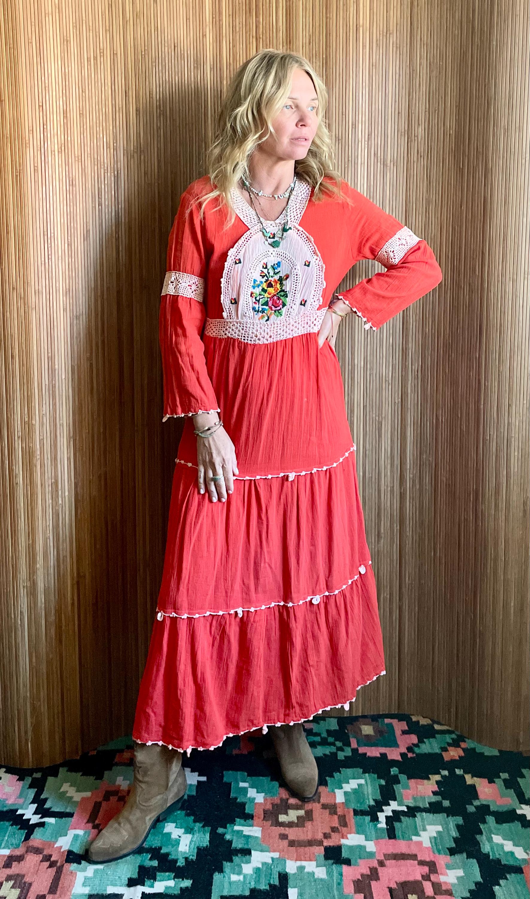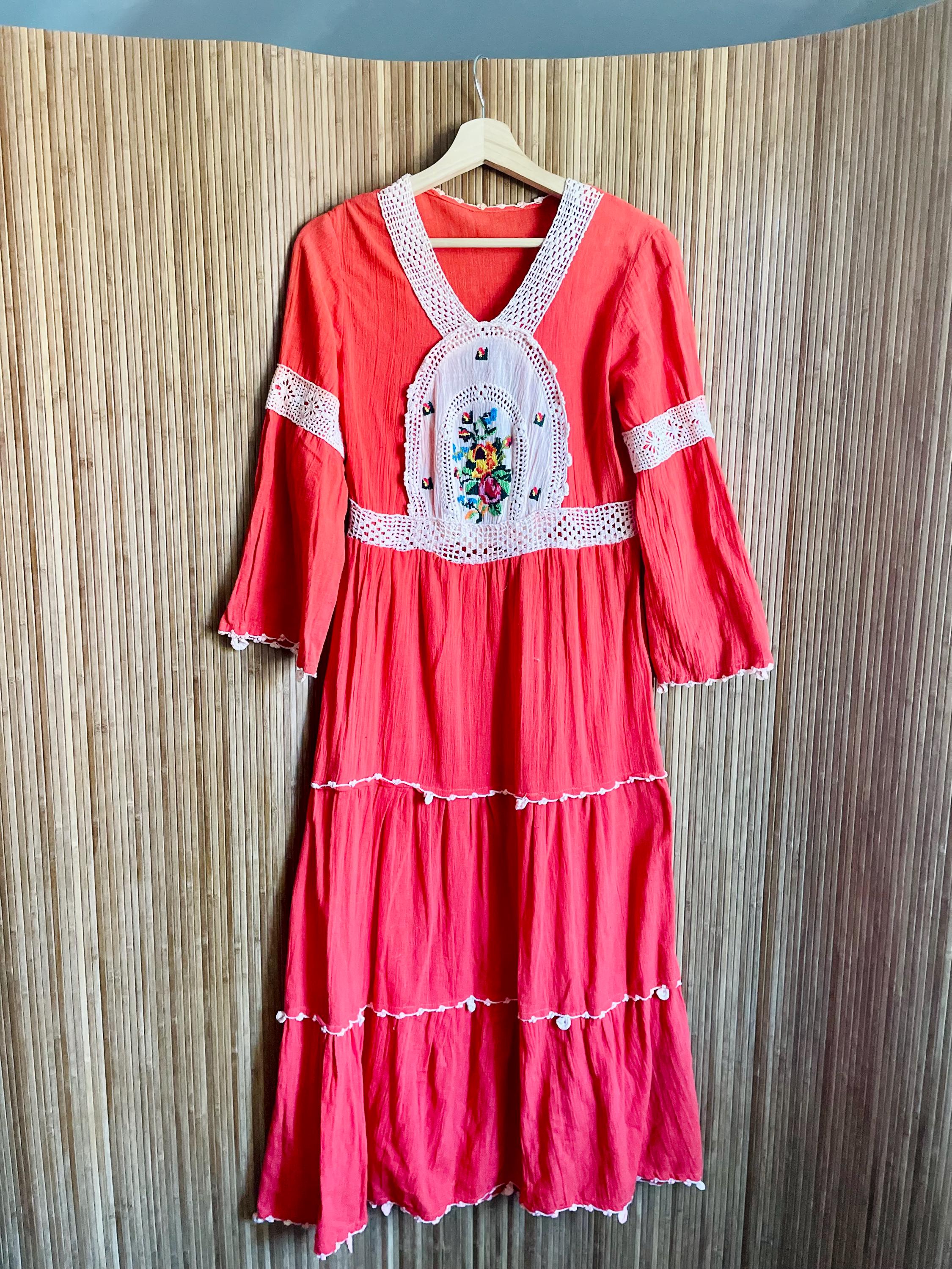 A stunning vintage 1970s Indian cotton gauze dress, featuring soft breathable cotton, colorful hand embroidery, and a romantic tiered silhouette. The bold red hue and flowy skirt make it a perfect piece for festival days, bohemian weddings, or everyday magic.