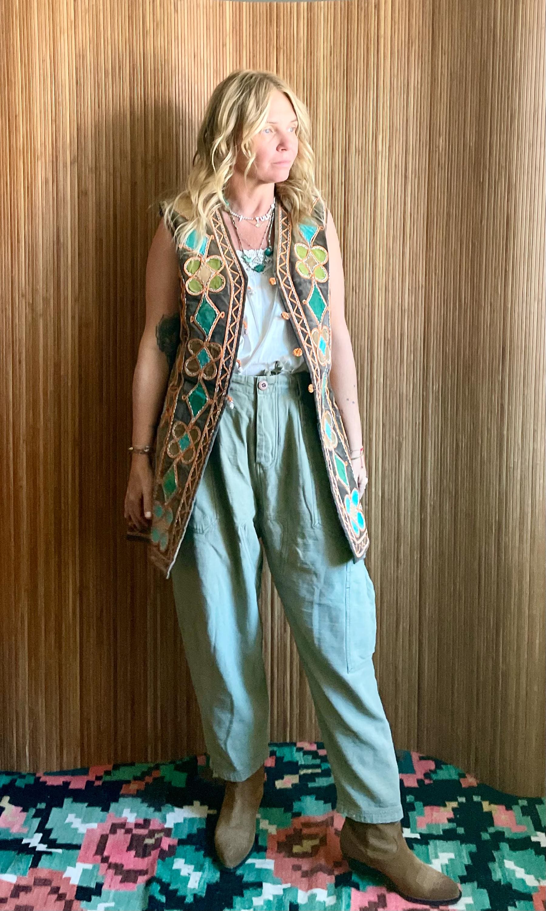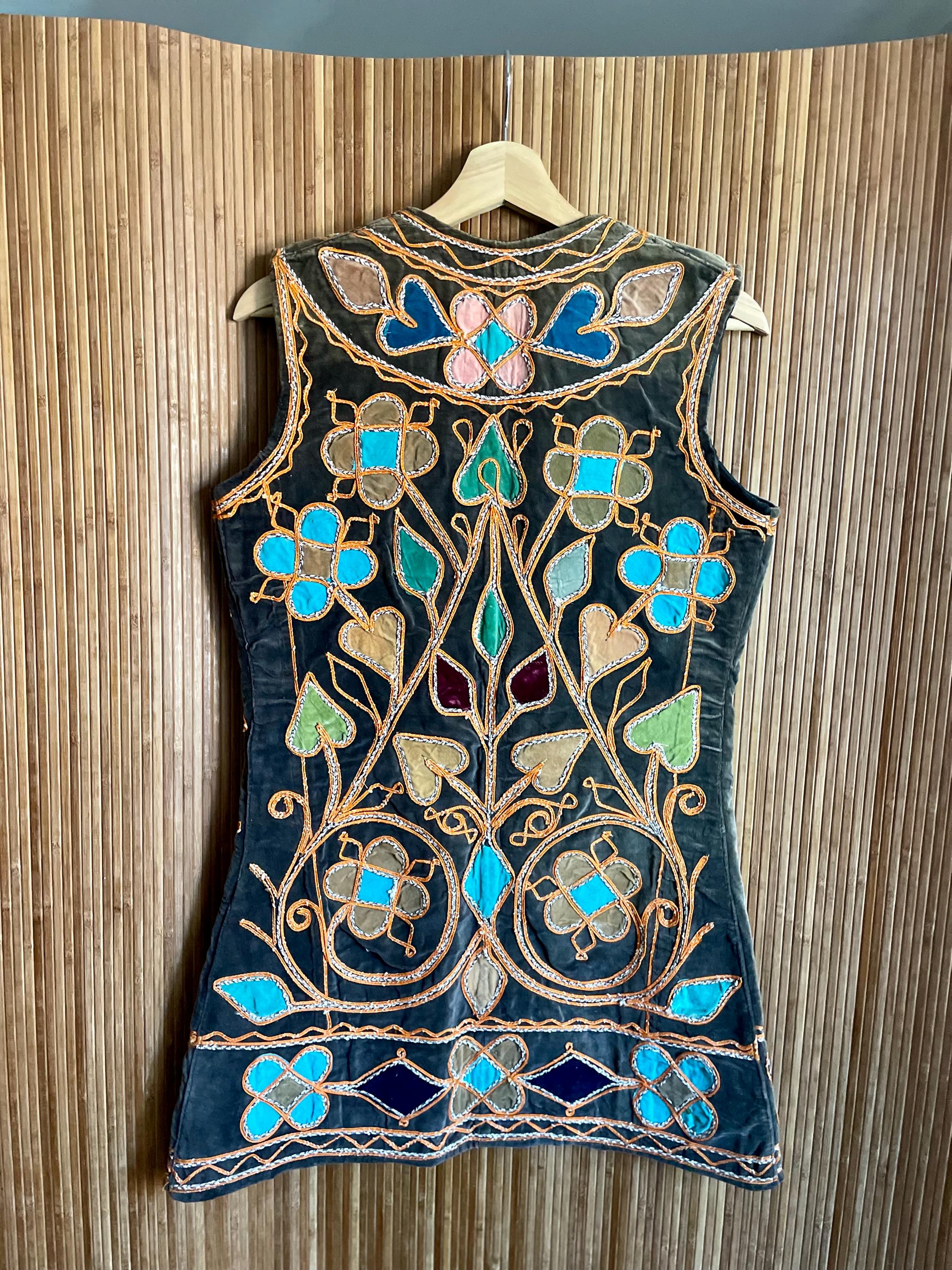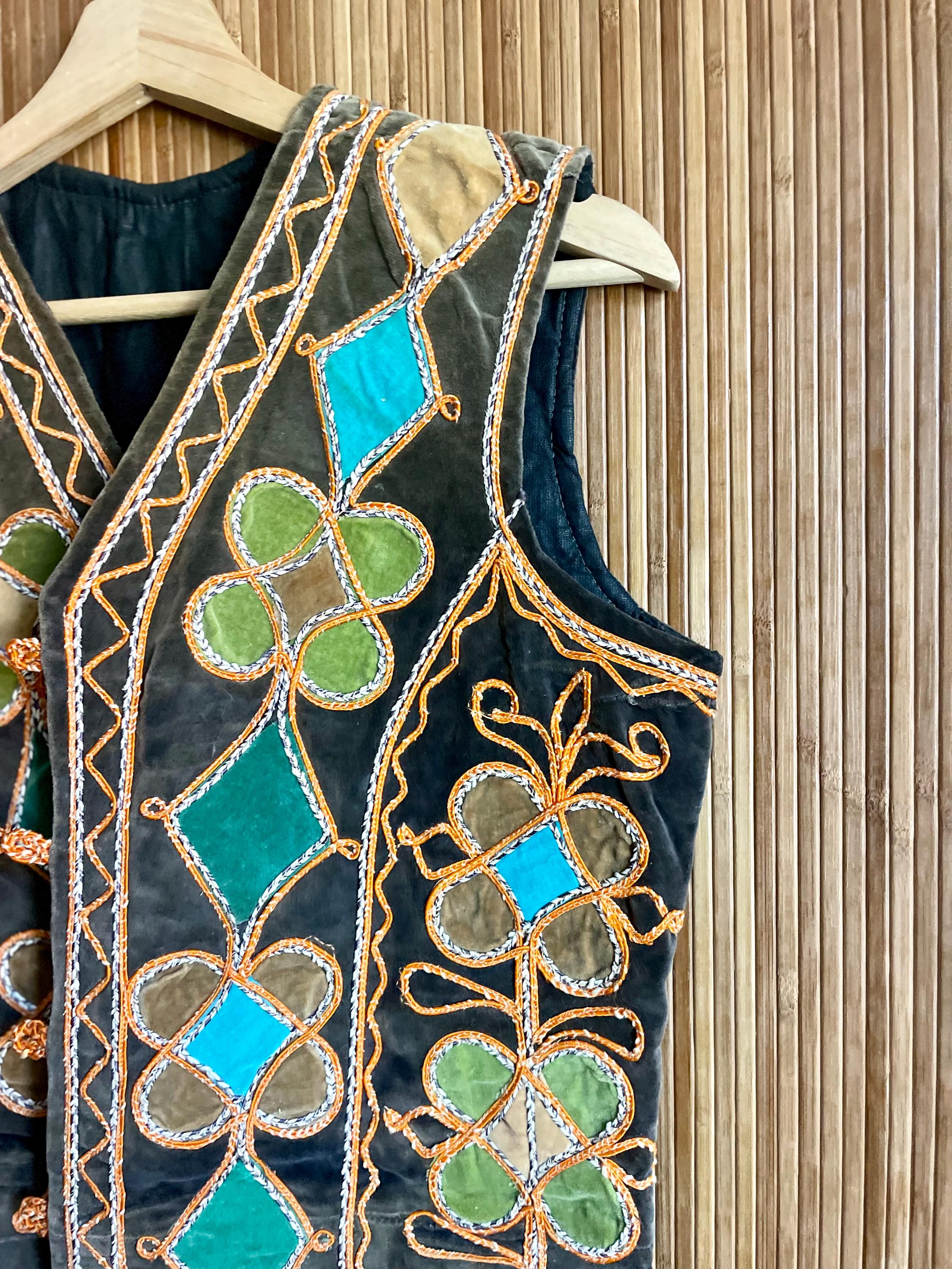 Rare and radiant vintage Ottoman velvet vest, richly detailed with hand-stitched appliqué and metallic embroidery in jewel-tone shades of turquoise, gold, plum, and leaf green. A wearable work of folk art. Beautifully tailored in plush black velvet with floral and geometric motifs throughout. A collector’s piece that pairs effortlessly with gauze dresses, denim, or layered fall looks
