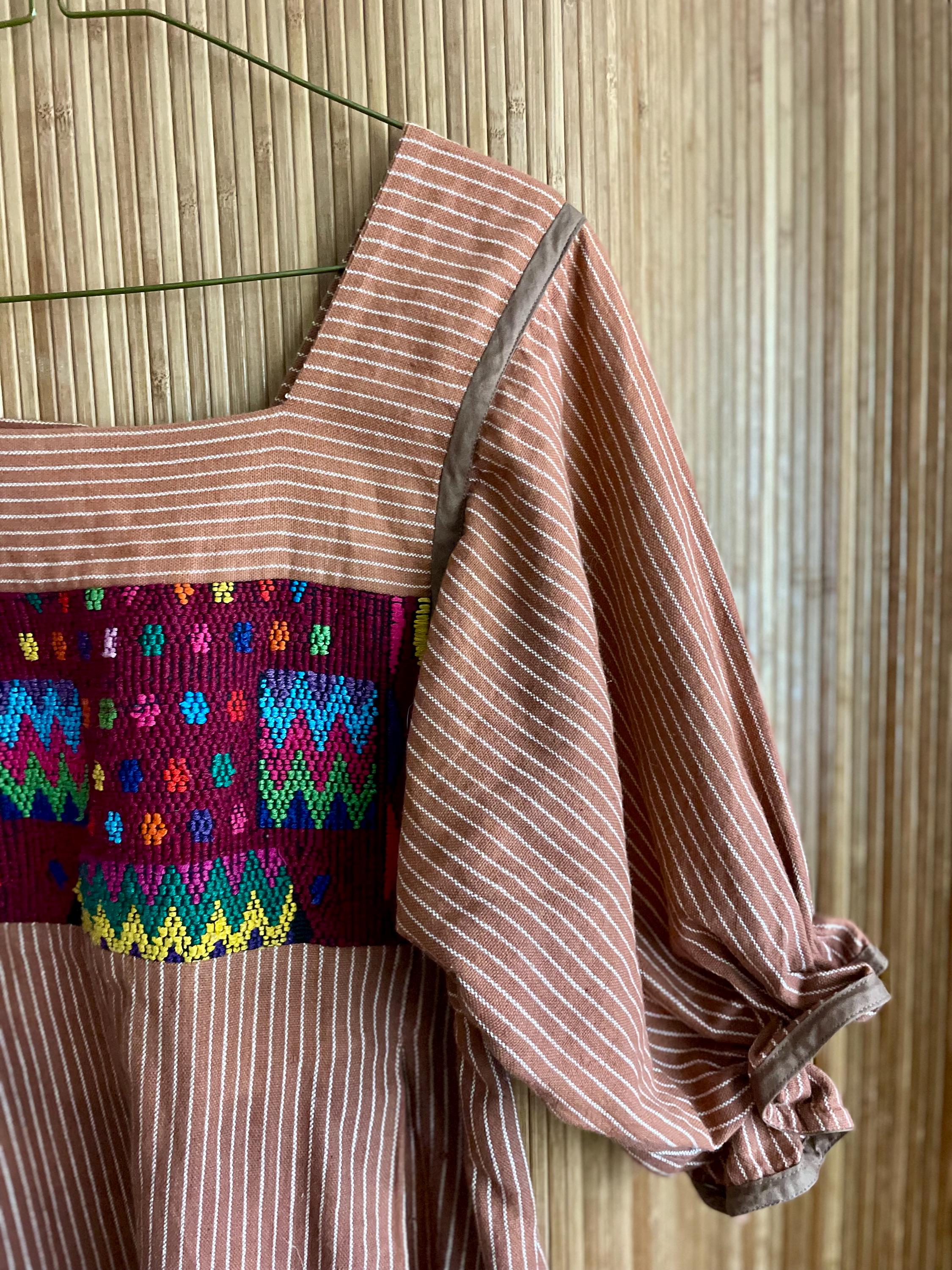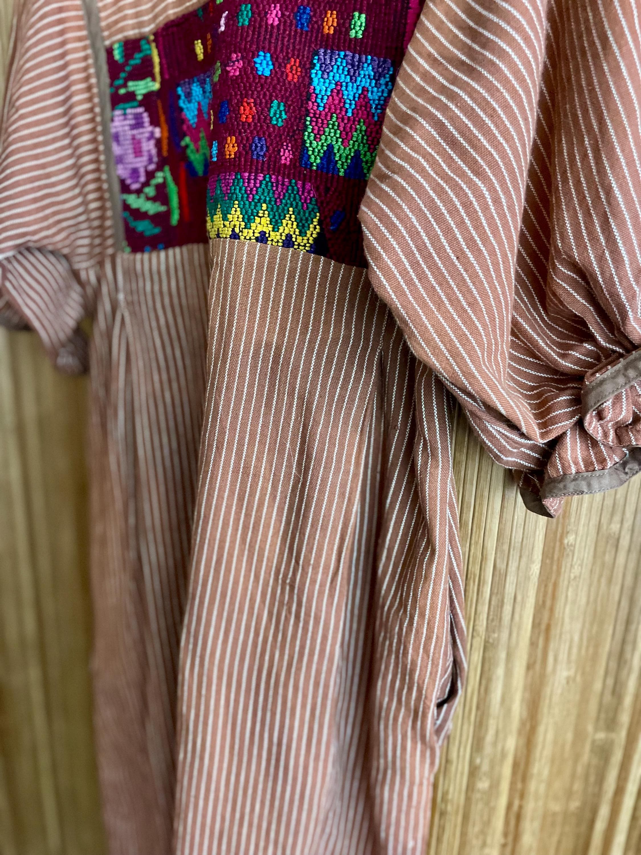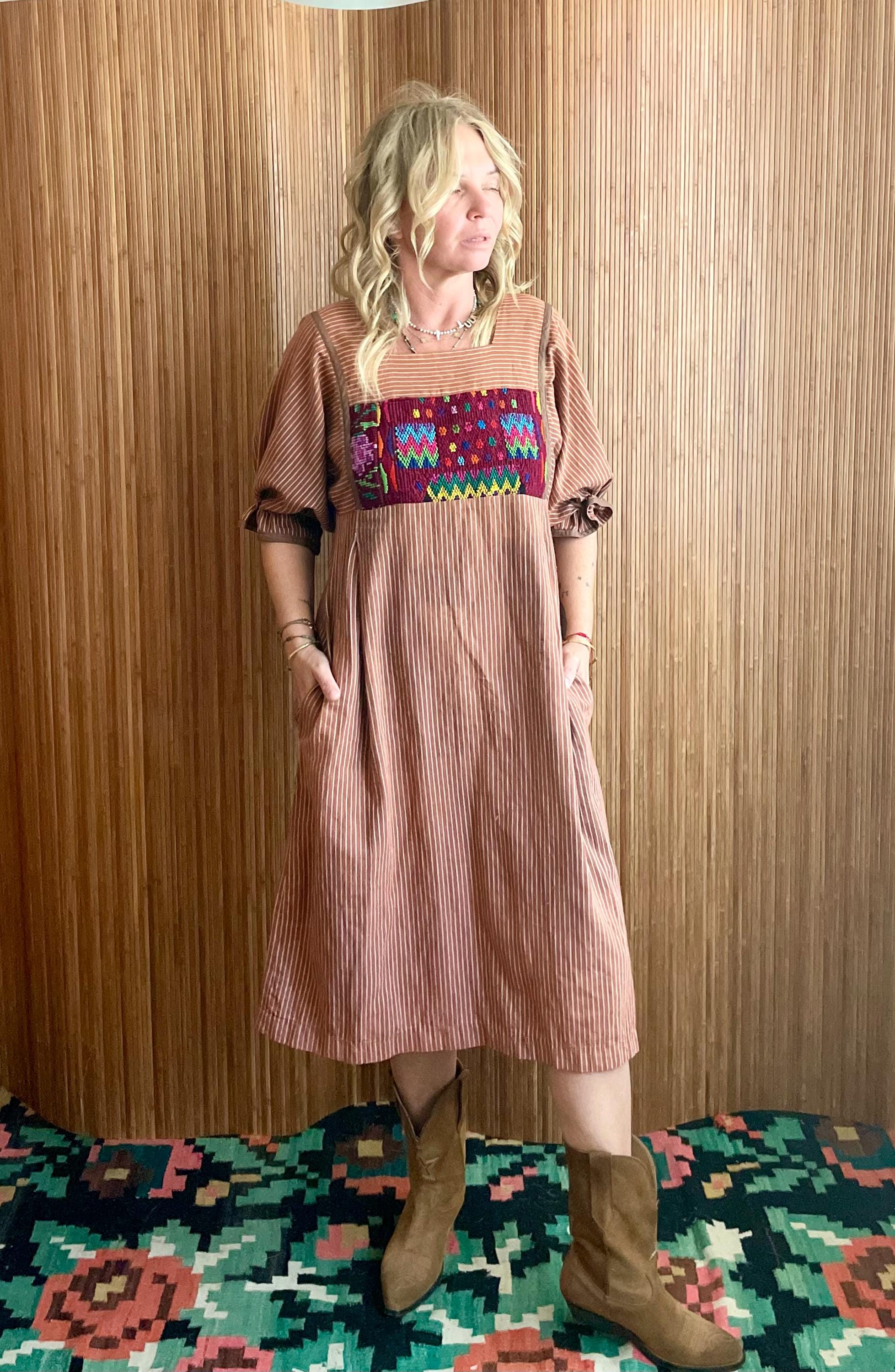 Discover this vintage hand-loomed 70s Guatemalan midi dress, a sweet piece of textile artistry. It features a distinctive embroidered panel on the top and a beautiful striped pattern. This unique dress captures the spirit of boho style. Designed to fit a size S, it's perfect for those who appreciate vintage, folk-inspired fashion.