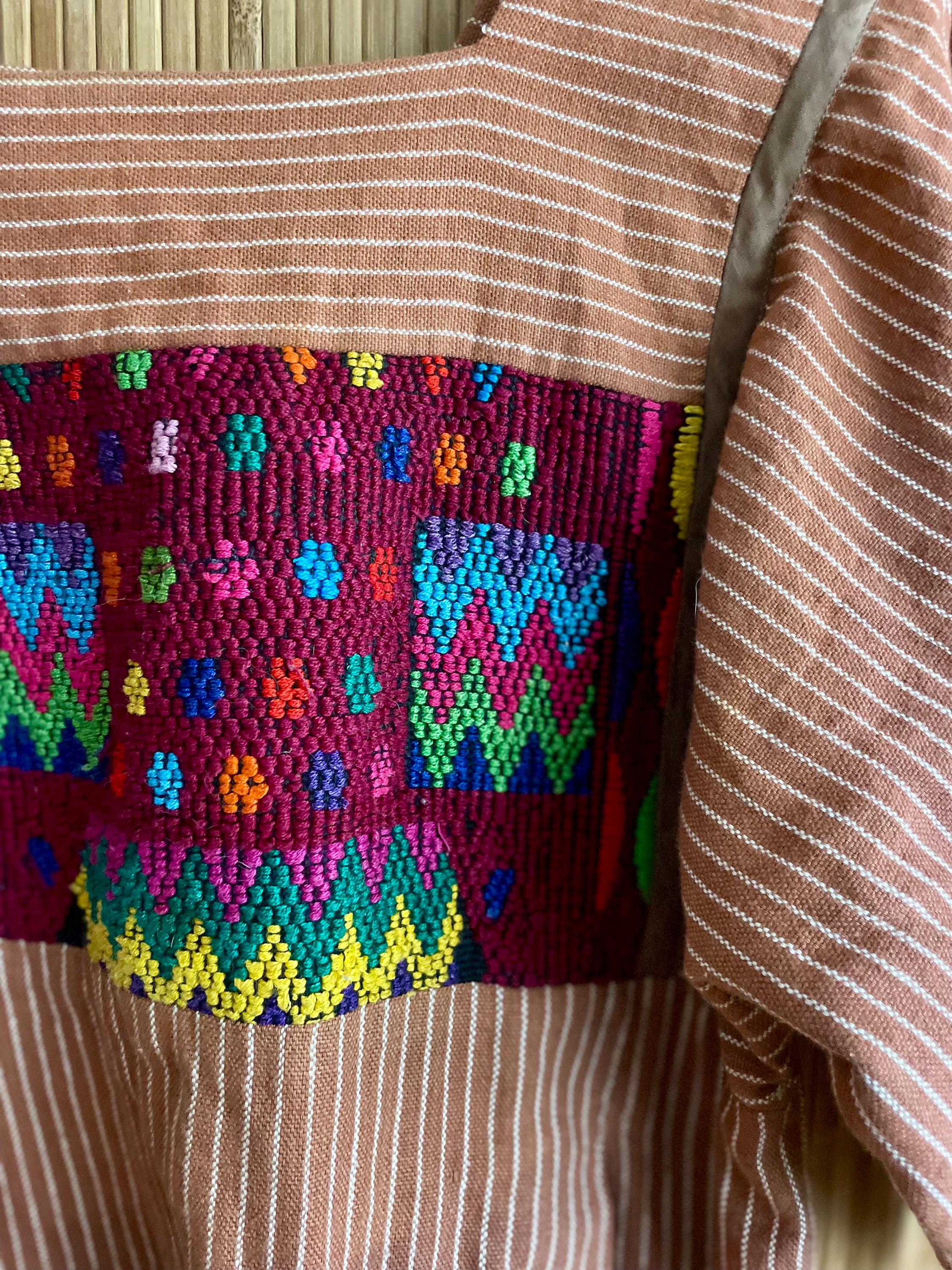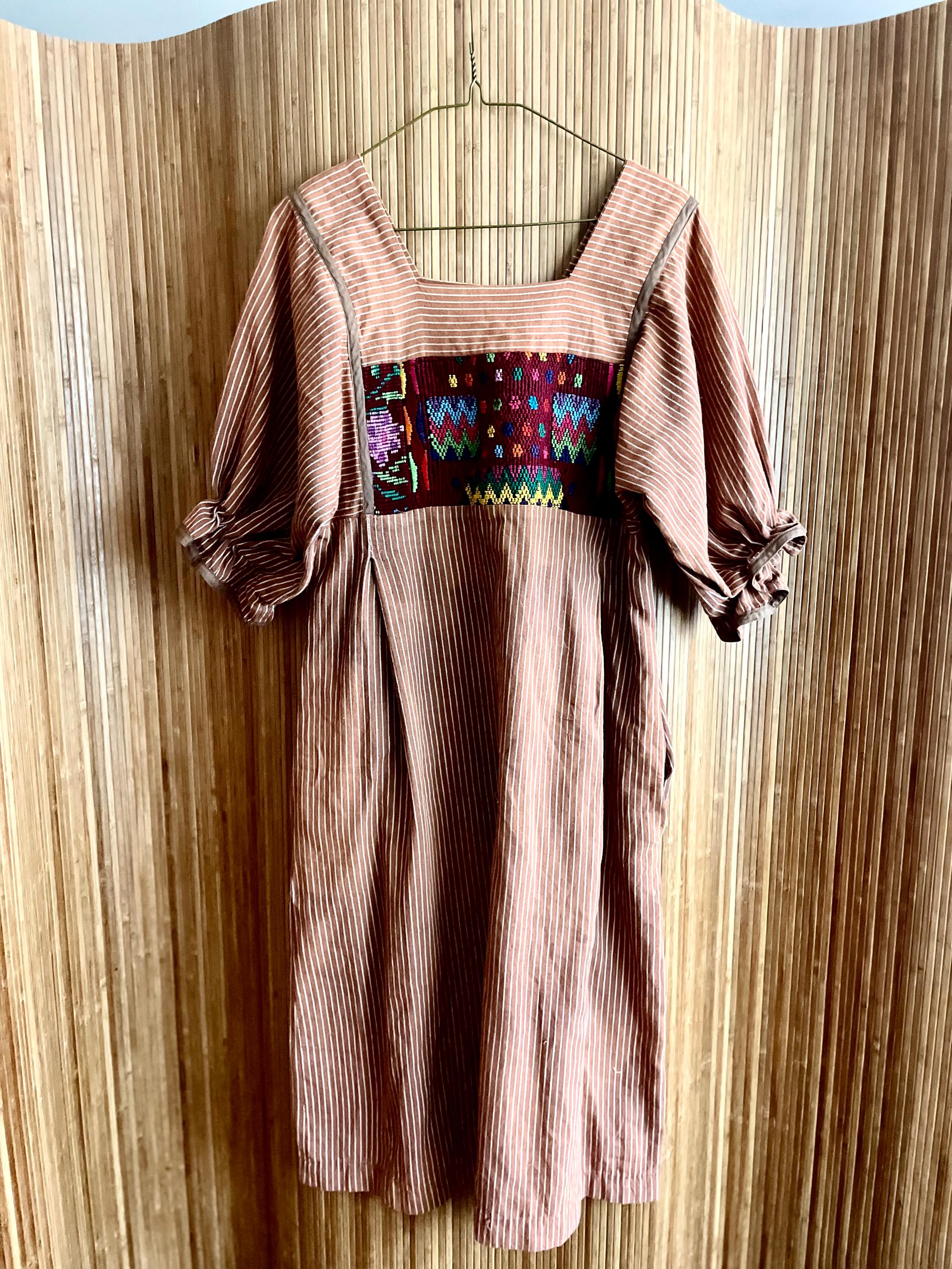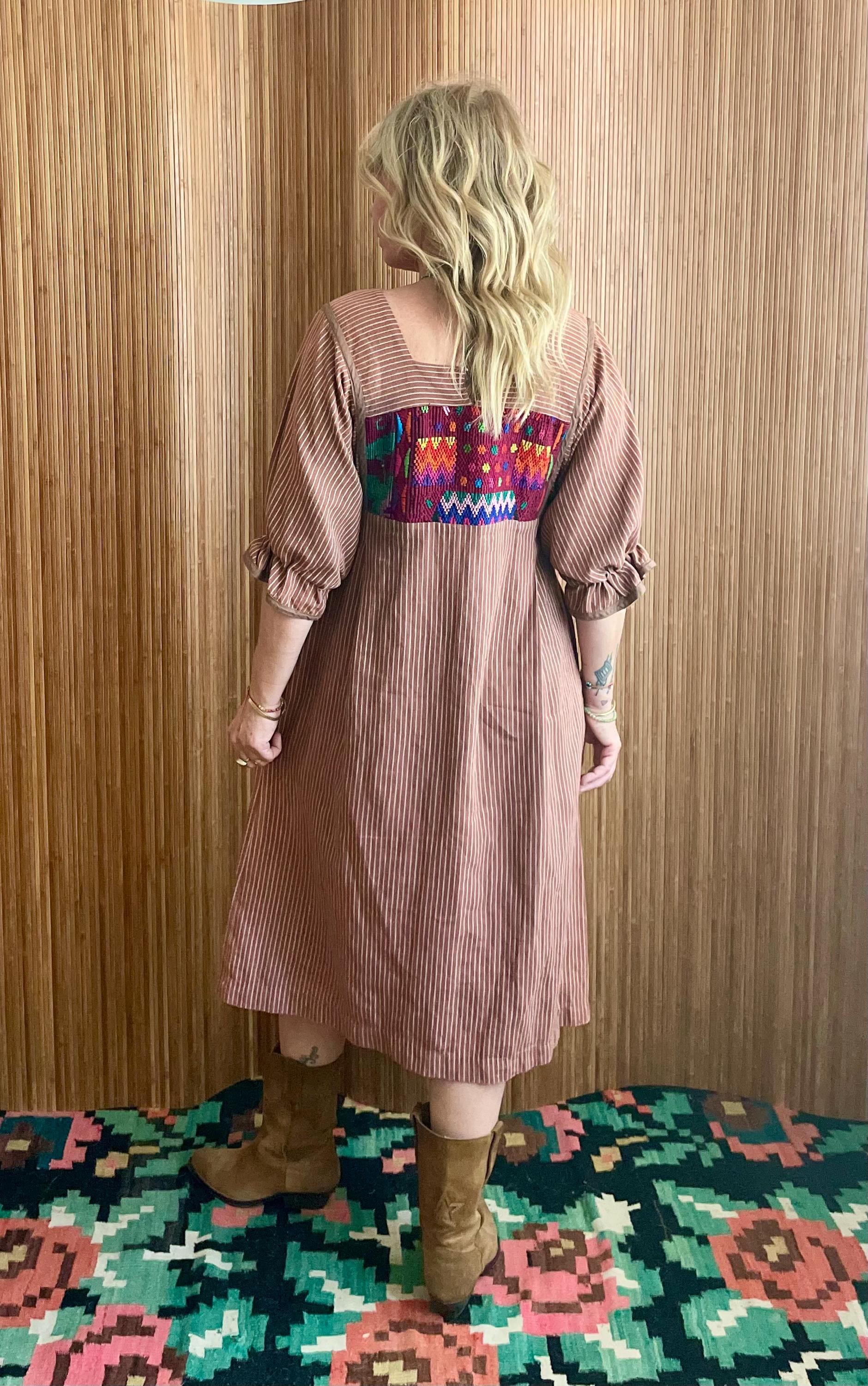 Discover this vintage hand-loomed 70s Guatemalan midi dress, a sweet piece of textile artistry. It features a distinctive embroidered panel on the top and a beautiful striped pattern. This unique dress captures the spirit of boho style. Designed to fit a size S, it's perfect for those who appreciate vintage, folk-inspired fashion.