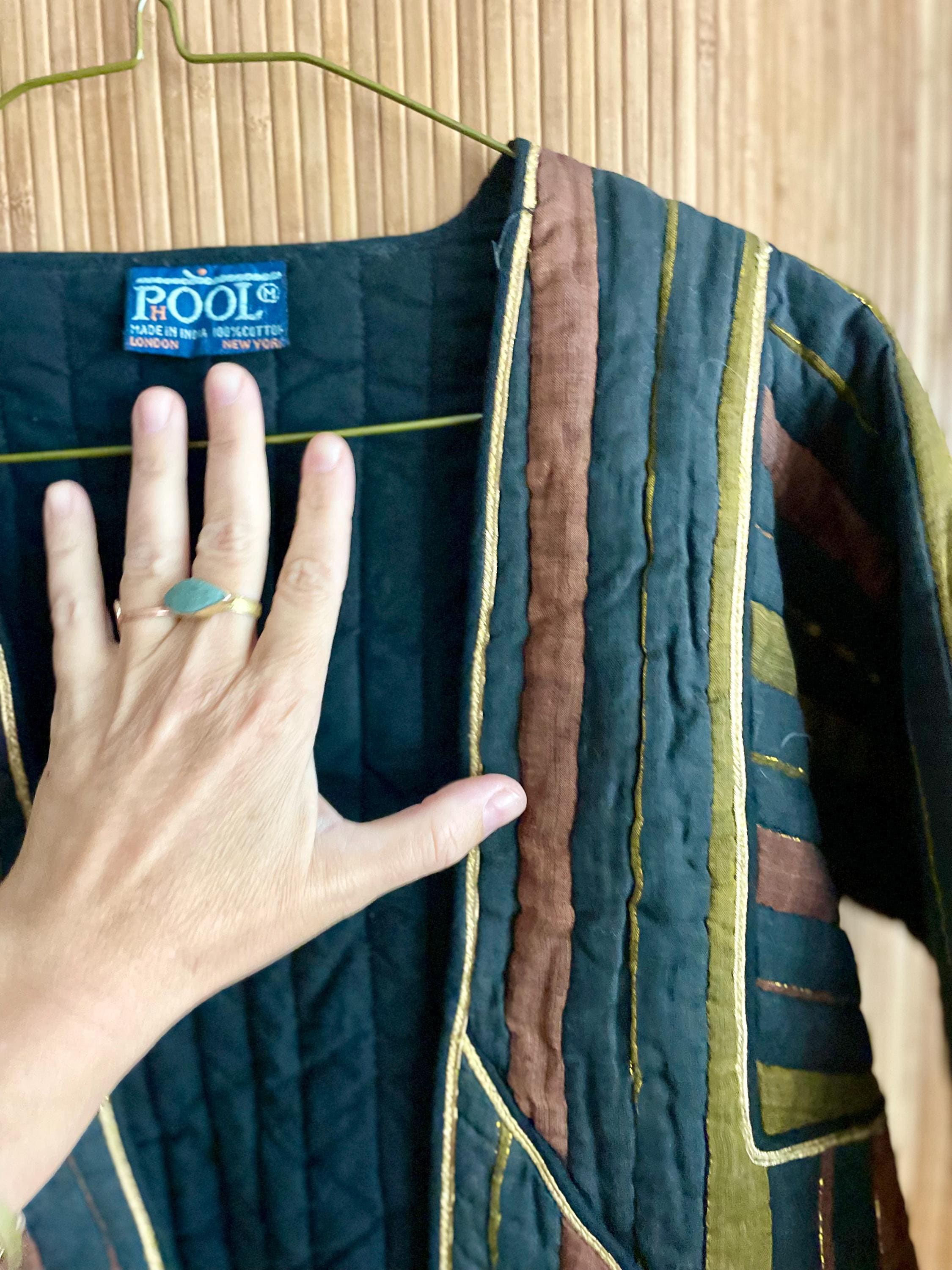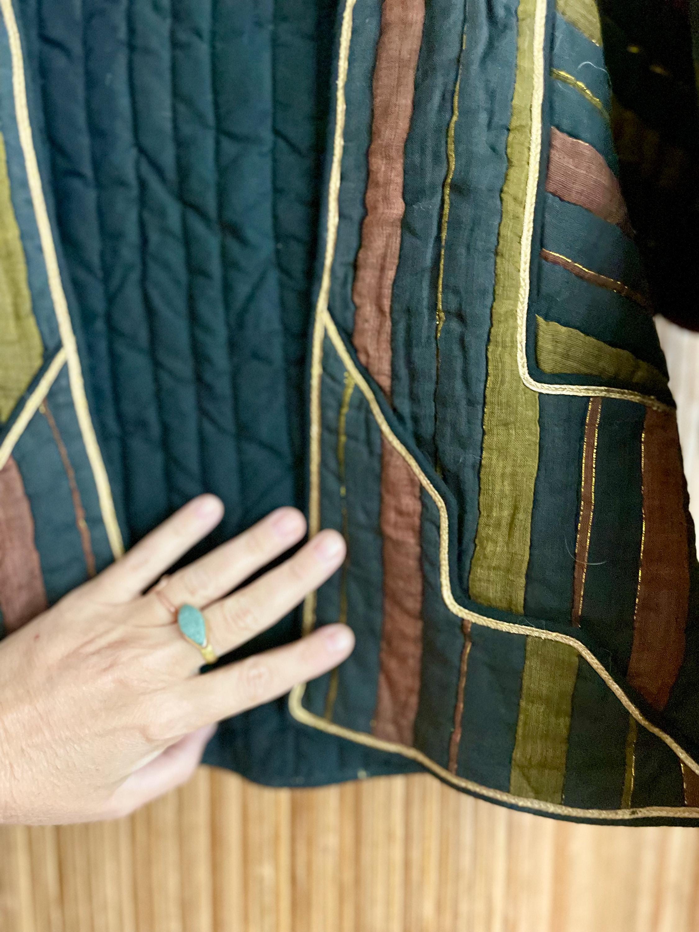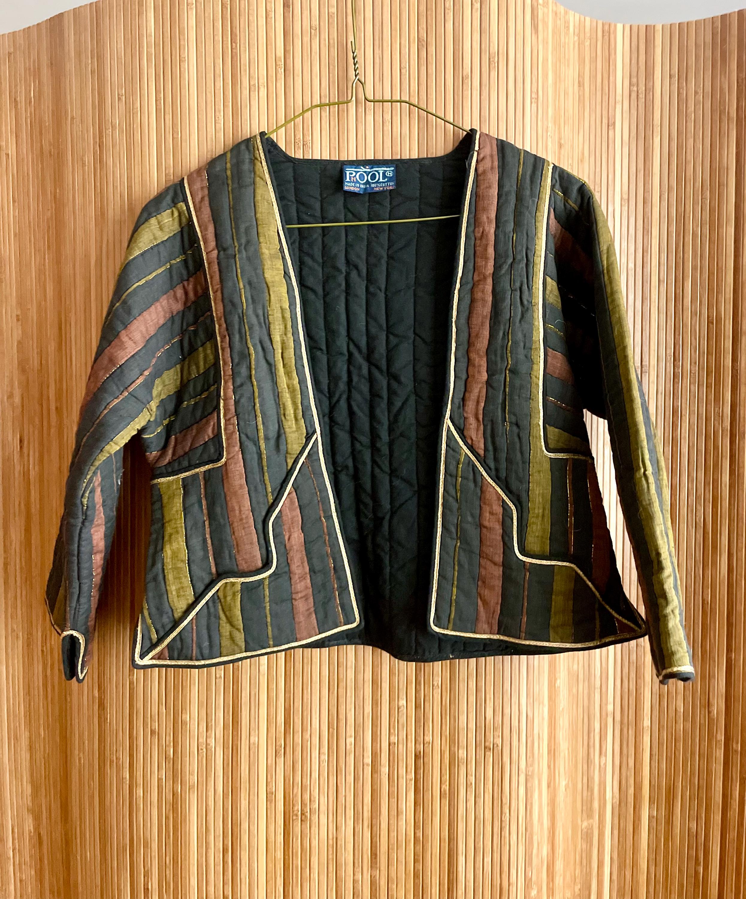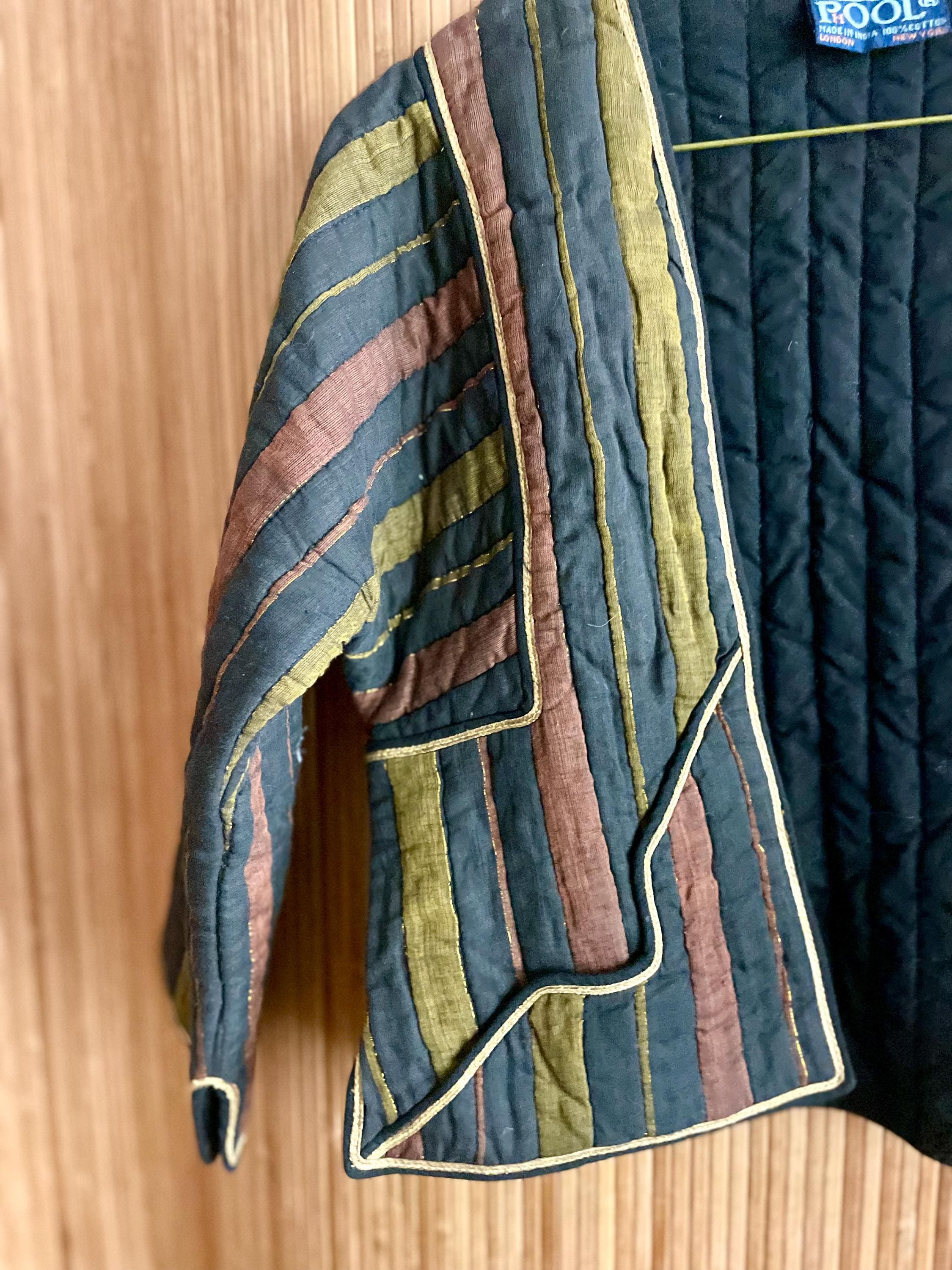 Discover this rare vintage PHOOL Indian quilted bolero jacket, featuring light fabric with lurex threading. This unique bolero-styled jacket, is the perfect statement piece for adding a bohemian flair to your wardrobe.
