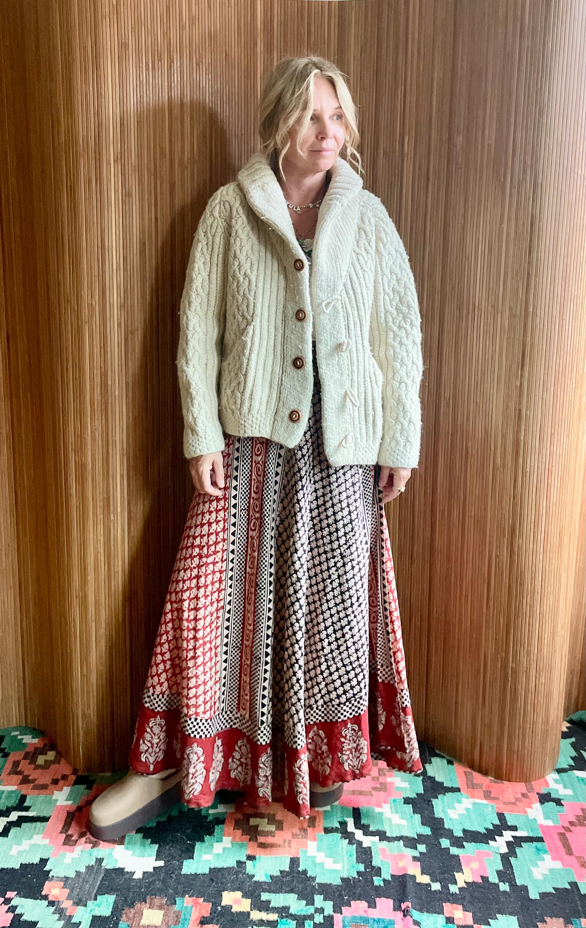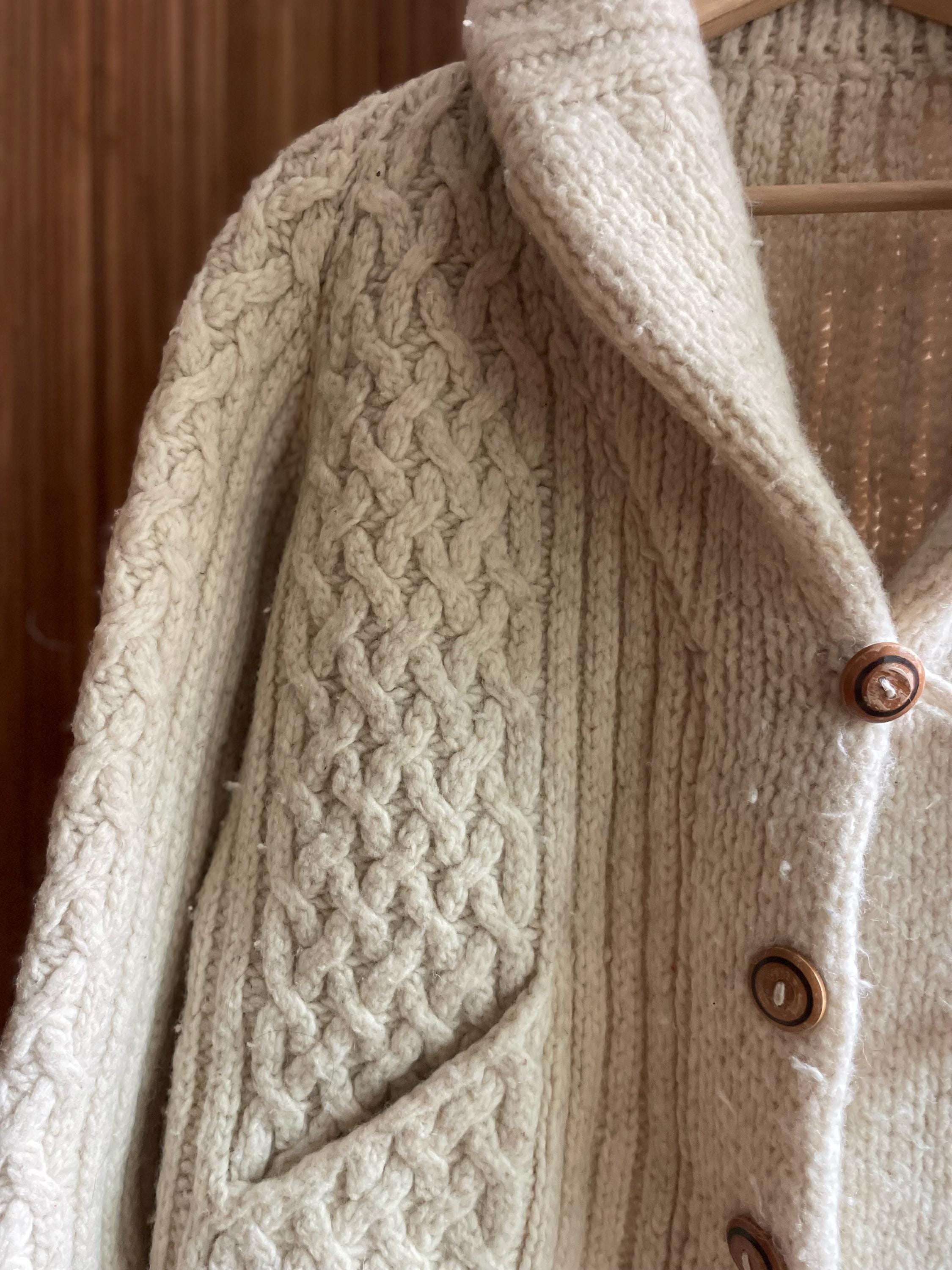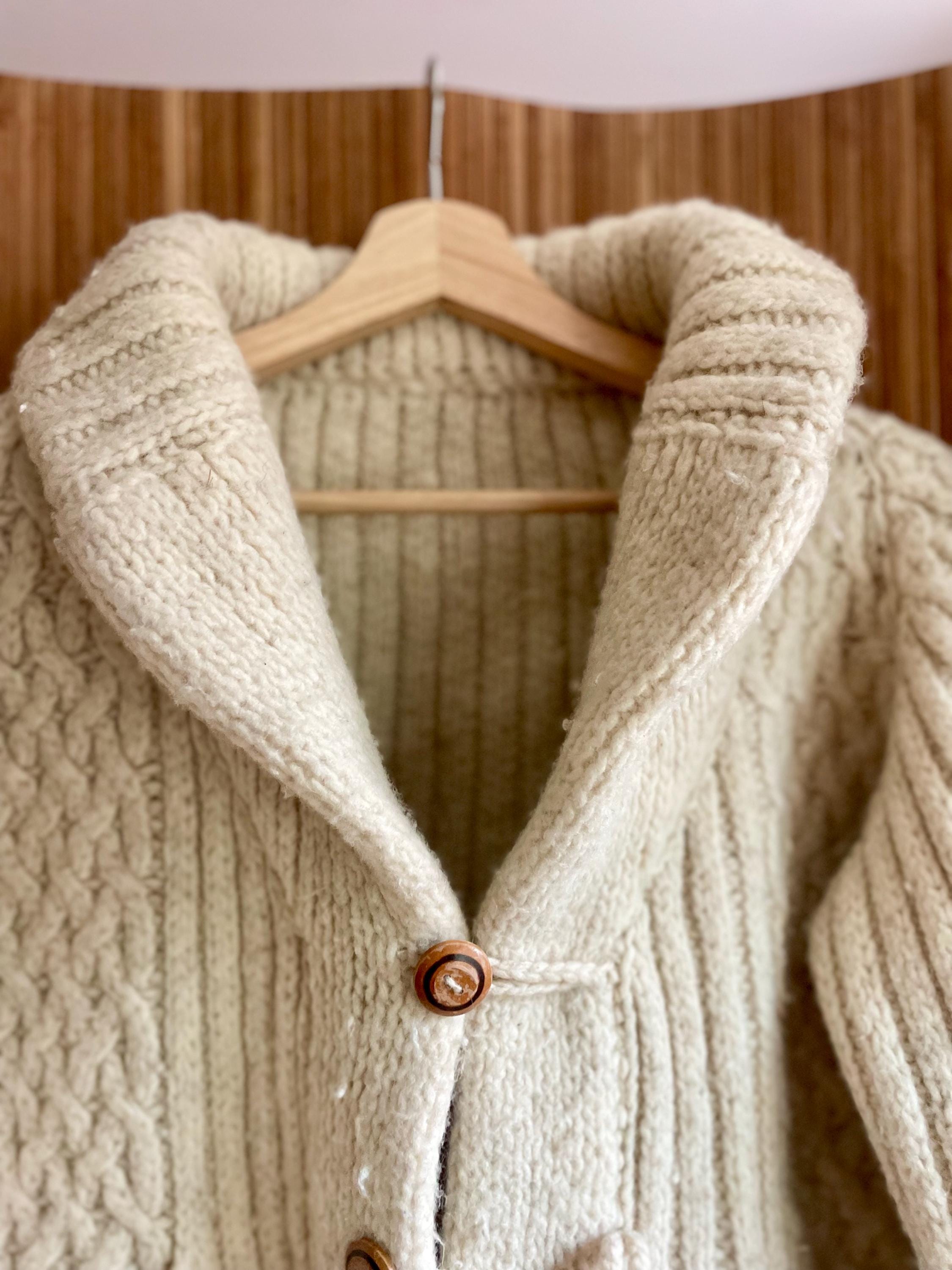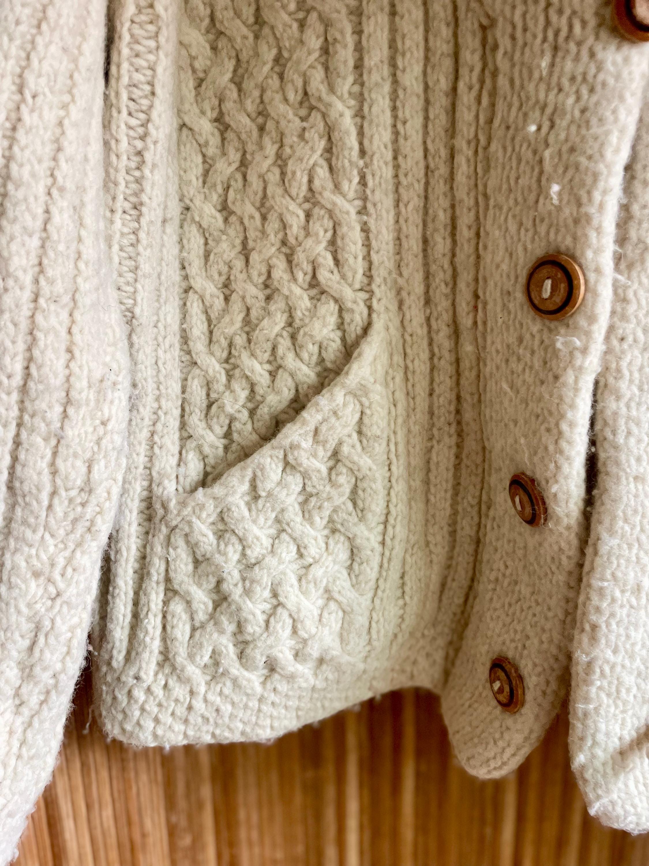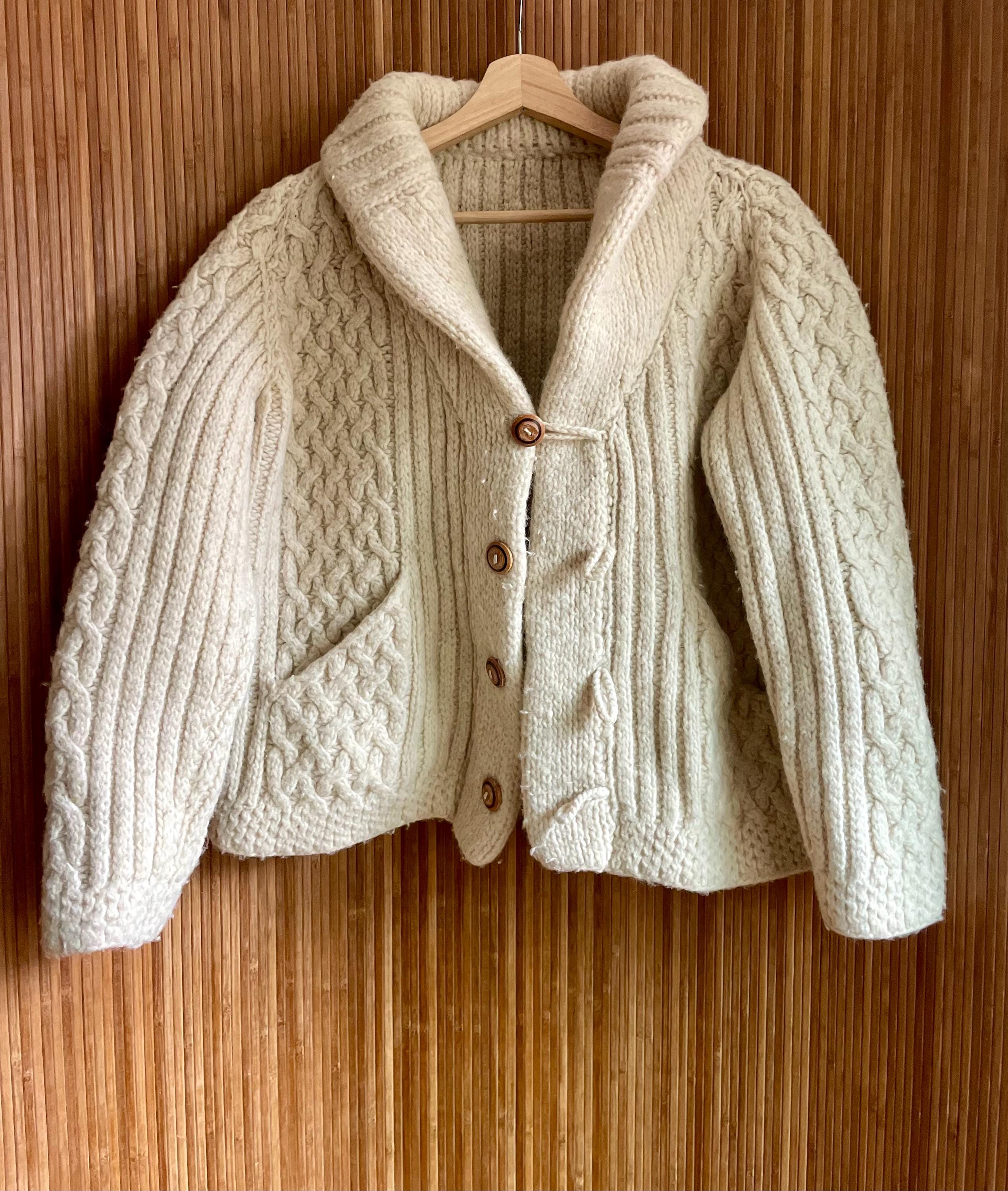 Presenting the cutest vintage 60s Mexican hand-knit crop cardigan. Featuring a unique cable knit pattern and bohemian flair, this short-length sweater is perfect for adding warmth and vintage style to any outfit. A testament to quality craftsmanship