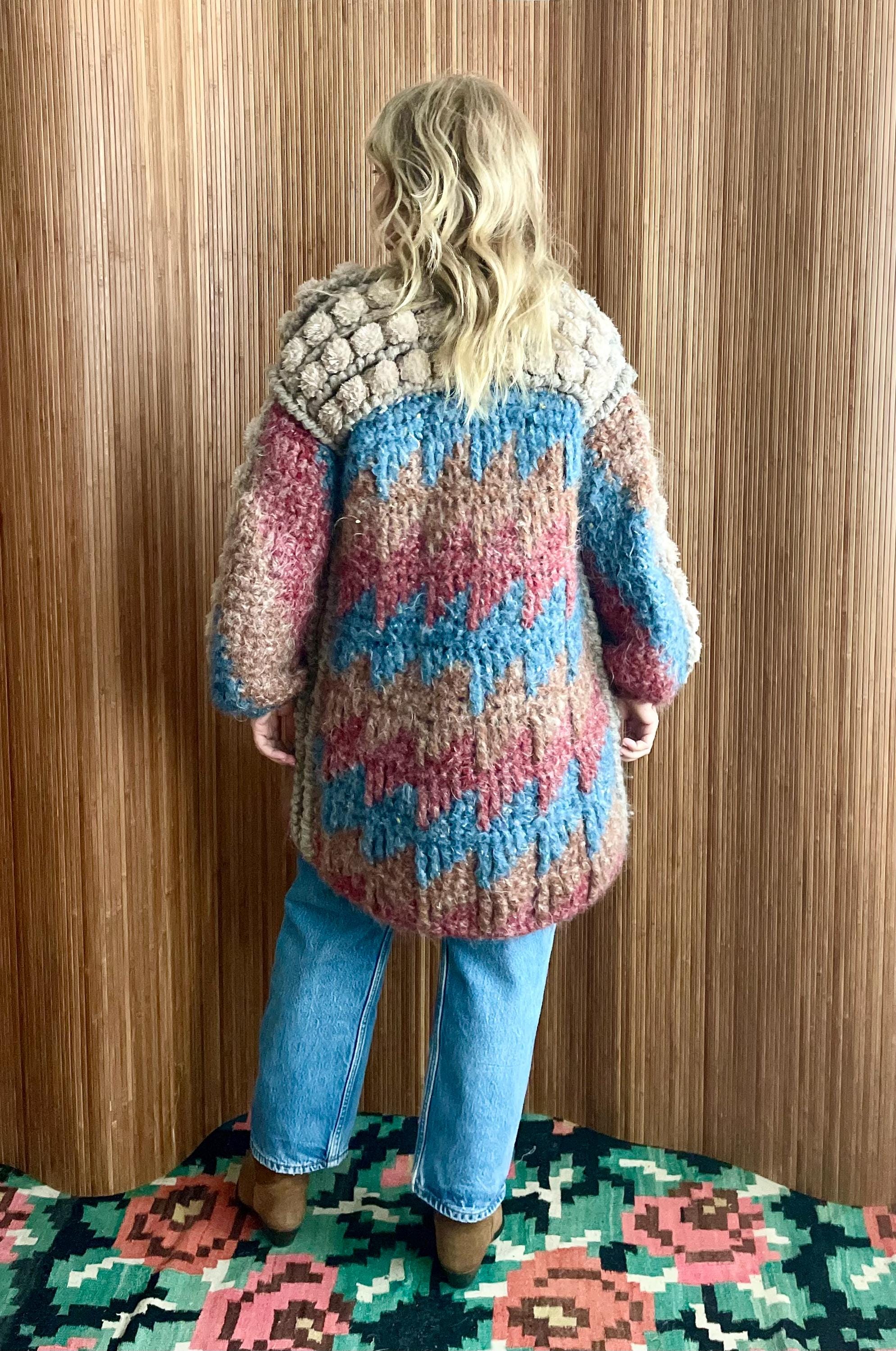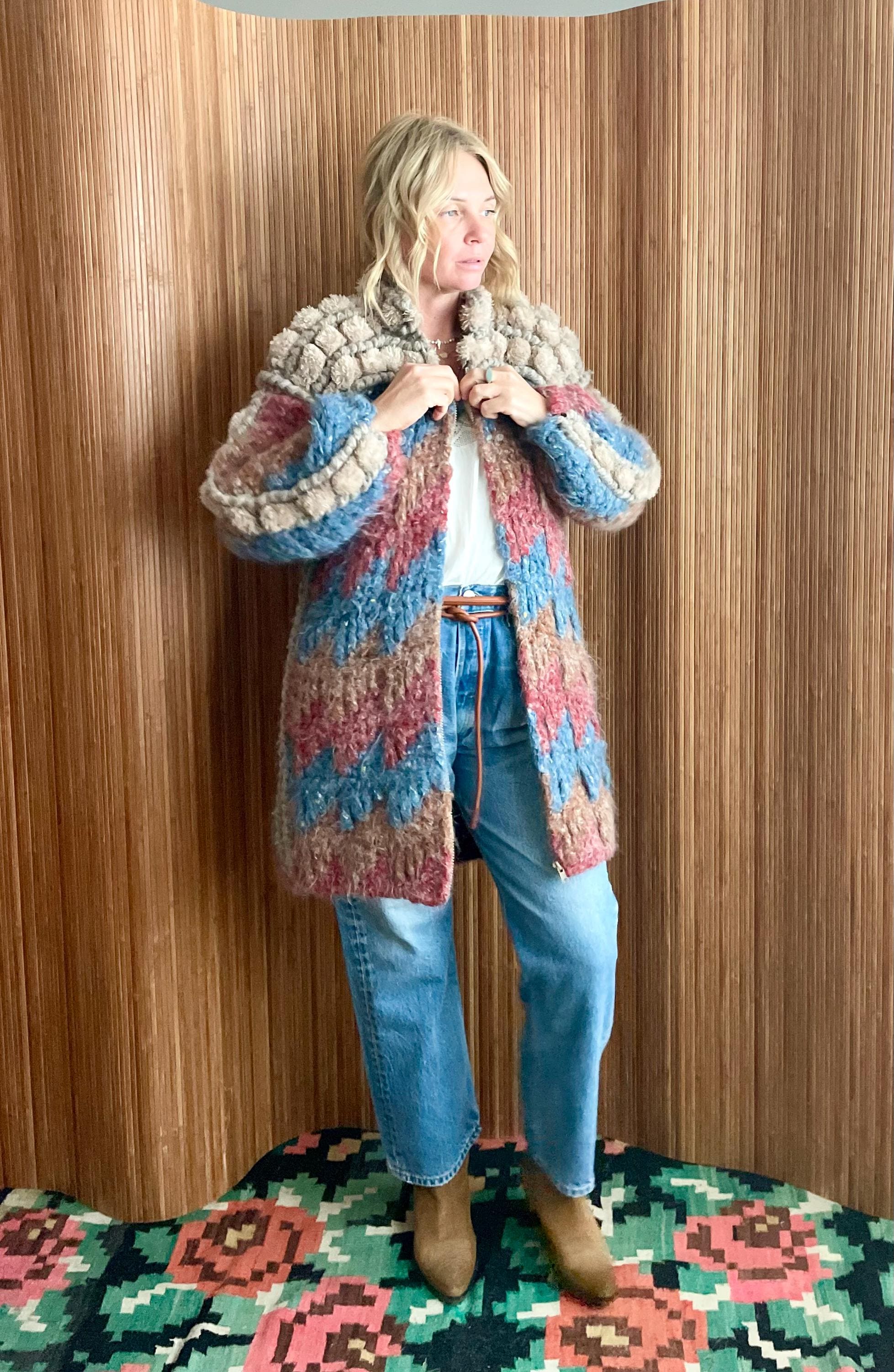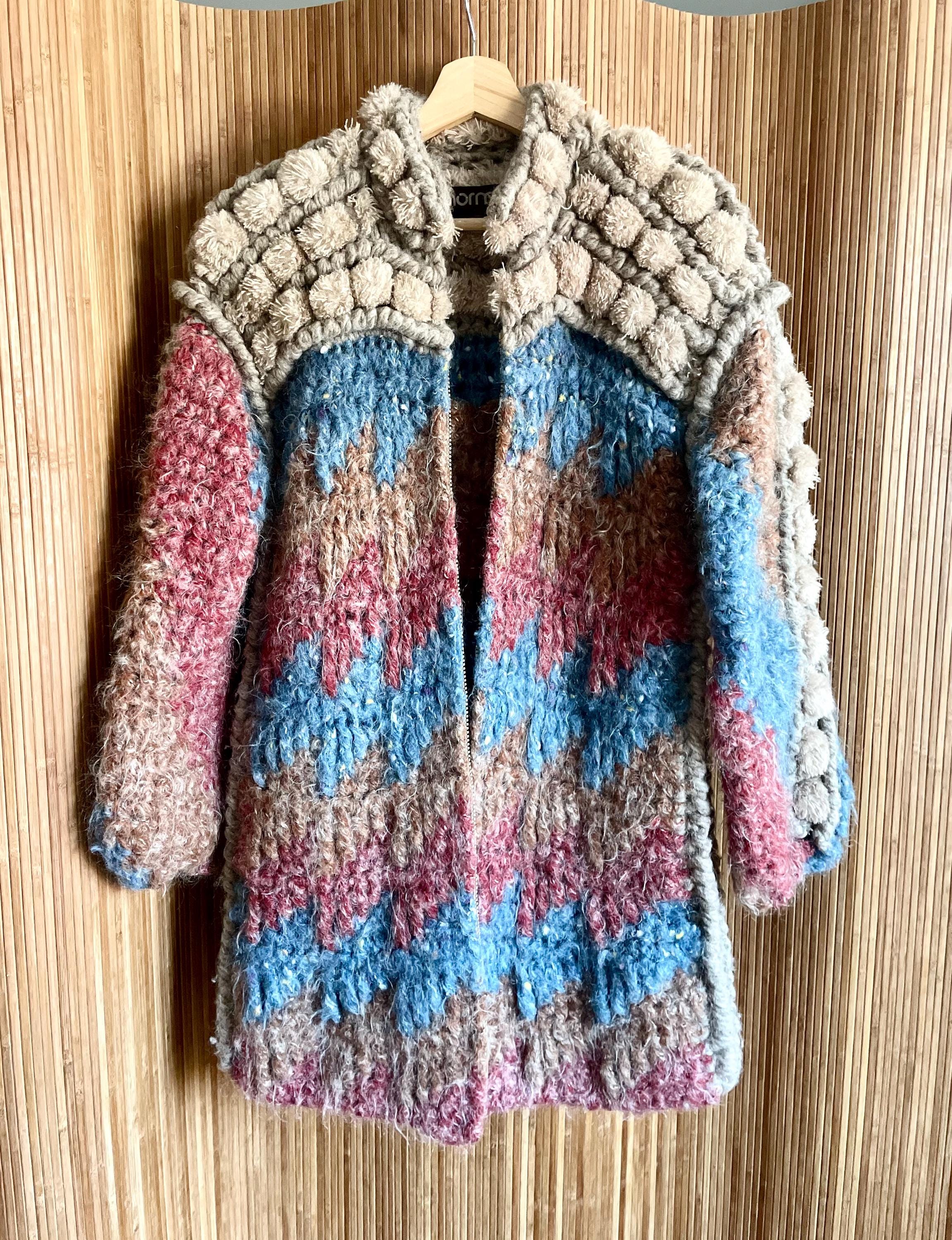 Discover this incredible and rare vintage Norma of Canada hand-knit wool sweater coat (very soft). Chunky, bubble knit cardigan in warm fall color way. Beautiful statement piece!