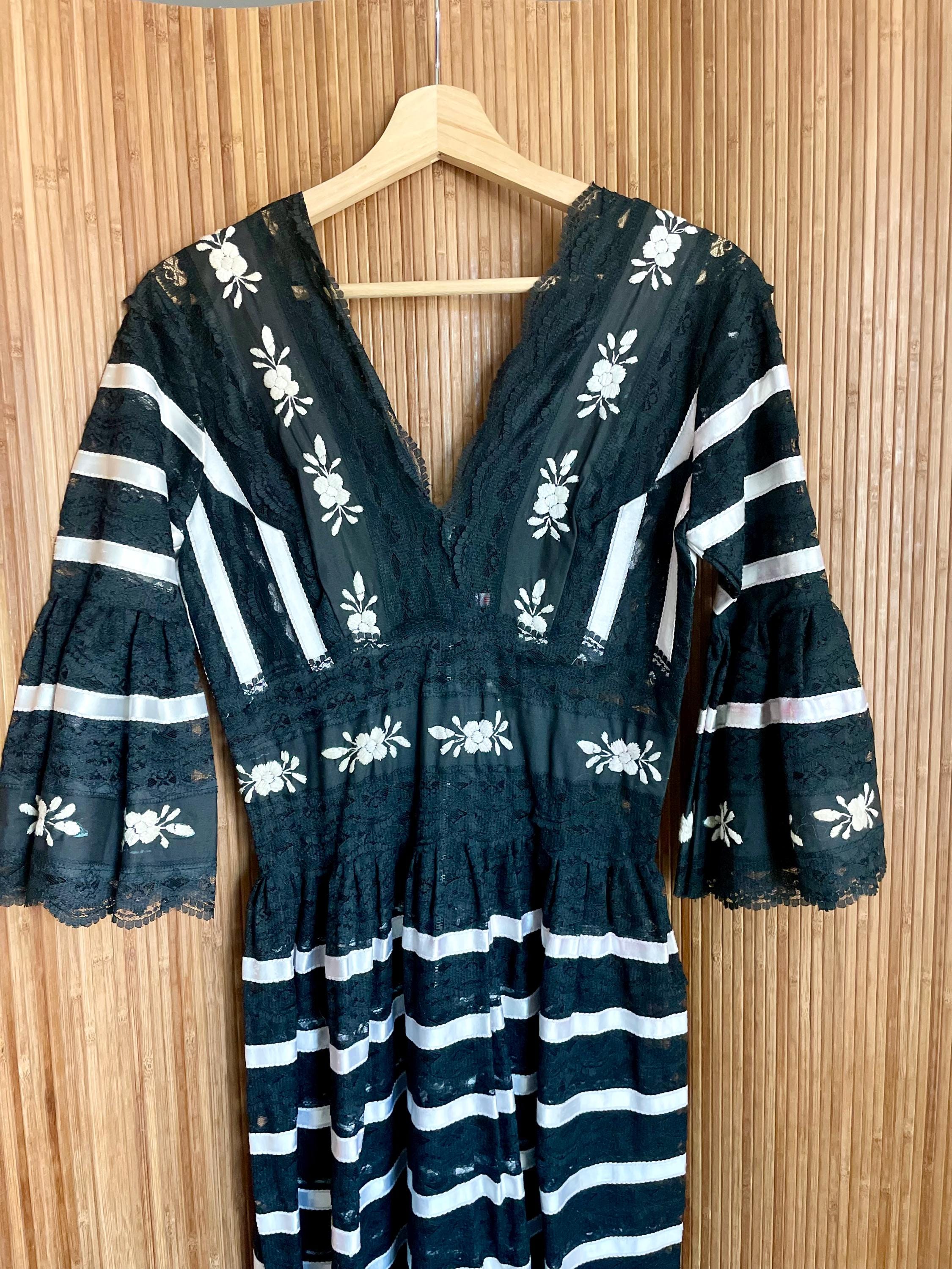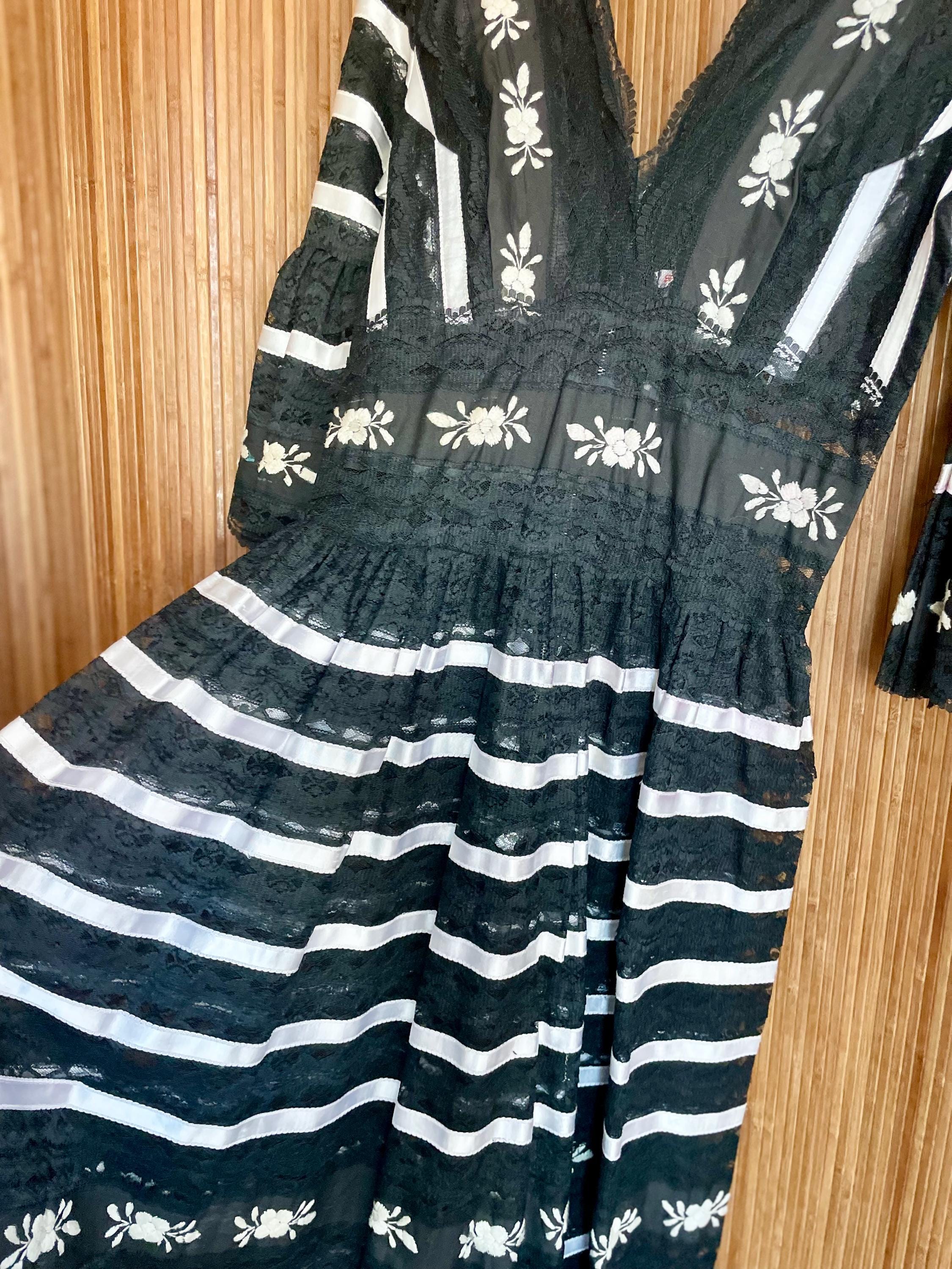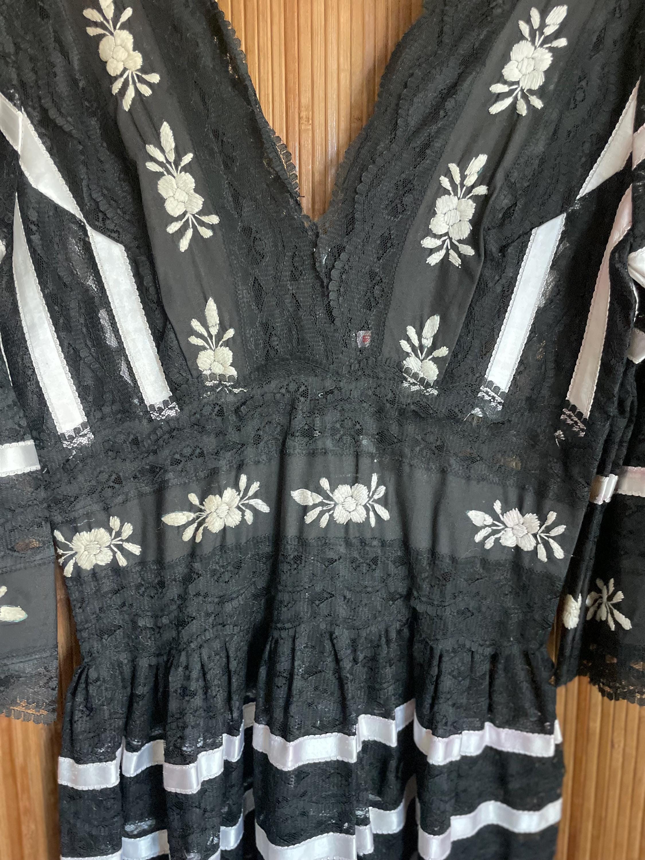 The stunning and classic style of this vintage Mexican maxi dress is something else! Adorned with white floral embroidery on a chic black and white lace fabric, that helps you feel like you're in an old Mexican film. The flowing bell sleeves add a touch of bohemian flair, making this piece perfect for vintage collectors and boho style seekers.