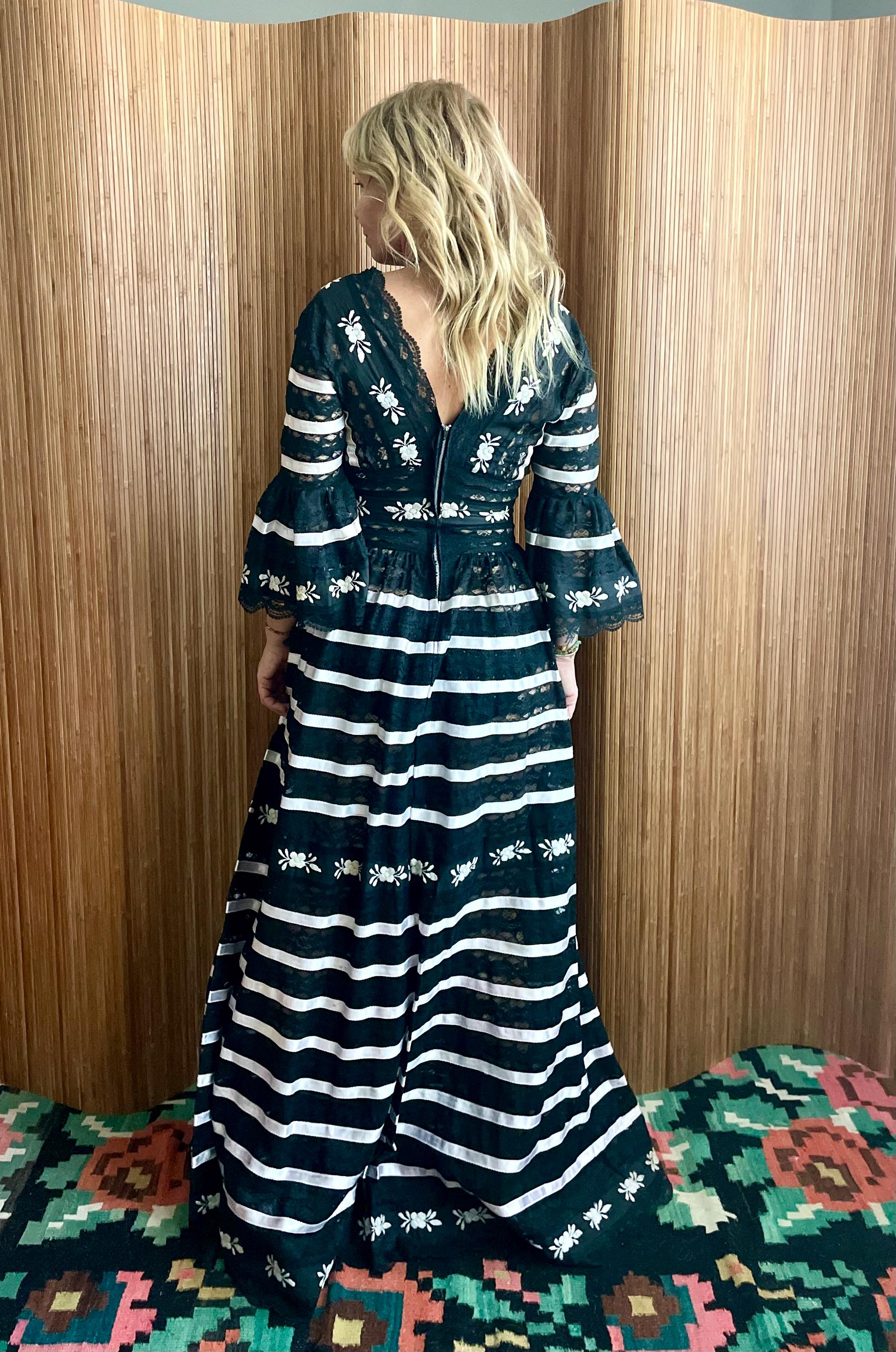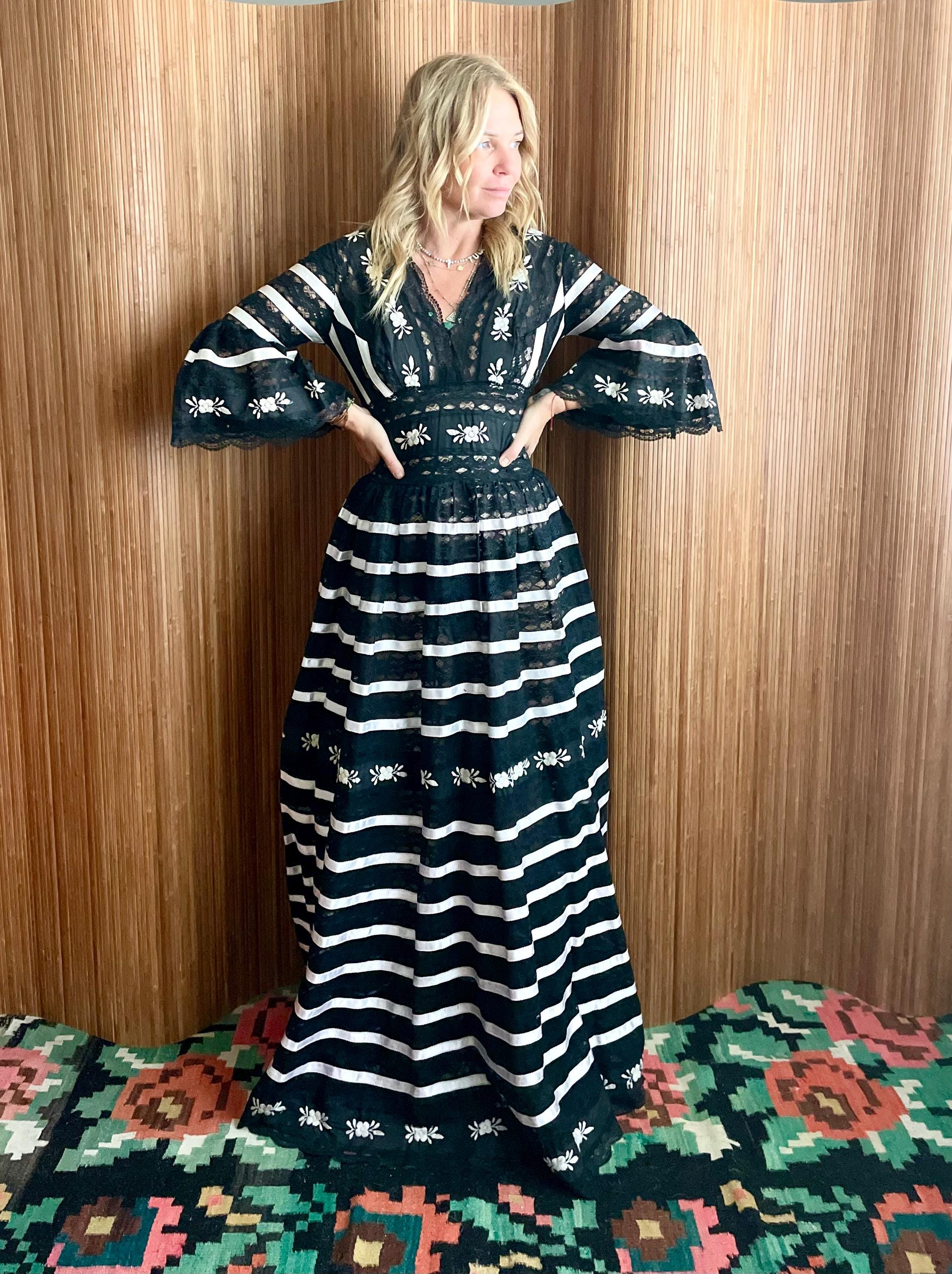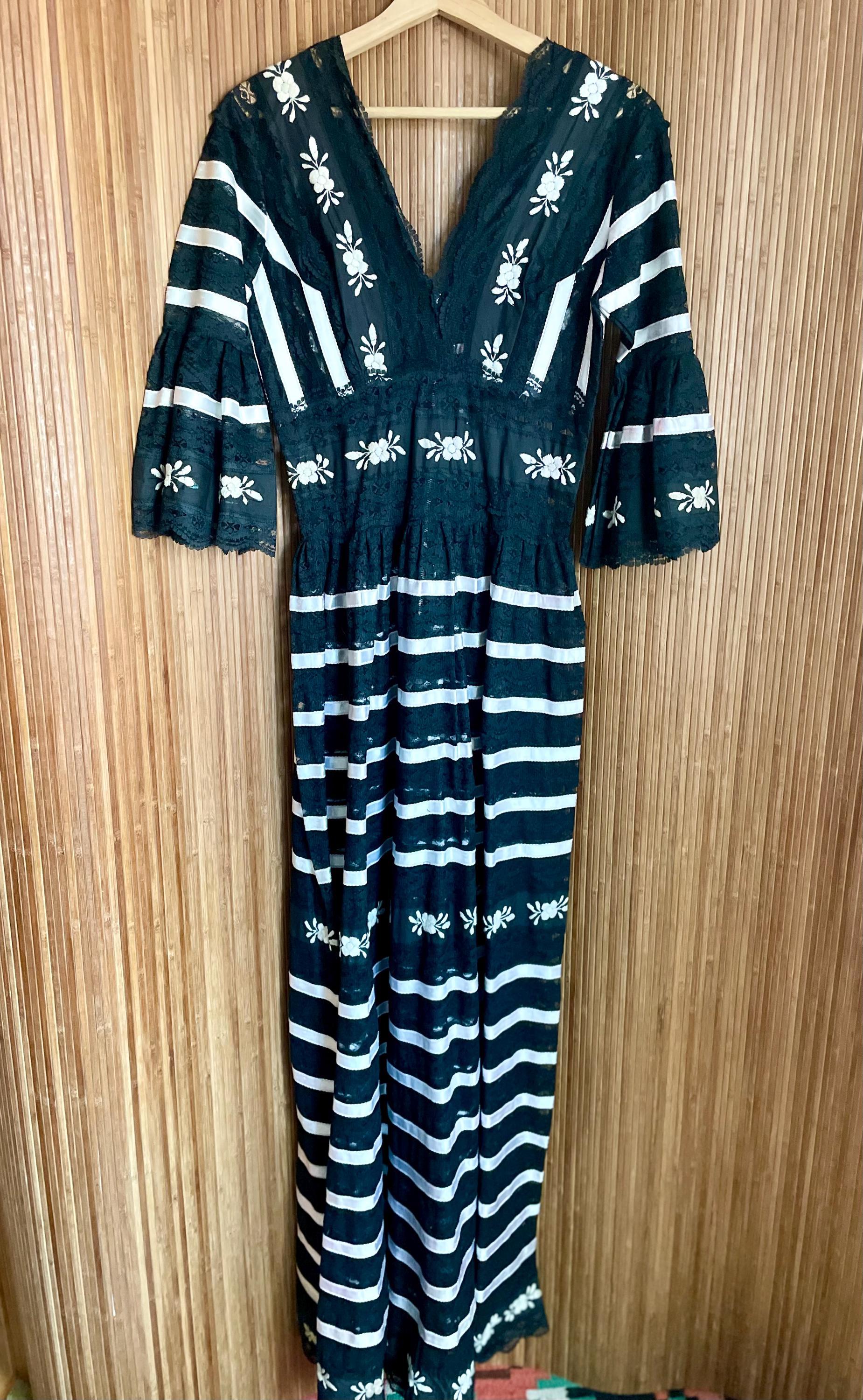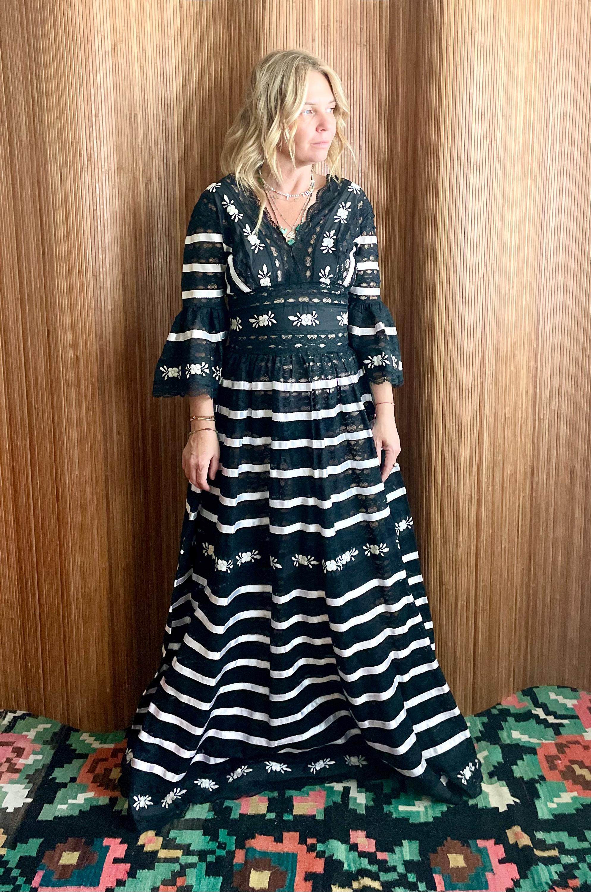 The stunning and classic style of this vintage Mexican maxi dress is something else! Adorned with white floral embroidery on a chic black and white lace fabric, that helps you feel like you're in an old Mexican film. The flowing bell sleeves add a touch of bohemian flair, making this piece perfect for vintage collectors and boho style seekers.