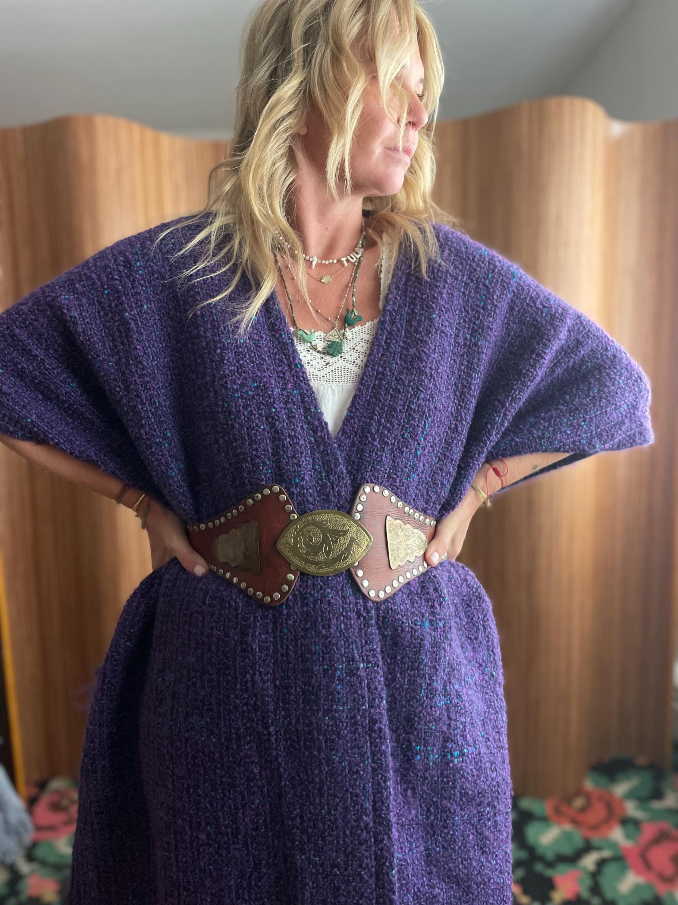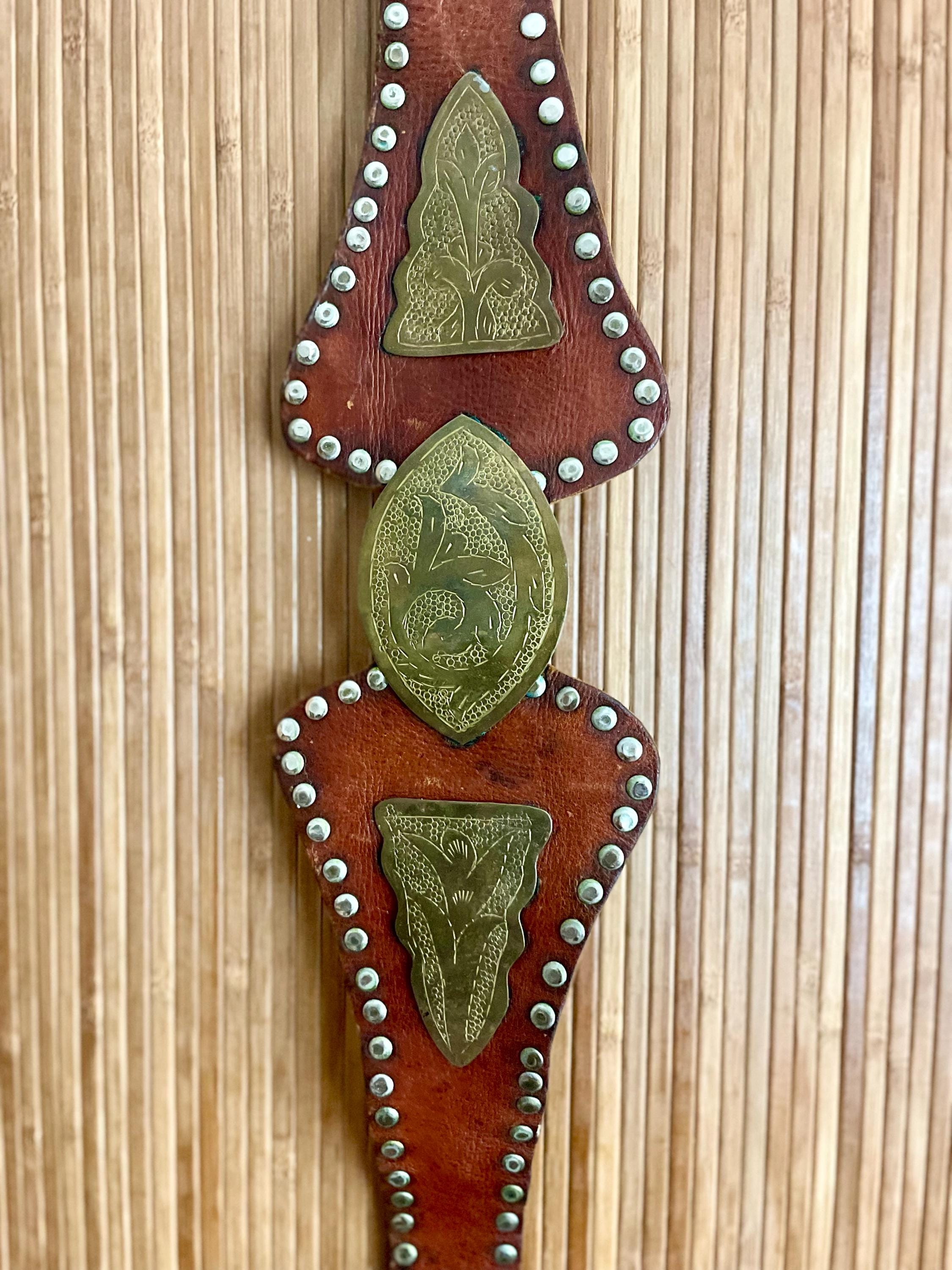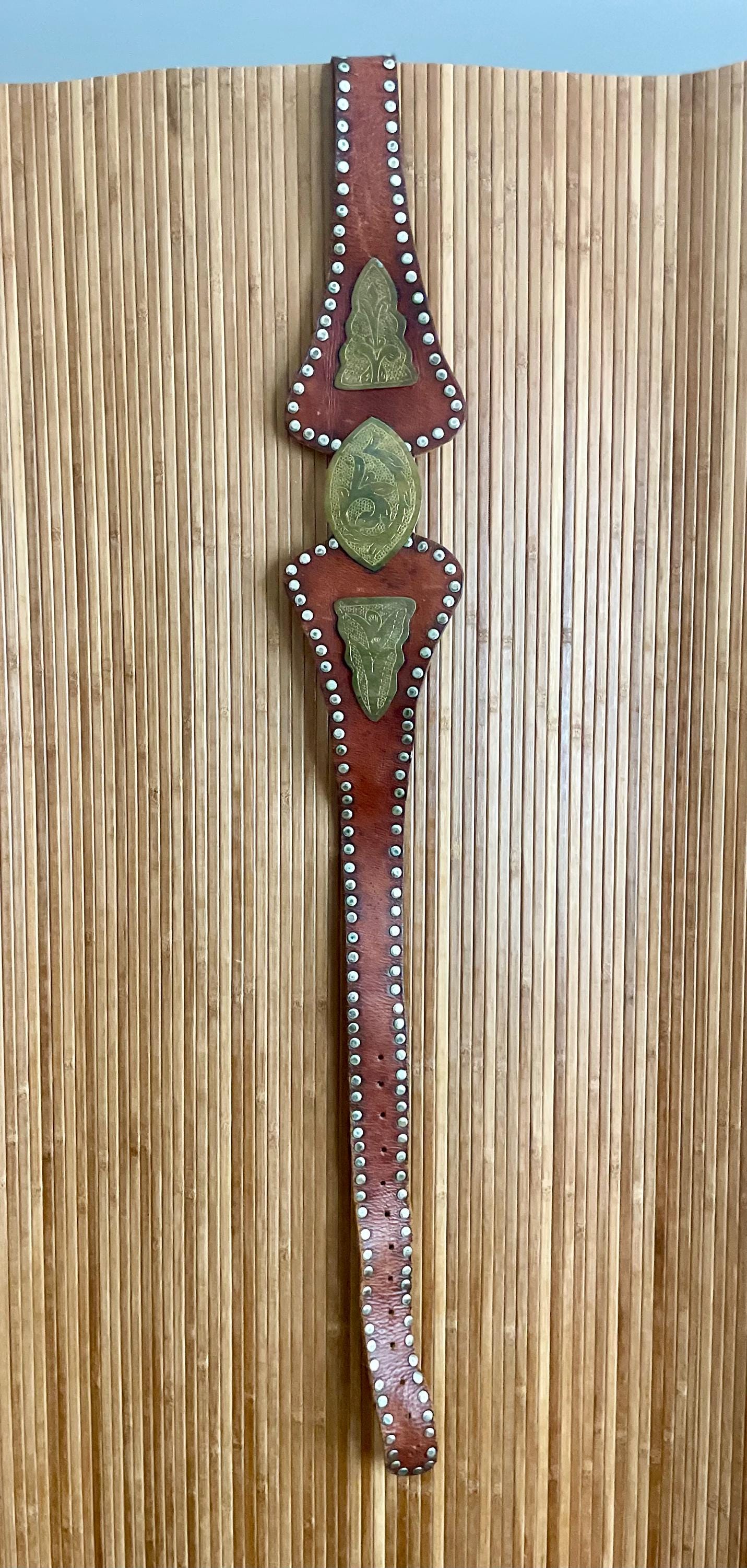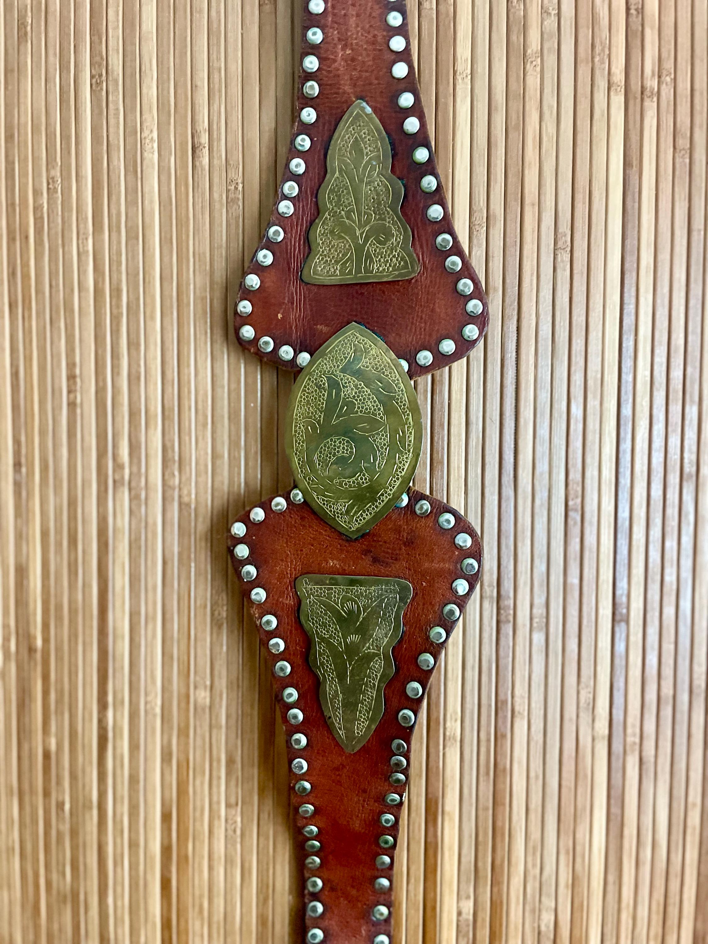 Add a focal point to any outfit with this vintage leather statement belt. Wide and bold with silver studs and etched brass buckle. This eye-catching waist belt elevates any dress, tunic, or oversized sweater, giving it a bohemian chic vibe.