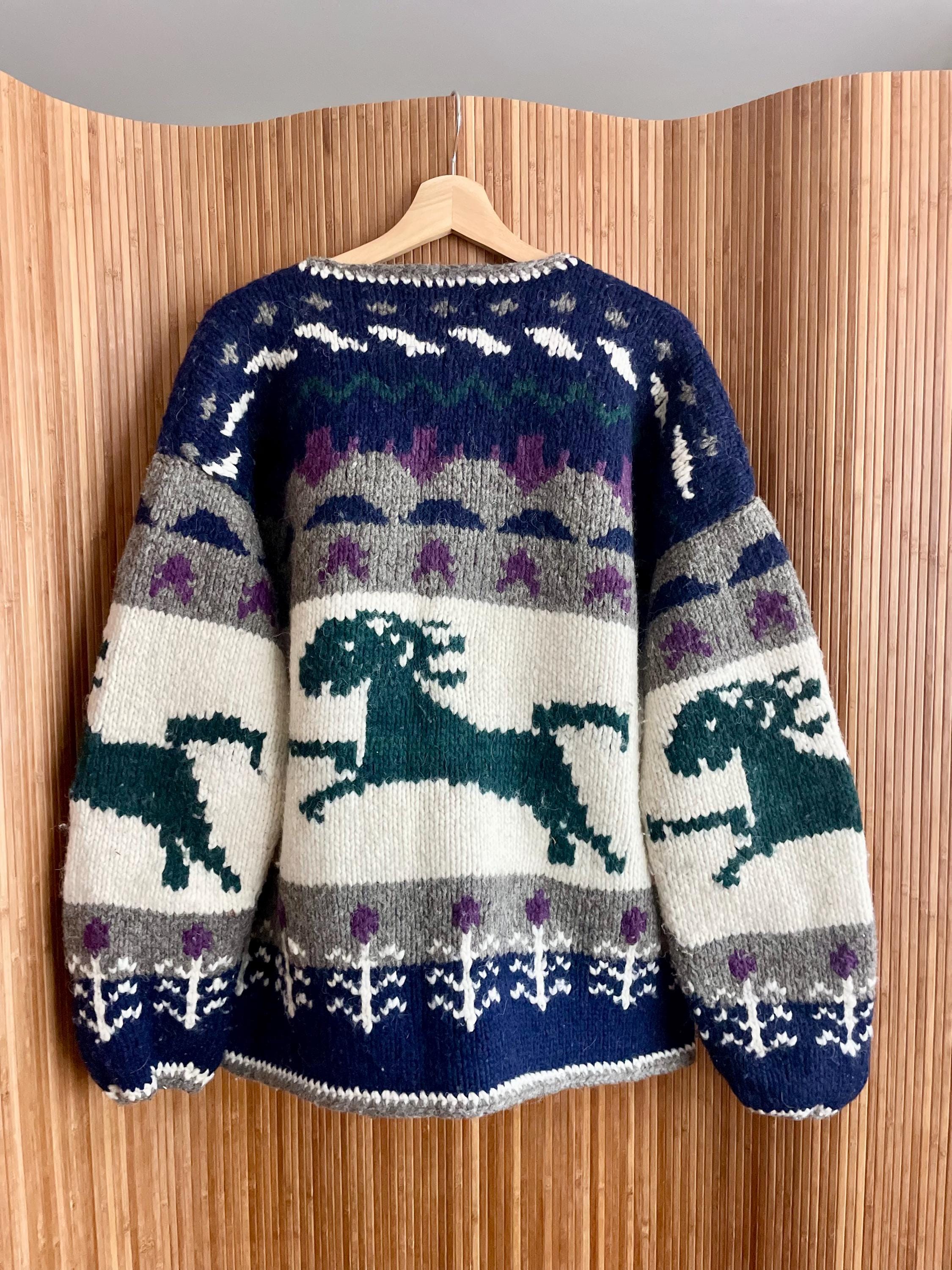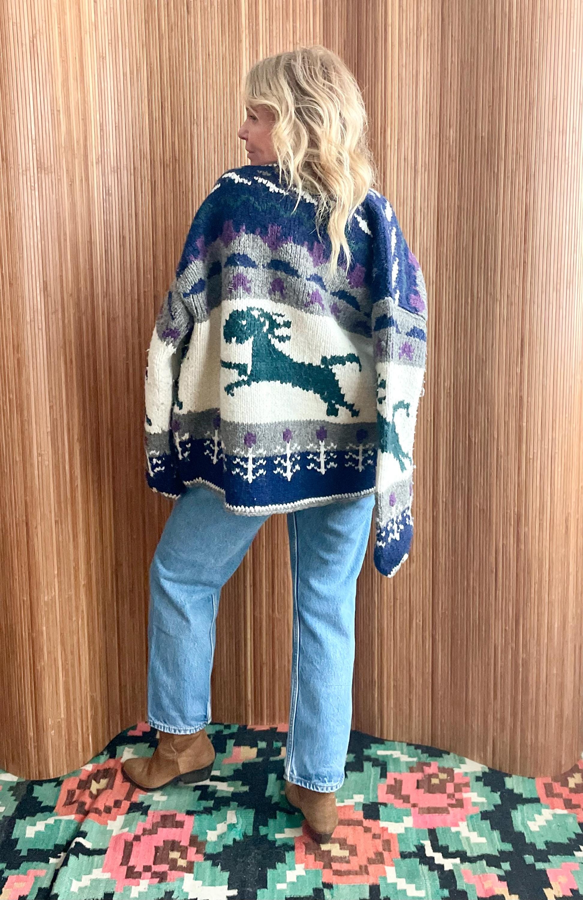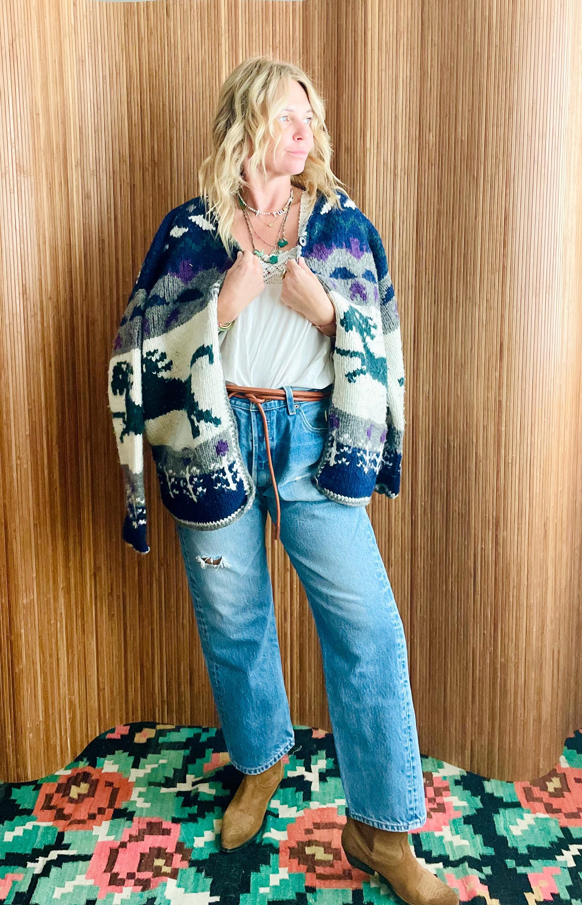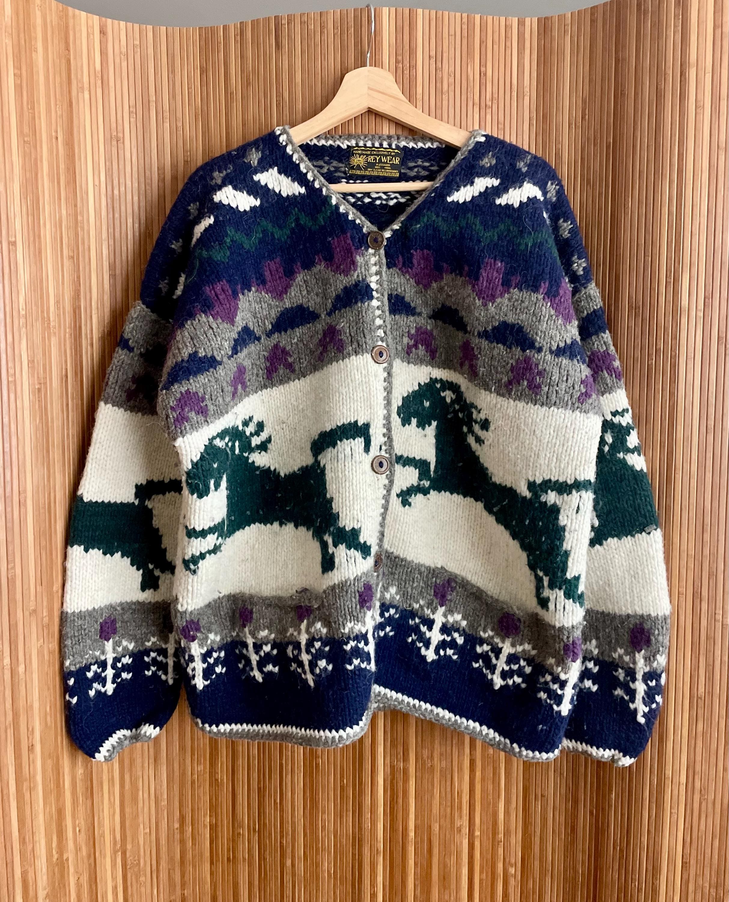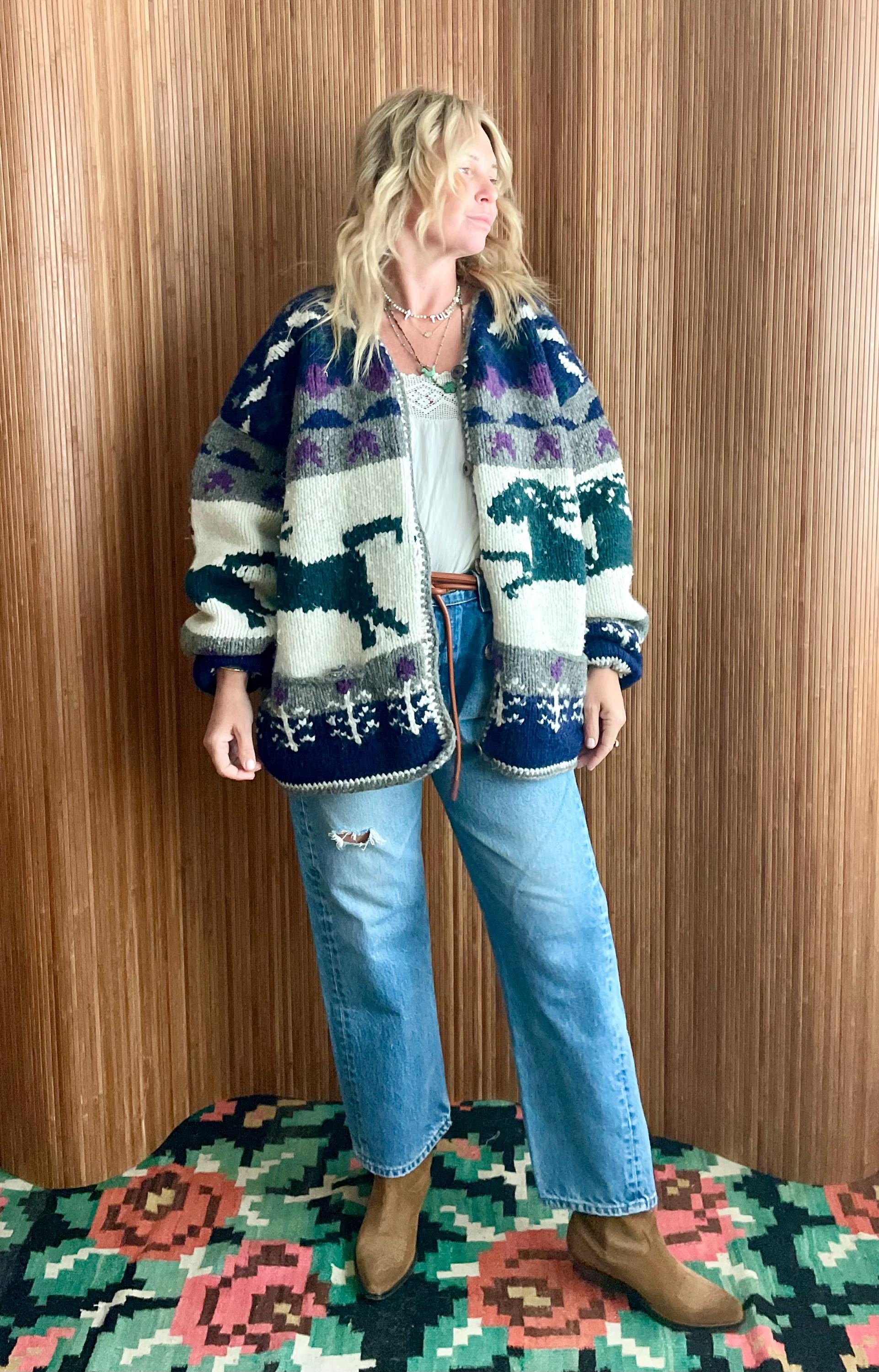 This vintage ethnic wool cardigan brings a touch of equestrian style. This stunning one-of-a-kind Ecuadorian knit bring comfort & warmth with a bit of funk