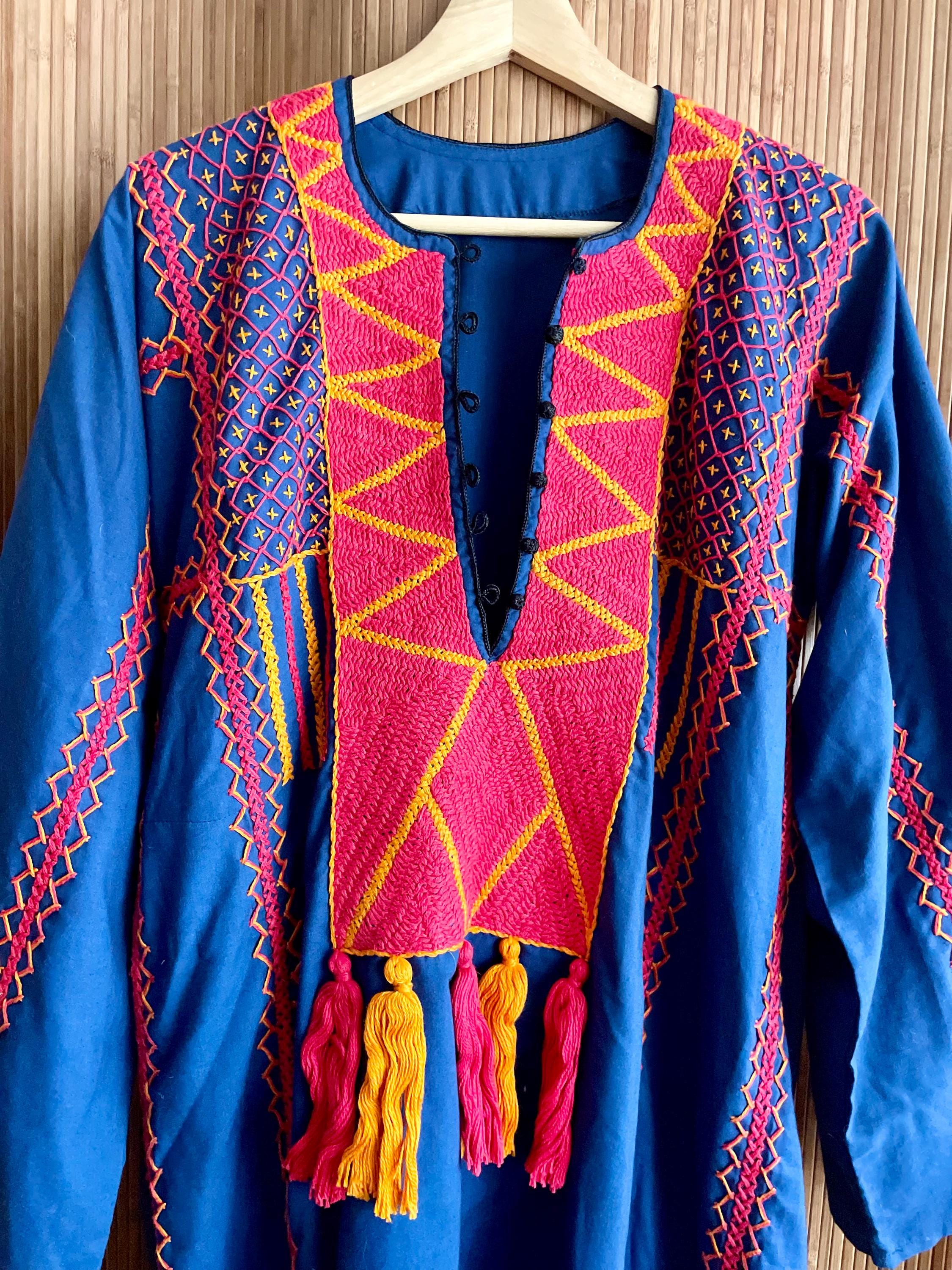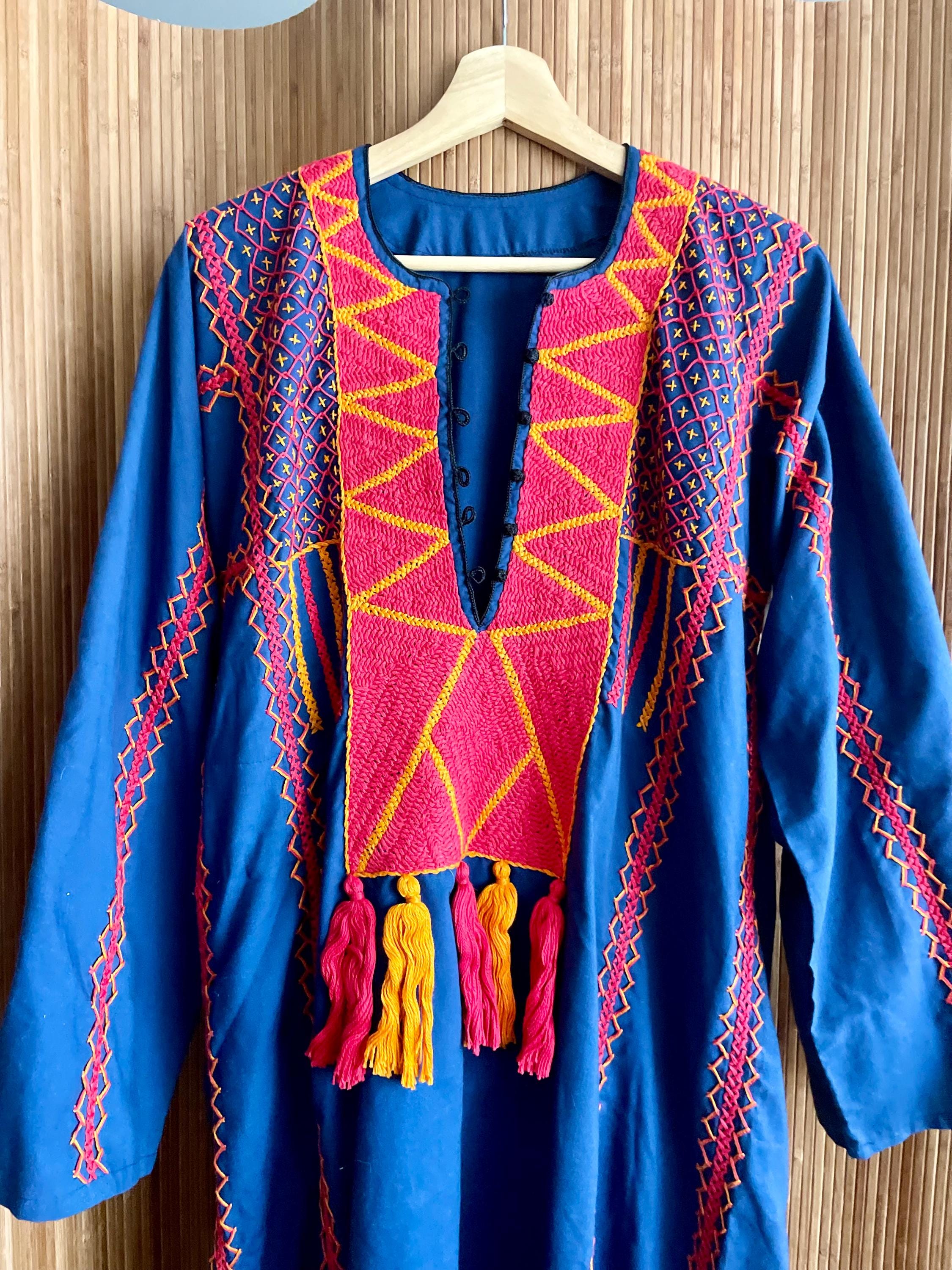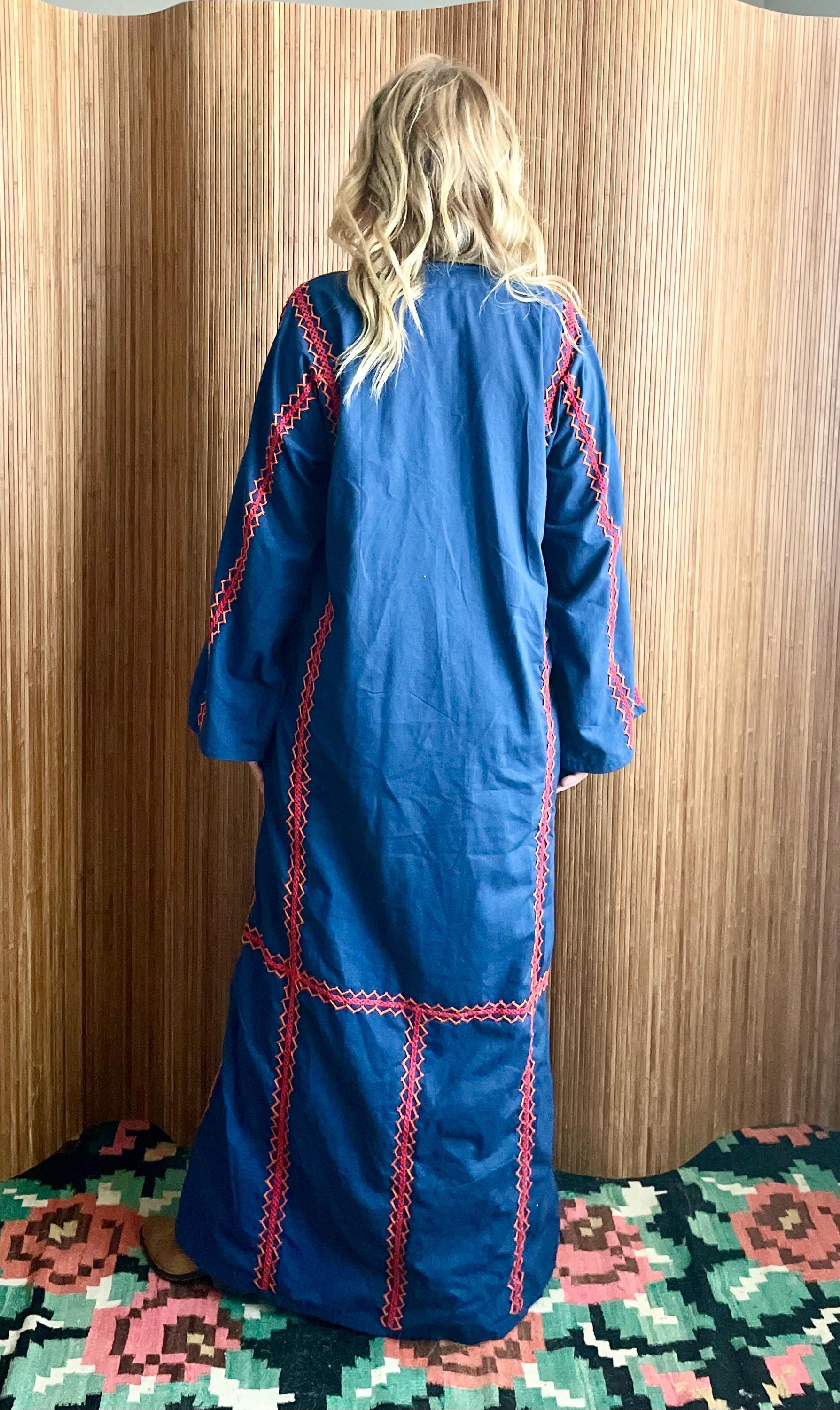 Embrace bohemian elegance with this stunning, handcrafted kaftan from the Siwa tribe in Egypt. This beautiful maxi dress features a rich blue fabric adorned with vibrant red embroidery, creating a unique and eye-catching design. The intricate detailing around the neckline, sleeves, and hem adds a touch of ethnic charm to this one-of-a-kind piece.