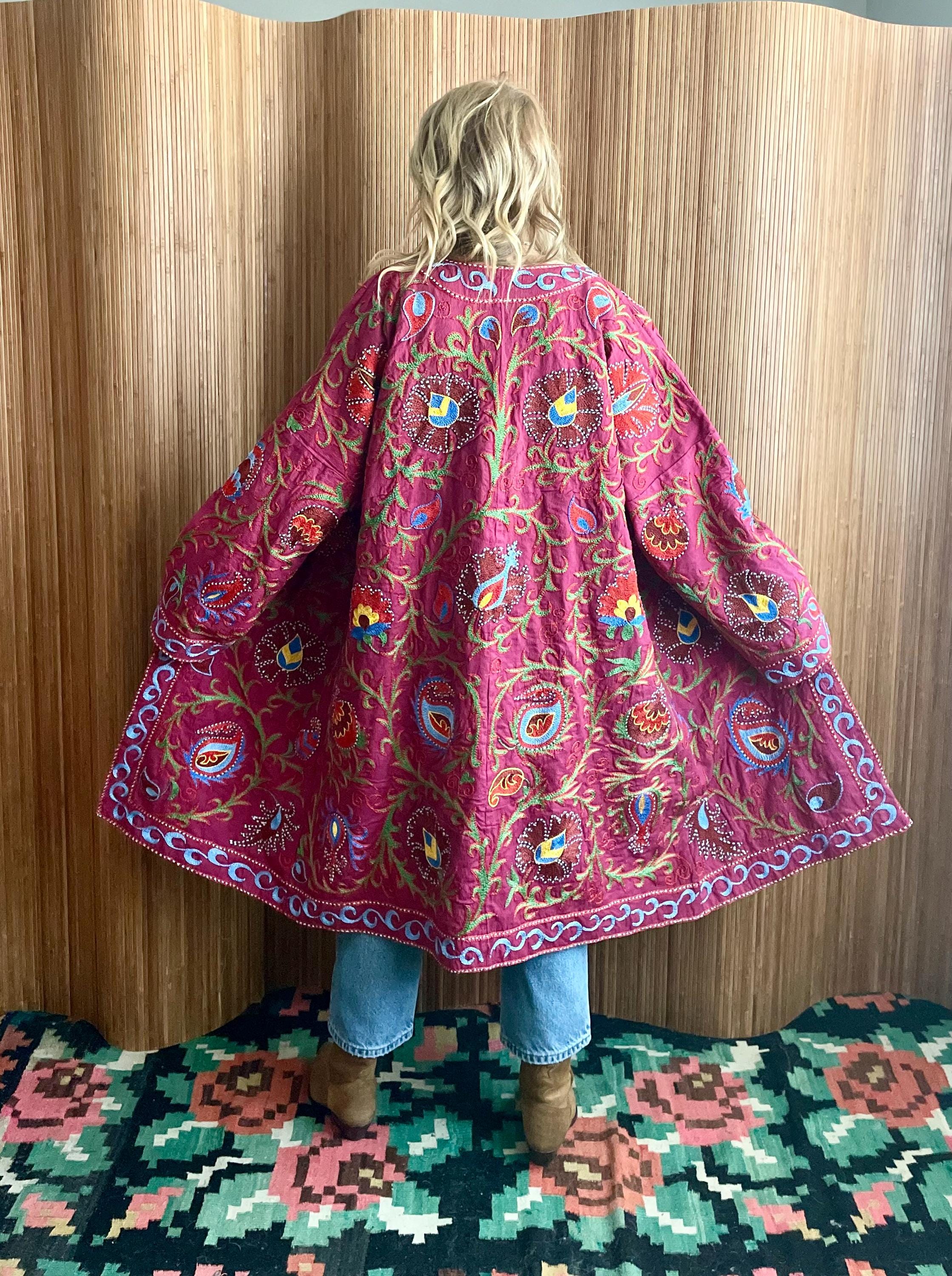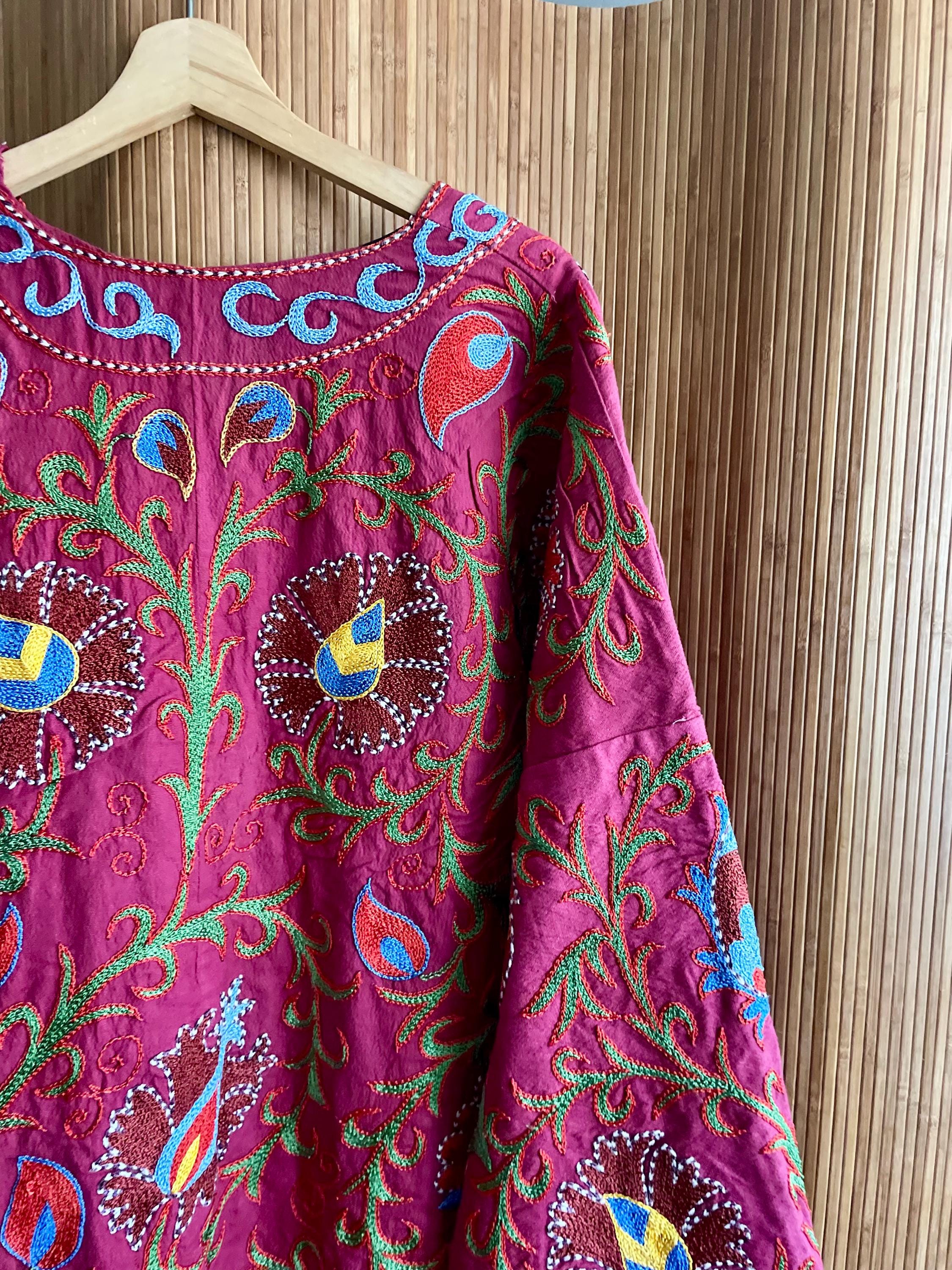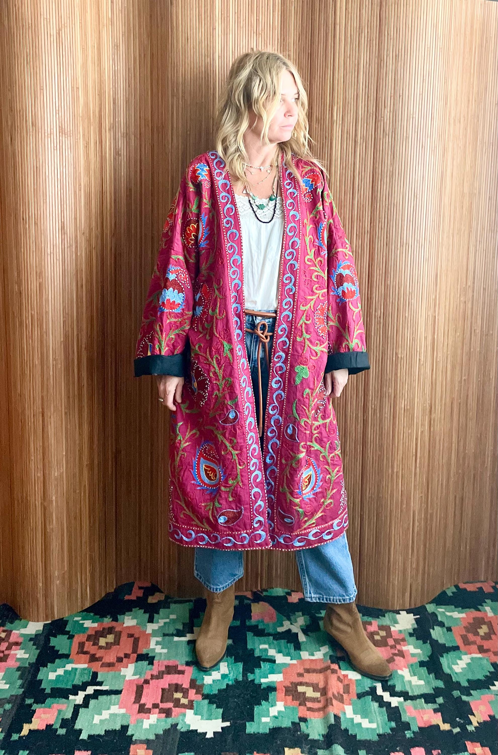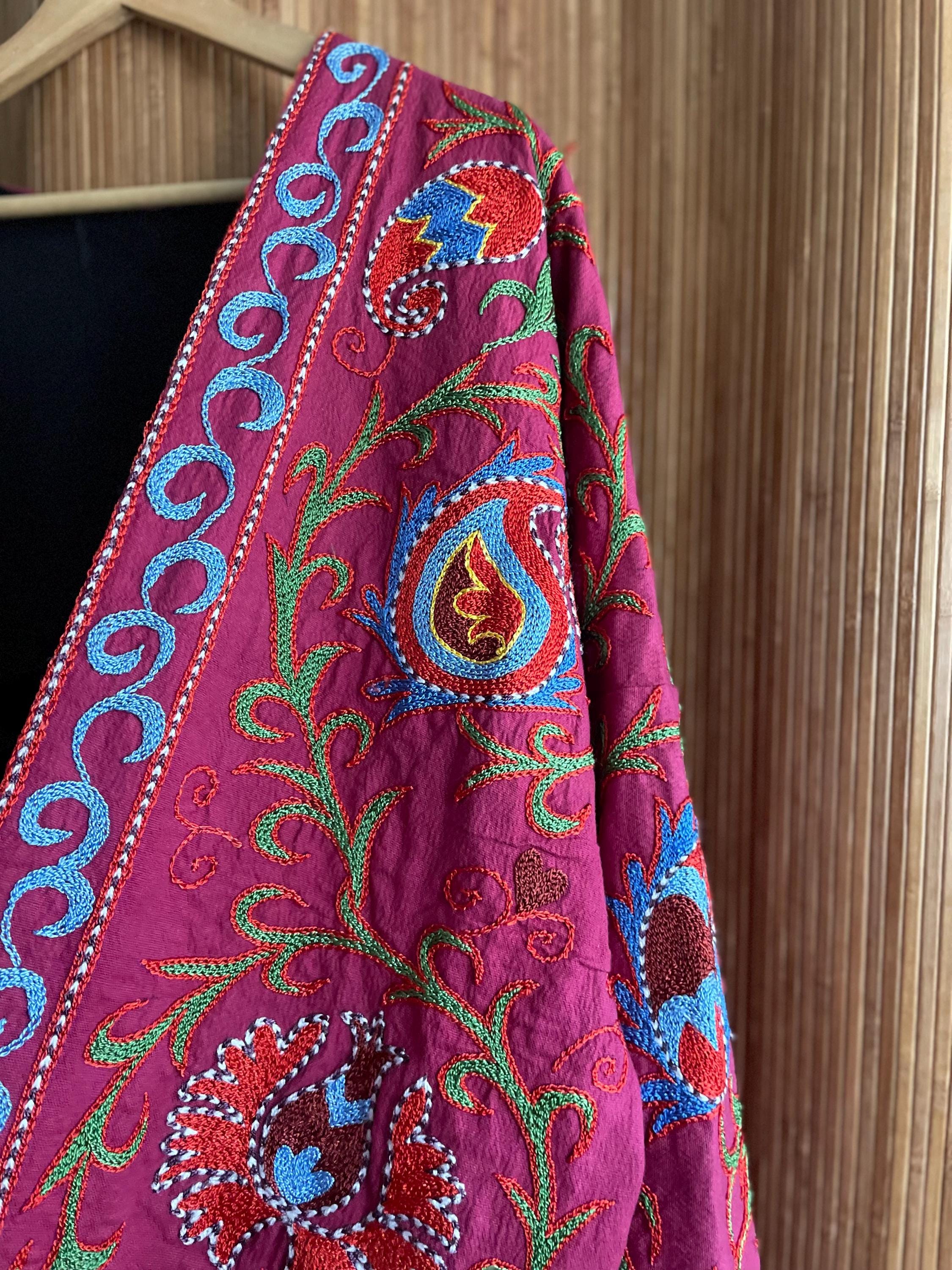 Stunning vintage Uzbek suzani duster featuring intricate hand embroidery on silk. This unique piece is a vibrant statement garment. Wear it with jeans and tee for a casual look or with silk trousers for a special occasion.