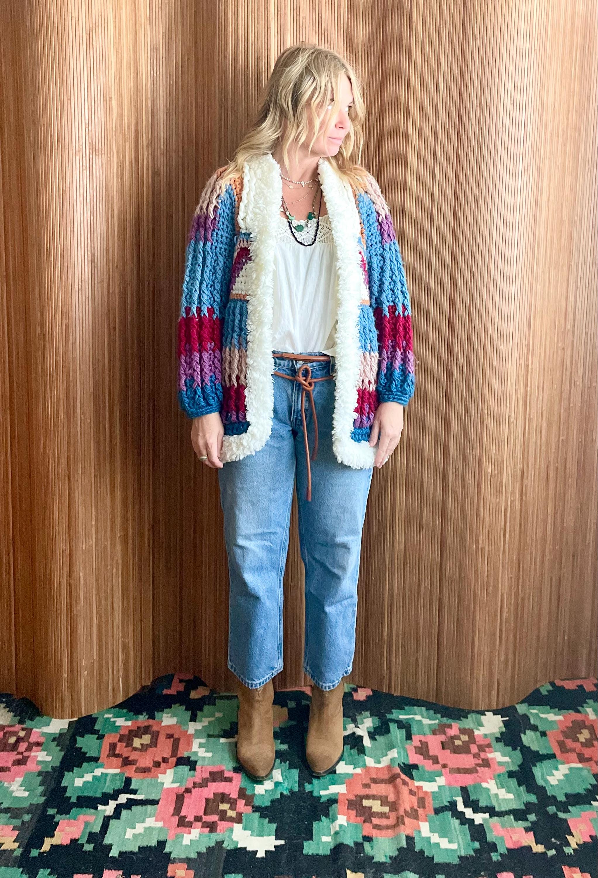 Funky 70s chunky, colorful cardigan sweater featuring plush trim & intricate crochet panel