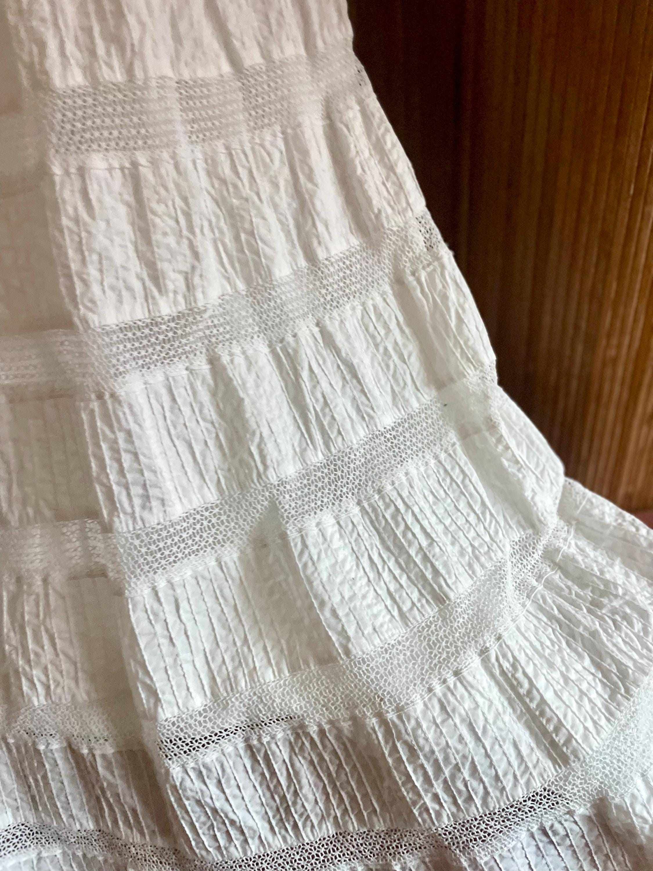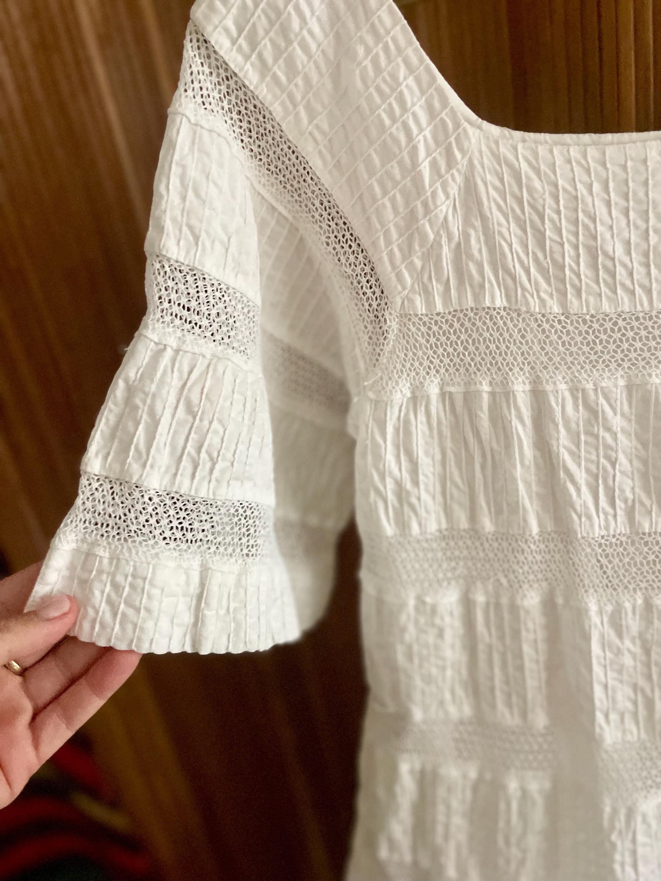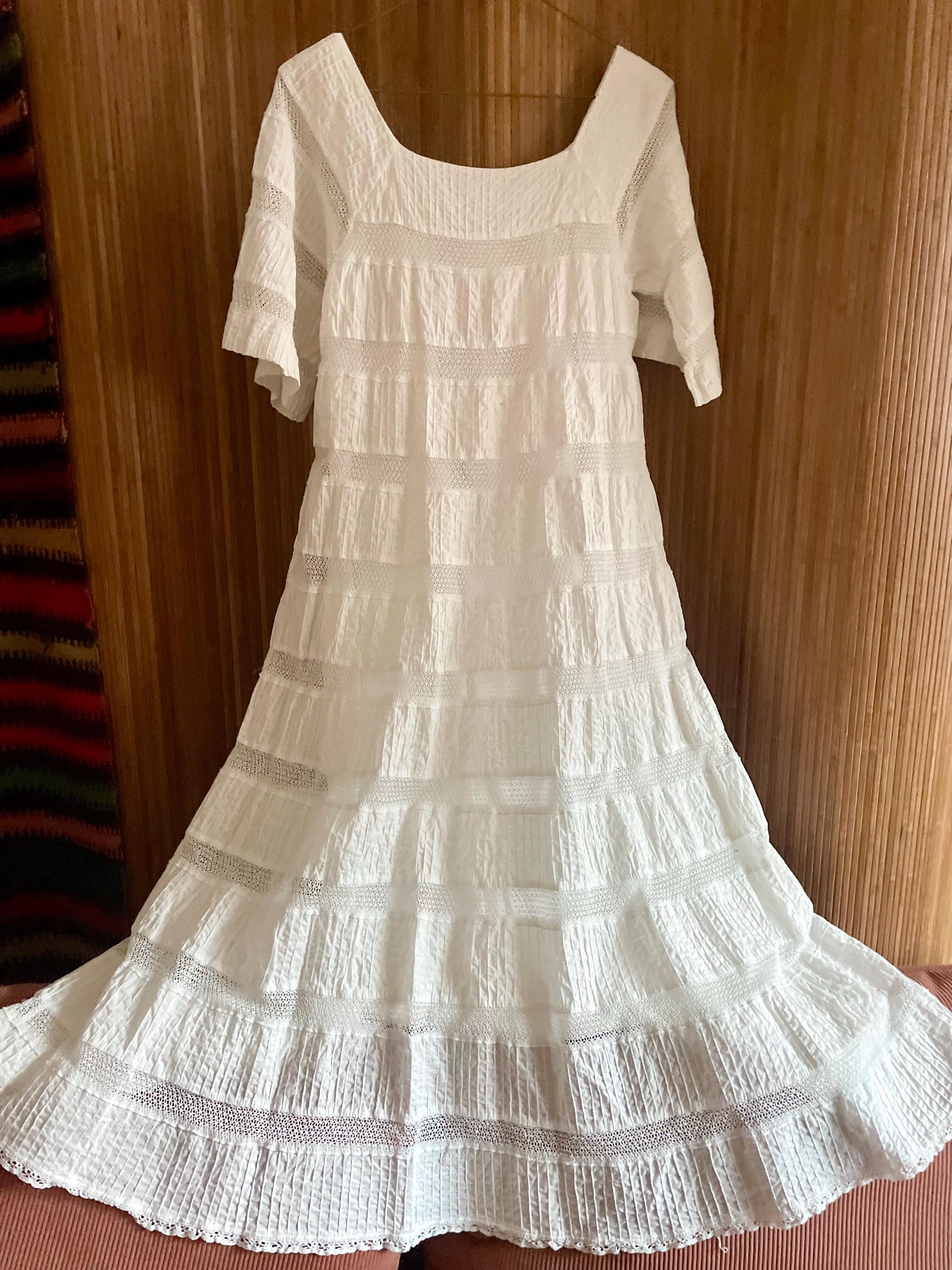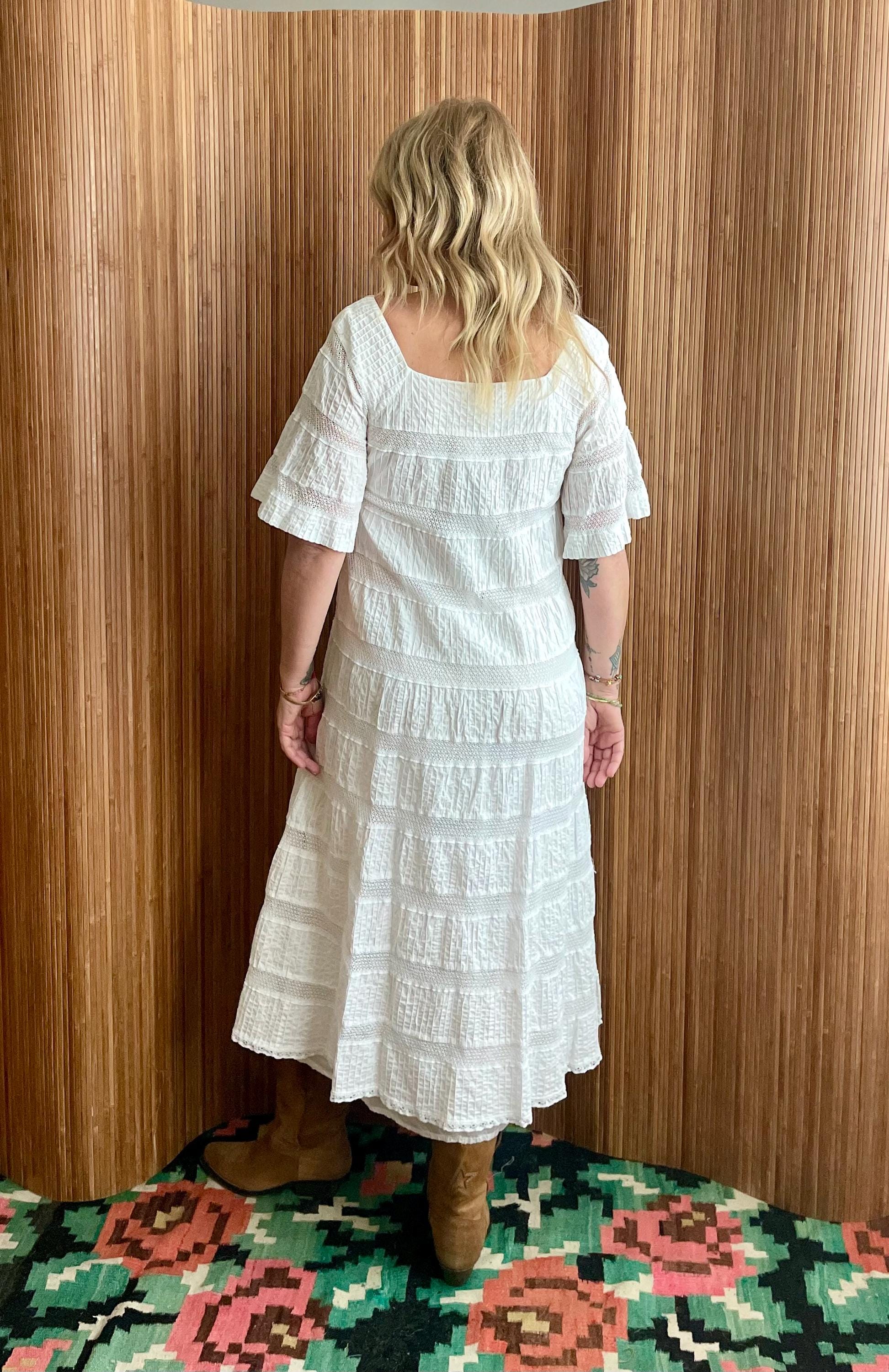 Stunning vintage Mexican white cotton midi fully lined dress dress. This dress is perfect for a bohemian wedding, festival, or any special occasion.