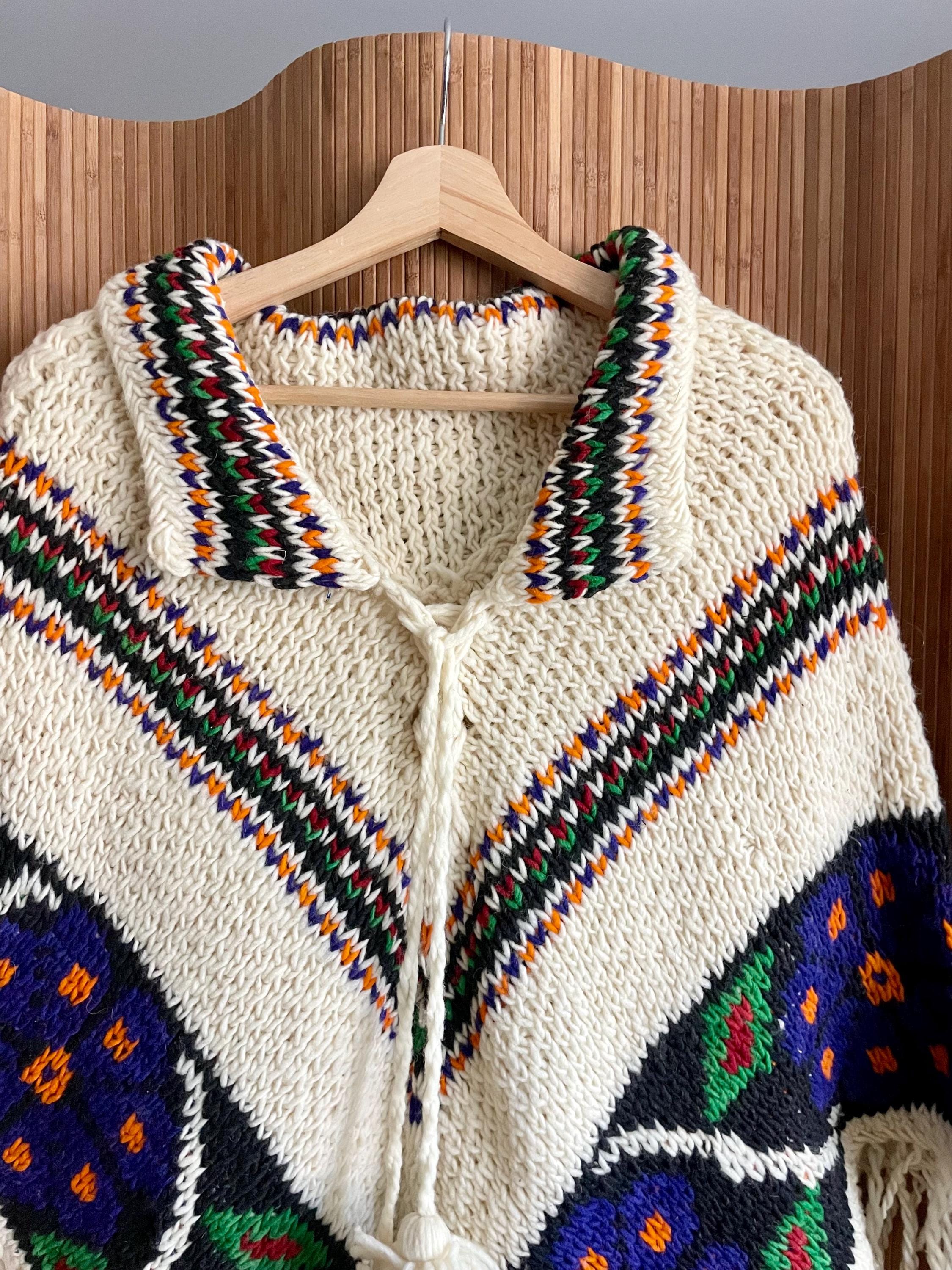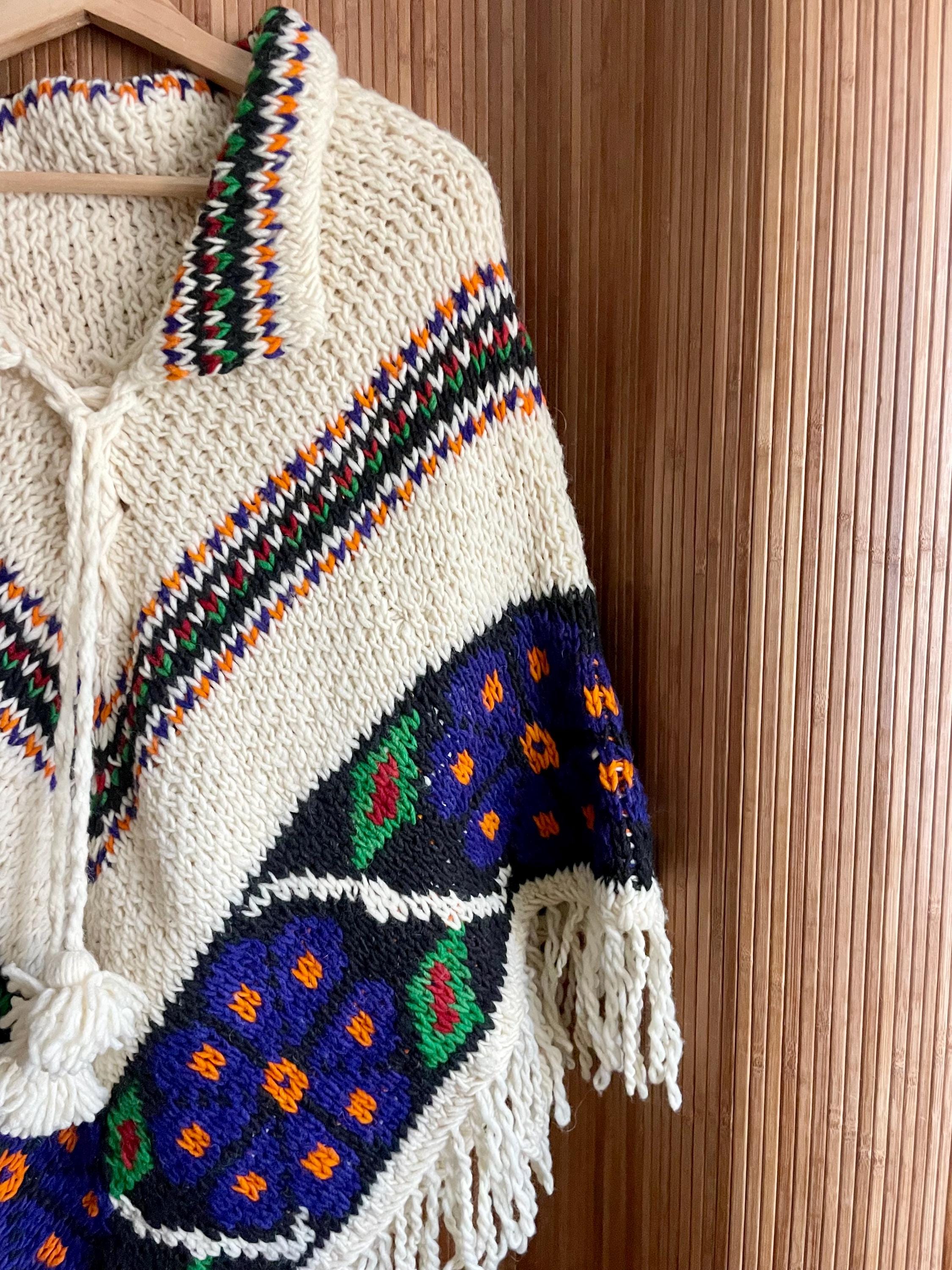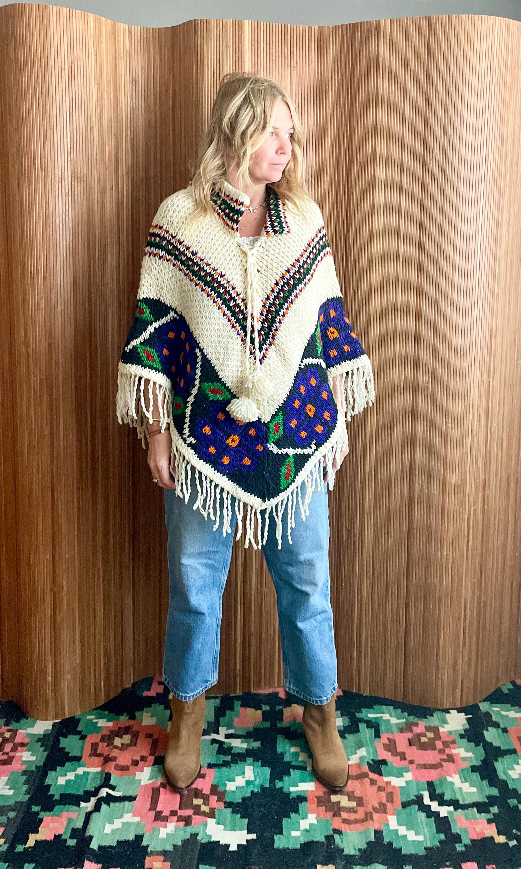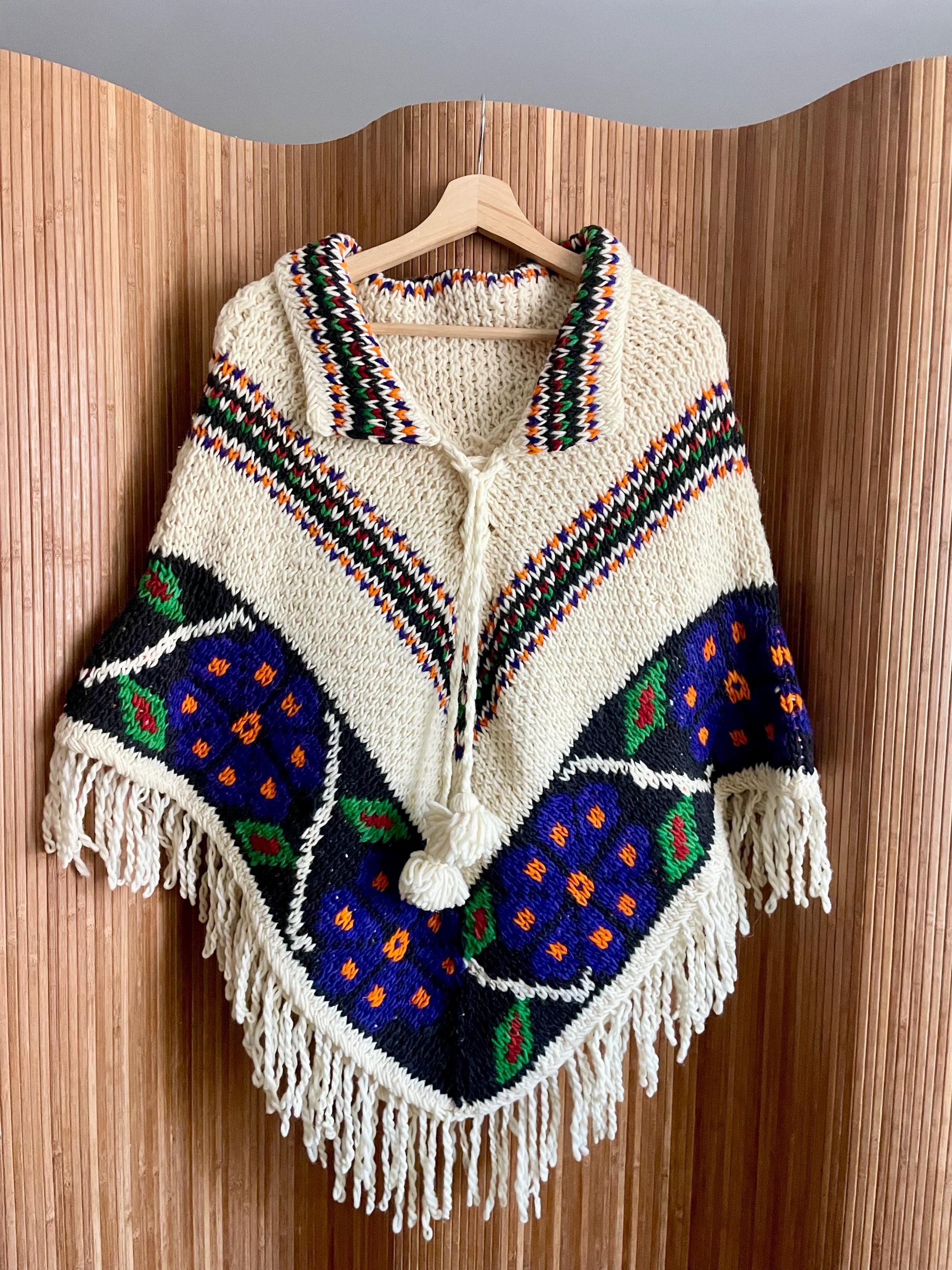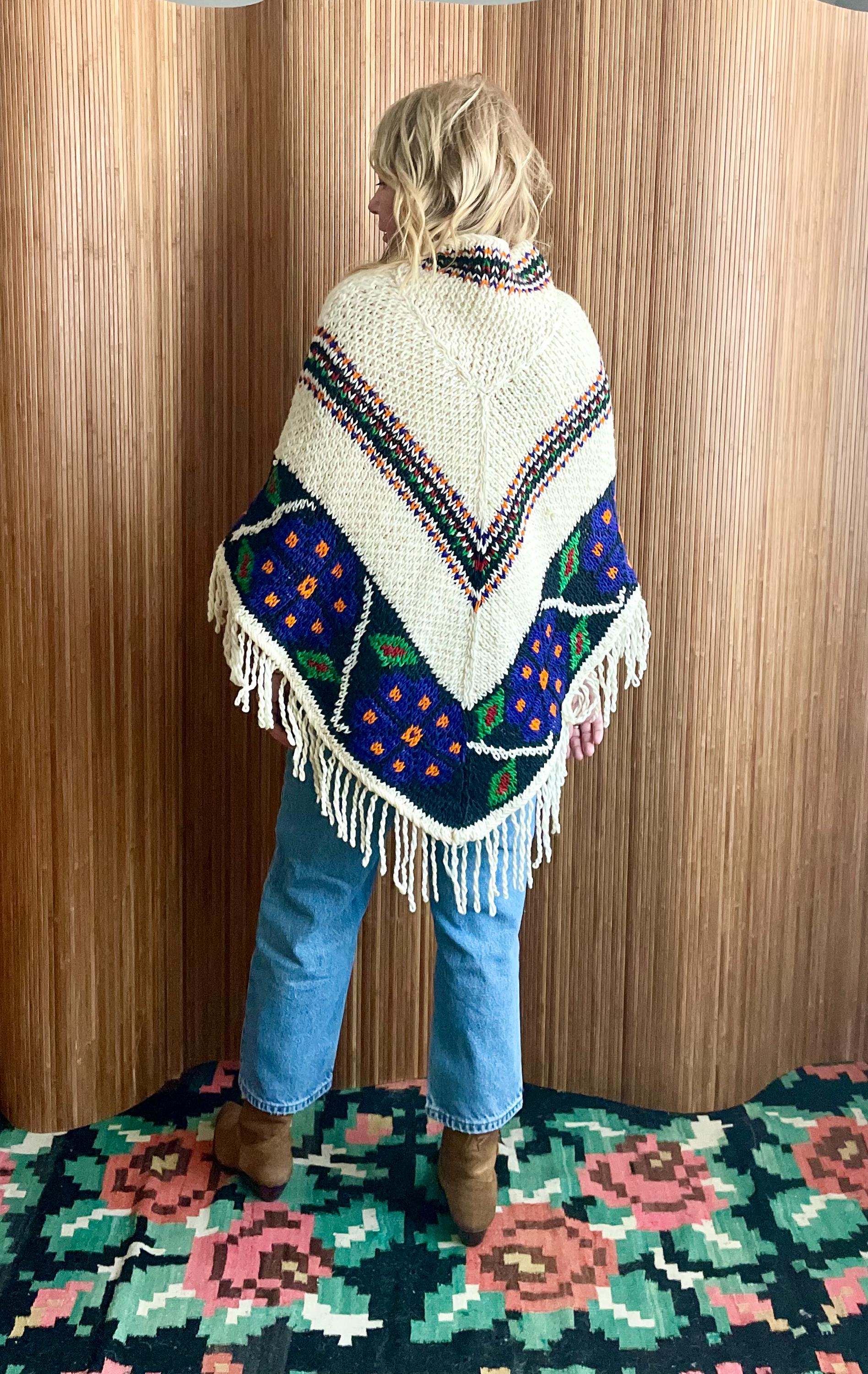 Embrace vintage charm with this stunning VTG 1960s Mexican hand-knit poncho. This unique piece features intricate knit patterns in vibrant blues, greens, and classic cream, accented by playful fringe detailing. Perfect for adding a touch of bohemian flair to any outfit, this free-size poncho drapes beautifully and offers both style and warmth.