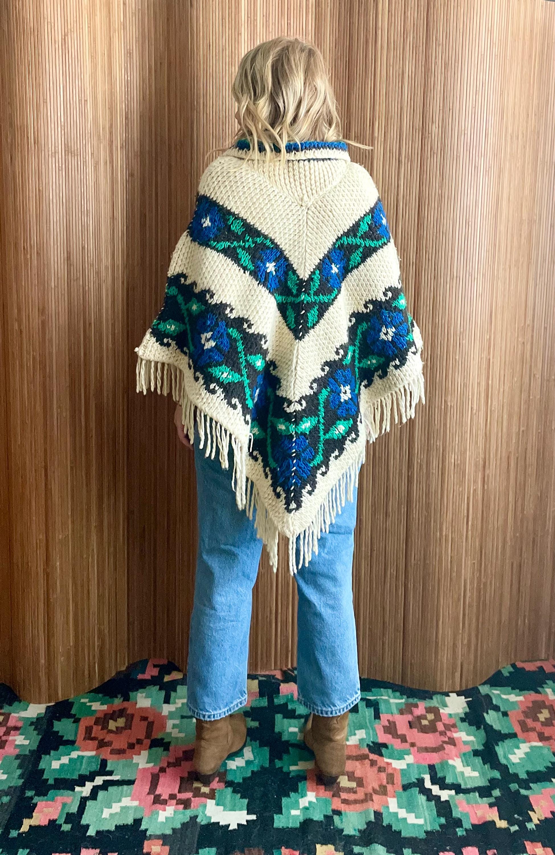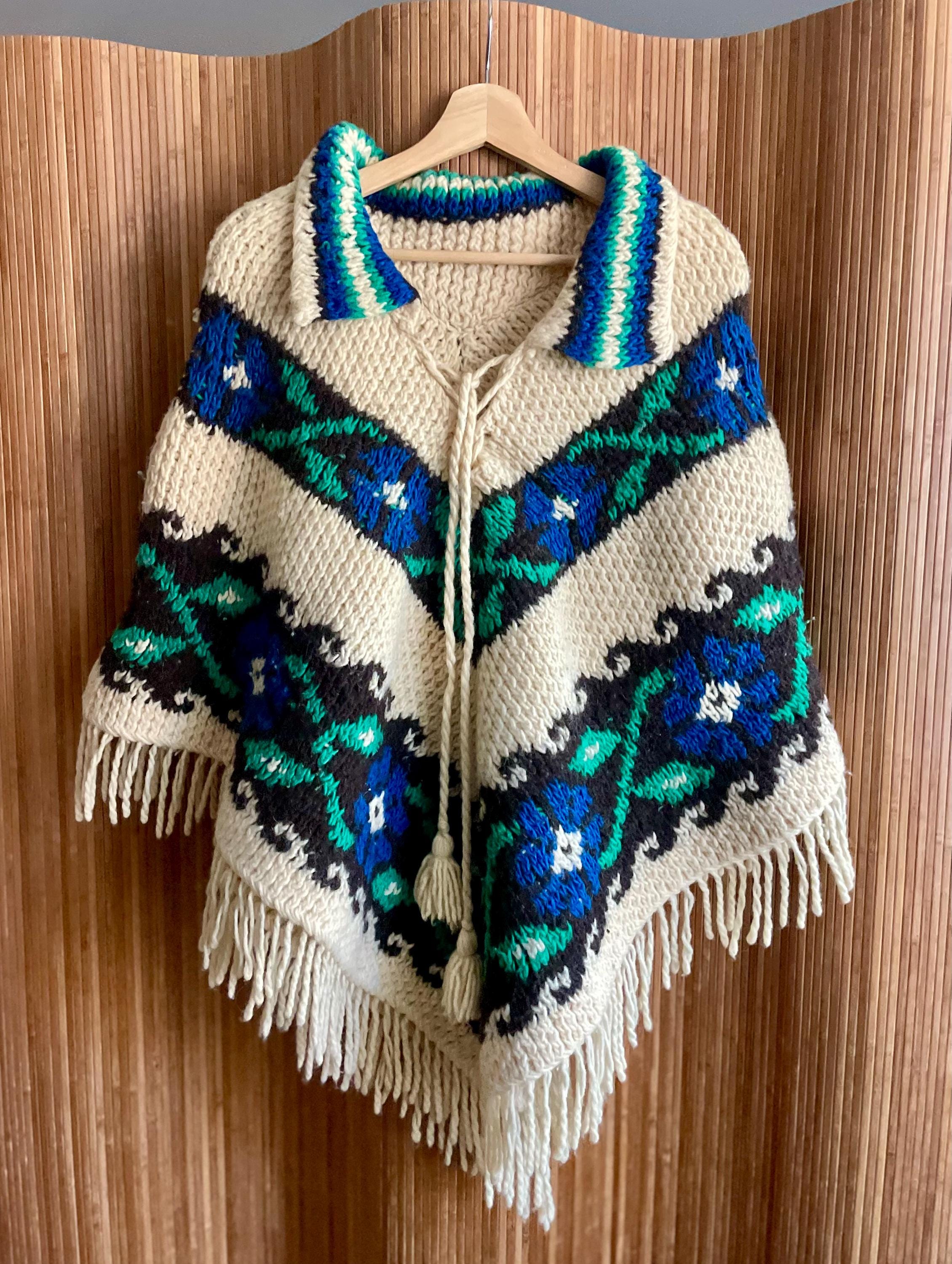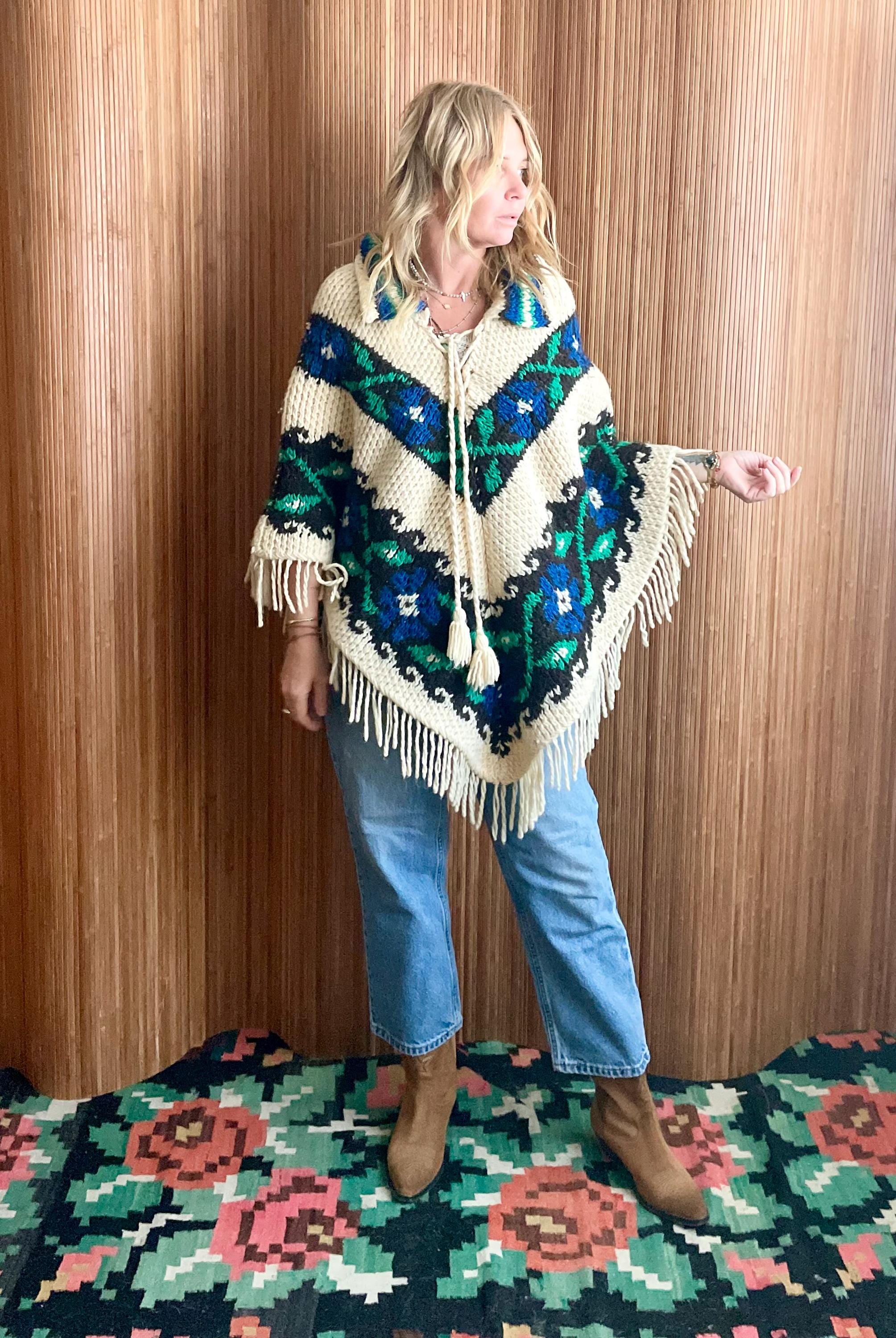 Embrace vintage charm with this stunning VTG 1960s Mexican hand-knit poncho. This unique piece features intricate knit patterns in vibrant blues, greens, and classic cream, accented by playful fringe detailing. Perfect for adding a touch of bohemian flair to any outfit, this free-size poncho drapes beautifully and offers both style and warmth.