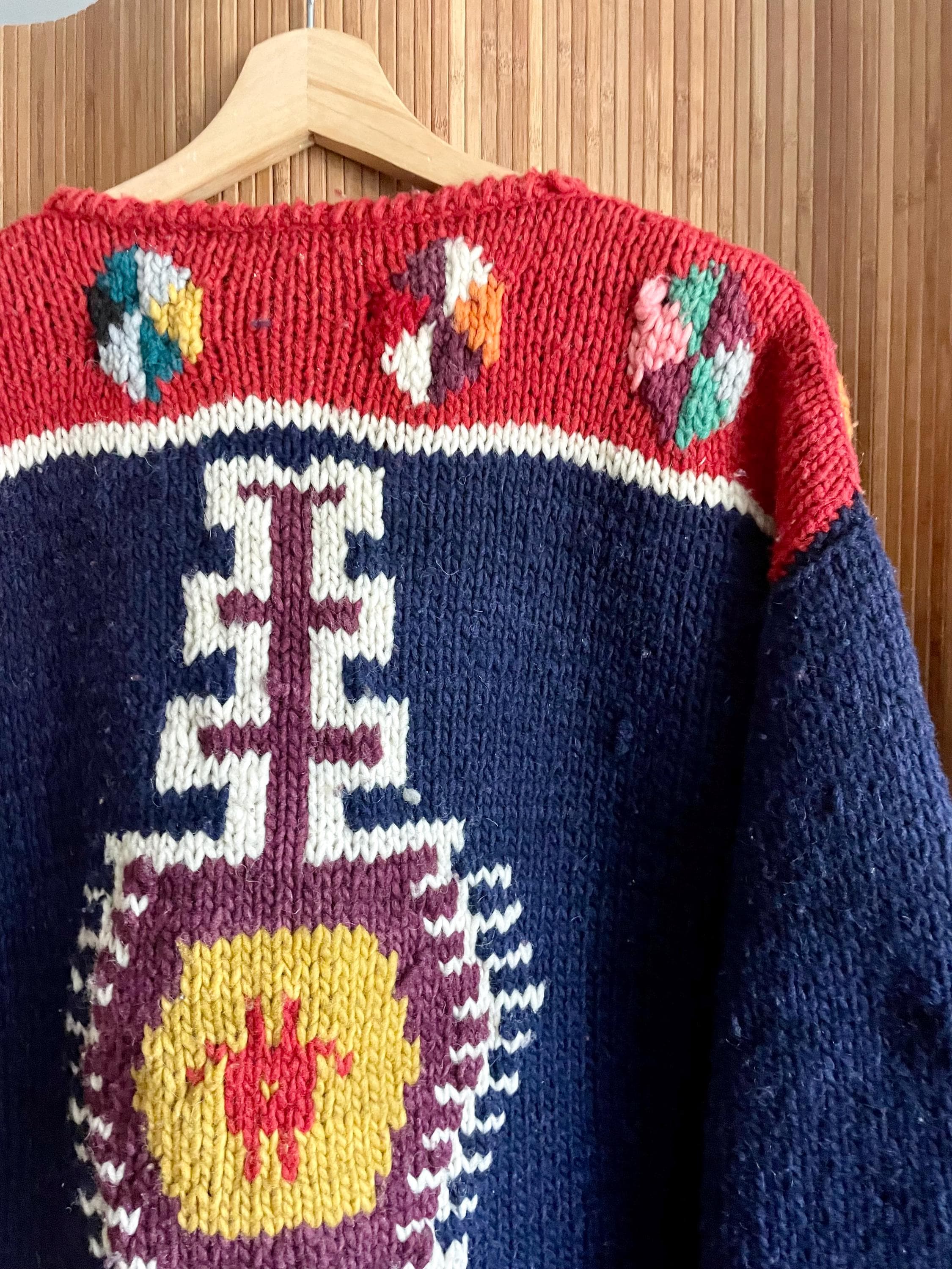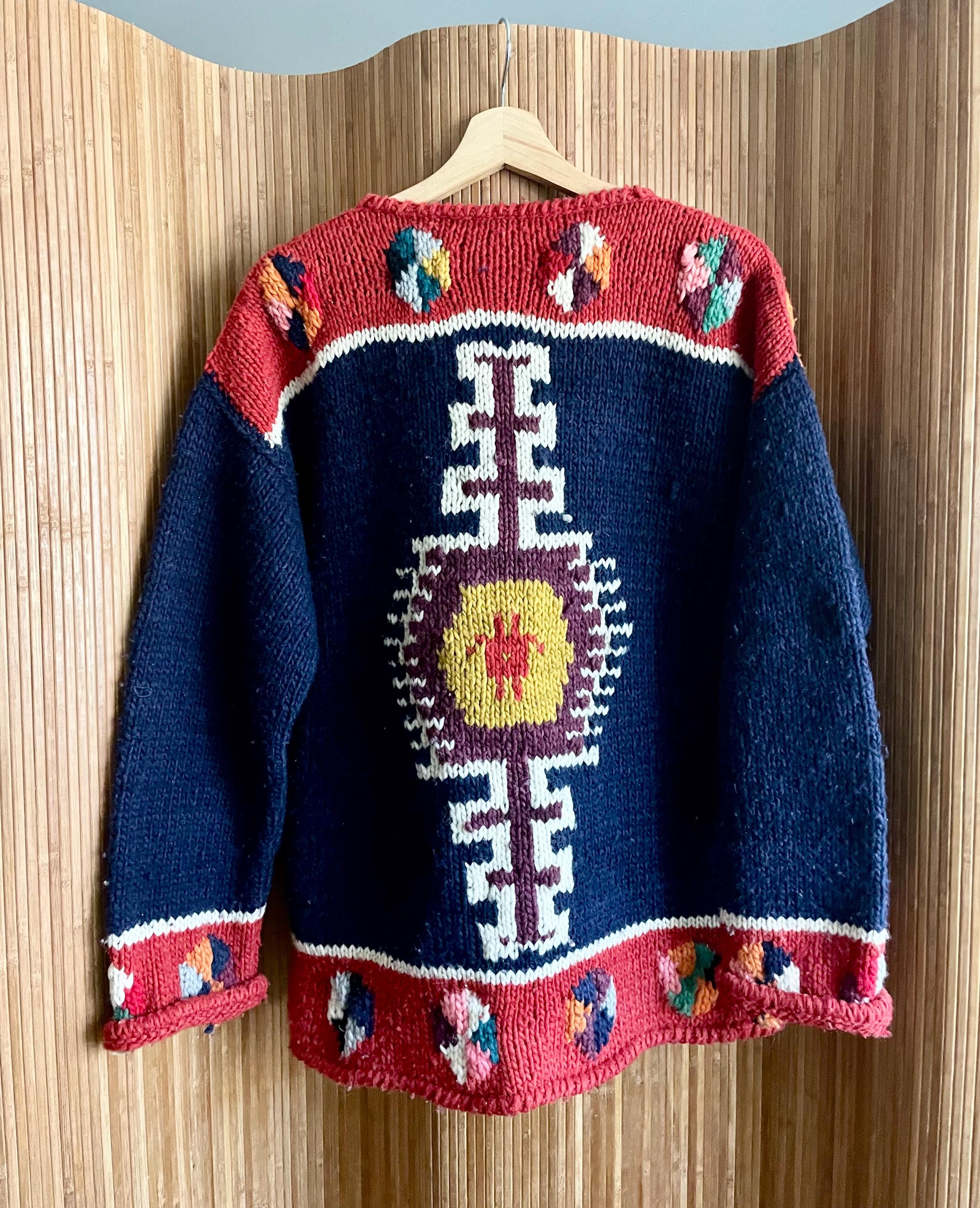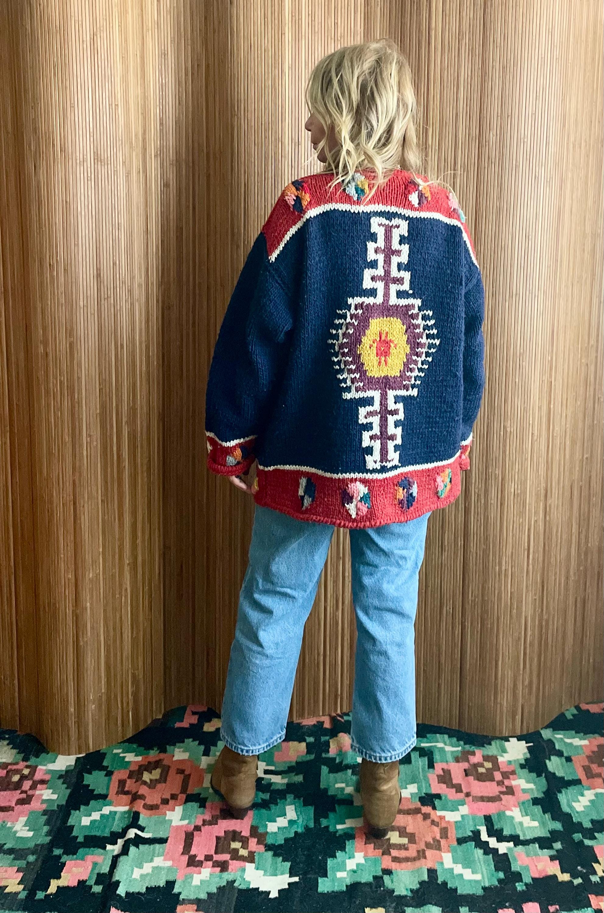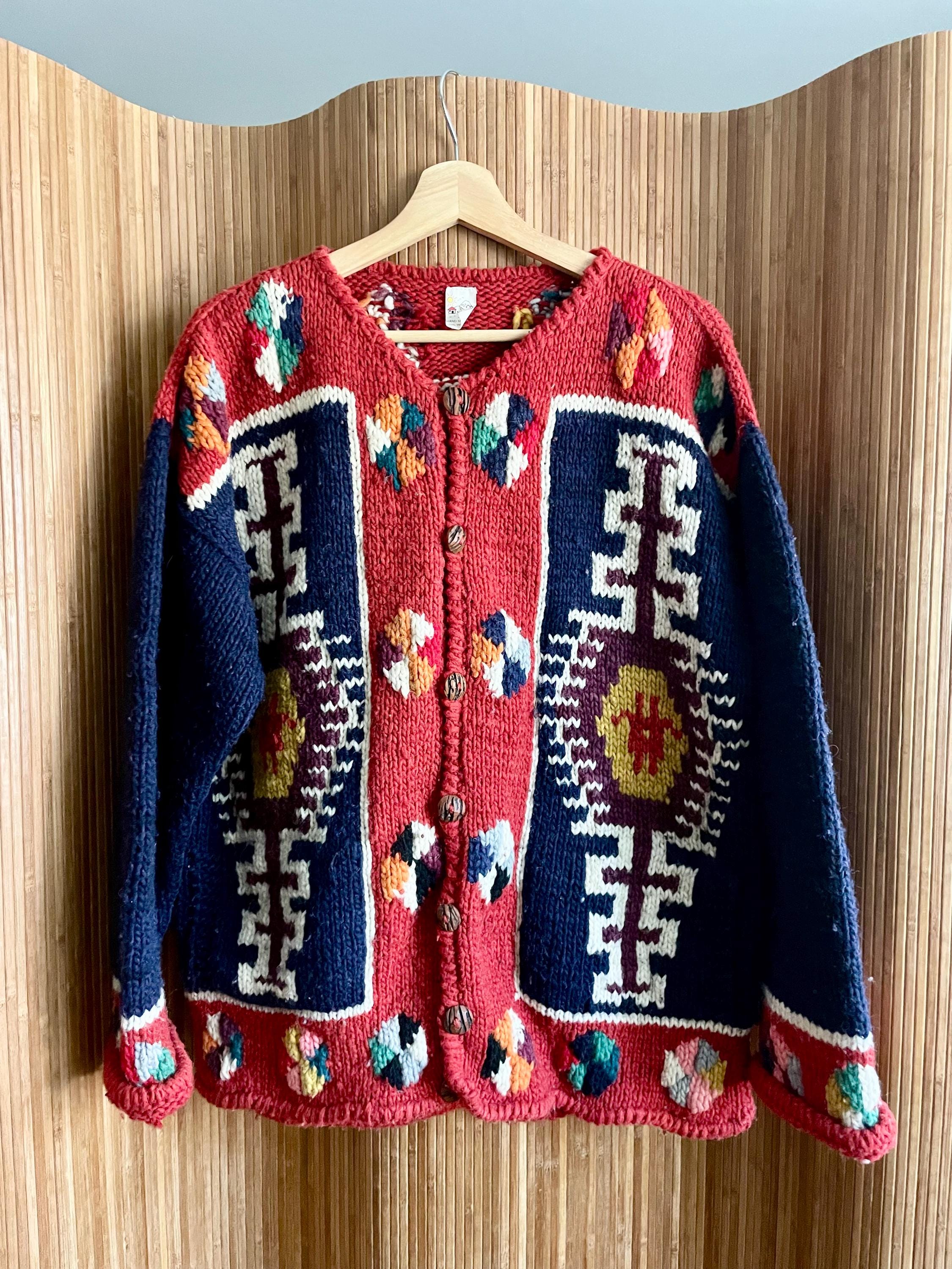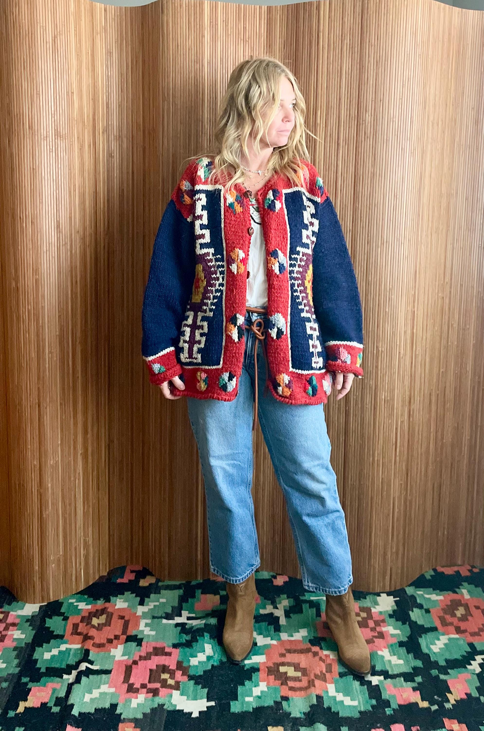 Make a statement with this striking VTG ethnic wool cardigan. This unique piece features a bold geometric pattern in a vibrant color palette, perfect for adding a pop of personality to any outfit. With a relaxed, free-size fit, this cardigan is comfortable and versatile, making it a standout piece in any vintage collection.