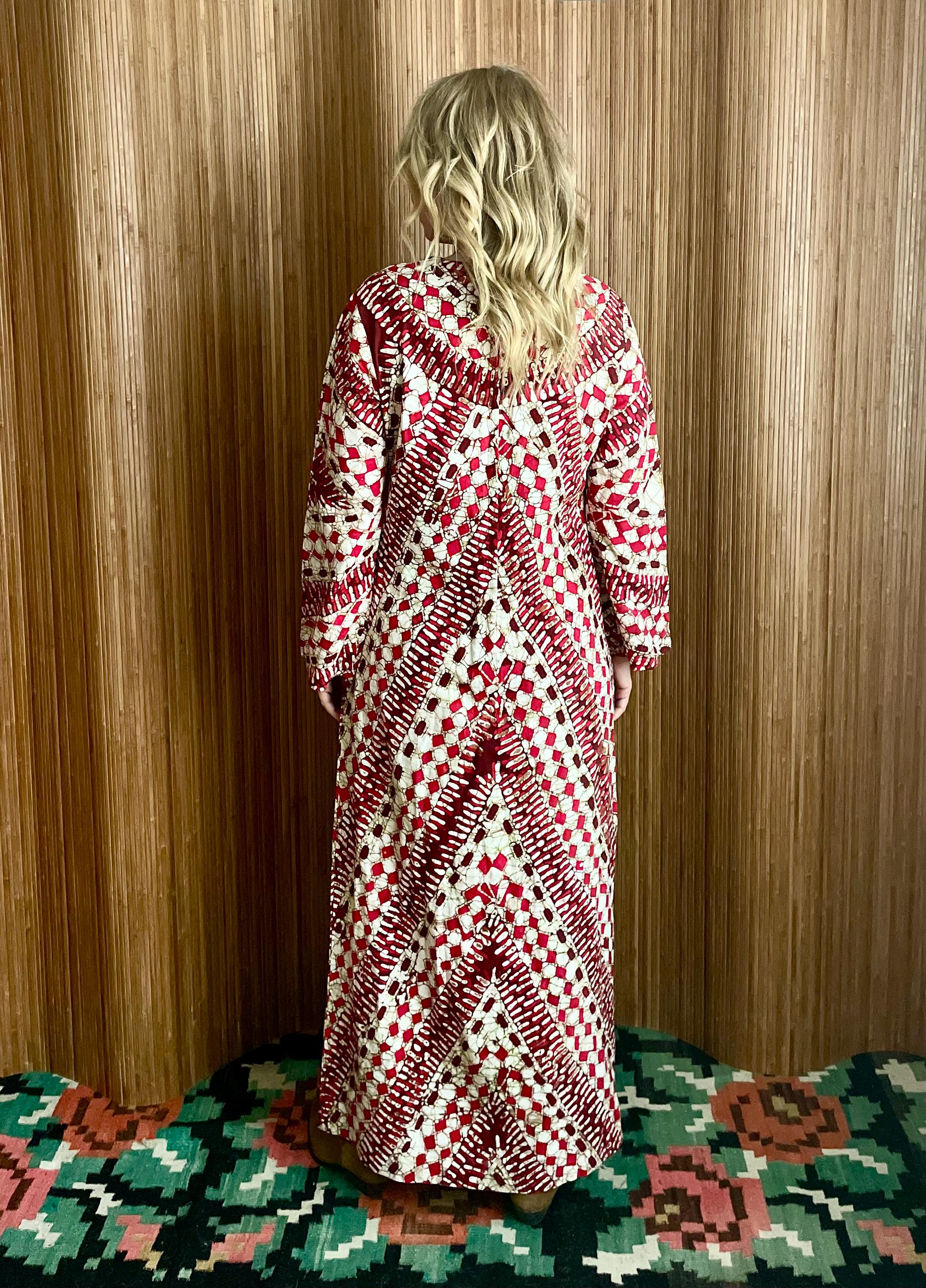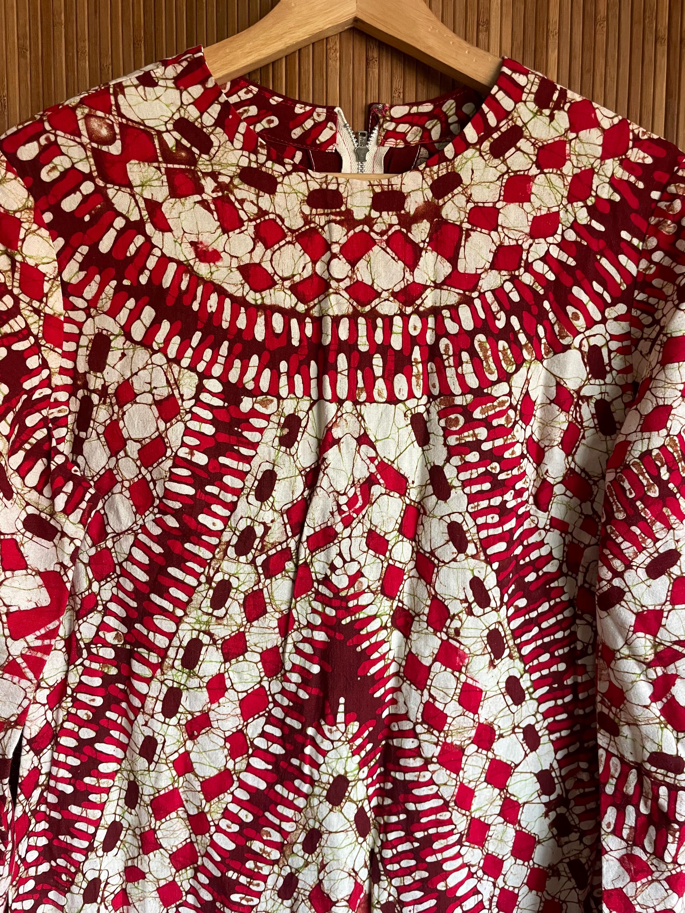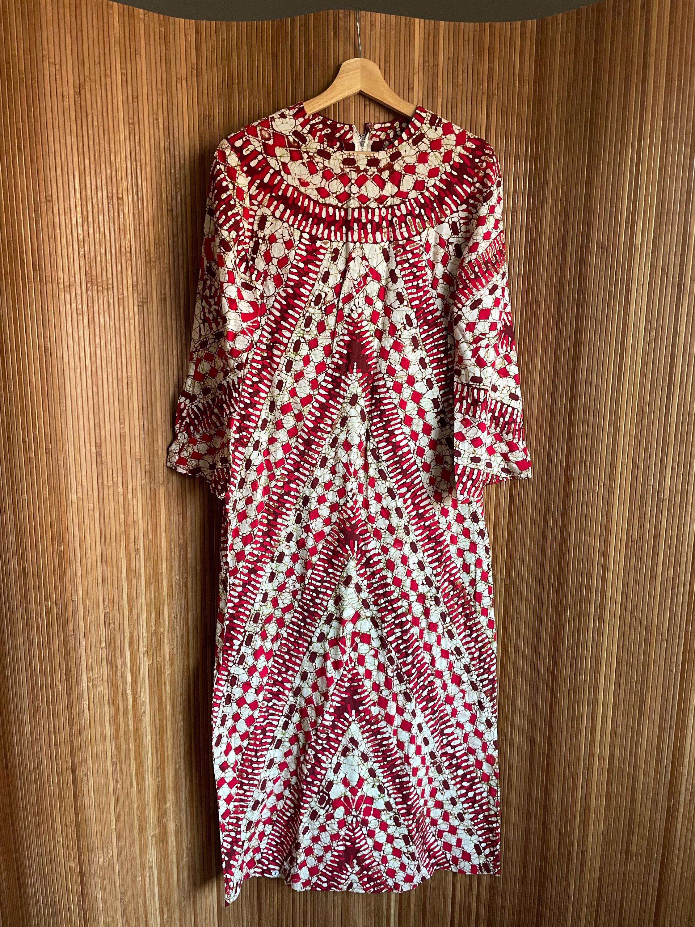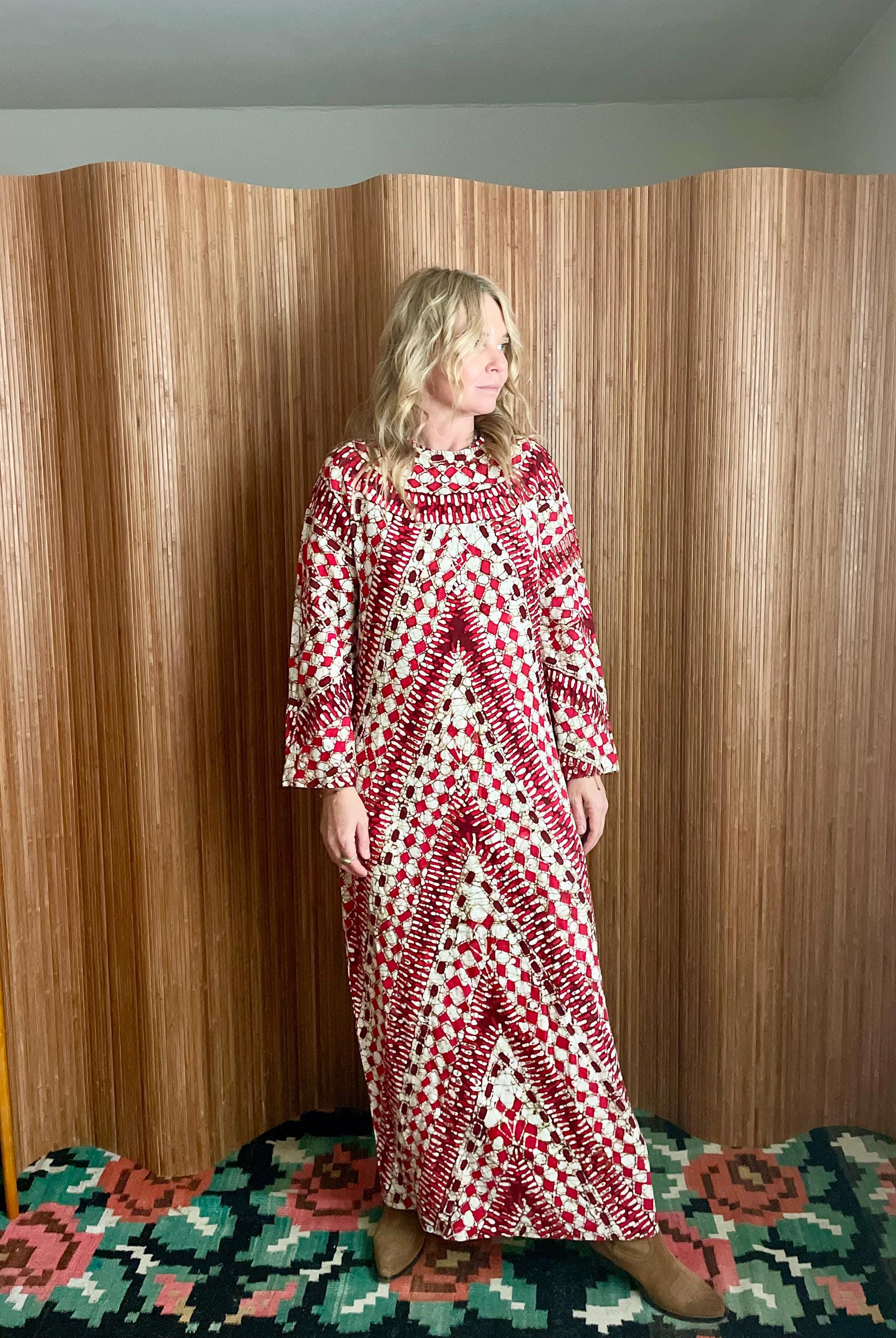 Stunning vintage 70s cotton maxi dress featuring an intricate red and white batik print. This bohemian beauty is perfect for making a statement!