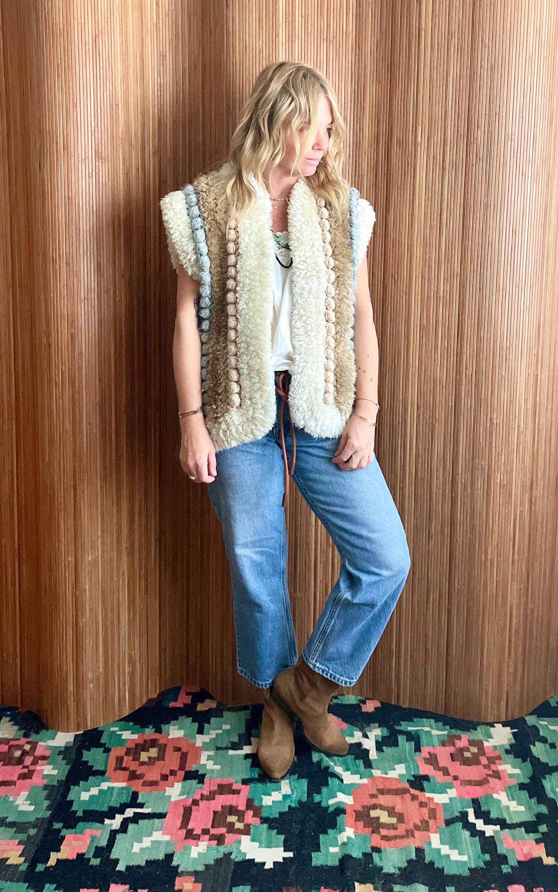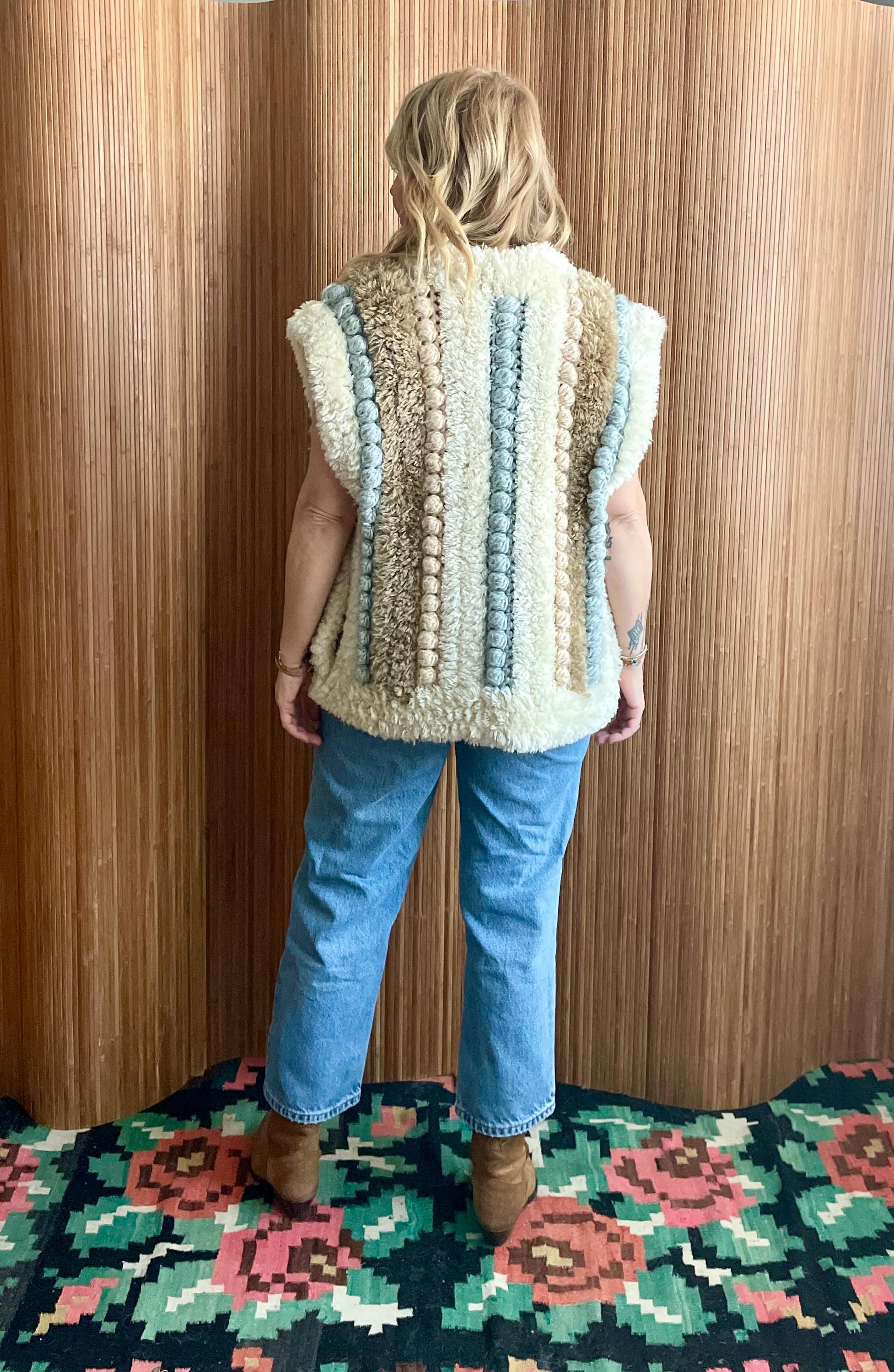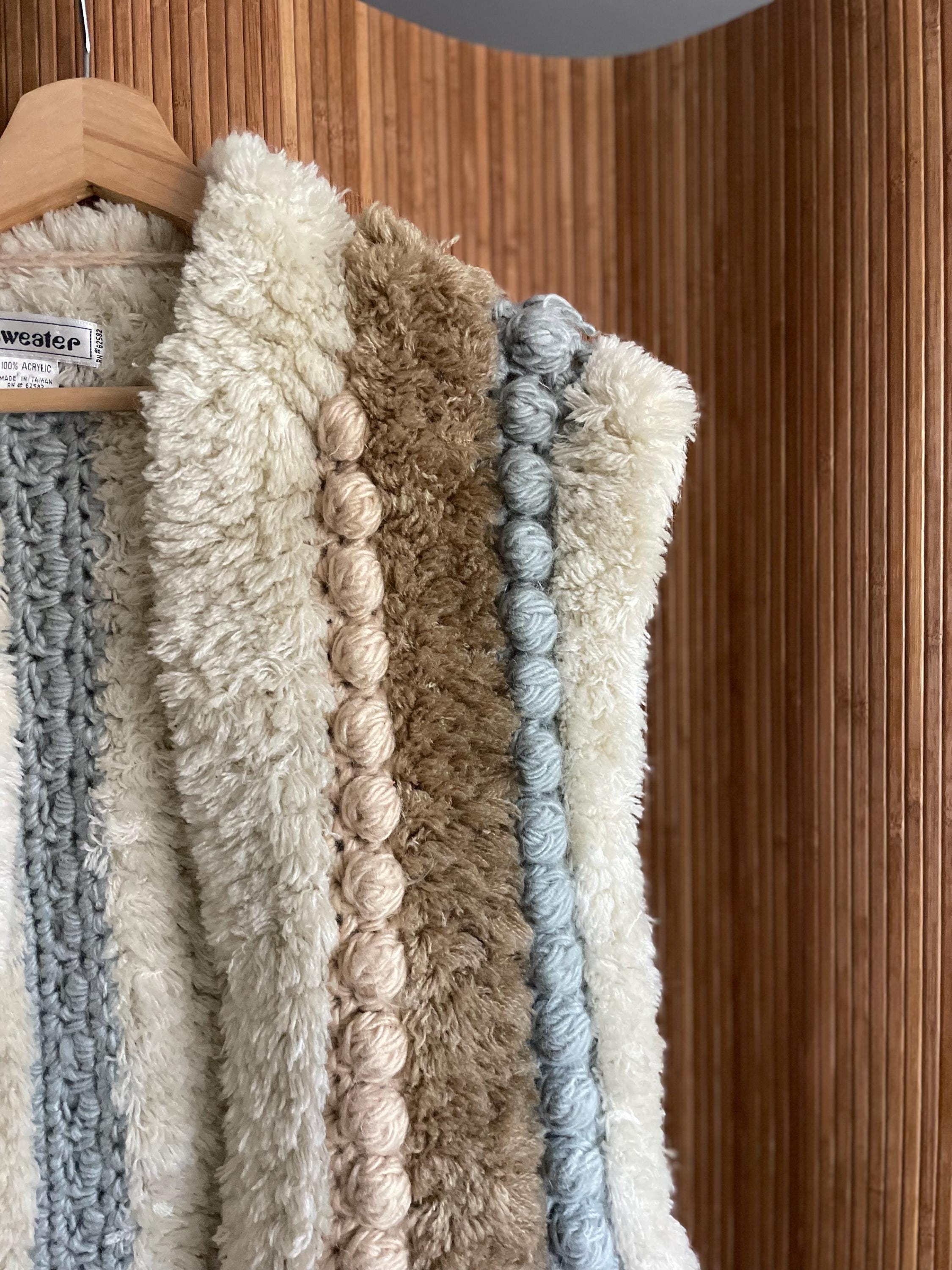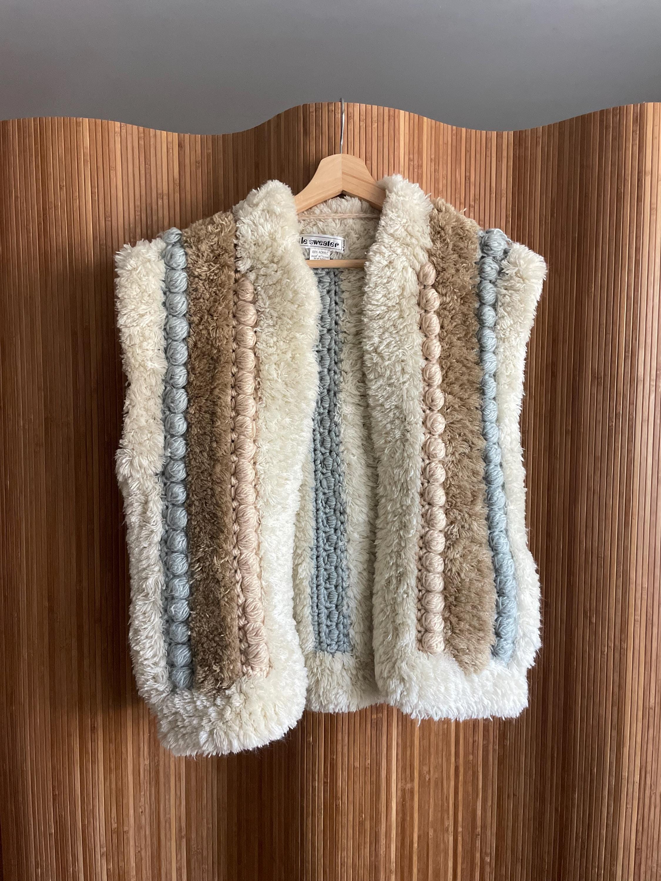 Embrace retro style with this vintage 70s chunky knit bubble vest! This unique sleeveless sweater features a textured bubble knit design in neutral tones, perfect for adding a boho or hippie touch to your wardrobe.