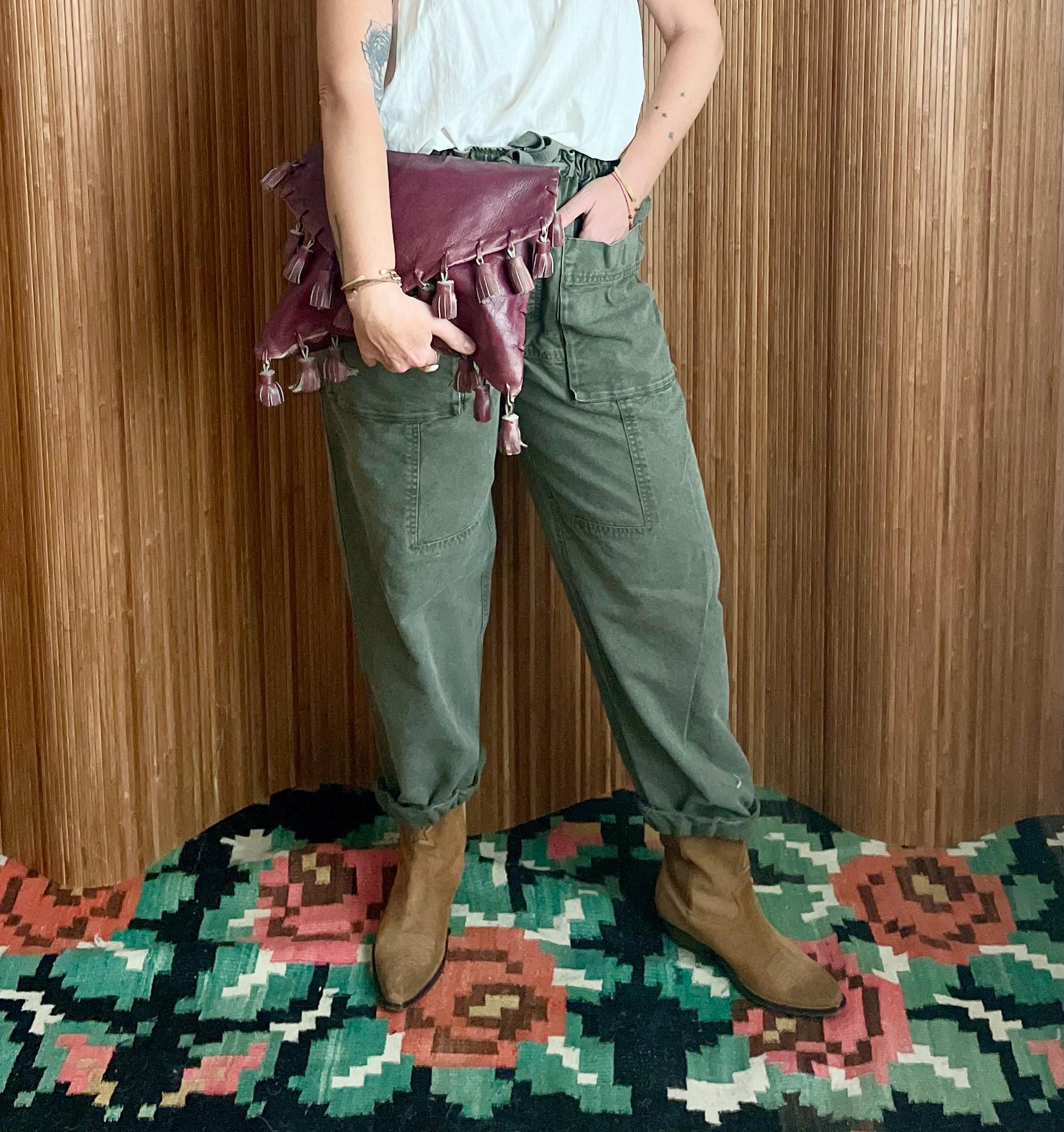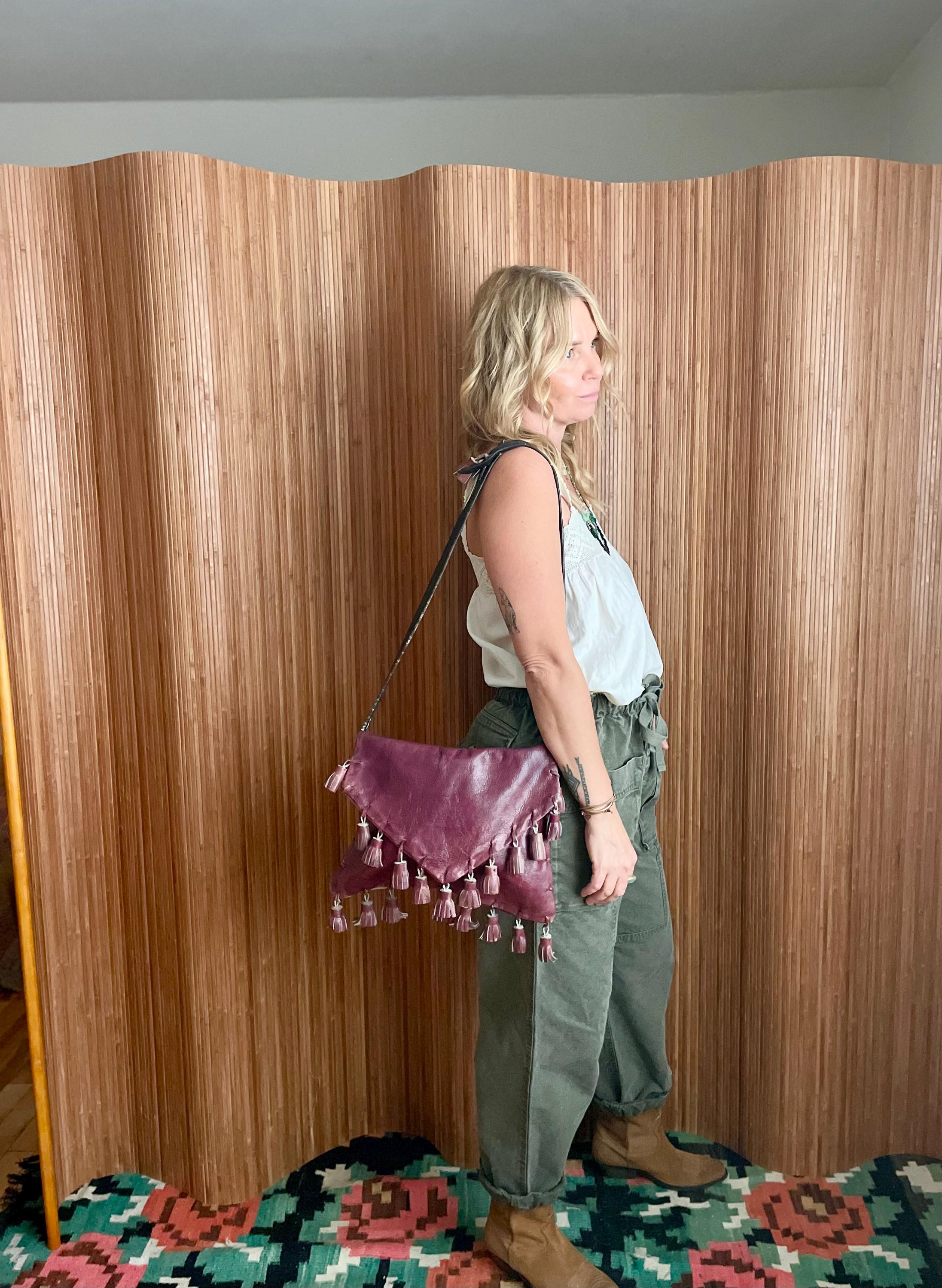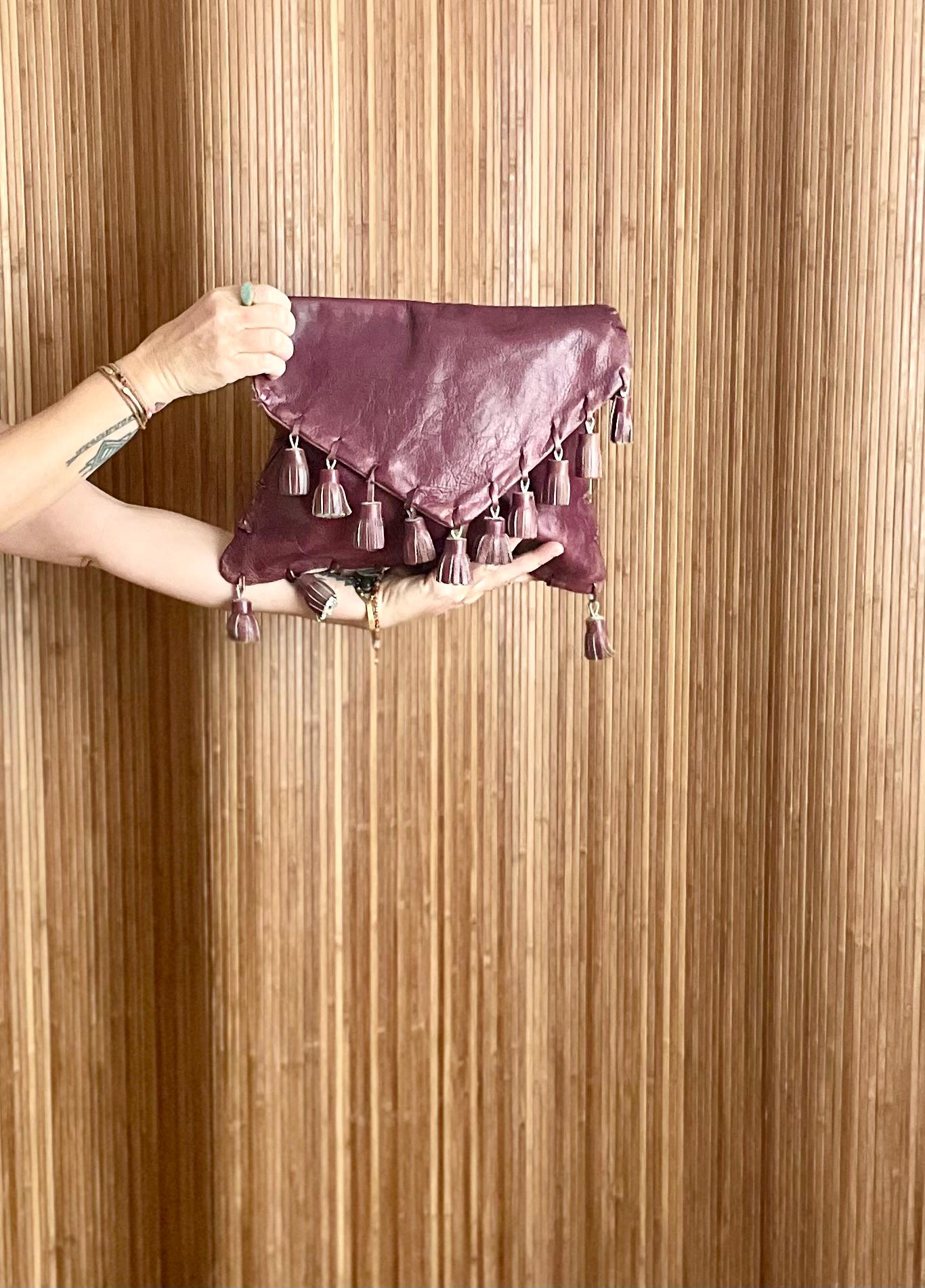 Add a touch of vintage charm to your ensemble with this unique leather tassel bag. This convertible bag can be worn as a clutch or crossbody, offering versatility and style. Crafted from supple leather with eye-catching tassel details, it's perfect for the free-spirited individual.