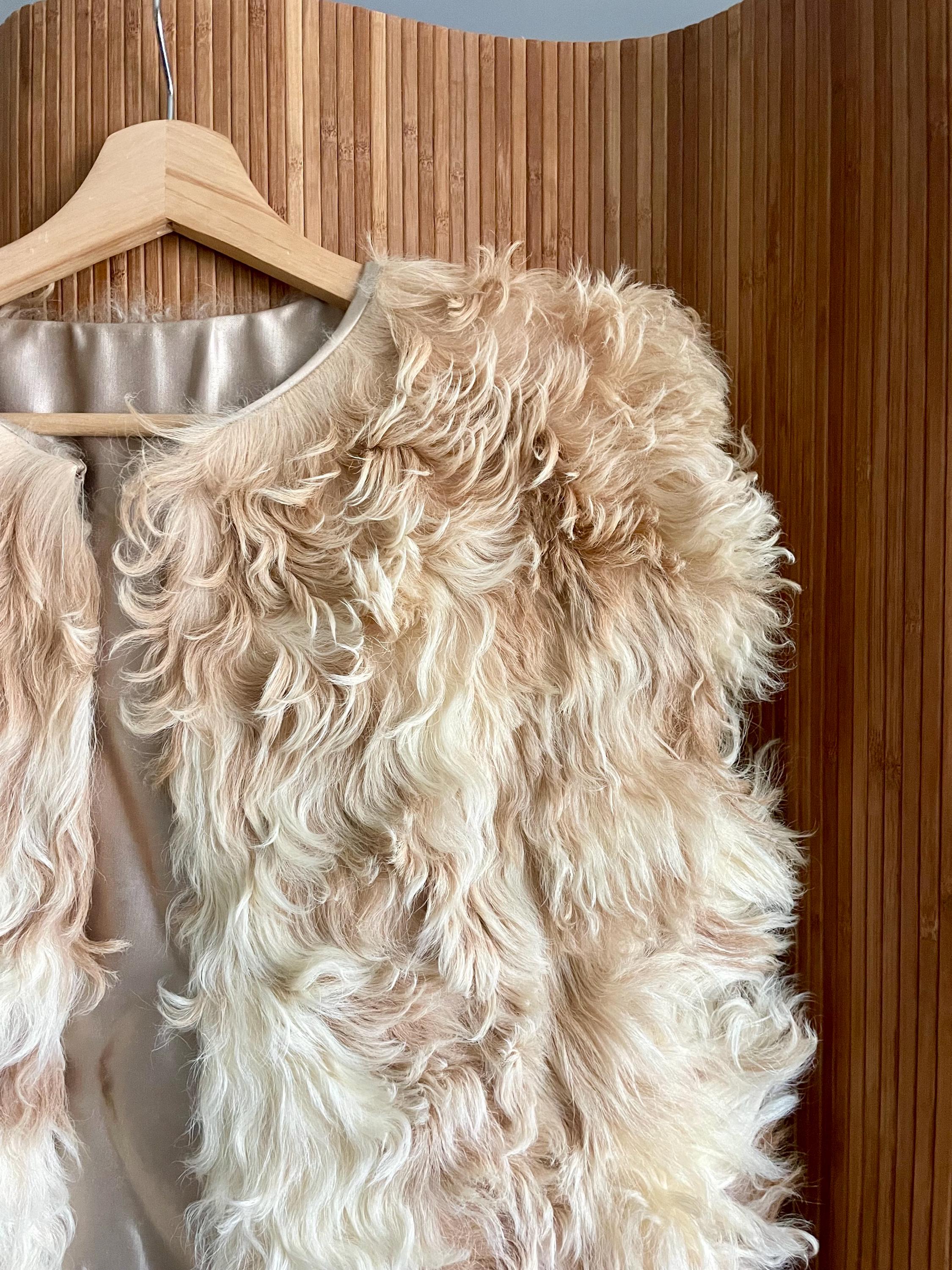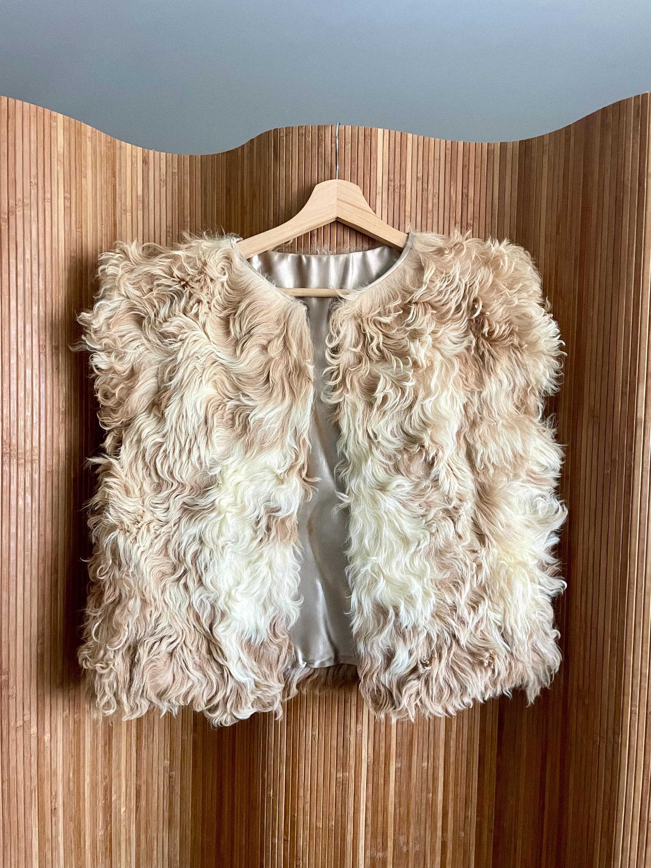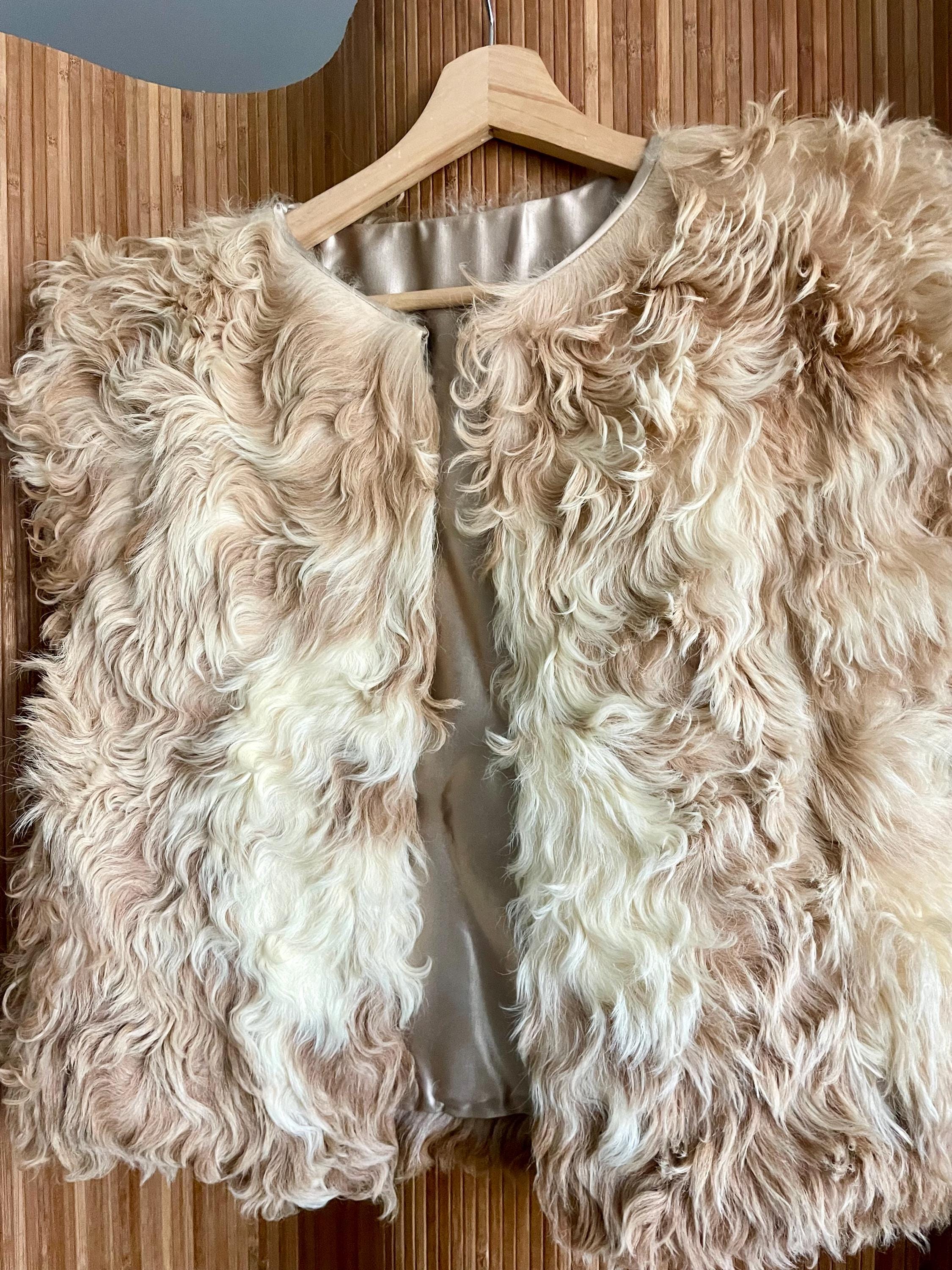 Add a touch of unique bohemian style to your wardrobe with this vintage Tibetan fur vest. This eye-catching piece is perfect for layering and creating a statement look.