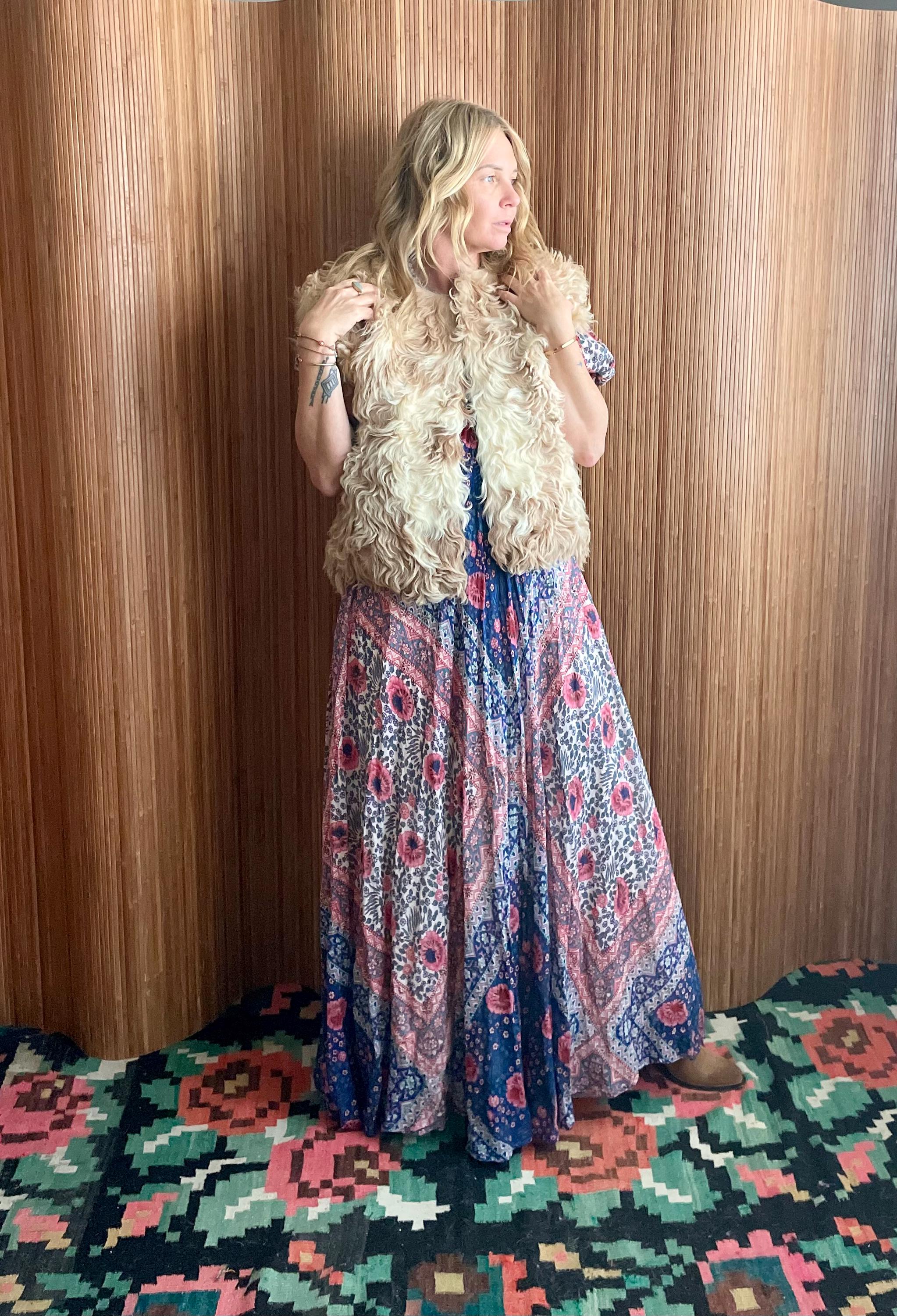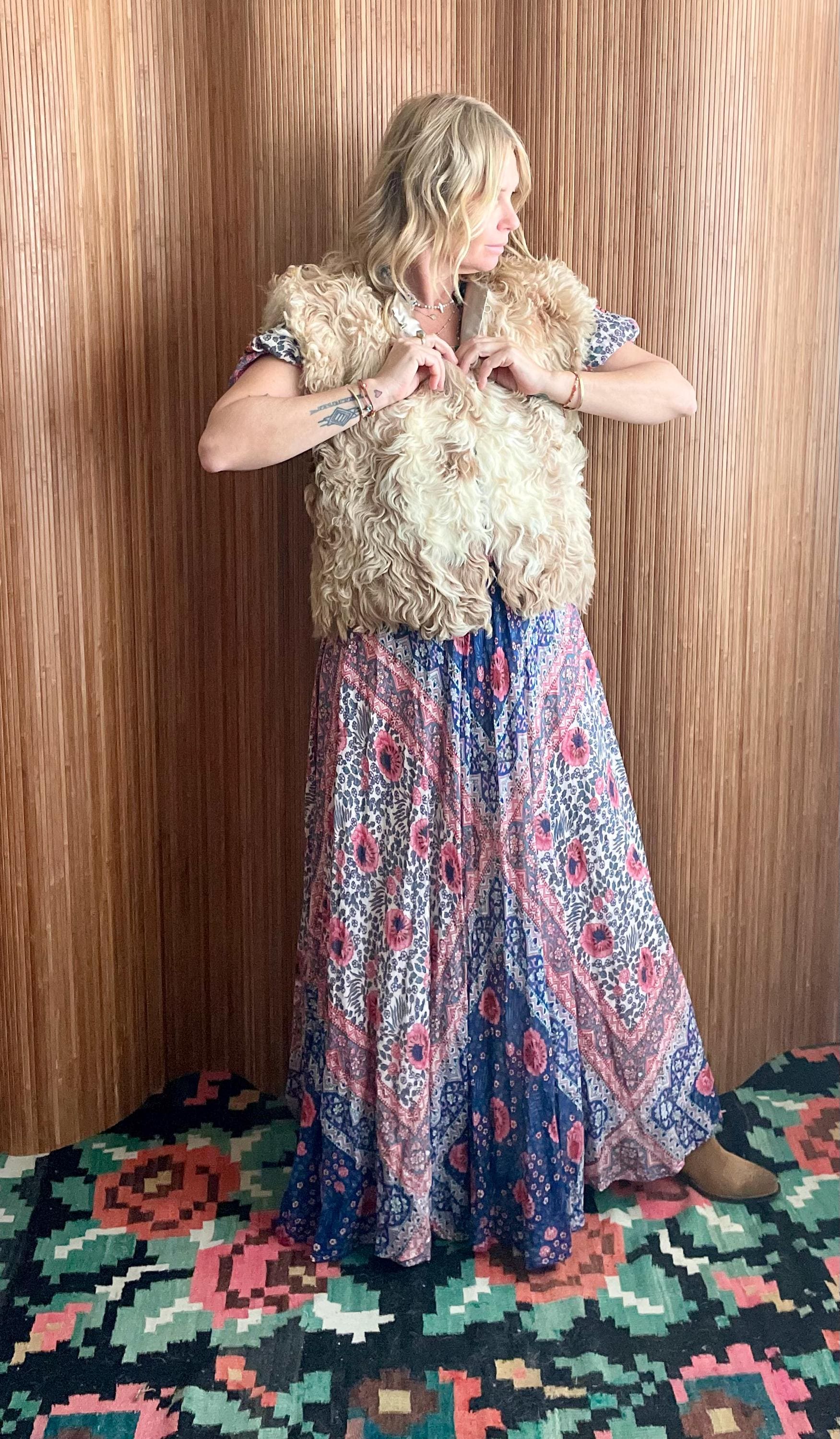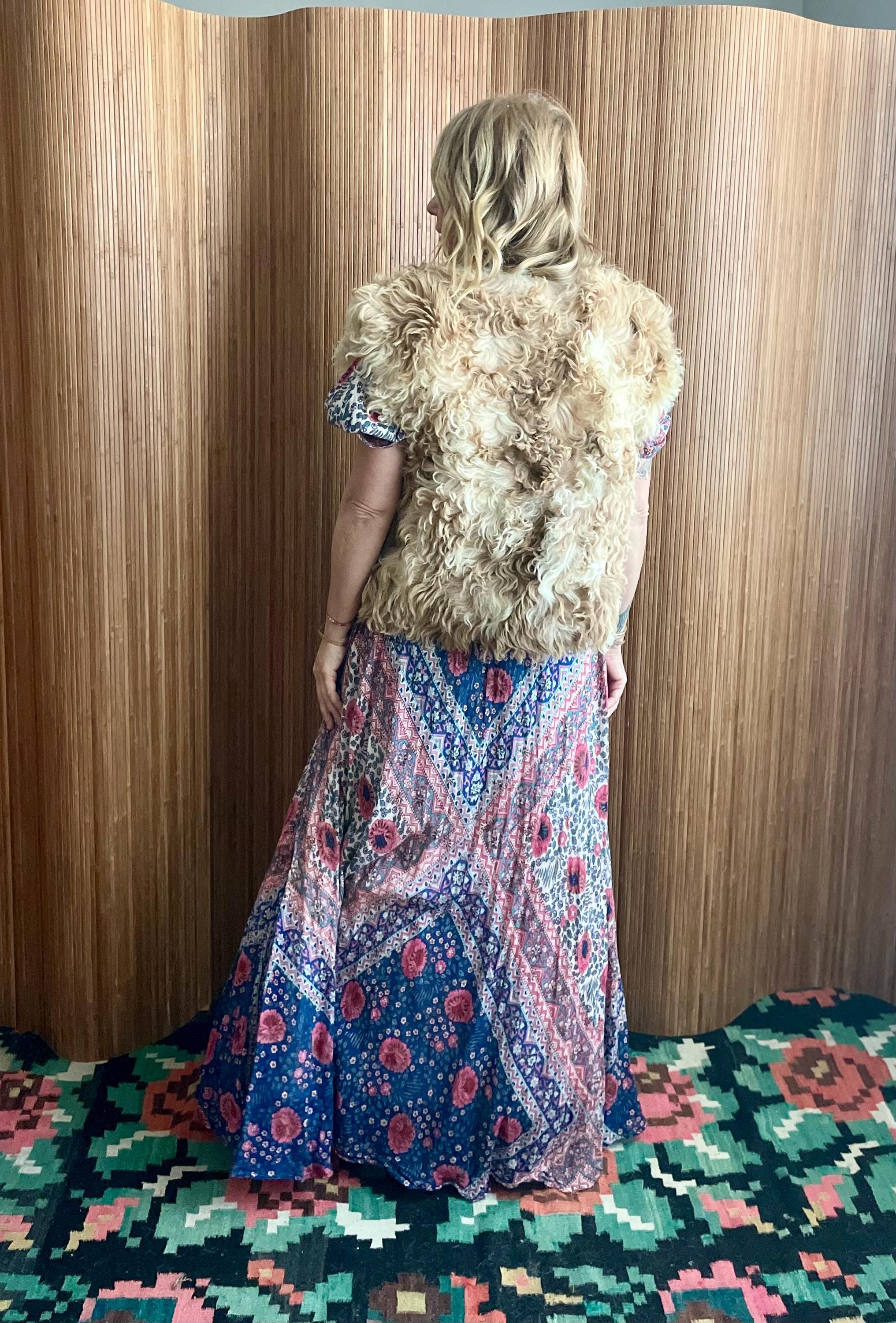 Add a touch of unique bohemian style to your wardrobe with this vintage Tibetan fur vest. This eye-catching piece is perfect for layering and creating a statement look.