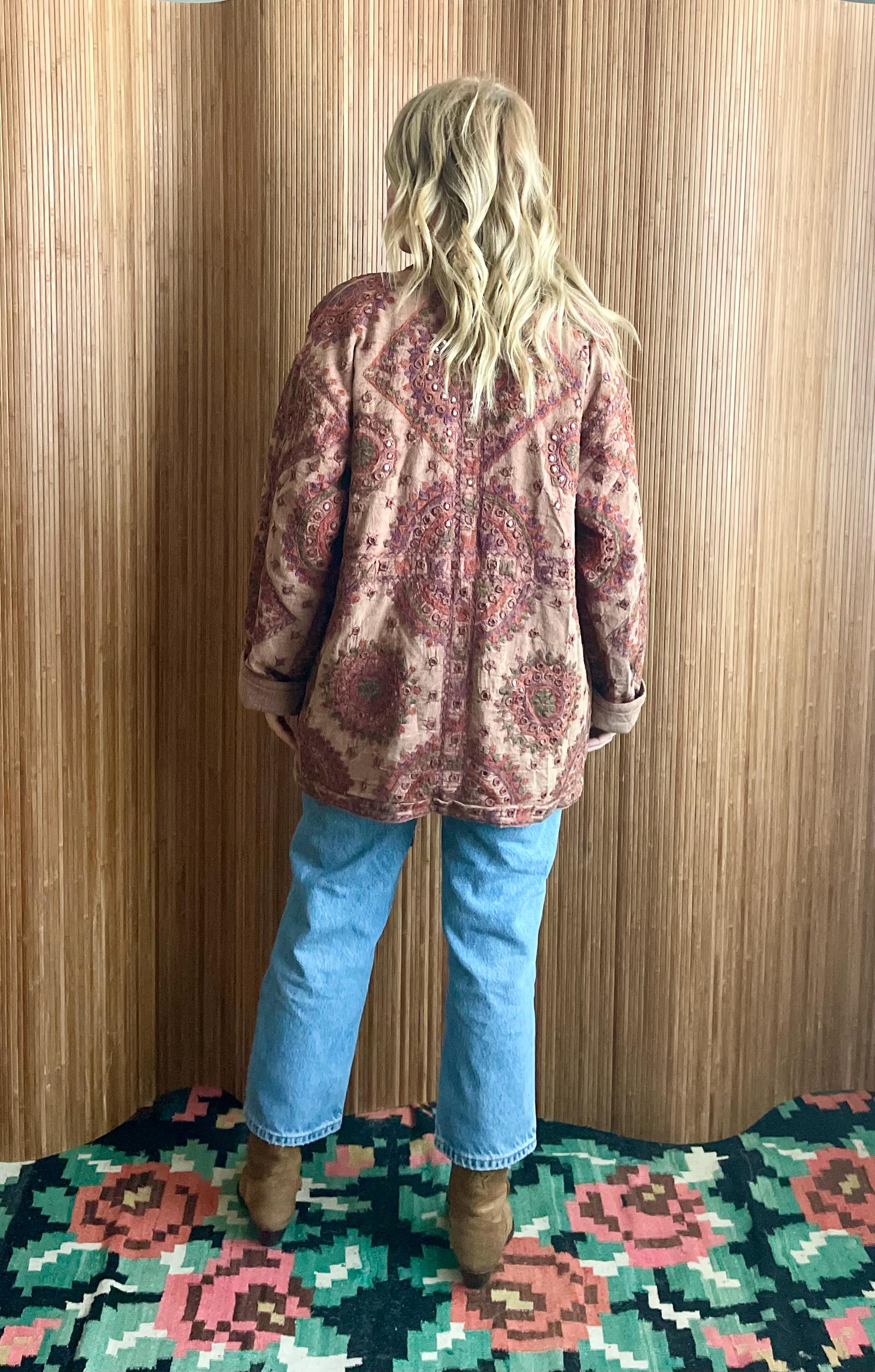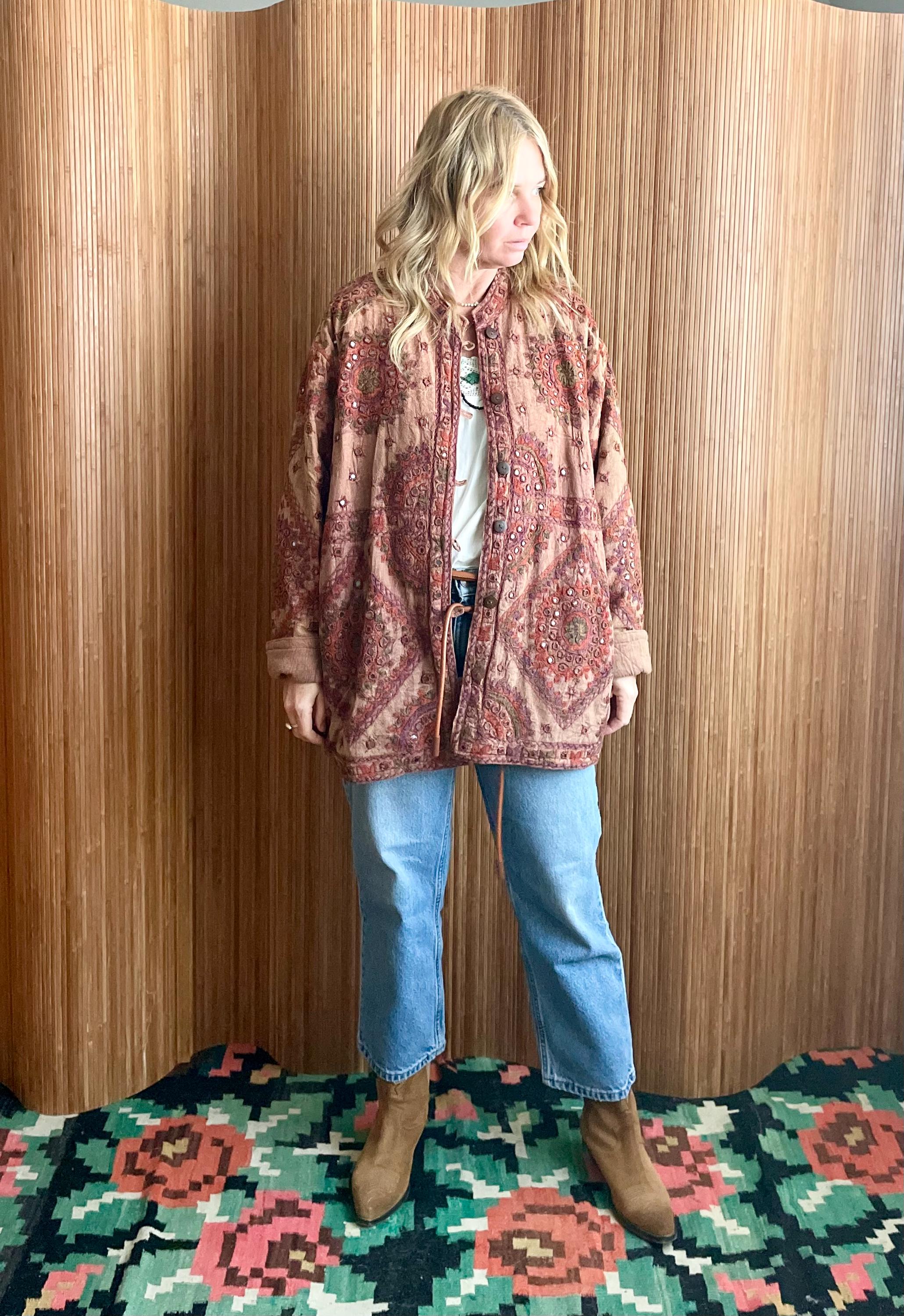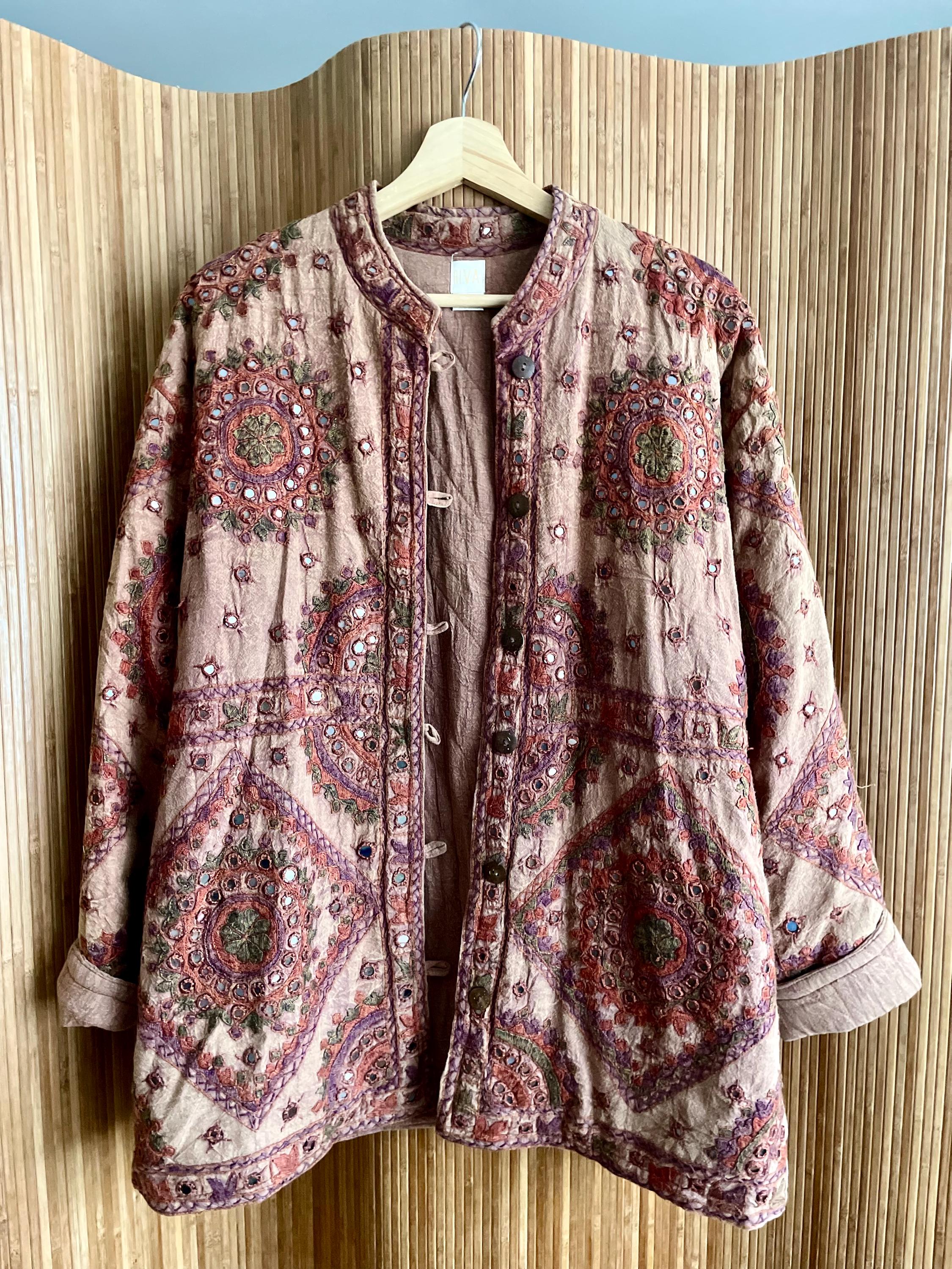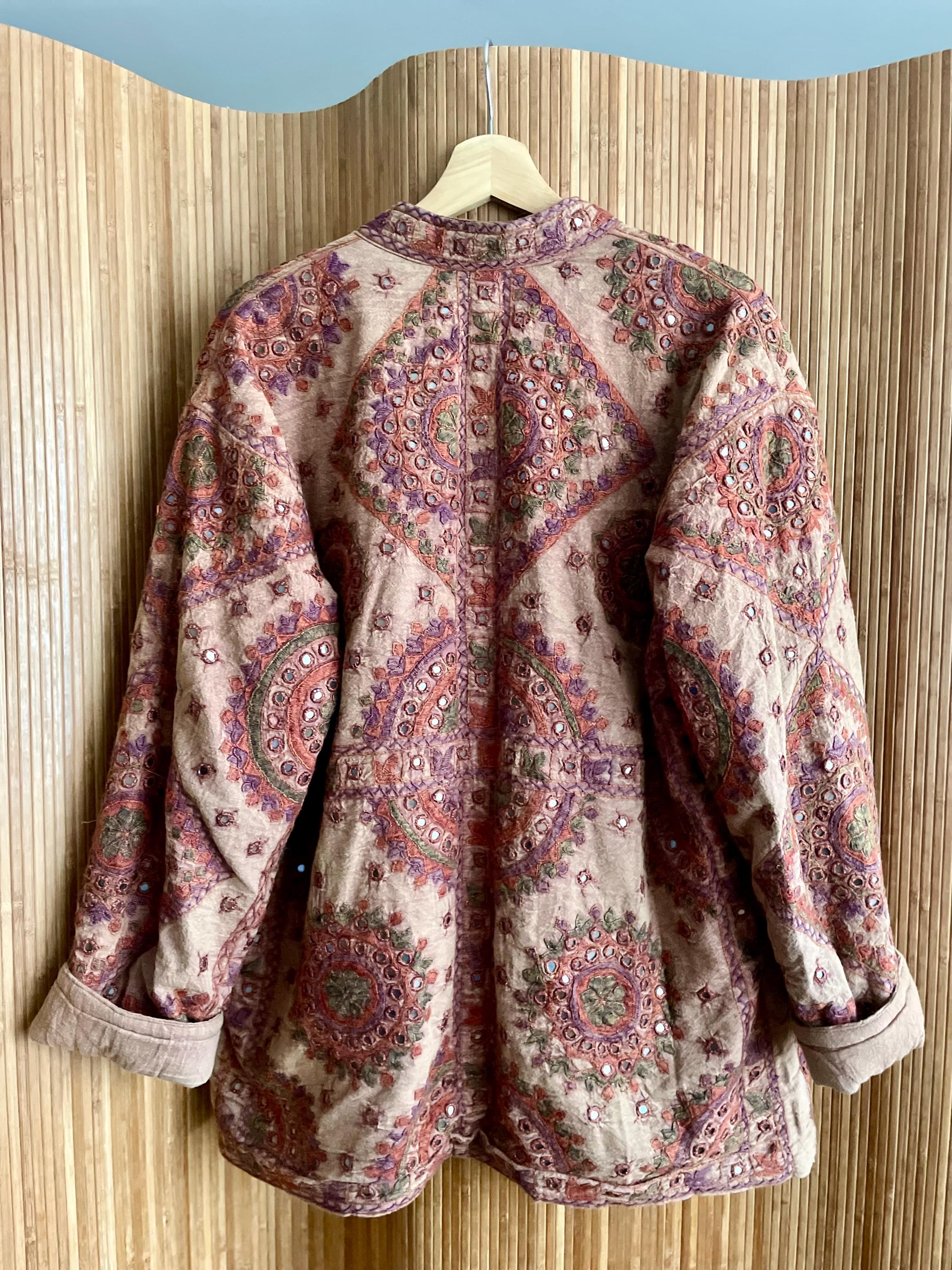 This stunning vintage embroidered jacket is a wearable piece of folk art. Hand-embroidered in rich earthy tones with traditional mirror work and floral mandala motifs, this quilted jacket tells the story of skilled artisans from India’s textile heritage.