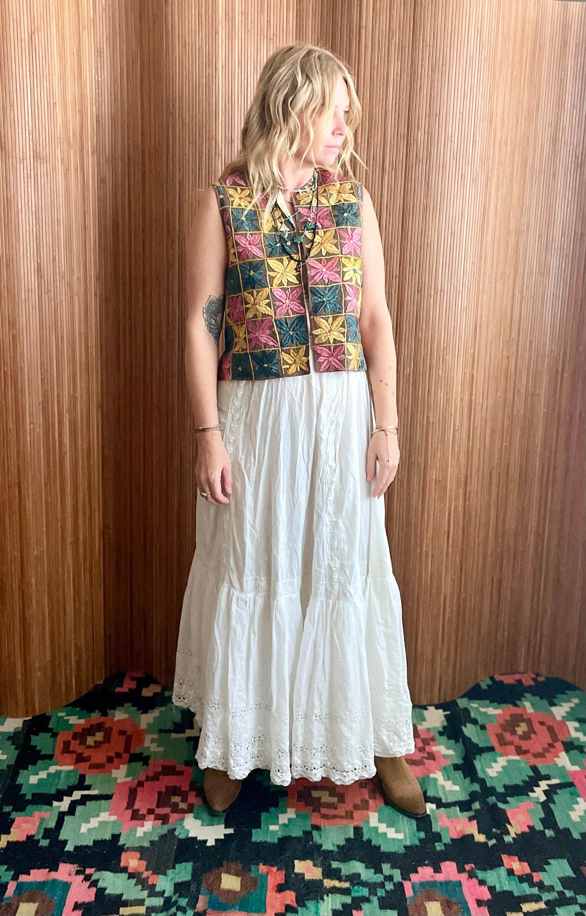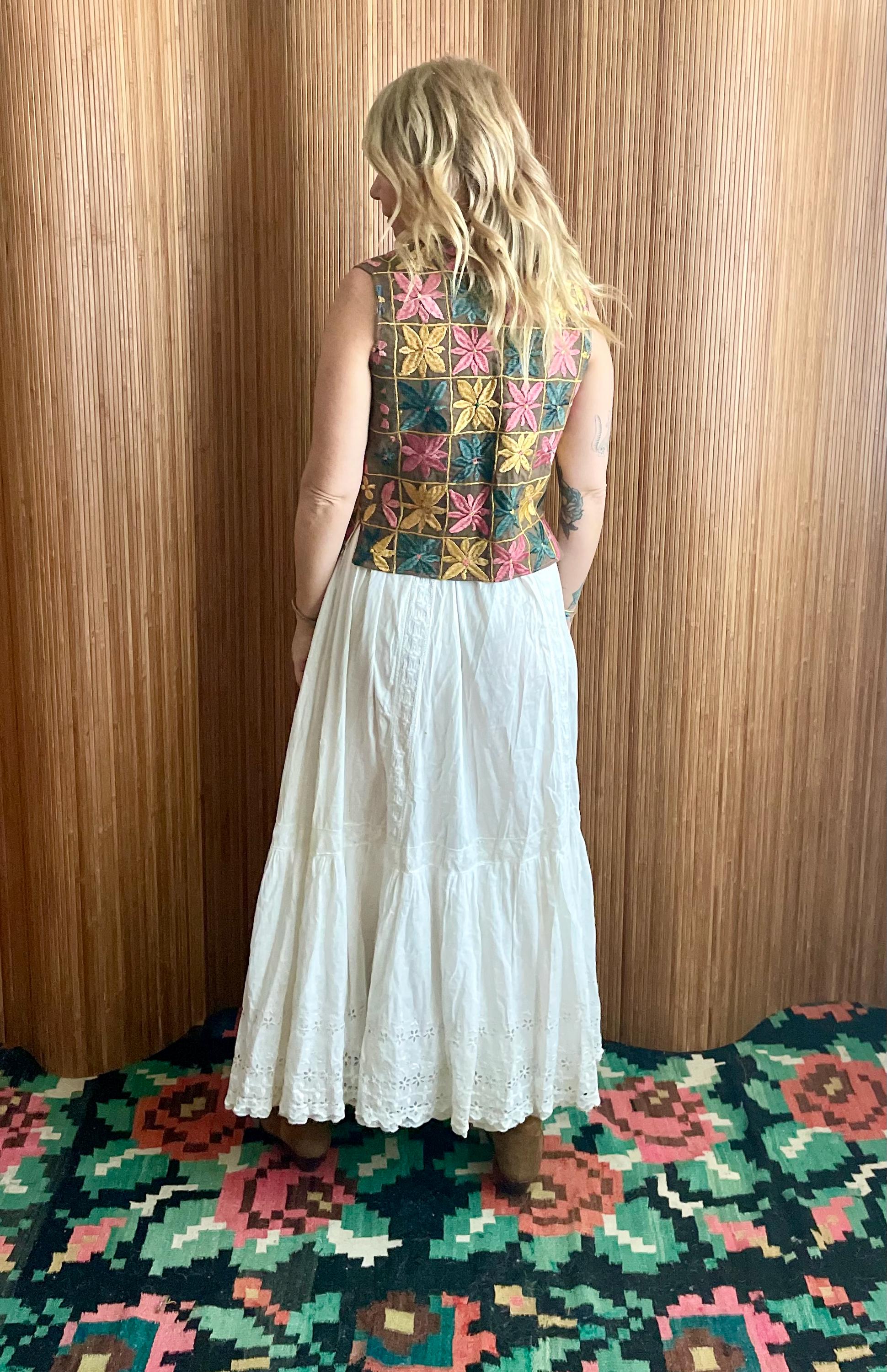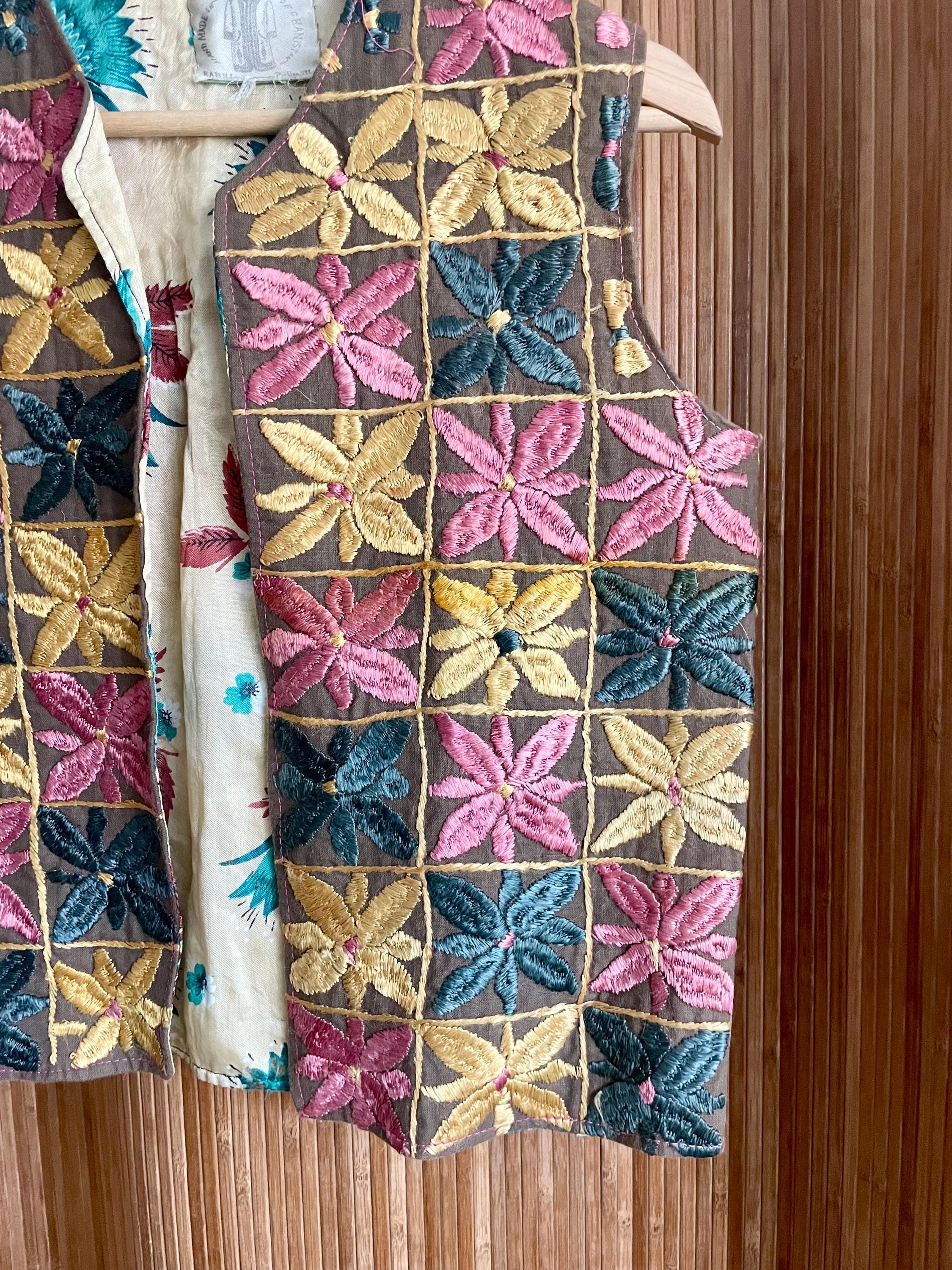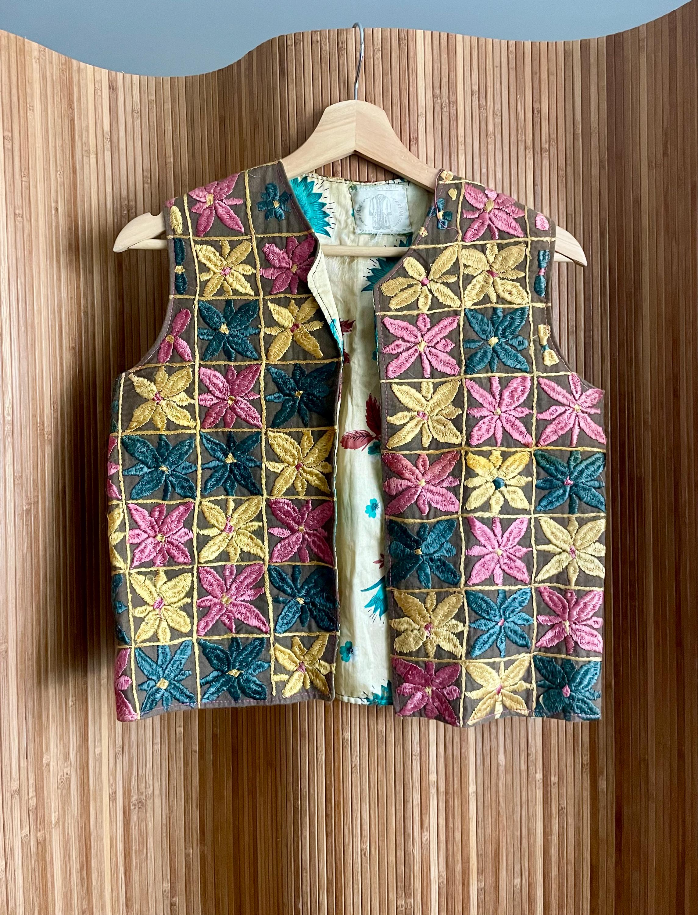 Stunning vintage Afghan silk embroidered vest, a rare and stunning piece of textile art. This unique vest features vibrant floral embroidery, showcasing the rich cultural heritage of Afghanistan. A true statement piece, perfect for adding a bohemian touch to any outfit
