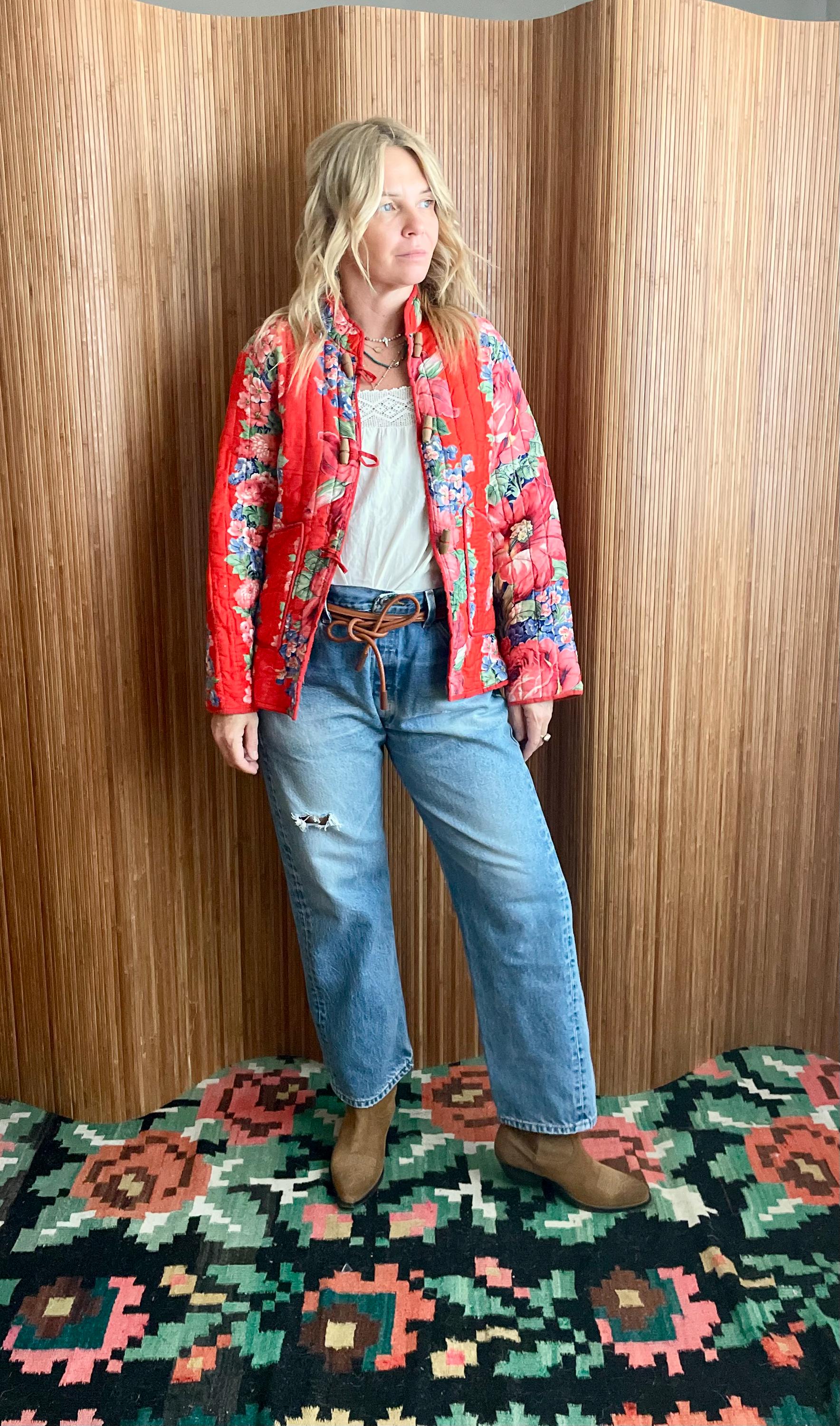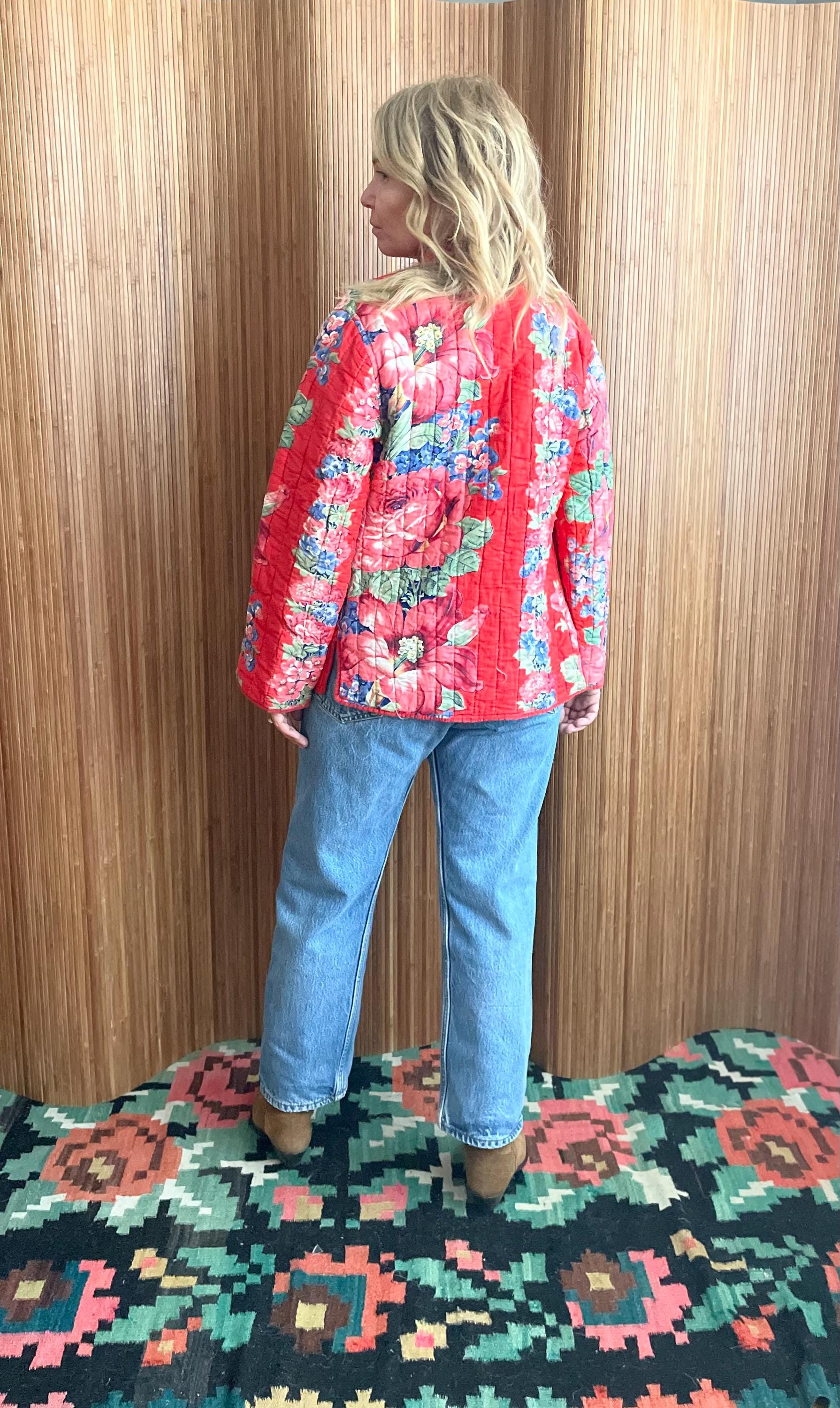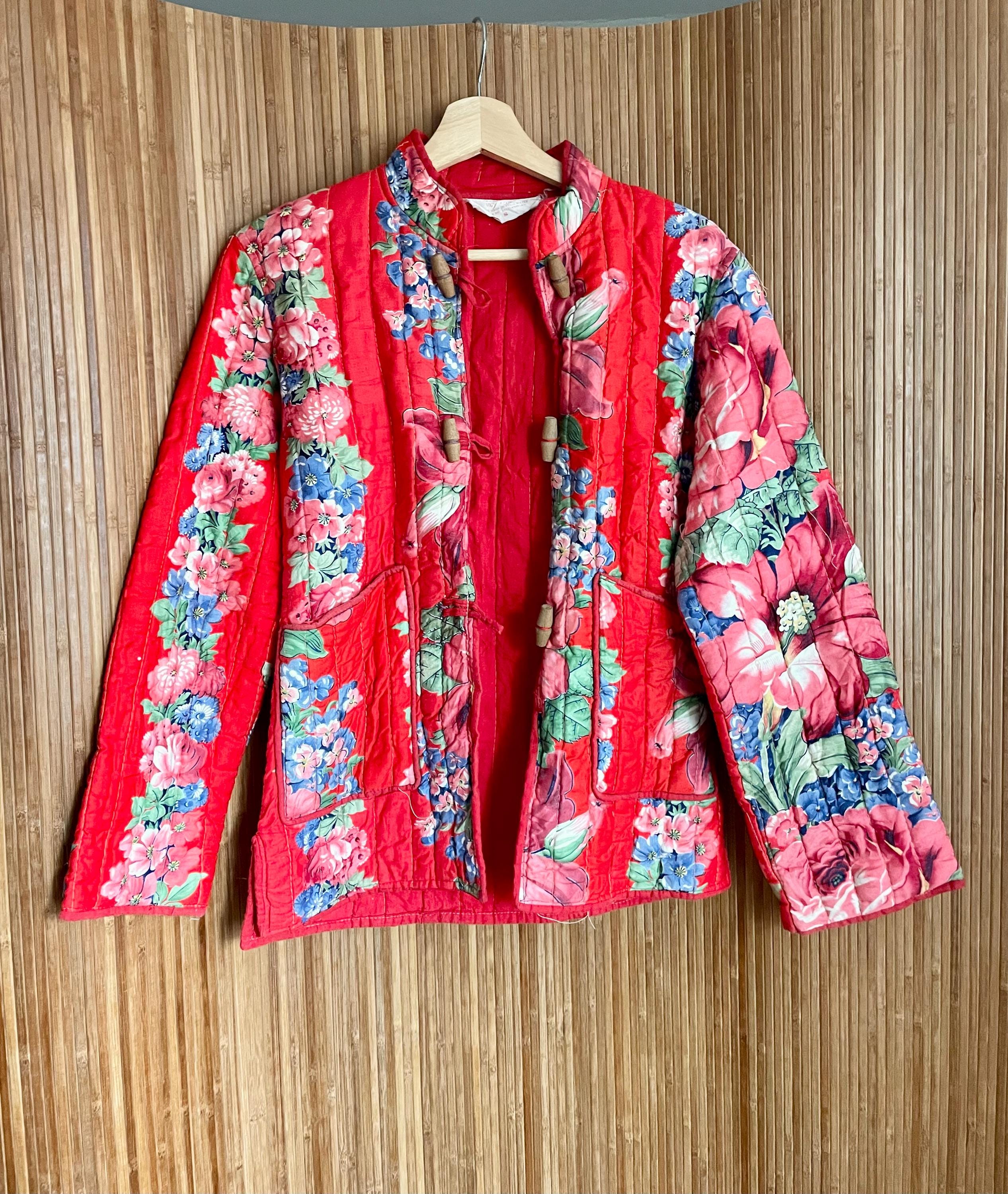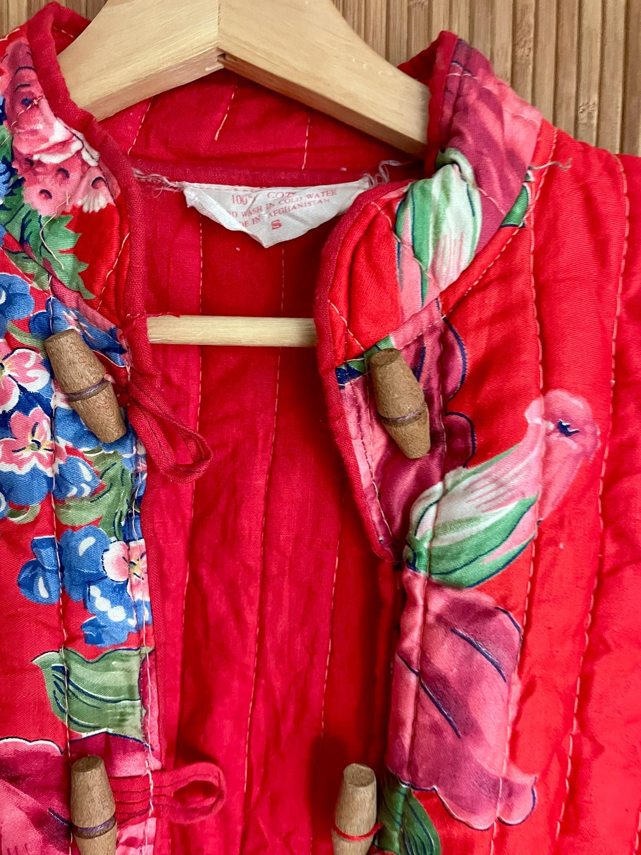 A beautiful and hard-to-find vintage Afghan quilted jacket, crafted from vibrant floral printed cotton and hand-quilted for warmth and texture. This piece features classic Afghan tailoring with a straight fit, toggle-style front ties, and richly colored panels. A perfect one-of-a-kind layering piece that blends folk craftsmanship with bold bohemian style.