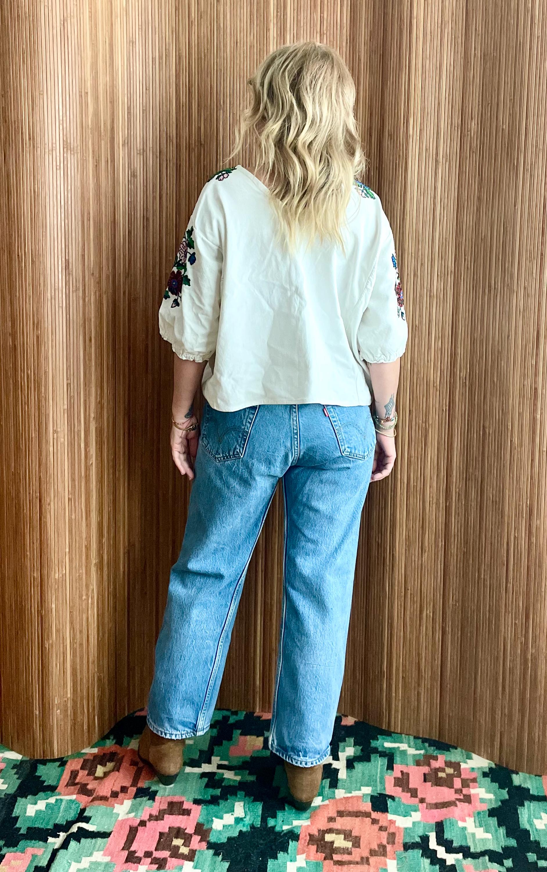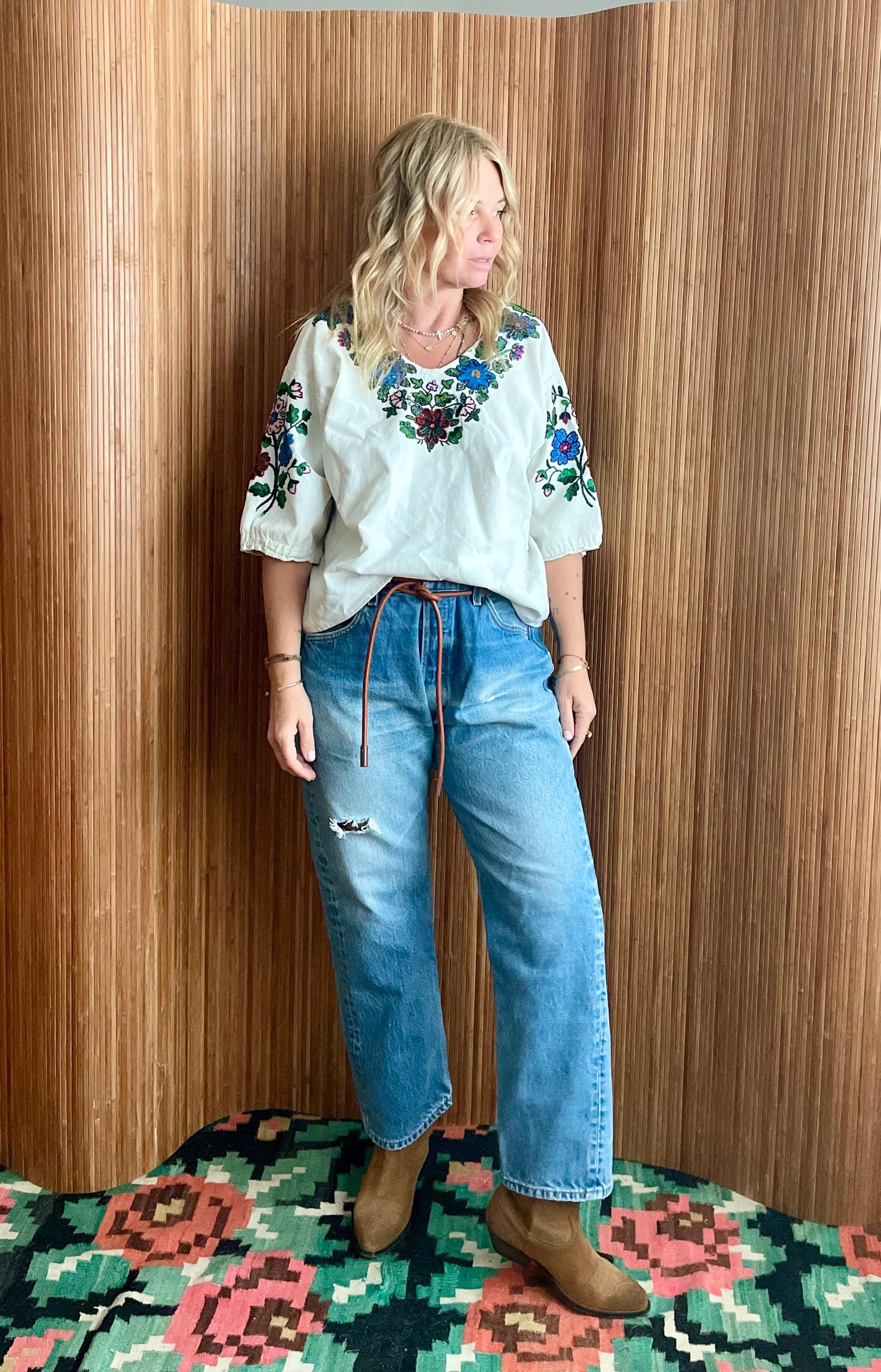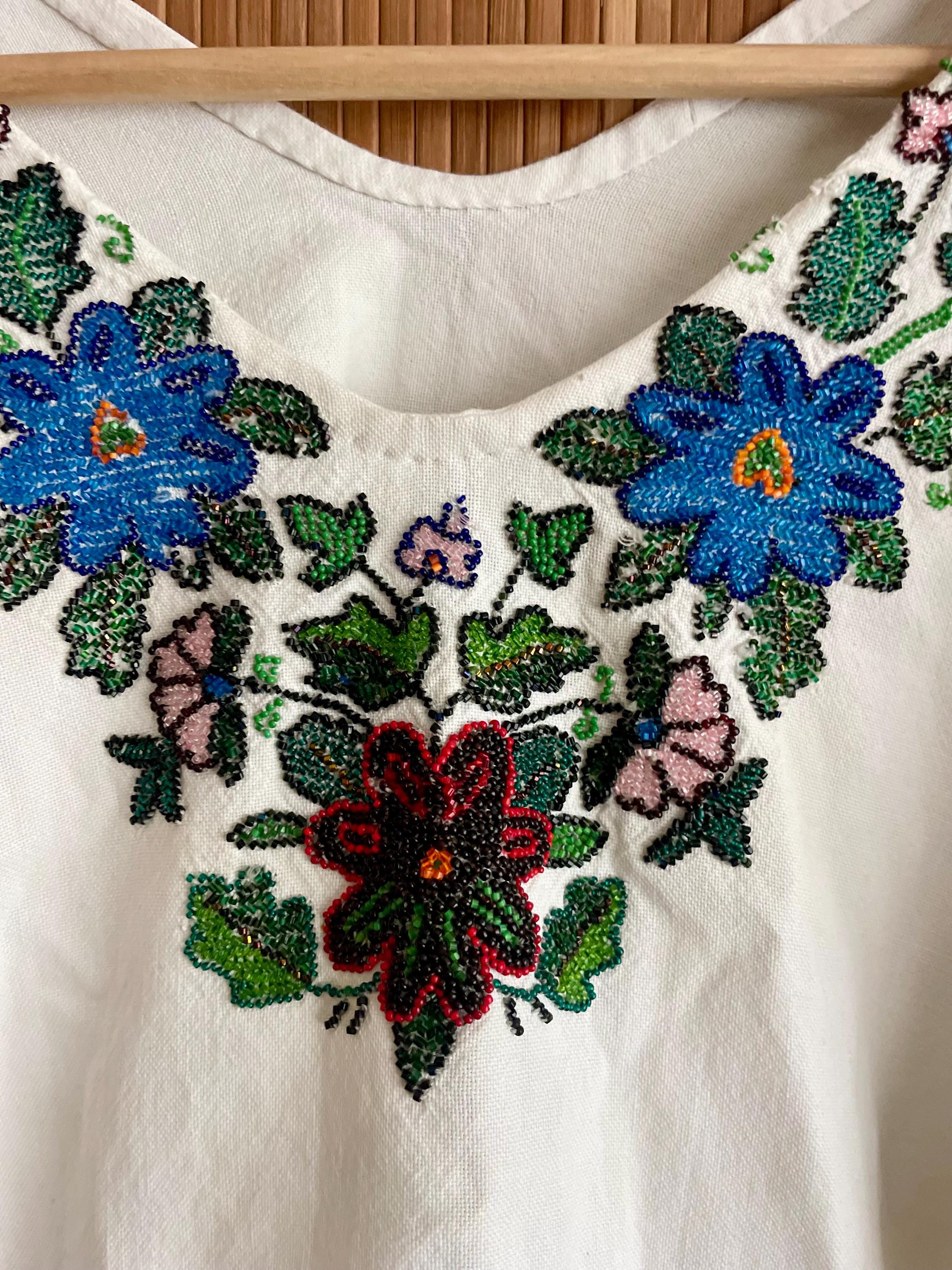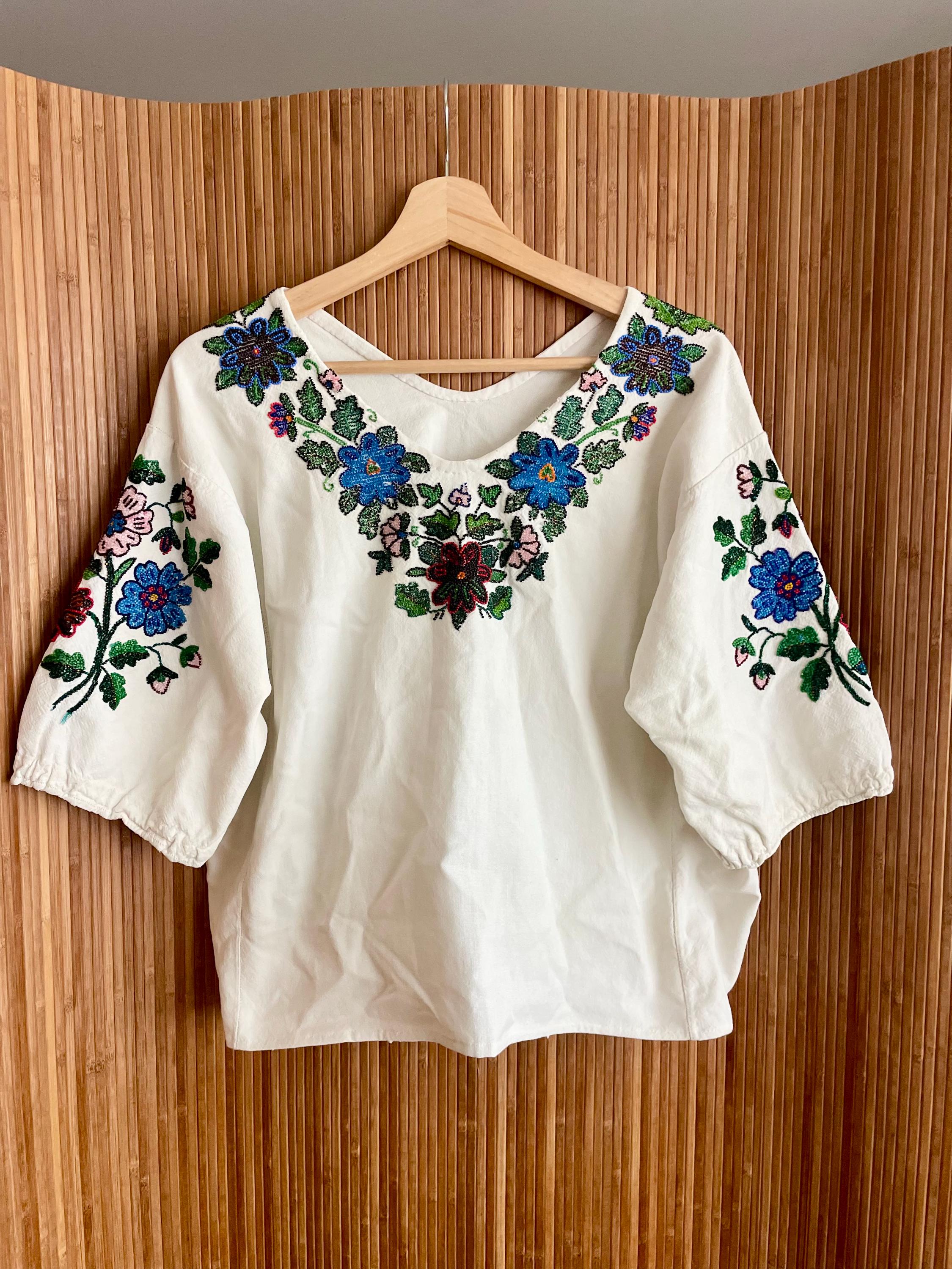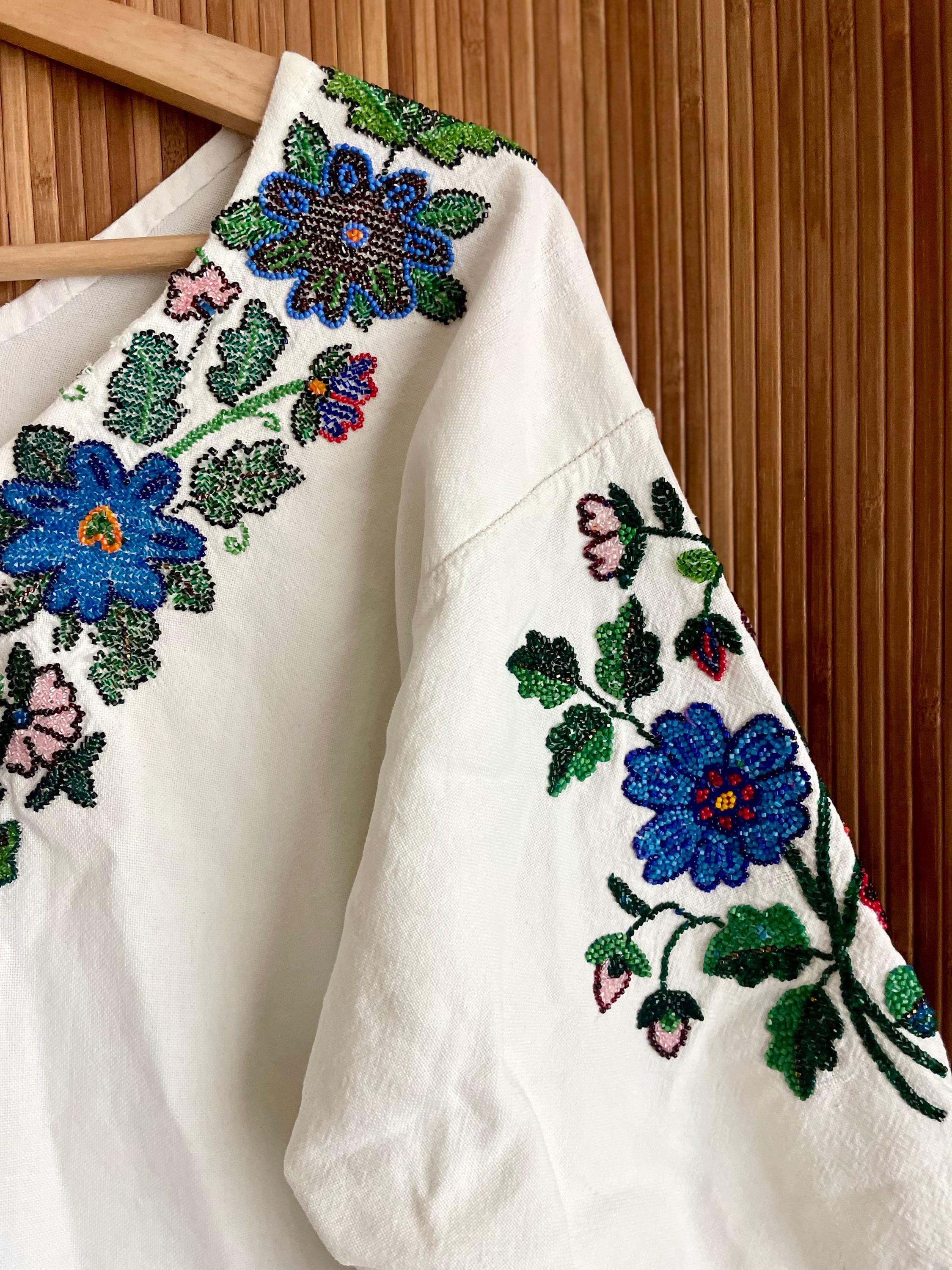 A beautiful mid-century Eastern European folk blouse hand-stitched in vibrant floral glass beads. Made of soft, breathable linen , the ornate floral design across the neckline and sleeves is meticulously hand-beaded, showcasing vibrant colors including shades of blue, green, red, and purple. Each bead adds a delicate sparkle and dimension, reflecting traditional Eastern European folk art.