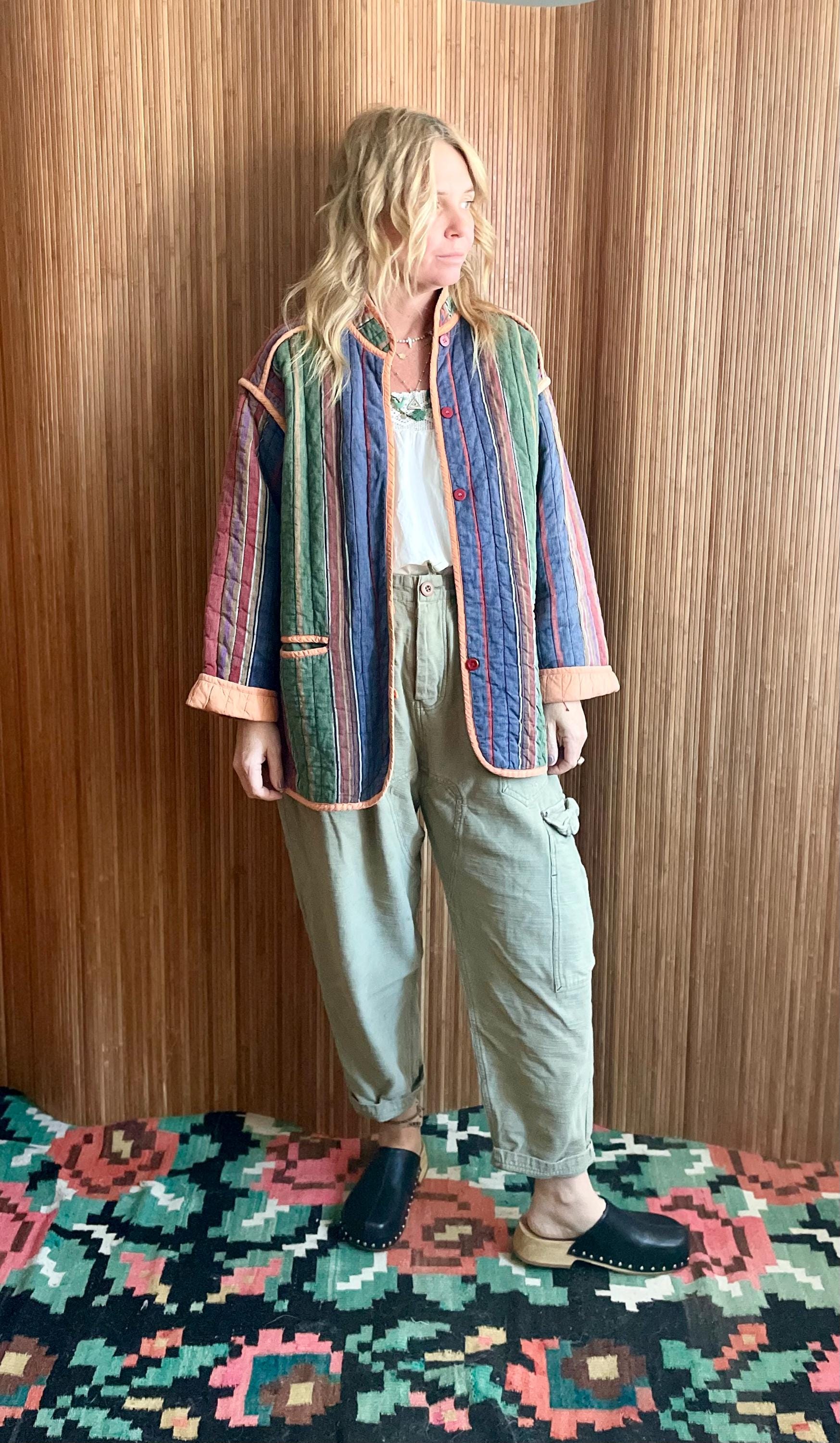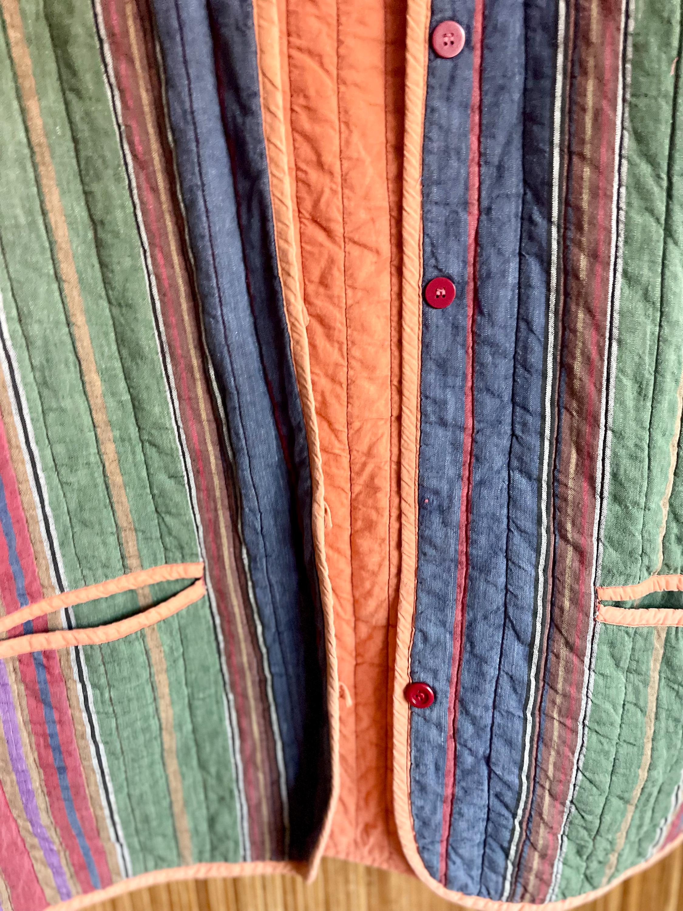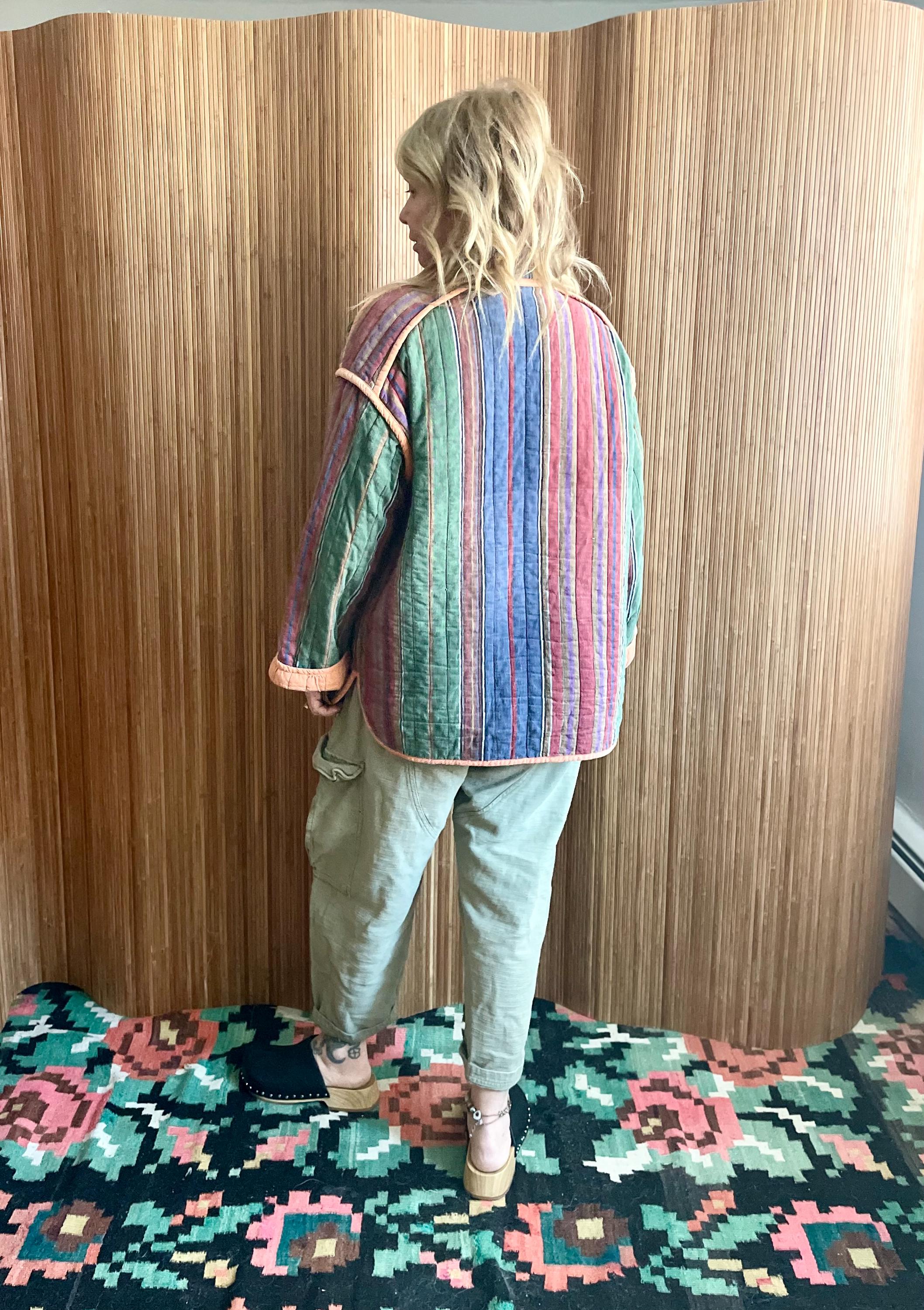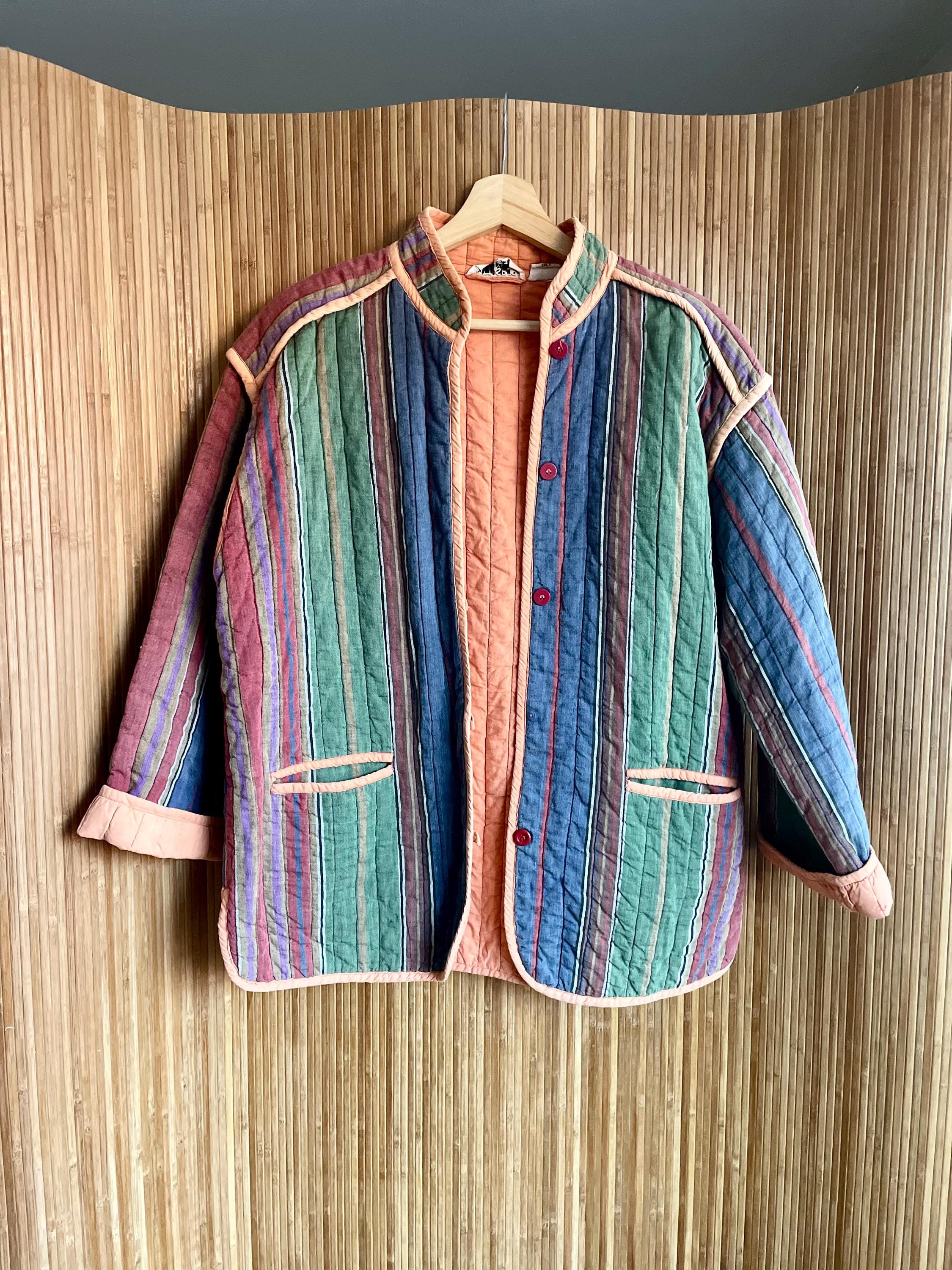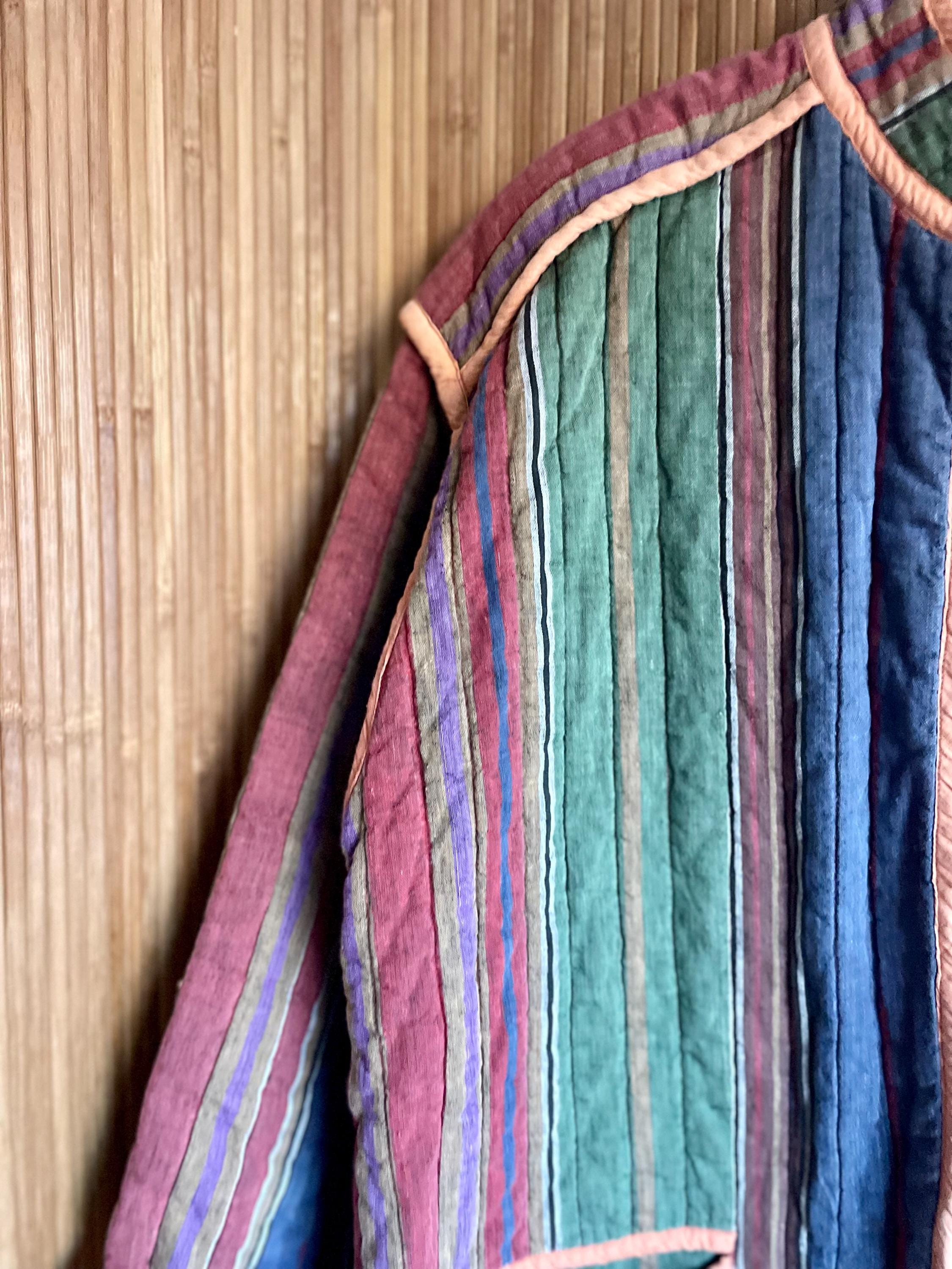 Wrap yourself in the vibrant comfort of this vintage super soft Indian cotton quilted jacket. Featuring a beautiful array of colorful stripes and a cozy quilted texture, this jacket is a true artisan piece. It's perfect for adding a bohemian and eclectic touch to your wardrobe, whether for casual outings, festival wear, or a unique layering statement.