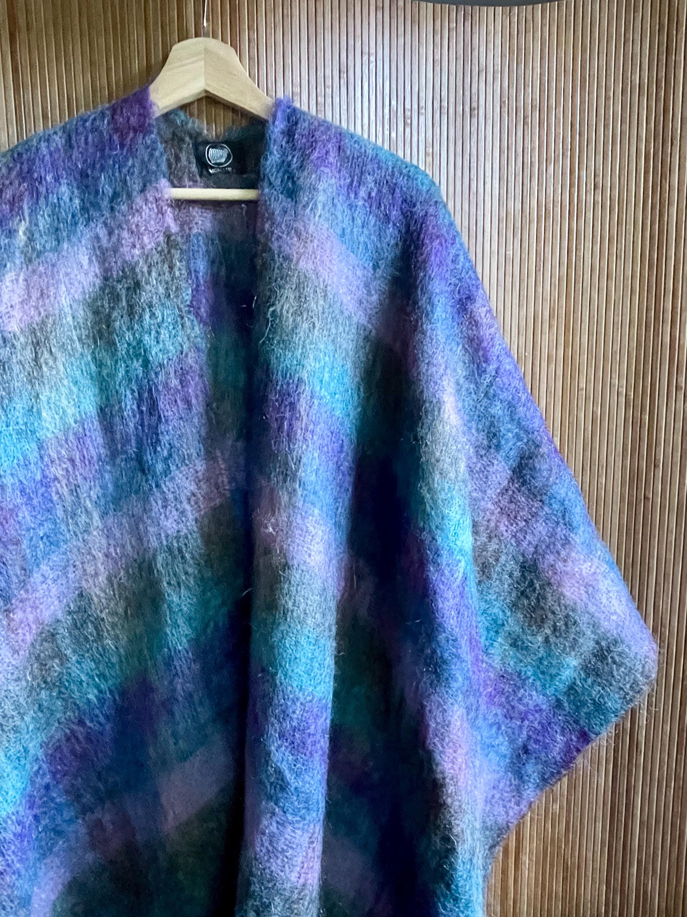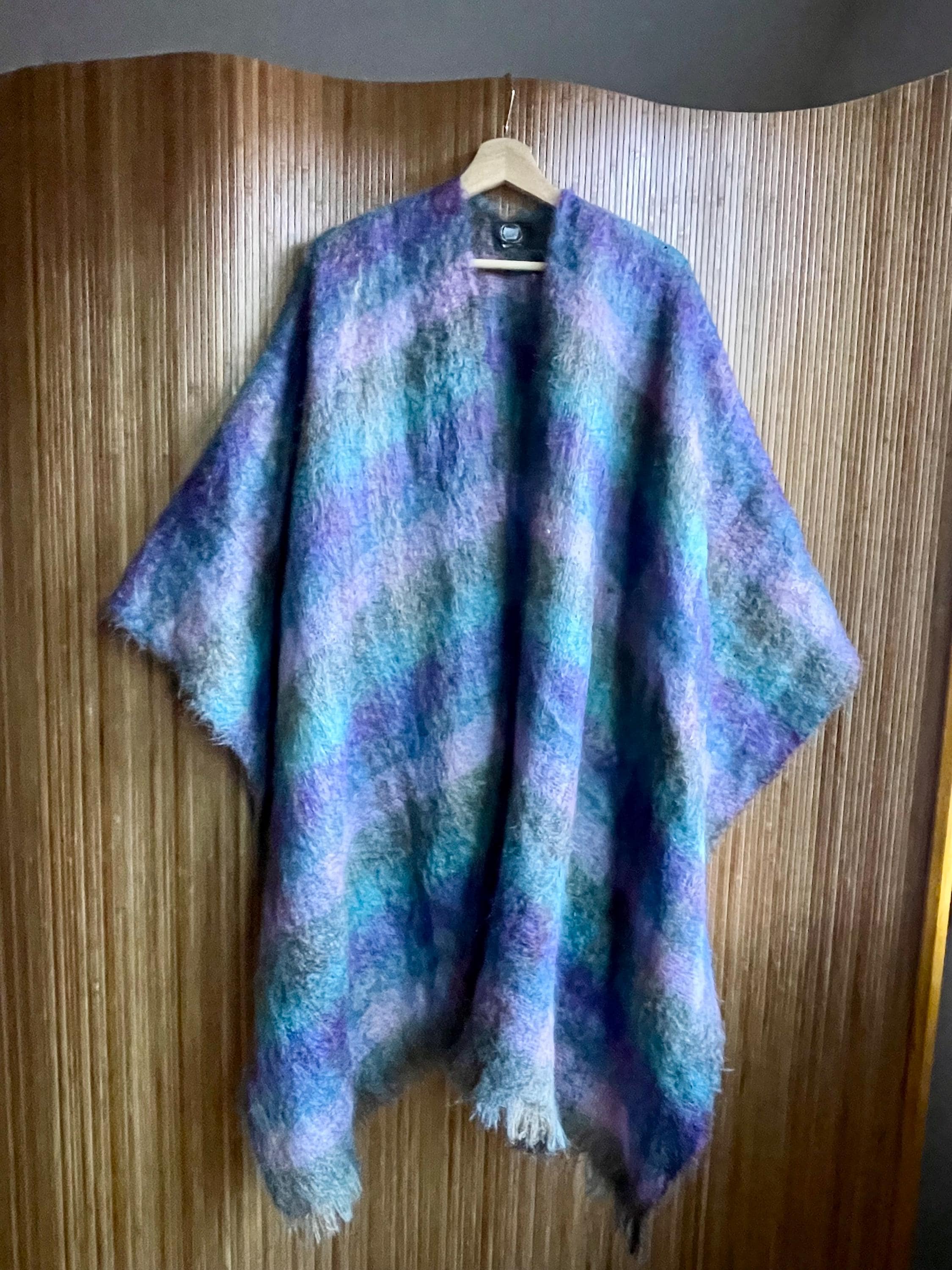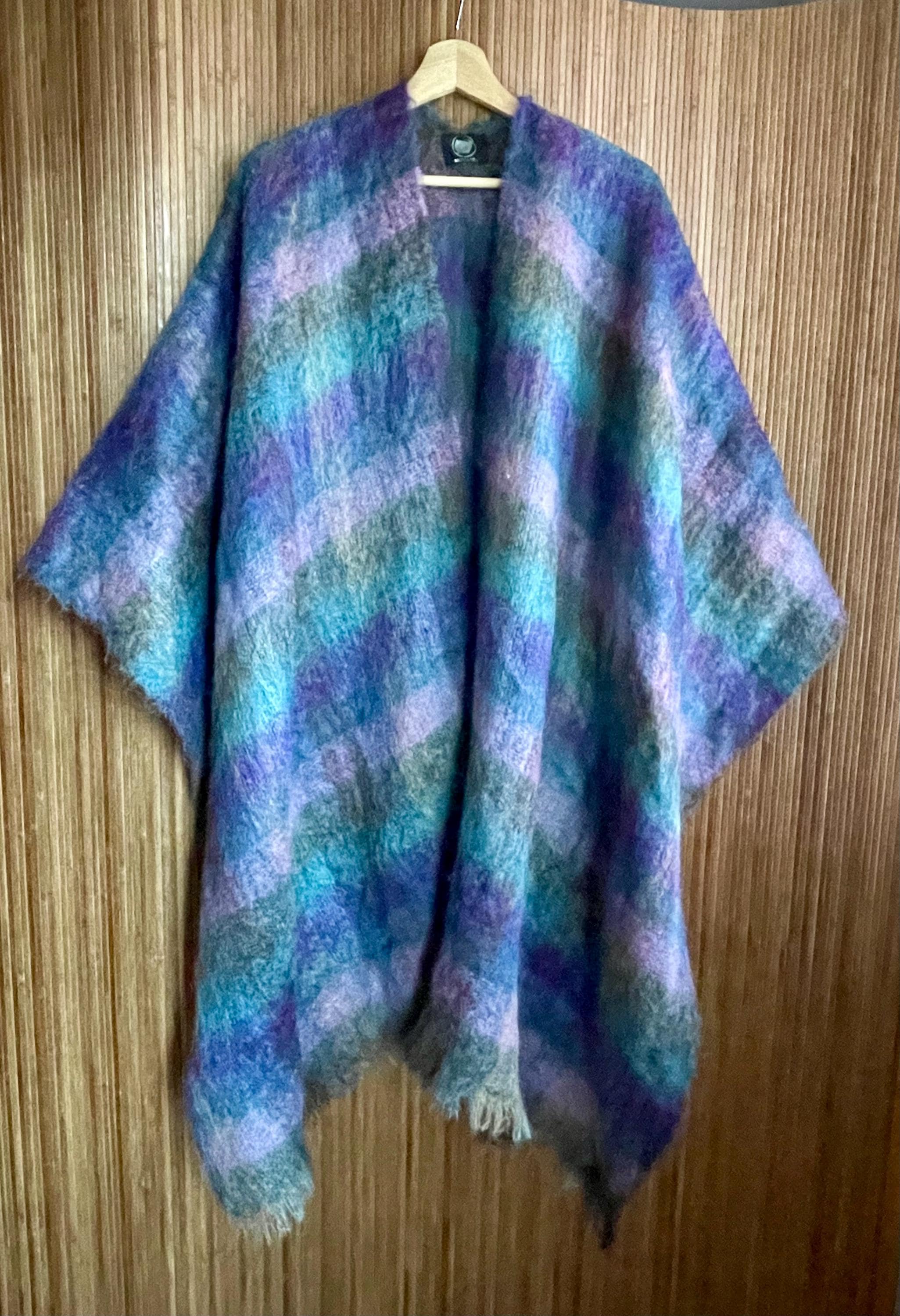 ndulge in the ultimate comfort and style with this vintage Italian super soft mohair poncho/wrap. Featuring a beautiful plaid pattern in serene shades of blue, purple, and teal, this luxurious piece is incredibly cozy and versatile. Perfect for layering over any outfit during cooler seasons