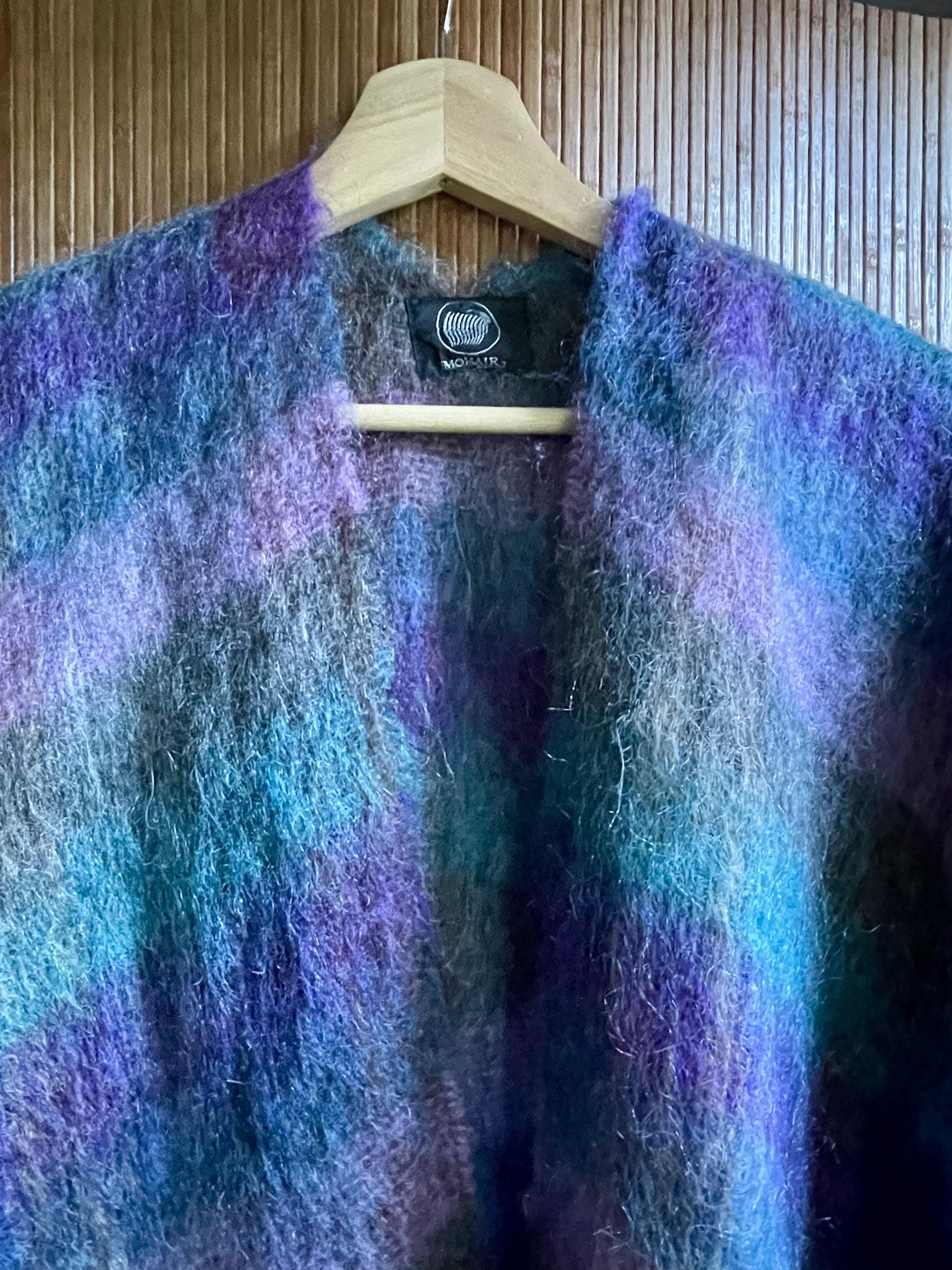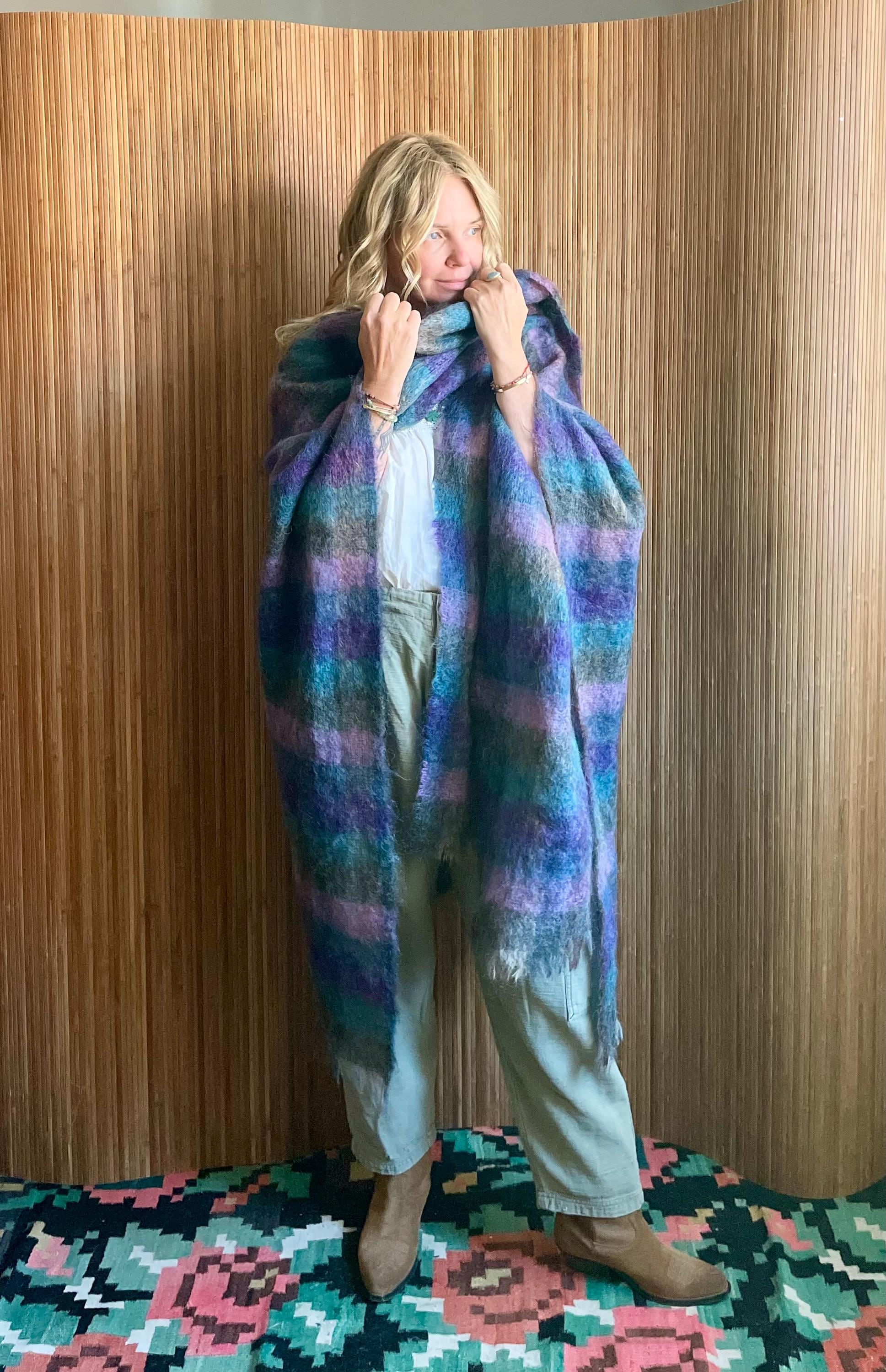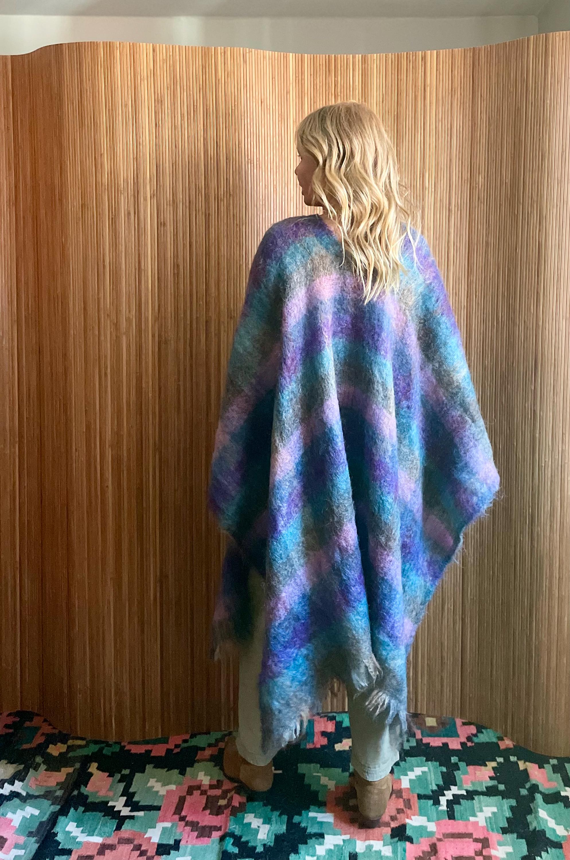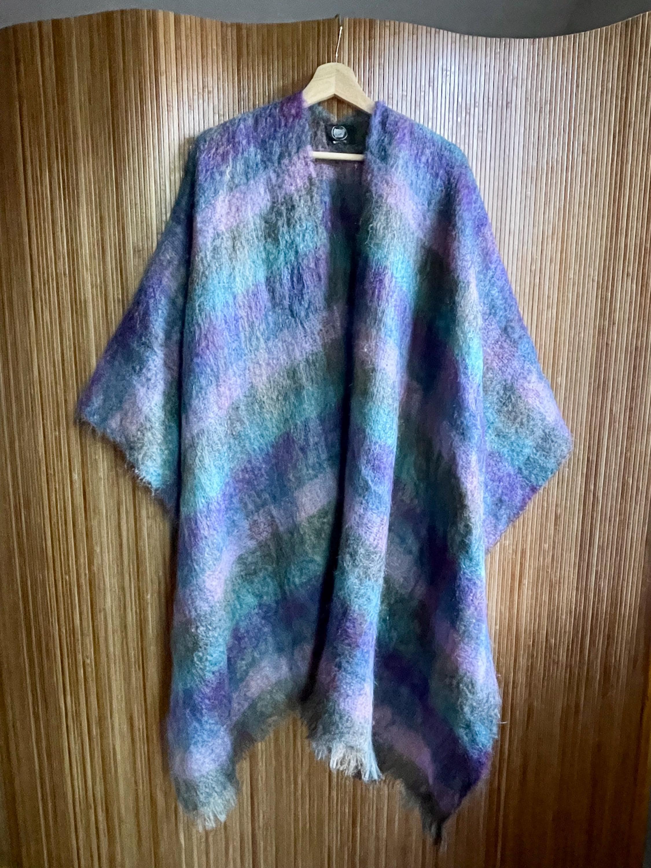 ndulge in the ultimate comfort and style with this vintage Italian super soft mohair poncho/wrap. Featuring a beautiful plaid pattern in serene shades of blue, purple, and teal, this luxurious piece is incredibly cozy and versatile. Perfect for layering over any outfit during cooler seasons