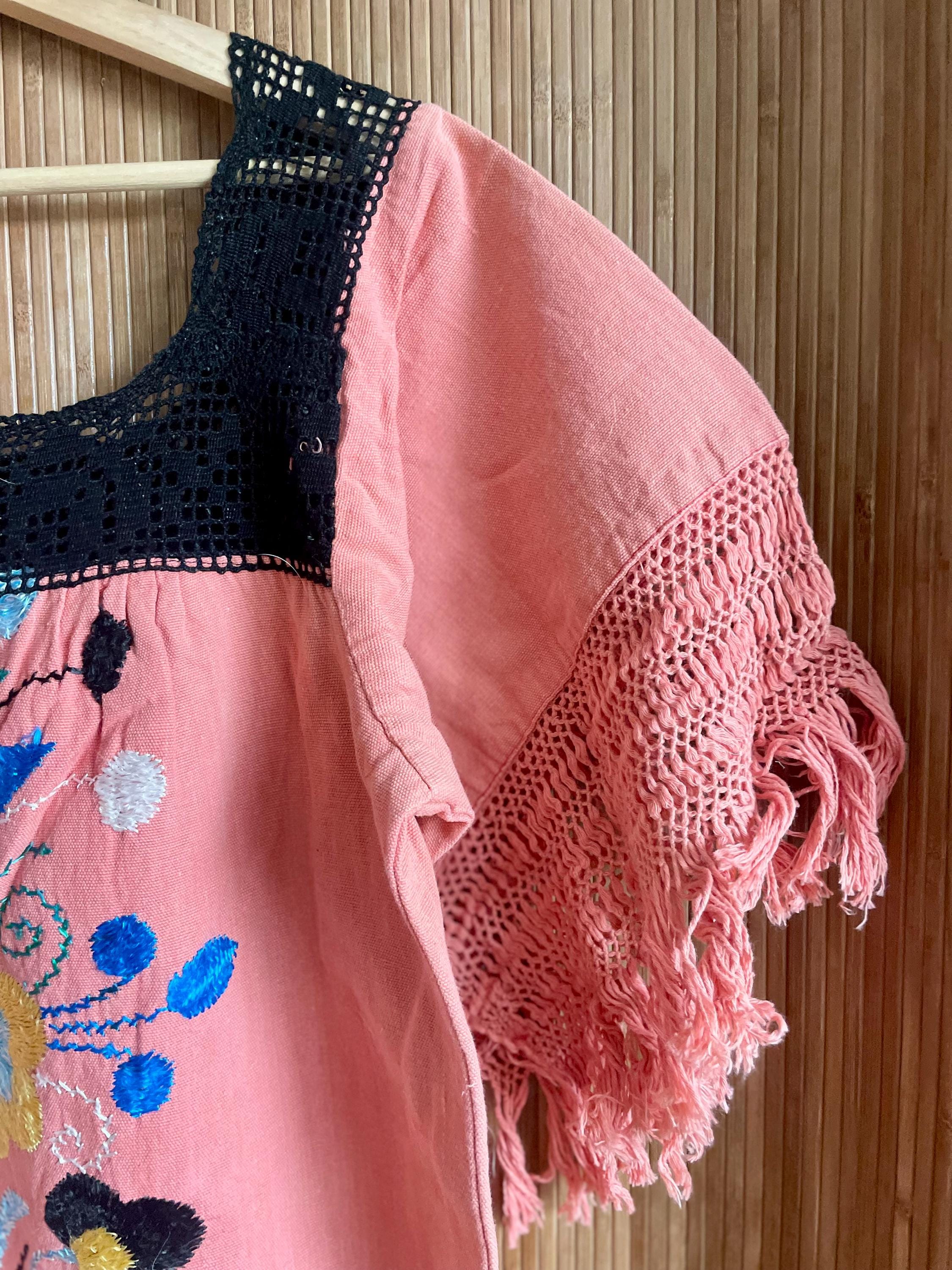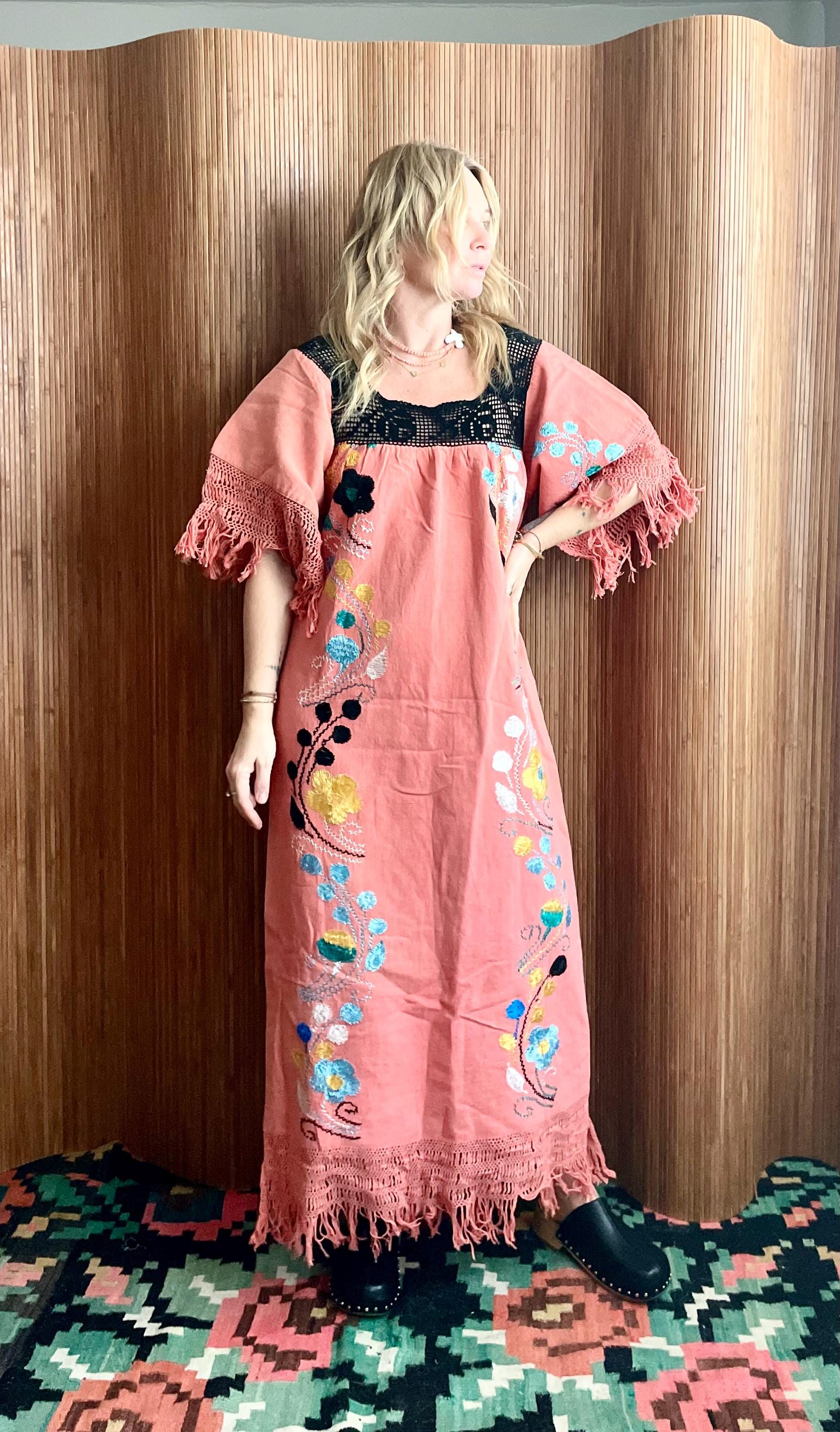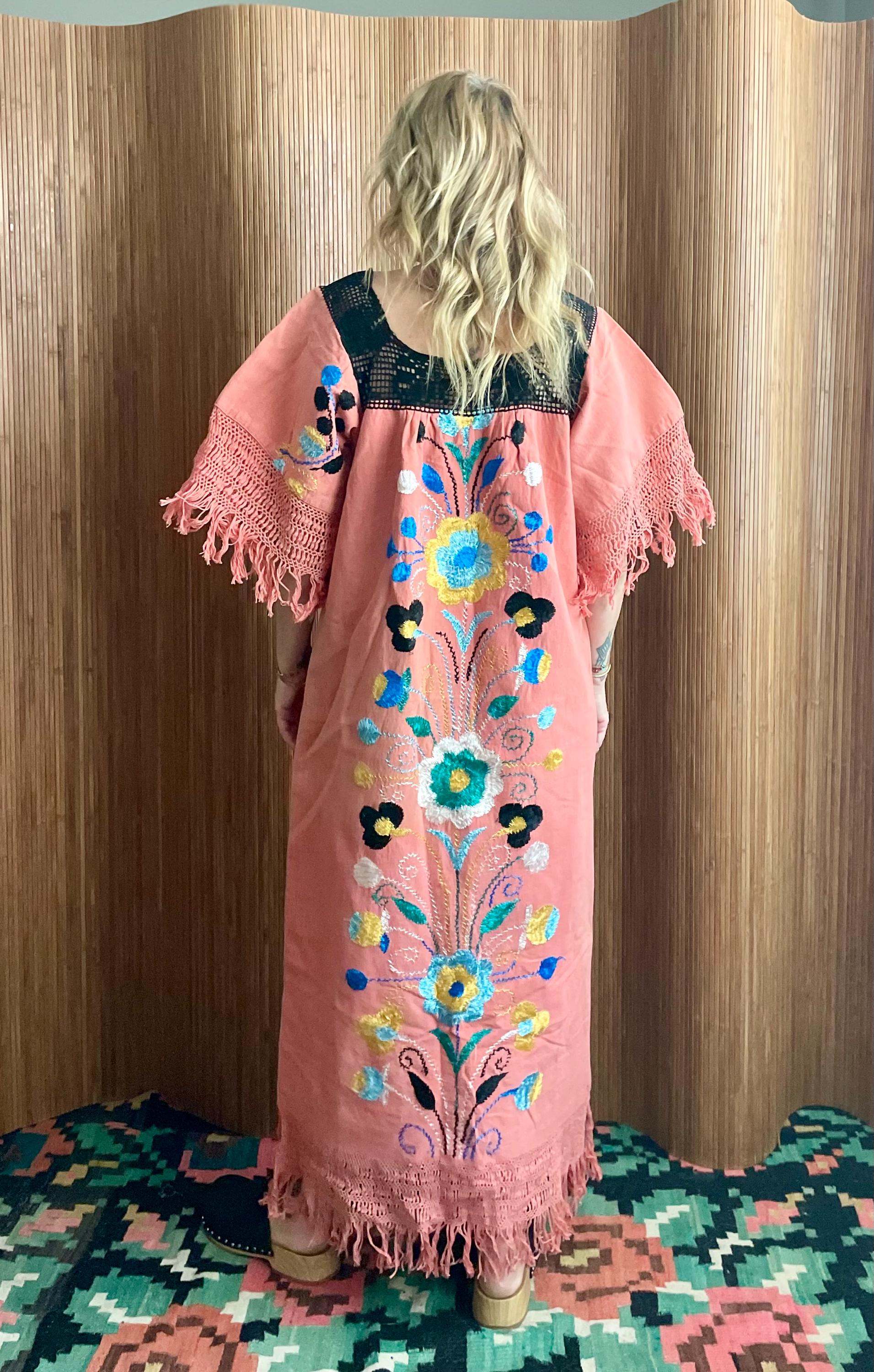 An incredible true vintage kaftan, richly embroidered with vibrant flora; motif and finished with black crochet yoke and fringe detail.