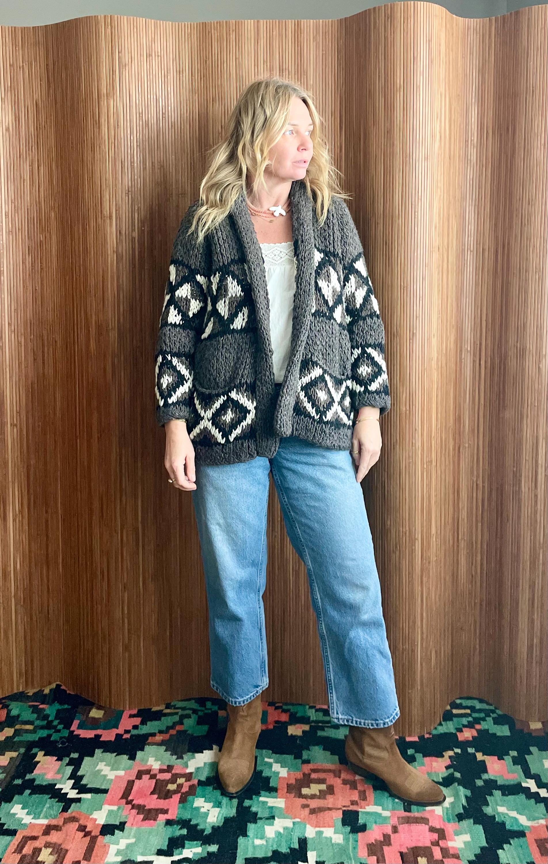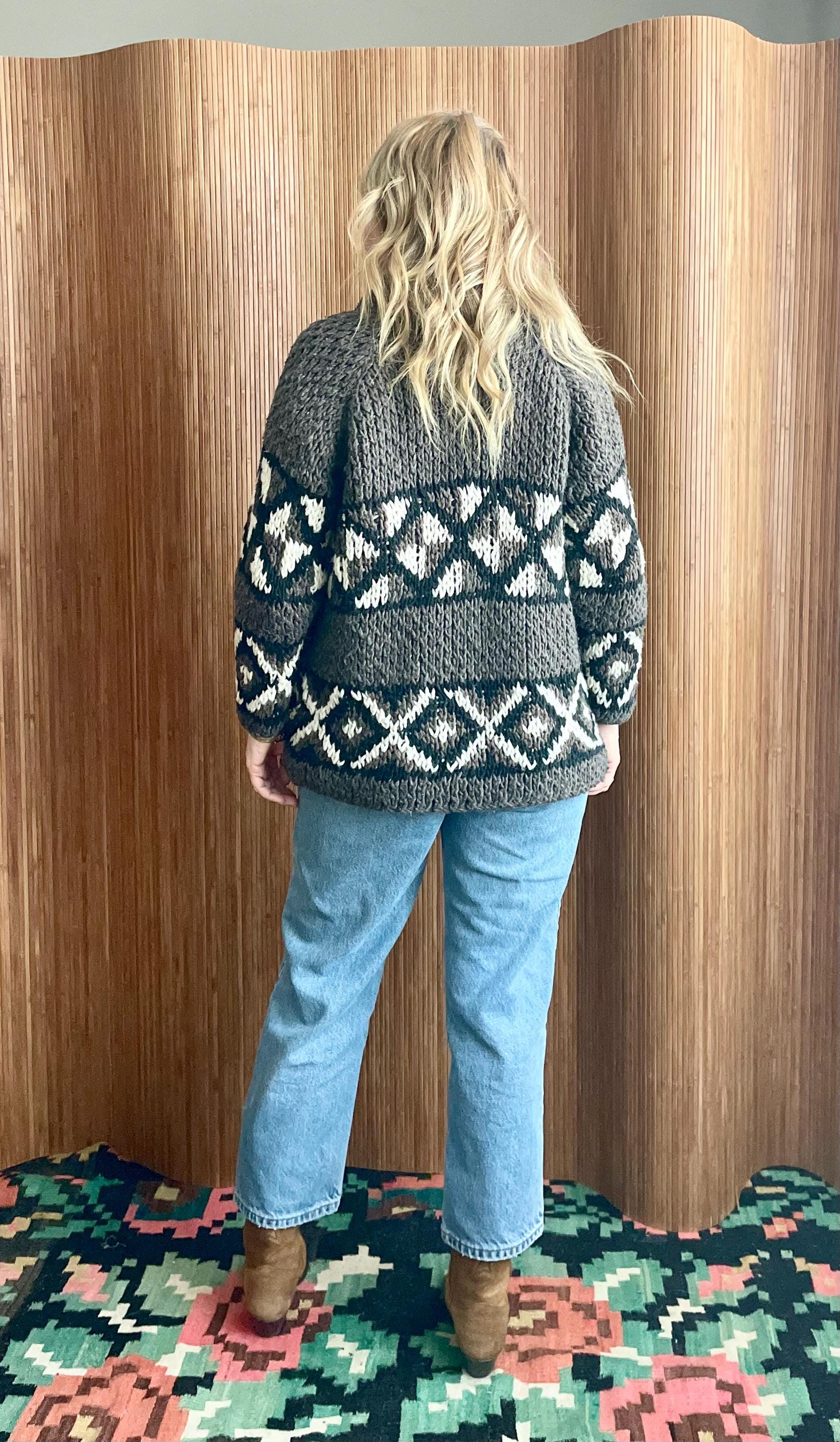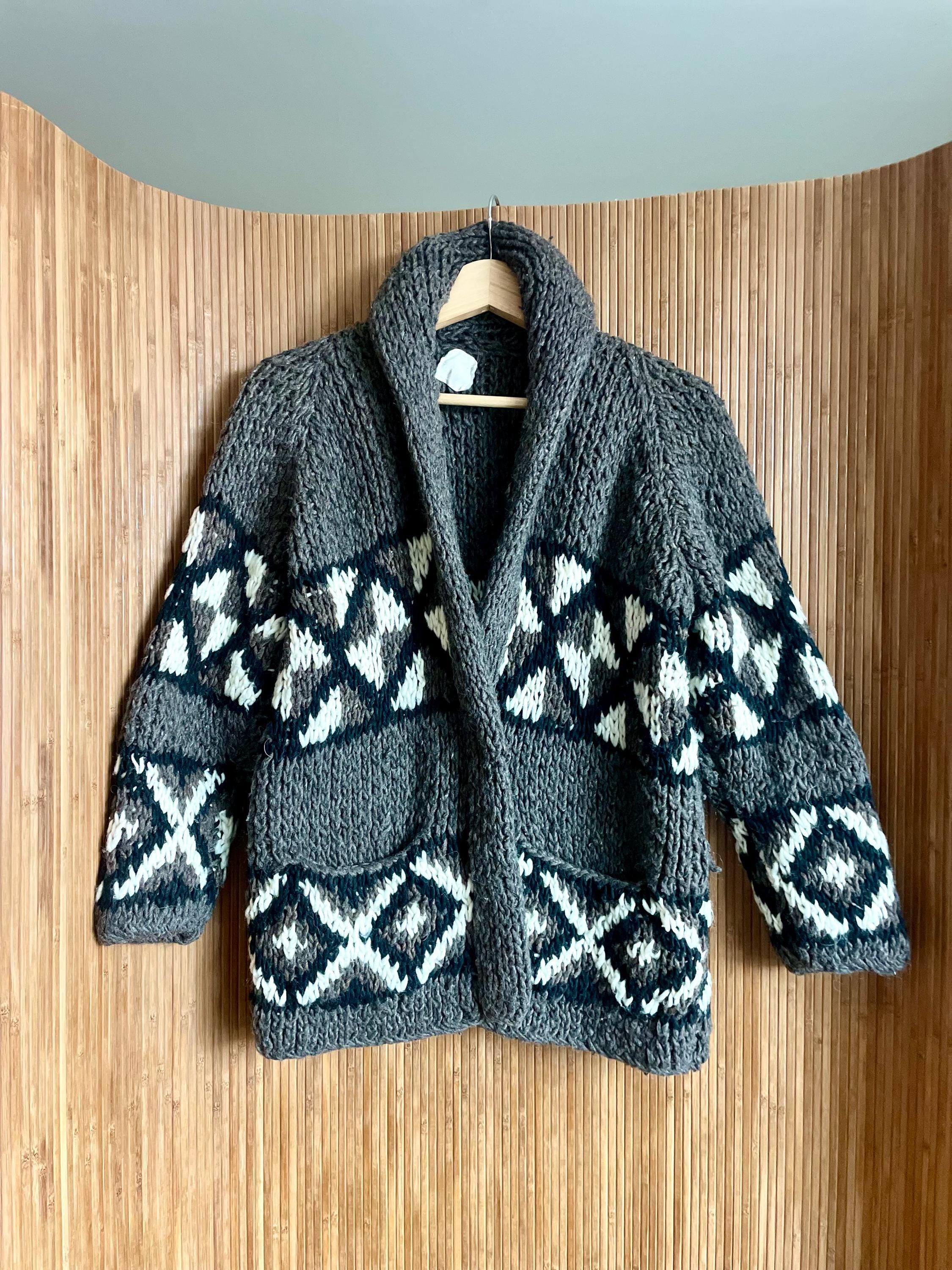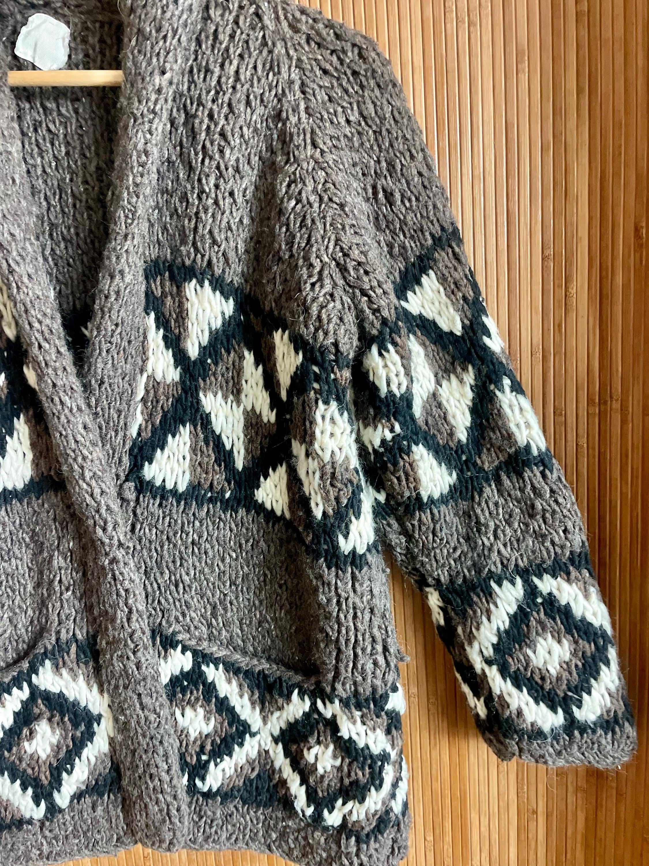 1960s Mexican wool cardigan with rolled collar and two front packetsThis were made in Mexico in the 60s. Loved by Marilyn Monroe in 1962!This unique wool sweater features a striking pattern and cozy design, perfect for adding a touch of retro style to your wardrobe. A true statement piece for vintage collectors and fashion enthusiasts