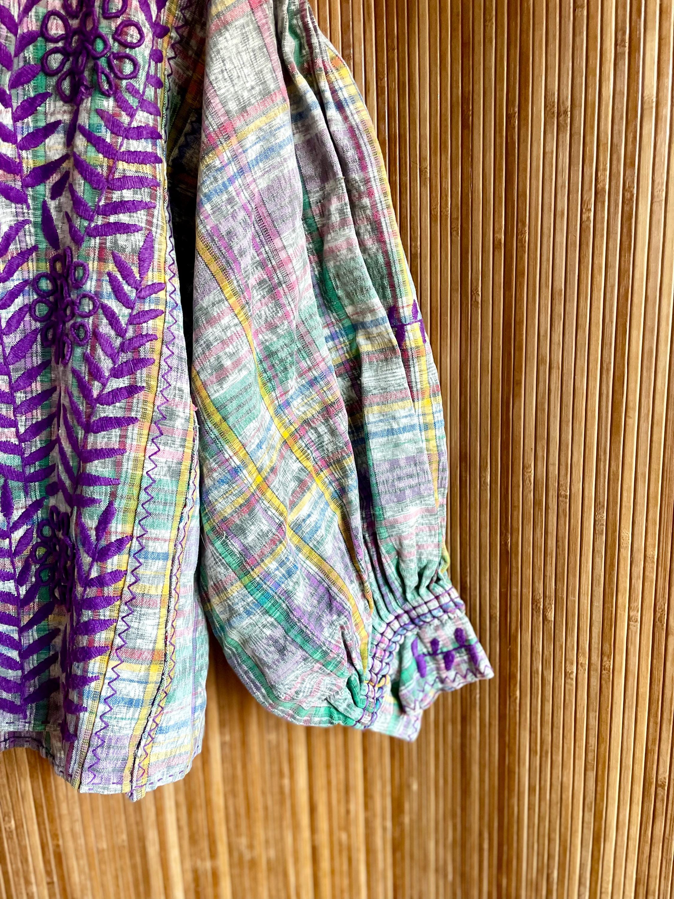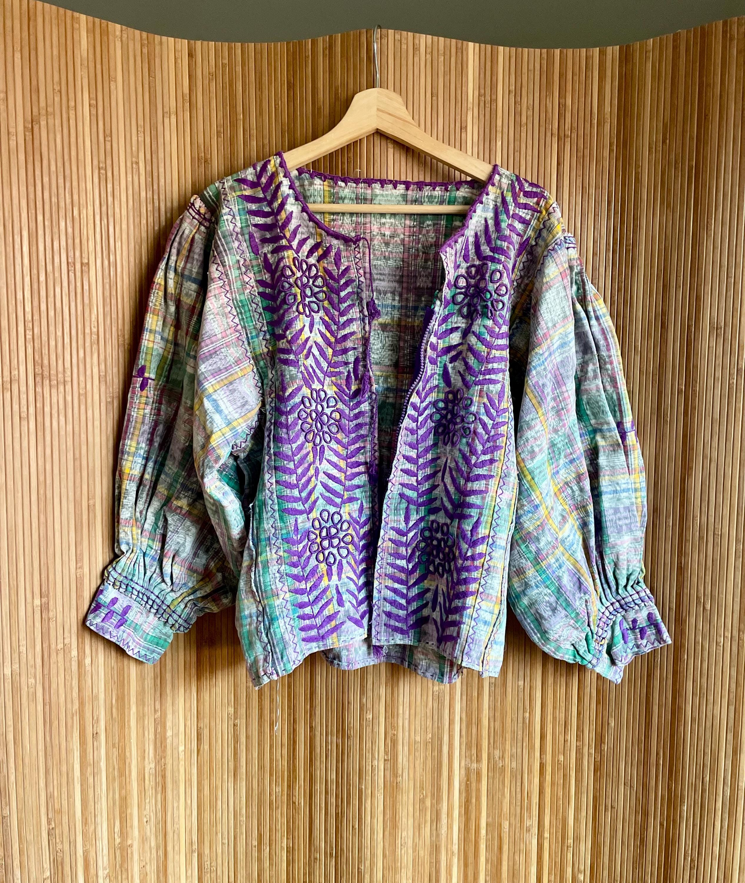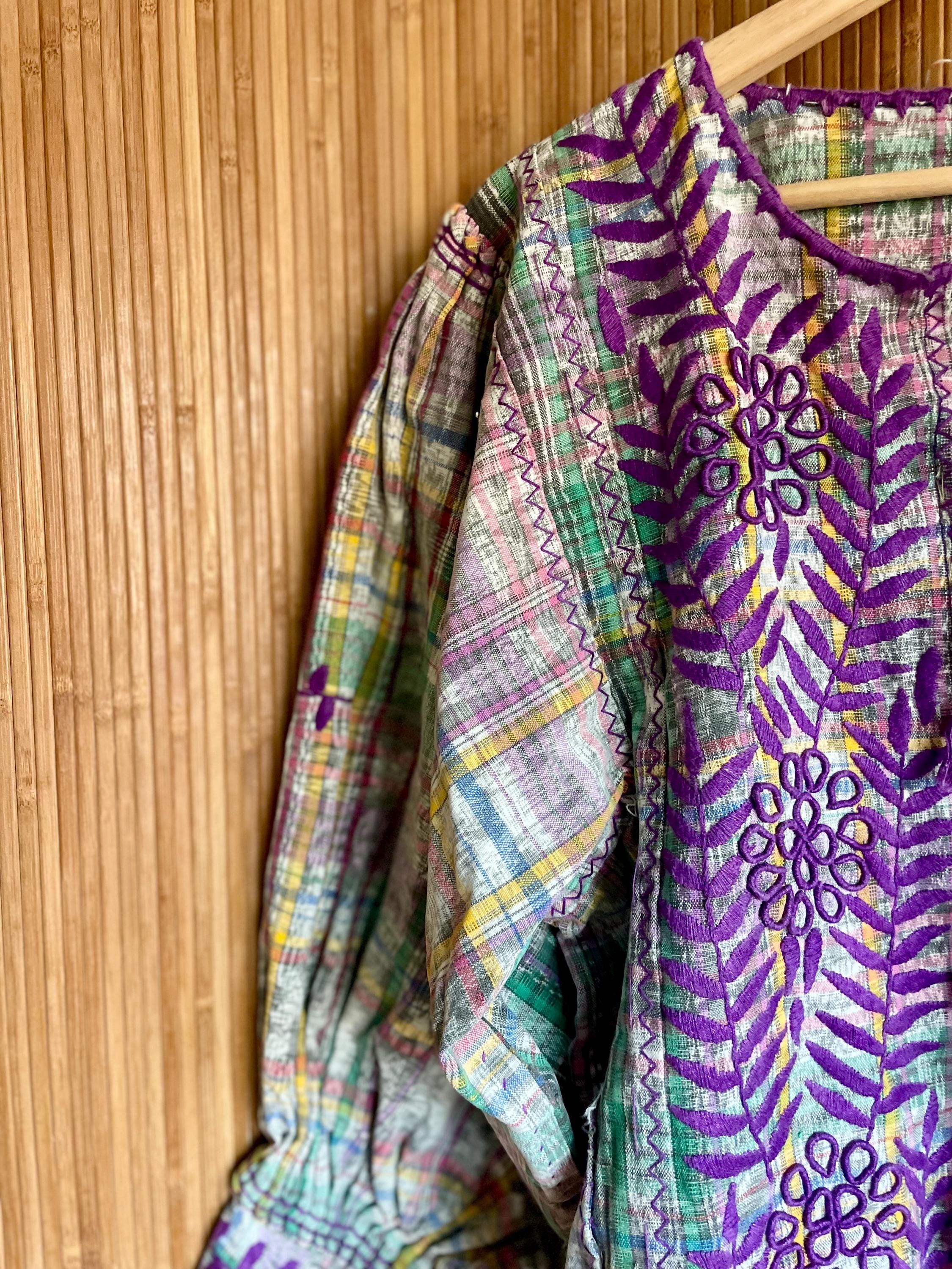 A striking vintage Chiapas jacket crafted from richly textured, ikat-inspired handwoven cotton, featuring bold purple embroidery and softly gathered sleeves. This piece reflects the vibrant textile traditions of southern Mexico, where color, pattern, and handwork tell cultural stories passed through generations.