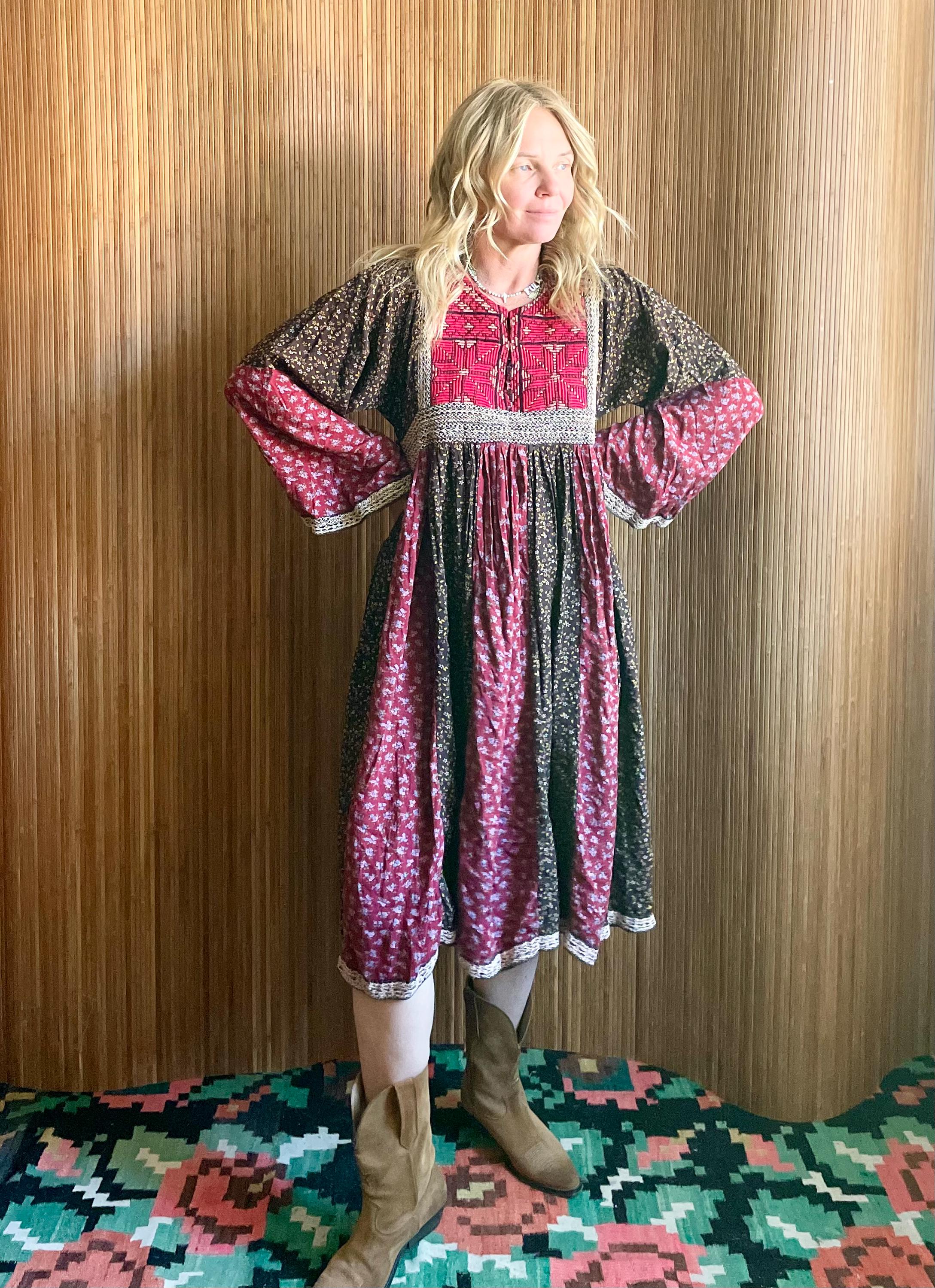 This vintage 70s Afghan hand-embroidered midi dress, featuring a beautiful combination of pink and brown floral patterns, detailed embroidery. A unique and rare find, perfect for any vintage enthusiasts collection.