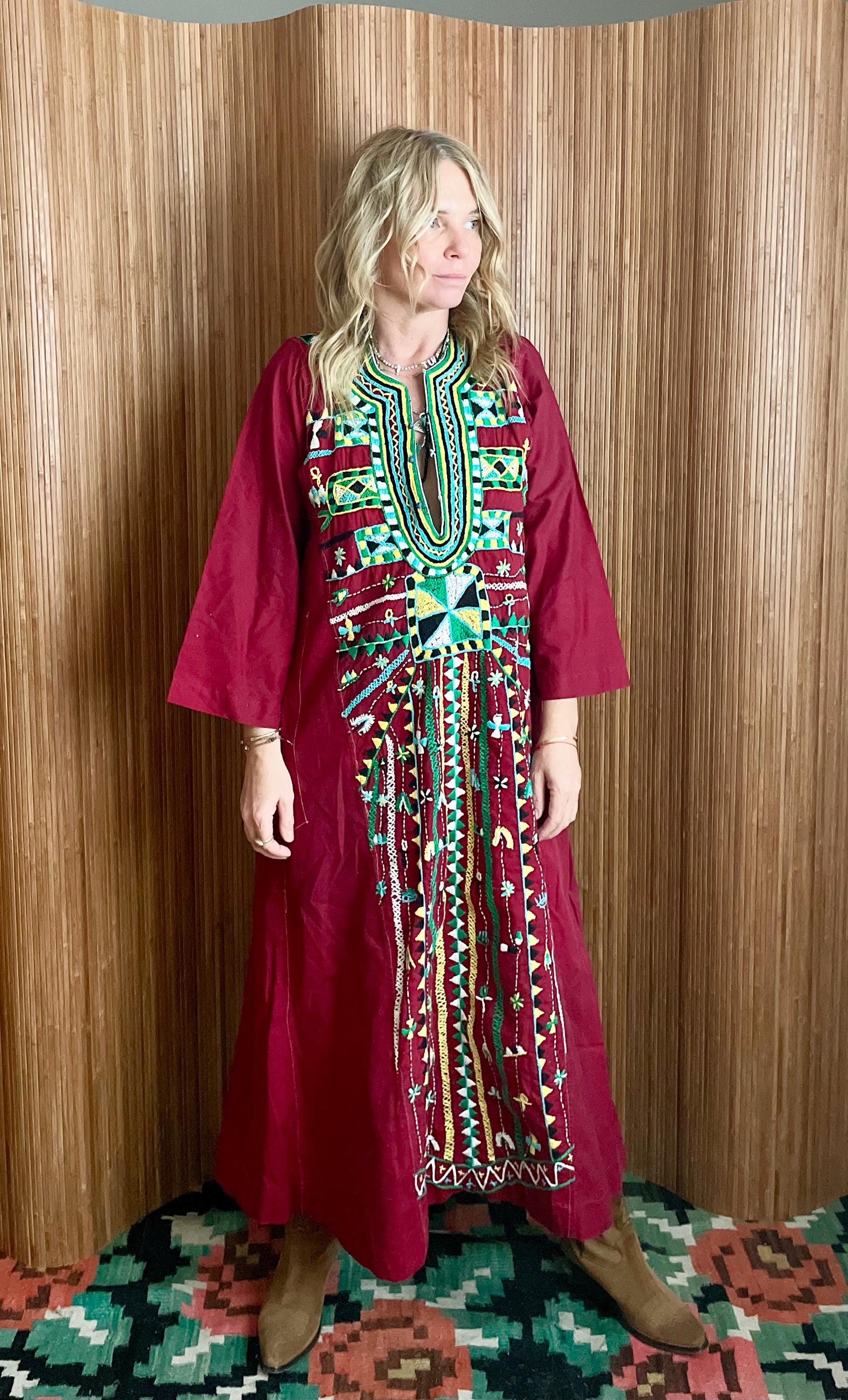 Incredible, vintage Egyptian kaftan hand embroidered by the Siwa tribe. Highly collectable and rare in burgundy with bright embroidered panel on the front. Heirloom piece