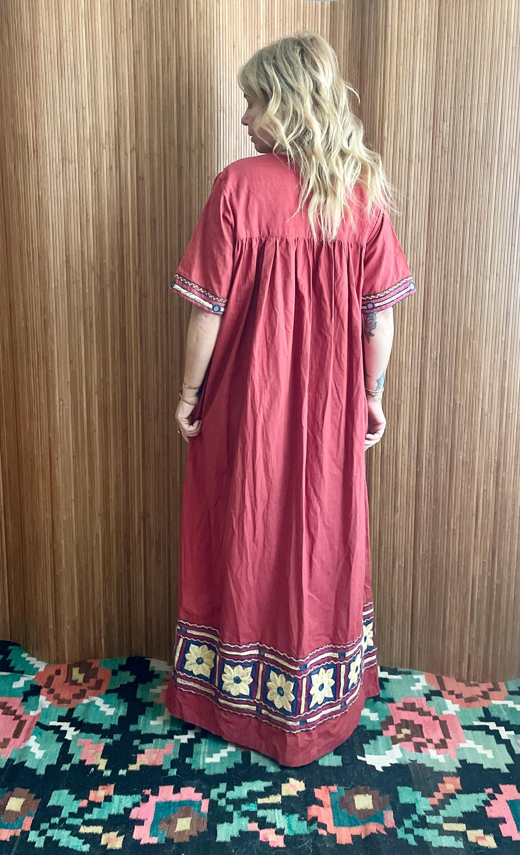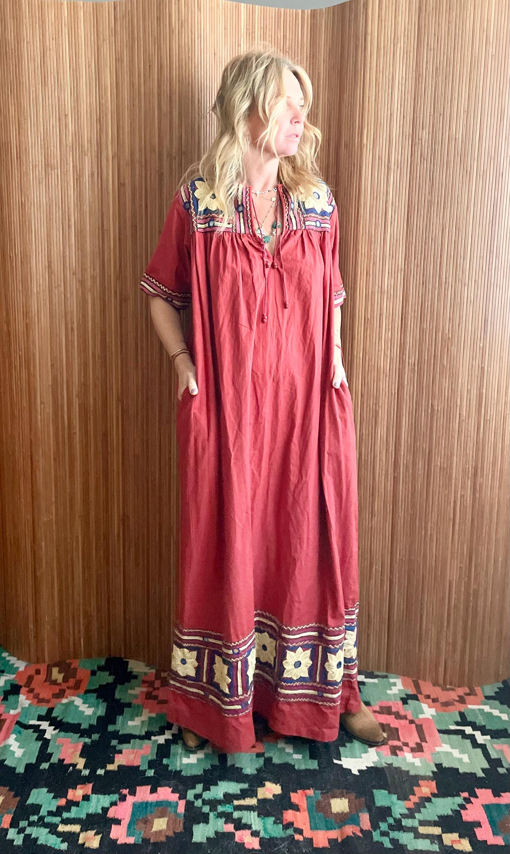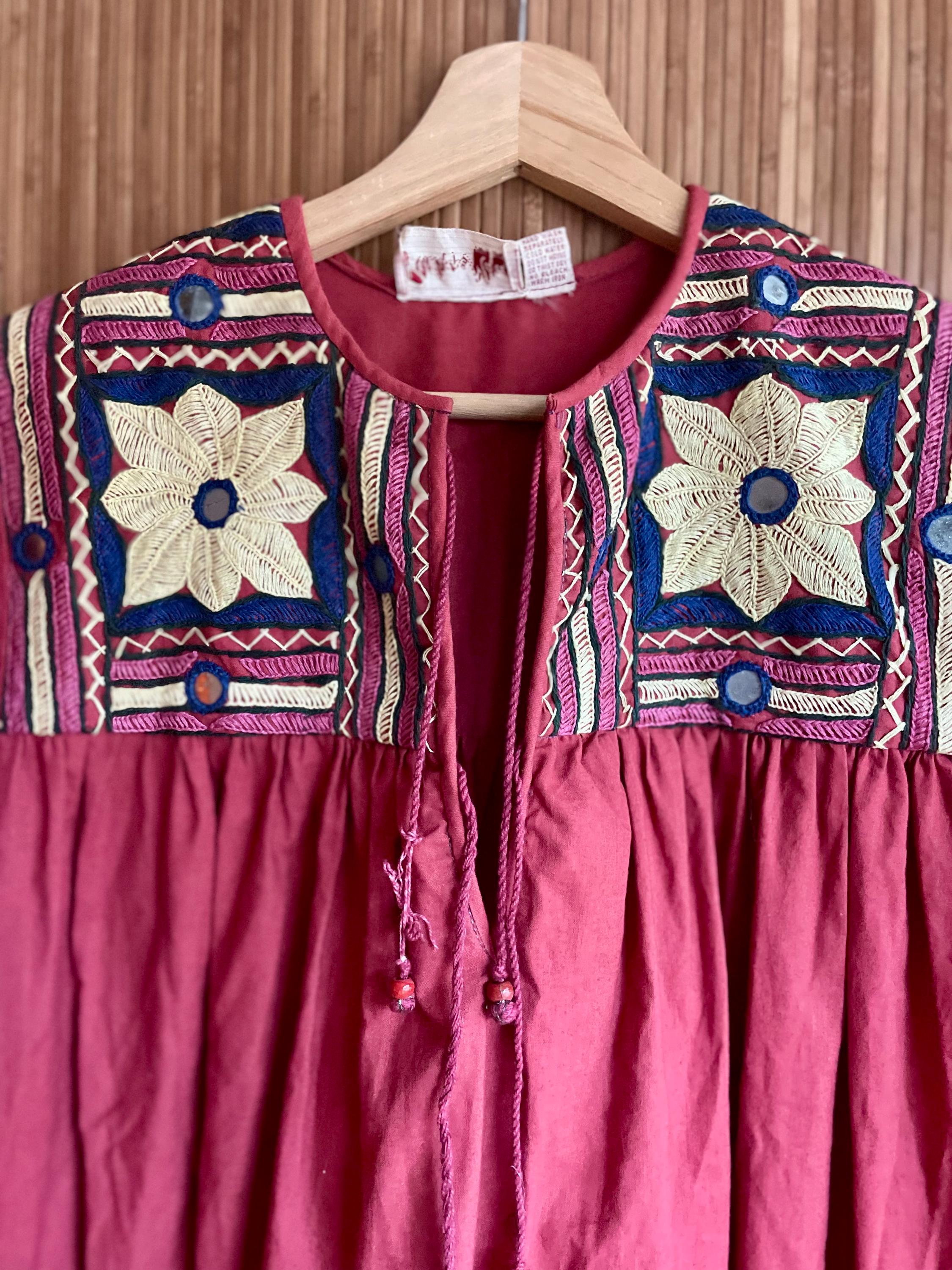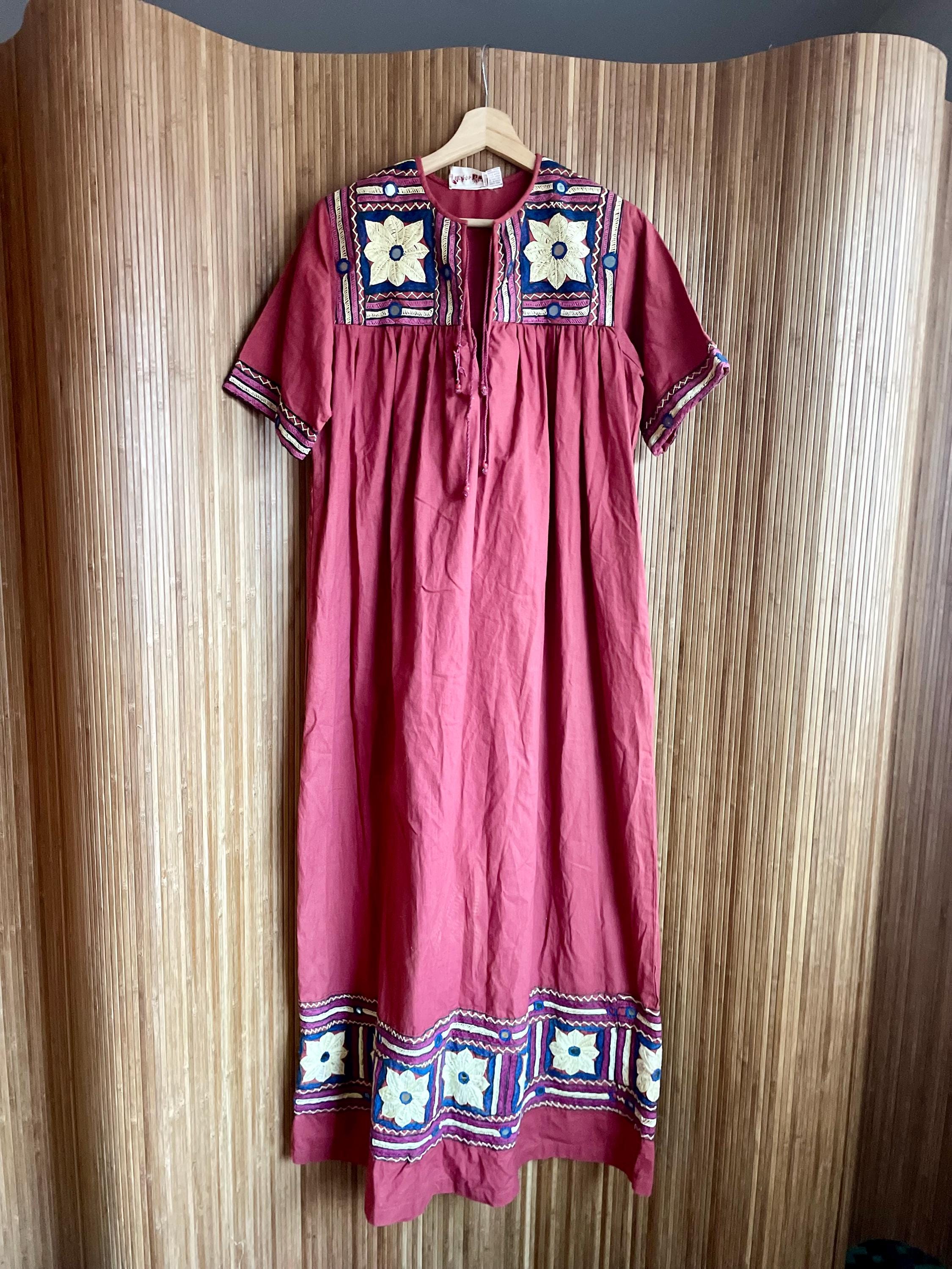 Gorgeous vintage burgundy maxi dress with intricate mirror work and colorful embroidery across the chest and hem. Flowy, comfortable, and perfect as a boho caftan, festival dress, or statement summer maxi.